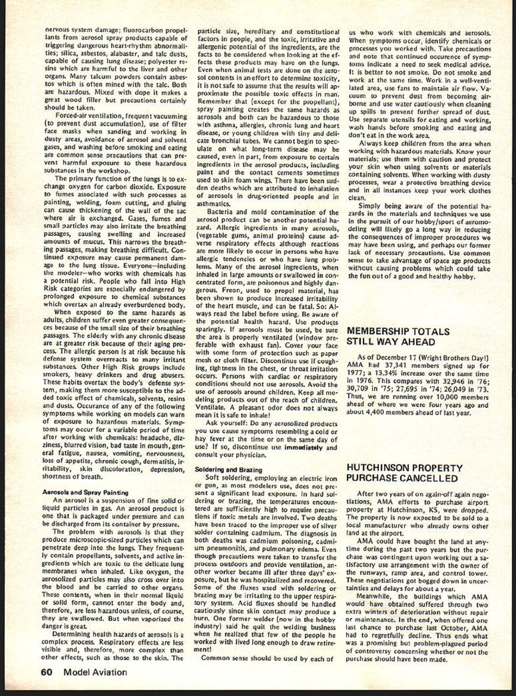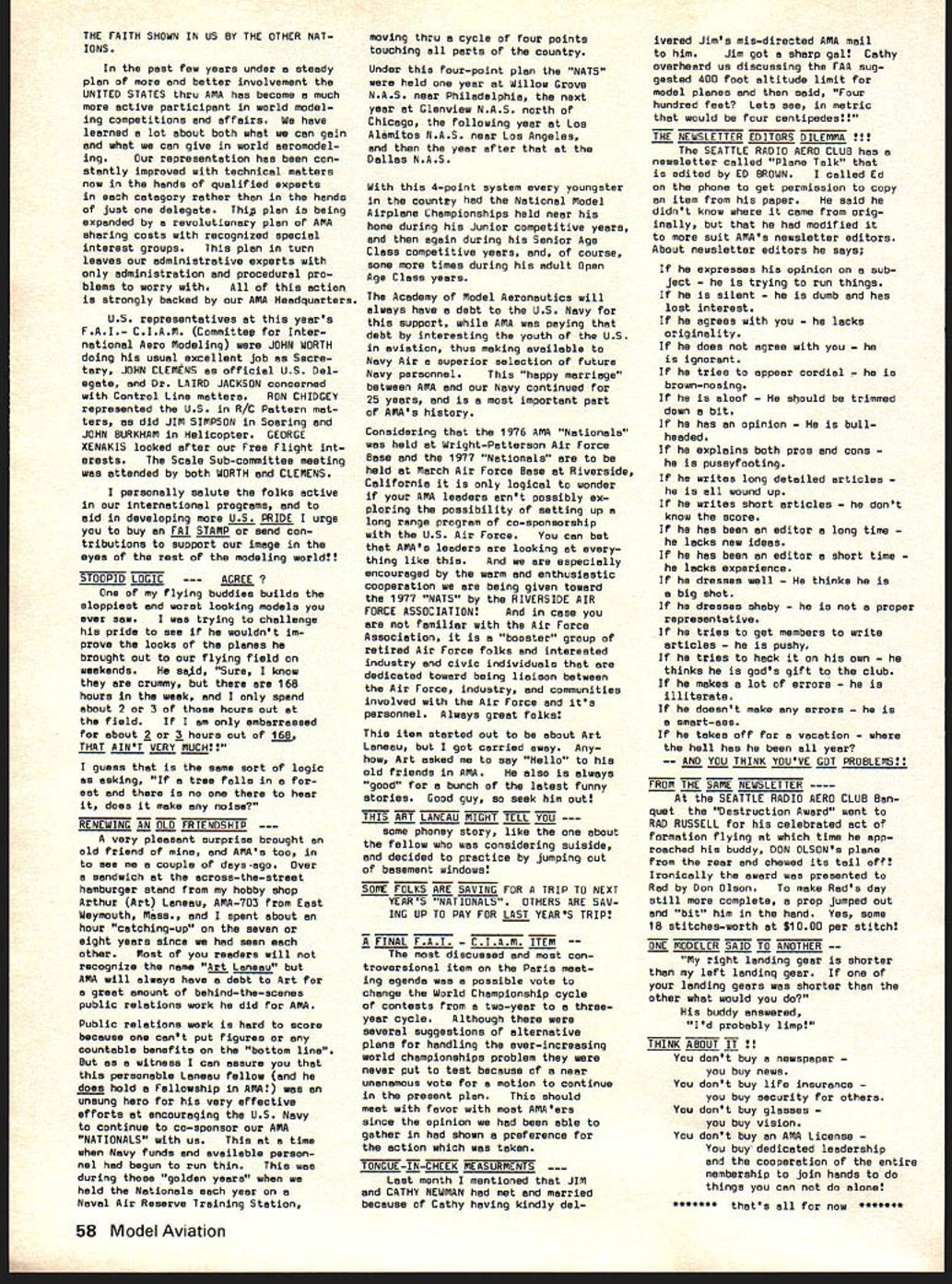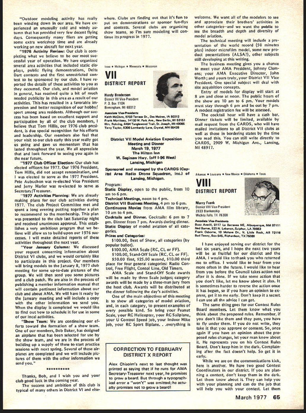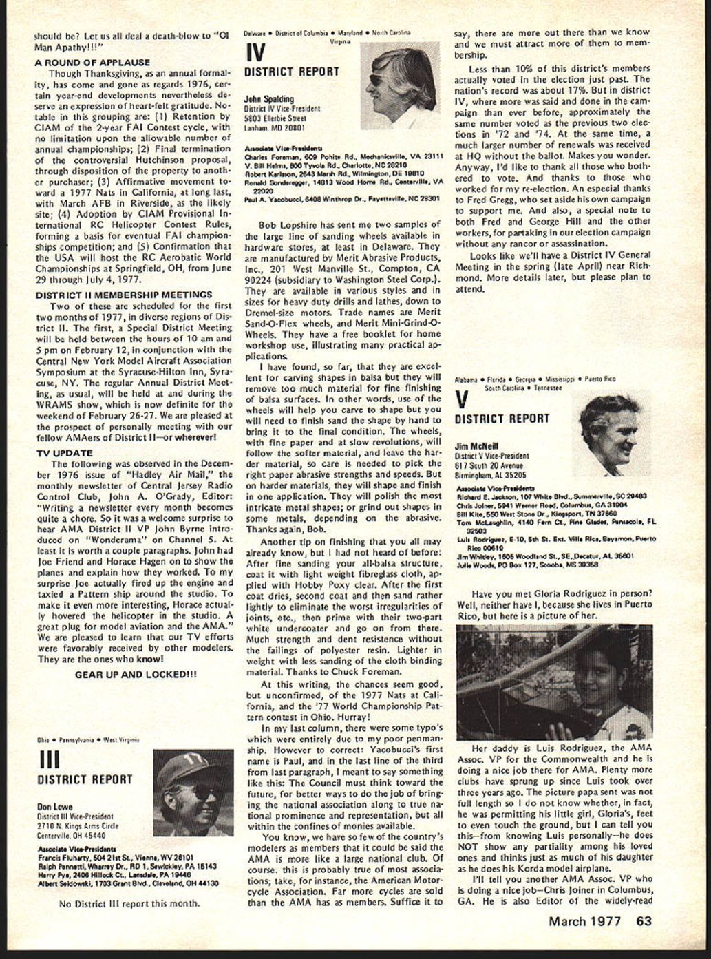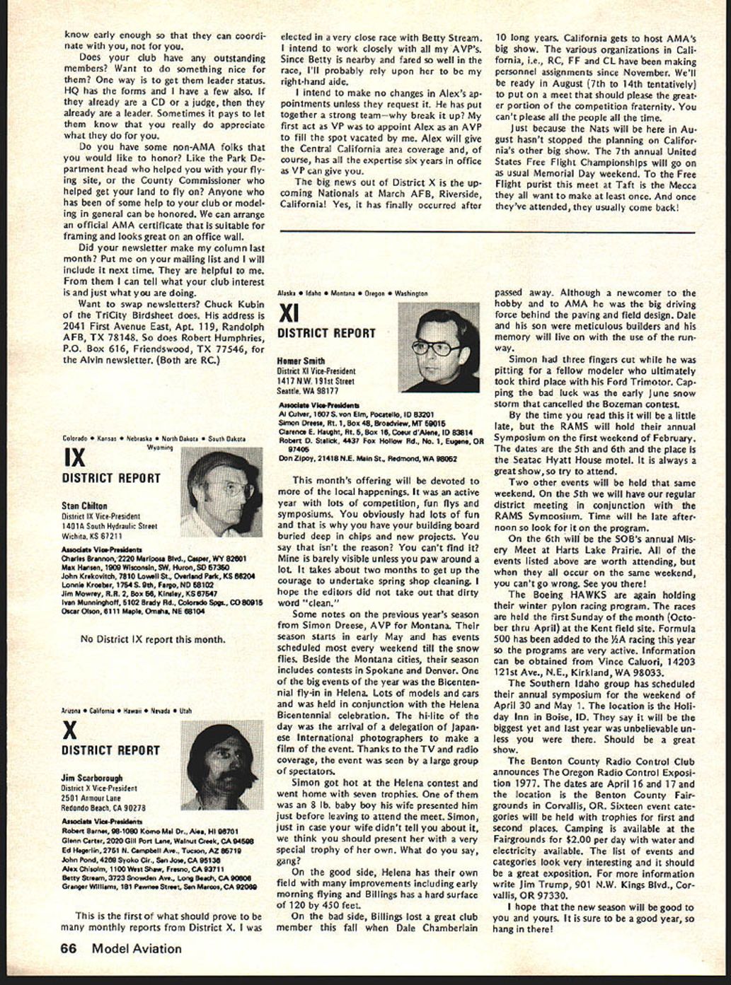 AMA FREQUENCY COMMITTEE REPORTFree FCC Licenses RC Expansion Needs Defined Last As folio wup last summers campaign prevent merging 27 MHz RC frequencies CB channels AMAs Frequency Committee has exploring whats needed next improve situation RCers Several months study using inputs AMA members RC indus try leaders AMA s legal counsel have produced following document outlining cur rent problem need go report final document merely opening statement expected modified added additional inputs others received particularly FCC sources Frequency Committee members exploring FCC officials various pos sibilities report same time Committee seeking further thoughts industry MA members members related groups RC car boat organizations Thus document fixed final position paper intended basic document elaborated information subject further change Frequency Committee now however serves status report will used initiate what might called Phase Two current FCC explorationsplanning replace finger dyke now have concerning 27 MHz operations better long-range solution problem expanding RC needs may achieved report developed meeting held AMA HQ mid-November attendance John Strong chairman Frequency Committee Walt Good former chairman current member two members AMA s legal counseling staff several AMA HQ personnel Plan Acquisition New RC Frequencies Prepared AMA Frequency Committee December 1976 1 Purpose acquire new RC frequencies will satisfy needs total RC community long-term basis 2 Background RC hobby began 1930s has grown recognized sport es timated 250000 modelers use approxi mately half million transmitters control model planes boats cars radio An industry over $200 million/yr has developed supply electronics kits related accessories hobby elec tronics part industry has pioneered refined RC equipment noted its performance has copied throughout world Because control RC models short range line-of-sight situation trans mitter power has become established level under watt Hence interference other radio services RC transmitters has proud state essentially zero no known complaints FCC frequencies allocated RC purposes under Class C license category Citizens Band Radio Service number 12 channels two different bands Five channels 27 MHz CB band potential loss frequencies chief stimulant exploration new RC frequencies Interference CB operations RC models has given seri ous consideration FCC Docket 20120 its July 27 1976 release FCC stated believe eventuallyalternatefro quencies must found supplant pre sent 27 MHz Class C allocation because increasing problem interference Class D users Class C radio control operations remaining seven channels 72 MHz band Five allocated 1966 two added 1971 under lowpower 1 watt regulations have very popular Recently due shared nature channels interference has re ported has caused damage some RC model airplanes As result few seven channels can used some areas due safety problem situation has aggravated mixing high low power operators same frequencies Originally 1966 comparatively few high power al locations 72 MHz band number has increased past 10 years continued page 61 Just before Christmas FCC announced effective January 1 1977 classes FCC licenses would issued fee pay ment until further notice action results litigation challenging FCCs author ity determine amounts charged fees Until question resolved FCC suspending fee payments affects RC CB Amateur Broadcasting forms FCC licenses long free period will last un certainperhaps several weeks several months meantime golden opportun ity available boost number Class C RC licenses registered FCC bet ter indicate RC operators really exist deserve consideration Unfortunately use club licenses masks true number RCers AMA therefore urging obtain individual li censes soon possible Now cost license eliminated no excuse continuing use club license anyone except newcomers AMA has hand large quantities FCC license applications Clubs should request im mediately phone letter number license applications desired Individual AMA members clubs can same goal get RCerAMA member notlicensed never better oppor tu nity FCC Recognizes RC Separately FCC announced December 15 1976 Radio Control RC Service has established part new Personal Radio Service separate distinct Citizens Band CB Radio Service means RC will no longer shadow CB activitieswe have own identity should also prevent repeat type crisis last summer RC threat ened loss frequencies CB opera tions now will considered own continued page 59 March1977 55 AMA HO Executive Director including reports AMA President Vice-Presidents EXECUTIVE COUNCIL MEETS IN HOUSTON ON JANUARY 29 annual winter meeting AMA Executive Council will meet during Hob Industry Association trade show Texas agenda will following items plus others may develop between press time issue meeting date 1 1977 Budget main item business will determine size scope AMAs operations rest year explored will number cost-re lated topics a PR Programs nature extent 77 activities will decided including gui dance concerning much should inter nal AMA members much should external general public possible tie medical and/or charitable ganizations air show teams will ex plored well greater emphasis FAI es pecially regard World Championships held Ohio year Discussion major expansion AMAs PR efforts 78 sooner will also considered par ticular goal flying site aid b HQ Operations look current oper ations vs future needs will given view toward possible expansion services officers clubs through improved compu ter processing c Nats/FAI extent AMA financing Nats FAI programs will determined goal budgeting activities within means possible what ever subsidy Council may deem appropri ate d Film Projects Related PR need separate budgeting activity will reviewed regard status current projects funding needed complete improve AMA Film Library ser vice e Model Aviation Magazine operations will reviewed regarding current status fu ture outlook possible improvement margin reserv
