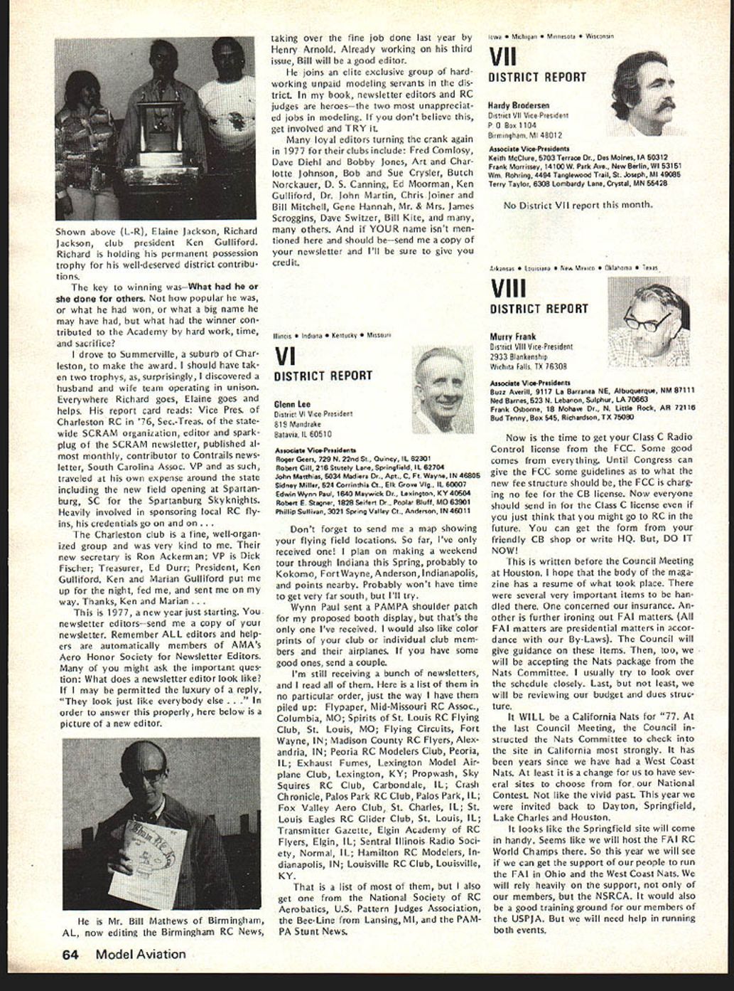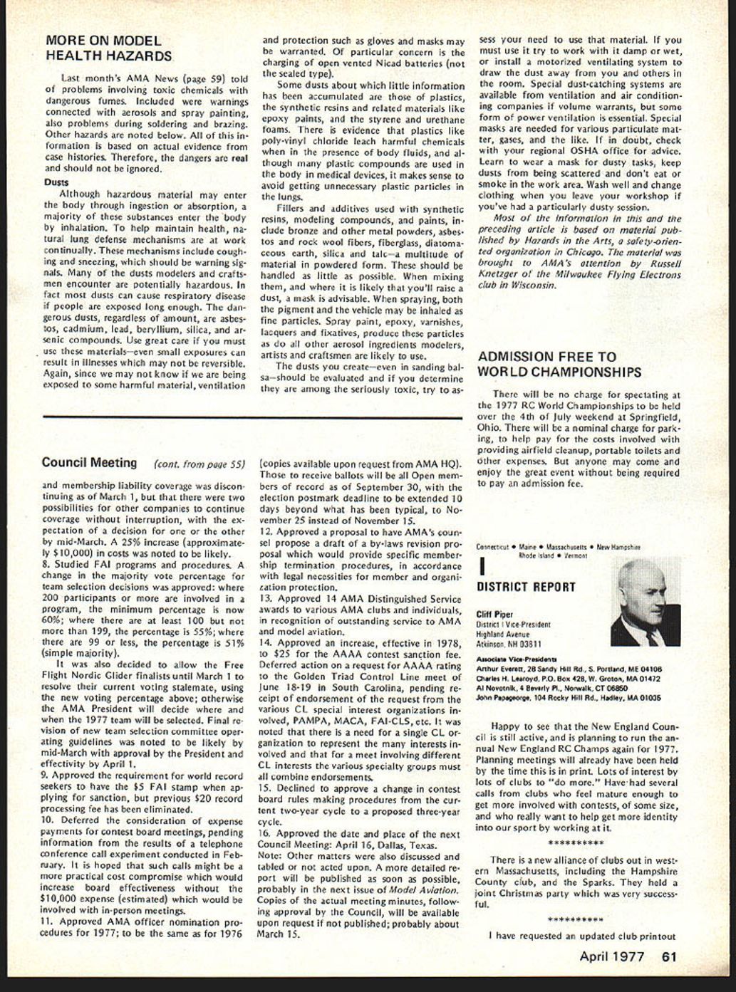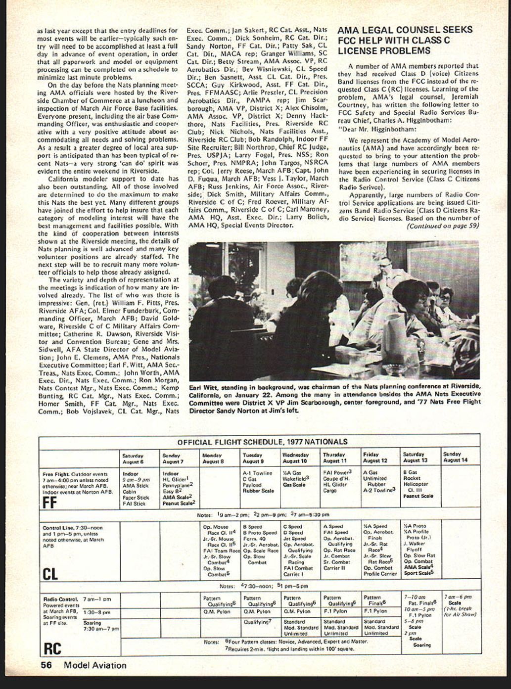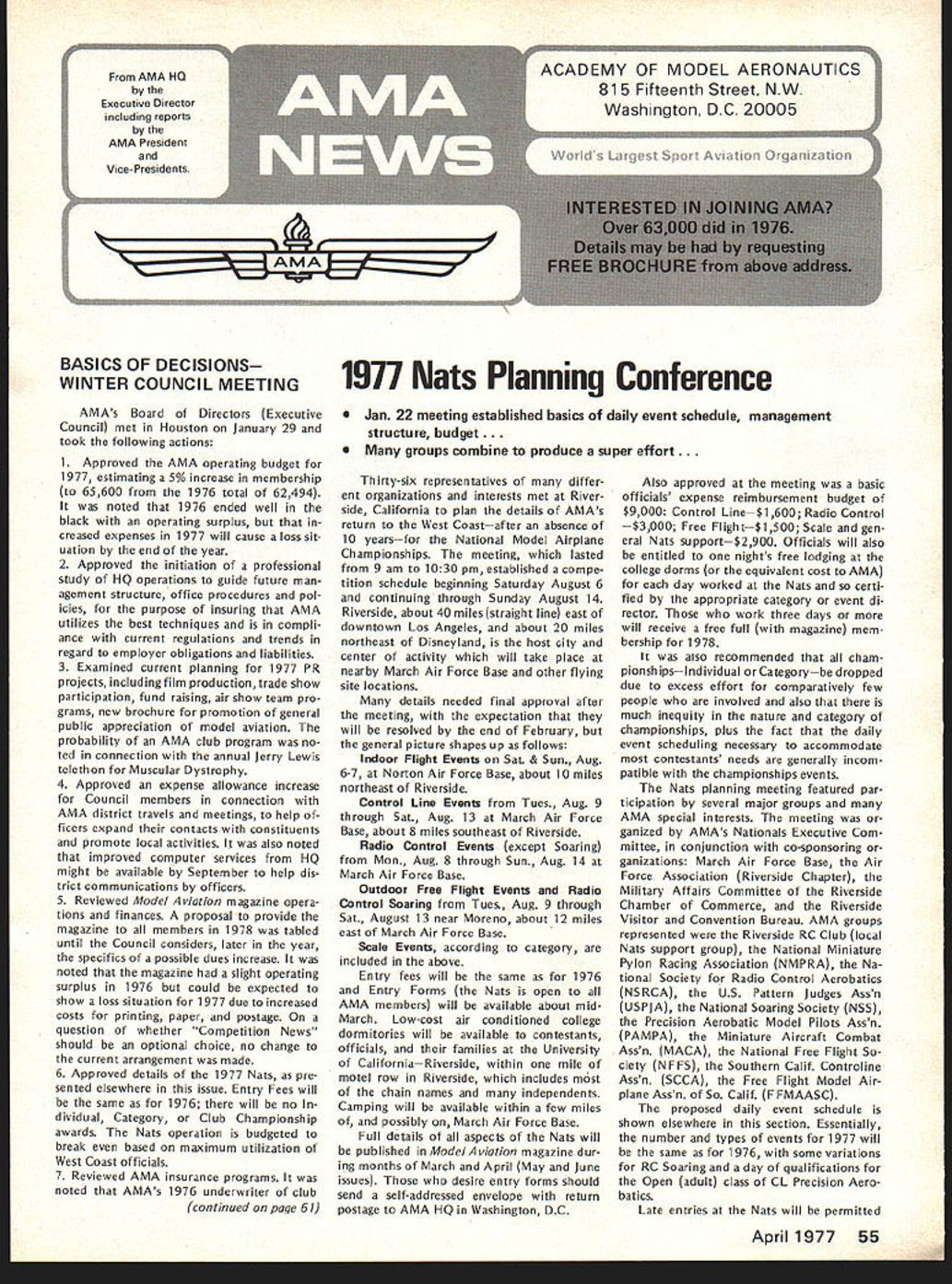 BASICS OF DECISIONS WINTER COUNCIL MEETING AMAs Board Directors Executive Council met Houston January 29 took following actions 1 Approved AMA operating budget 1 977 estimating 5% increase membership 65600 1976 total 62494 noted 1976 ended well black operating surplus creased expenses 1977 will cause loss sit uation end year 2 Approved initiation professional study l-IQ operations guide future man agement structure office procedures pol icies purpose insuring AMA utilizes best techniques compli ance current regulations trends regard employer obligations liabilities 3 Examined current planning 1977 PR projects including film production trade show participation fund raising air show team pro grams new brochure promotion general public appreciation model aviation probability AMA club program no ted connection annual Jerry Lewis telethon Muscular Dystrophy 4 Approved expense allowance increase Council members connection AMA district travels meetings help ficers expand contacts constituents promote local activities also noted improved computer services HQ might available September help dis trict communications officers 5 Reviewed Model Aviation magazine opera tions finances proposal provide magazine members 1978 tabled until Council considers later year specifics possible dues increase noted magazine slight operating surplus 1976 could expected show loss situation 1977 due increased costs printing paper postage question whether Competition News should optional choice no change current arrangement made 6 Approved details 1977 Nats pre sented elsewhere issue Entry Fees will same 1976 will no dividual Category Club Championship awards Nats operation budgeted break based maximum utilization West Coast officials 7 Reviewed AMA insurance programs noted AMAs 1976 underwriter club continued page 61 Jan 22 meeting established basics daily event schedule management structure budt. groups combine produce super effort. Thirty-six representatives differ ent organizations interests met River side California plan details AMAs return West Coastafter absence 10 yearsfor National Model Airplane Championships meeting lasted 9 am 1030 pm established compe tition schedule beginning Saturday August 6 continuing through Sunday August 14 Riverside about 40 miles straight line east downtown Los Angeles about 20 miles northeast Disneyland host city center activity will take place nearby March Air Force Base other flying site locations details needed final approval after meeting expectation will resolved end February general picture shapes up follows Indoor Flight Events Sat & Sun Aug 6-7 Norton Air Force Base about 10 miles northeast Riverside Control Line Events Tues Aug 9 through Sat Aug 13 March Air Force Base about 8 miles southeast Riverside Radio Control Events except Soaring Mon Aug 8 through Sun Aug 14 March Air Force Base Outdoor Free Flight Events Radio Control Soaring Tues Aug 9 through Sat August 13 near Moreno about 12 miles east March Air Force Base Scale Events according category included above Entry fees will same 1976 Entry Forms Nats open AMA members will available about midMarch Low-cost air conditioned college dormitories will available contestants officials families University CaliforniaRiverside within mile motel row Riverside includes chain names independents Camping will available within few miles possibly March Air Force Base Full details aspects Nats will published ModelAviation magazine dur rig months March April May June issues desire entry forms should send self-addressed envelope return postage AMA HQ Washington DC Also approved meeting basic officials expense reimbursement budget $9000 Control Line$1600 Radio Control $3000 Free Flight$1S00 Scale gen eral Nats support$2900 Officials will also entitled nights free lodging college dorms equivalent cost AMA day worked Nats certi fied appropriate category event di rector work three days will receive free full magazine mem bership 1978 also recommended cham pionshipsIndividual orCategorybe dropped due excess effort comparatively few people involved also much inequity nature category championships plus fact daily event scheduling necessary accommodate contestants needs generally incom patible championships events Nats planning meeting featured par ticipation several major groups AMA special interests meeting ganized AMAs Nationals Executive Com mittee conjunction co-sponsoring ganizations March Air Force Base Air Force Association Riverside Chapter Military Affairs Committee Riverside Chamber Commerce Riverside Visitor Convention Bureau AMA groups represented Riverside RC Club local Nats support group National Miniature Pylon Racing Association NMPRA Na tional Society Radio Control Aerobatics NSRCA US Pattern Judges Assn USPJA National Soaring Society NSS Precision Aerobatic Model Pilots Assn PAMPA Miniature Aircraft Combat Assn MACA National Free Flight So ciety N FFS Southern Calif Controline Assn SCCA Free Flight Model Air plane Assn So Calif FFMAASC proposed daily event schedule shown elsewhere section Essentially number types events 1977 will same 1976 some variations RC Soaring day qualifications Open adult class CL Precision Aero batics Late entries Nats will permitted April 1977 55 AMA HO Executive Director including reports AMA President end Vice-Presidents ACADEMY OF MODEL AERONAUTICS 81 5 Fifteenth Street NW Washington DC 20005] 1977 Nats Planning Conference last year except entry deadlines events will earliertypically such en try will need accomplished least full day advance event operation order paperwork model equipment processing can completed schedule minimize last minute problems day before Nats planning meet ing AMA officials hosted River side Chamber Commerce luncheon inspection March Air Force Base facilities Everyone present including air base Com manding Officer enthusiastic cooper ative very positive attitude about ac commodating needs solving problems As result greater degree local area sup port anticipated has typical r