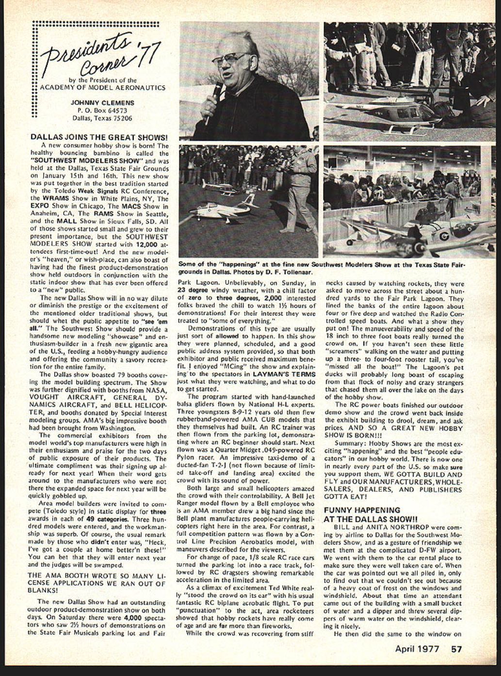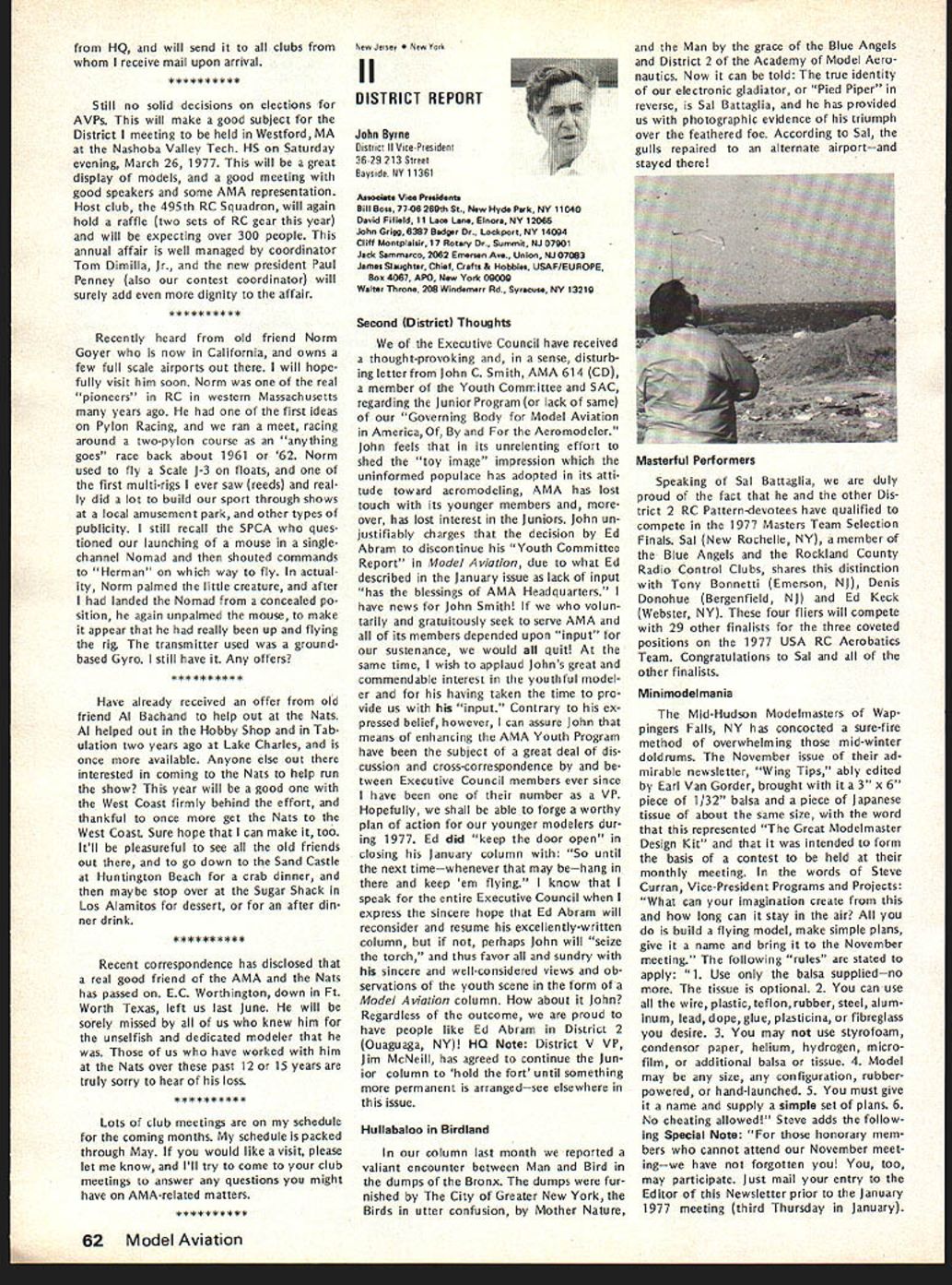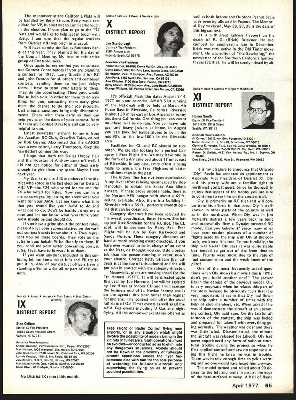 BASICS OF DECISIONS WINTER COUNCIL MEETING AMAs Board Directors Executive Council met Houston January 29 took following actions 1 Approved AMA operating budget 1 977 estimating 5% increase membership 65600 1976 total 62494 noted 1976 ended well black operating surplus creased expenses 1977 will cause loss sit uation end year 2 Approved initiation professional study l-IQ operations guide future man agement structure office procedures pol icies purpose insuring AMA utilizes best techniques compli ance current regulations trends regard employer obligations liabilities 3 Examined current planning 1977 PR projects including film production trade show participation fund raising air show team pro grams new brochure promotion general public appreciation model aviation probability AMA club program no ted connection annual Jerry Lewis telethon Muscular Dystrophy 4 Approved expense allowance increase Council members connection AMA district travels meetings help ficers expand contacts constituents promote local activities also noted improved computer services HQ might available September help dis trict communications officers 5 Reviewed Model Aviation magazine opera tions finances proposal provide magazine members 1978 tabled until Council considers later year specifics possible dues increase noted magazine slight operating surplus 1976 could expected show loss situation 1977 due increased costs printing paper postage question whether Competition News should optional choice no change current arrangement made 6 Approved details 1977 Nats pre sented elsewhere issue Entry Fees will same 1976 will no dividual Category Club Championship awards Nats operation budgeted break based maximum utilization West Coast officials 7 Reviewed AMA insurance programs noted AMAs 1976 underwriter club continued page 61 Jan 22 meeting established basics daily event schedule management structure budt. groups combine produce super effort. Thirty-six representatives differ ent organizations interests met River side California plan details AMAs return West Coastafter absence 10 yearsfor National Model Airplane Championships meeting lasted 9 am 1030 pm established compe tition schedule beginning Saturday August 6 continuing through Sunday August 14 Riverside about 40 miles straight line east downtown Los Angeles about 20 miles northeast Disneyland host city center activity will take place nearby March Air Force Base other flying site locations details needed final approval after meeting expectation will resolved end February general picture shapes up follows Indoor Flight Events Sat & Sun Aug 6-7 Norton Air Force Base about 10 miles northeast Riverside Control Line Events Tues Aug 9 through Sat Aug 13 March Air Force Base about 8 miles southeast Riverside Radio Control Events except Soaring Mon Aug 8 through Sun Aug 14 March Air Force Base Outdoor Free Flight Events Radio Control Soaring Tues Aug 9 through Sat August 13 near Moreno about 12 miles east March Air Force Base Scale Events according category included above Entry fees will same 1976 Entry Forms Nats open AMA members will available about midMarch Low-cost air conditioned college dormitories will available contestants officials families University CaliforniaRiverside within mile motel row Riverside includes chain names independents Camping will available within few miles possibly March Air Force Base Full details aspects Nats will published ModelAviation magazine dur rig months March April May June issues desire entry forms should send self-addressed envelope return postage AMA HQ Washington DC Also approved meeting basic officials expense reimbursement budget $9000 Control Line$1600 Radio Control $3000 Free Flight$1S00 Scale gen eral Nats support$2900 Officials will also entitled nights free lodging college dorms equivalent cost AMA day worked Nats certi fied appropriate category event di rector work three days will receive free full magazine mem bership 1978 also recommended cham pionshipsIndividual orCategorybe dropped due excess effort comparatively few people involved also much inequity nature category championships plus fact daily event scheduling necessary accommodate contestants needs generally incom patible championships events Nats planning meeting featured par ticipation several major groups AMA special interests meeting ganized AMAs Nationals Executive Com mittee conjunction co-sponsoring ganizations March Air Force Base Air Force Association Riverside Chapter Military Affairs Committee Riverside Chamber Commerce Riverside Visitor Convention Bureau AMA groups represented Riverside RC Club local Nats support group National Miniature Pylon Racing Association NMPRA Na tional Society Radio Control Aerobatics NSRCA US Pattern Judges Assn USPJA National Soaring Society NSS Precision Aerobatic Model Pilots Assn PAMPA Miniature Aircraft Combat Assn MACA National Free Flight So ciety N FFS Southern Calif Controline Assn SCCA Free Flight Model Air plane Assn So Calif FFMAASC proposed daily event schedule shown elsewhere section Essentially number types events 1977 will same 1976 some variations RC Soaring day qualifications Open adult class CL Precision Aero batics Late entries Nats will permitted April 1977 55 AMA HO Executive Director including reports AMA President end Vice-Presidents ACADEMY OF MODEL AERONAUTICS 81 5 Fifteenth Street NW Washington DC 20005] 1977 Nats Planning Conference last year except entry deadlines events will earliertypically such en try will need accomplished least full day advance event operation order paperwork model equipment processing can completed schedule minimize last minute problems day before Nats planning meet ing AMA officials hosted River side Chamber Commerce luncheon inspection March Air Force Base facilities Everyone present including air base Com manding Officer enthusiastic cooper ative very positive attitude about ac commodating needs solving problems As result greater degree local area sup port anticipated has typical r