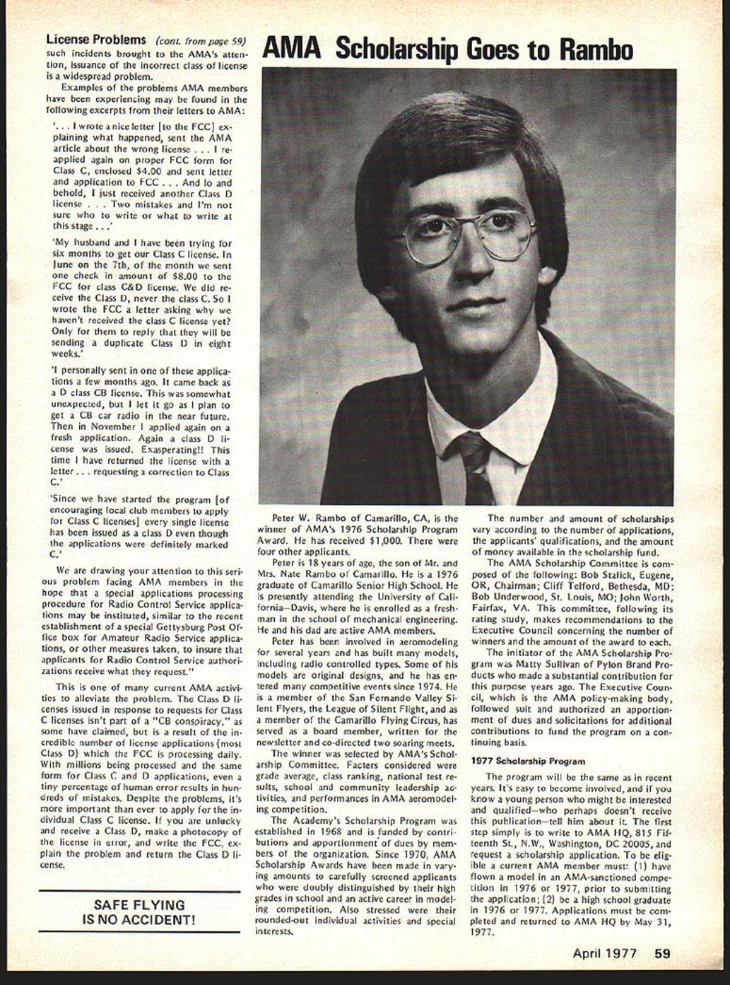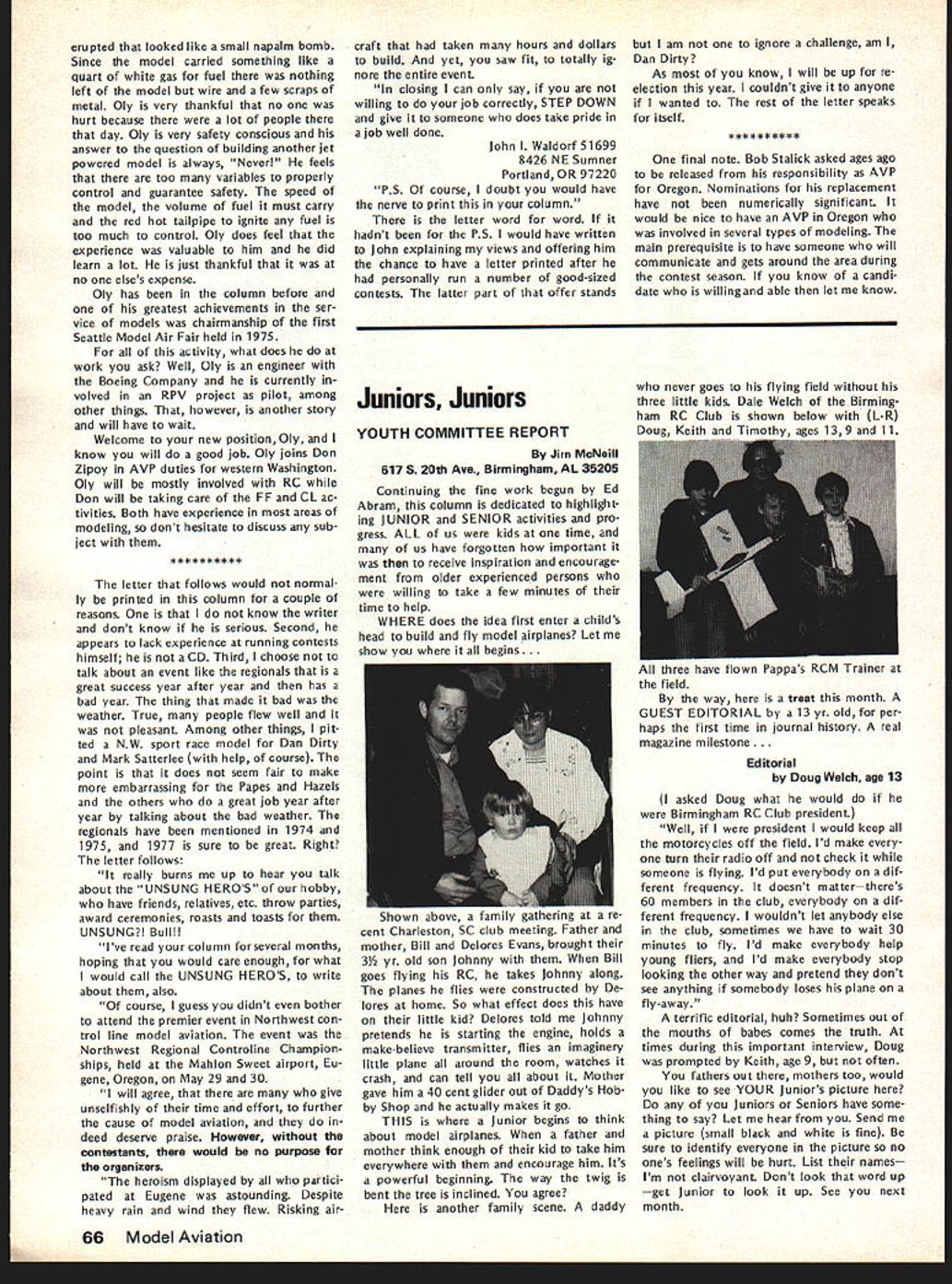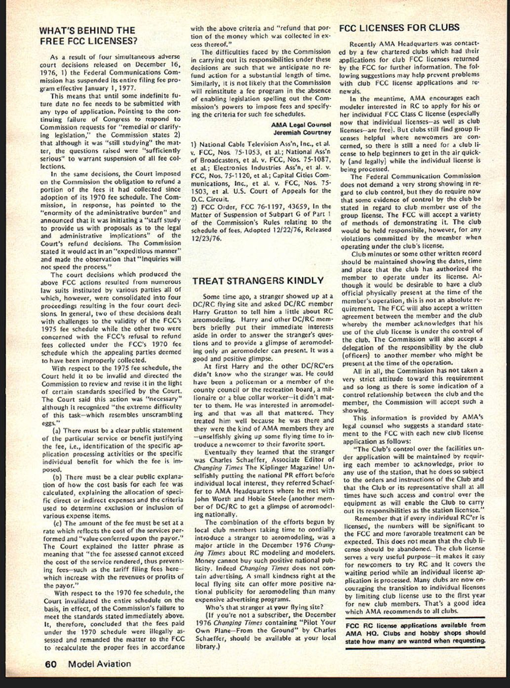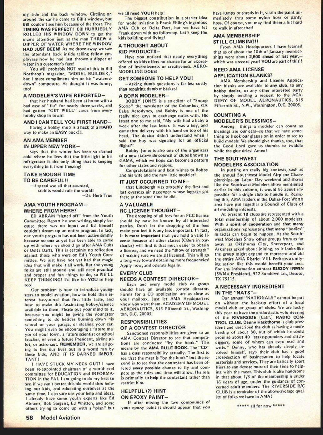 BASICS OF DECISIONS WINTER COUNCIL MEETING AMAs Board Directors Executive Council met Houston January 29 took following actions 1 Approved AMA operating budget 1 977 estimating 5% increase membership 65600 1976 total 62494 noted 1976 ended well black operating surplus creased expenses 1977 will cause loss sit uation end year 2 Approved initiation professional study l-IQ operations guide future man agement structure office procedures pol icies purpose insuring AMA utilizes best techniques compli ance current regulations trends regard employer obligations liabilities 3 Examined current planning 1977 PR projects including film production trade show participation fund raising air show team pro grams new brochure promotion general public appreciation model aviation probability AMA club program no ted connection annual Jerry Lewis telethon Muscular Dystrophy 4 Approved expense allowance increase Council members connection AMA district travels meetings help ficers expand contacts constituents promote local activities also noted improved computer services HQ might available September help dis trict communications officers 5 Reviewed Model Aviation magazine opera tions finances proposal provide magazine members 1978 tabled until Council considers later year specifics possible dues increase noted magazine slight operating surplus 1976 could expected show loss situation 1977 due increased costs printing paper postage question whether Competition News should optional choice no change current arrangement made 6 Approved details 1977 Nats pre sented elsewhere issue Entry Fees will same 1976 will no dividual Category Club Championship awards Nats operation budgeted break based maximum utilization West Coast officials 7 Reviewed AMA insurance programs noted AMAs 1976 underwriter club continued page 61 Jan 22 meeting established basics daily event schedule management structure budt. groups combine produce super effort. Thirty-six representatives differ ent organizations interests met River side California plan details AMAs return West Coastafter absence 10 yearsfor National Model Airplane Championships meeting lasted 9 am 1030 pm established compe tition schedule beginning Saturday August 6 continuing through Sunday August 14 Riverside about 40 miles straight line east downtown Los Angeles about 20 miles northeast Disneyland host city center activity will take place nearby March Air Force Base other flying site locations details needed final approval after meeting expectation will resolved end February general picture shapes up follows Indoor Flight Events Sat & Sun Aug 6-7 Norton Air Force Base about 10 miles northeast Riverside Control Line Events Tues Aug 9 through Sat Aug 13 March Air Force Base about 8 miles southeast Riverside Radio Control Events except Soaring Mon Aug 8 through Sun Aug 14 March Air Force Base Outdoor Free Flight Events Radio Control Soaring Tues Aug 9 through Sat August 13 near Moreno about 12 miles east March Air Force Base Scale Events according category included above Entry fees will same 1976 Entry Forms Nats open AMA members will available about midMarch Low-cost air conditioned college dormitories will available contestants officials families University CaliforniaRiverside within mile motel row Riverside includes chain names independents Camping will available within few miles possibly March Air Force Base Full details aspects Nats will published ModelAviation magazine dur rig months March April May June issues desire entry forms should send self-addressed envelope return postage AMA HQ Washington DC Also approved meeting basic officials expense reimbursement budget $9000 Control Line$1600 Radio Control $3000 Free Flight$1S00 Scale gen eral Nats support$2900 Officials will also entitled nights free lodging college dorms equivalent cost AMA day worked Nats certi fied appropriate category event di rector work three days will receive free full magazine mem bership 1978 also recommended cham pionshipsIndividual orCategorybe dropped due excess effort comparatively few people involved also much inequity nature category championships plus fact daily event scheduling necessary accommodate contestants needs generally incom patible championships events Nats planning meeting featured par ticipation several major groups AMA special interests meeting ganized AMAs Nationals Executive Com mittee conjunction co-sponsoring ganizations March Air Force Base Air Force Association Riverside Chapter Military Affairs Committee Riverside Chamber Commerce Riverside Visitor Convention Bureau AMA groups represented Riverside RC Club local Nats support group National Miniature Pylon Racing Association NMPRA Na tional Society Radio Control Aerobatics NSRCA US Pattern Judges Assn USPJA National Soaring Society NSS Precision Aerobatic Model Pilots Assn PAMPA Miniature Aircraft Combat Assn MACA National Free Flight So ciety N FFS Southern Calif Controline Assn SCCA Free Flight Model Air plane Assn So Calif FFMAASC proposed daily event schedule shown elsewhere section Essentially number types events 1977 will same 1976 some variations RC Soaring day qualifications Open adult class CL Precision Aero batics Late entries Nats will permitted April 1977 55 AMA HO Executive Director including reports AMA President end Vice-Presidents ACADEMY OF MODEL AERONAUTICS 81 5 Fifteenth Street NW Washington DC 20005] 1977 Nats Planning Conference last year except entry deadlines events will earliertypically such en try will need accomplished least full day advance event operation order paperwork model equipment processing can completed schedule minimize last minute problems day before Nats planning meet ing AMA officials hosted River side Chamber Commerce luncheon inspection March Air Force Base facilities Everyone present including air base Com manding Officer enthusiastic cooper ative very positive attitude about ac commodating needs solving problems As result greater degree local area sup port anticipated has typical r