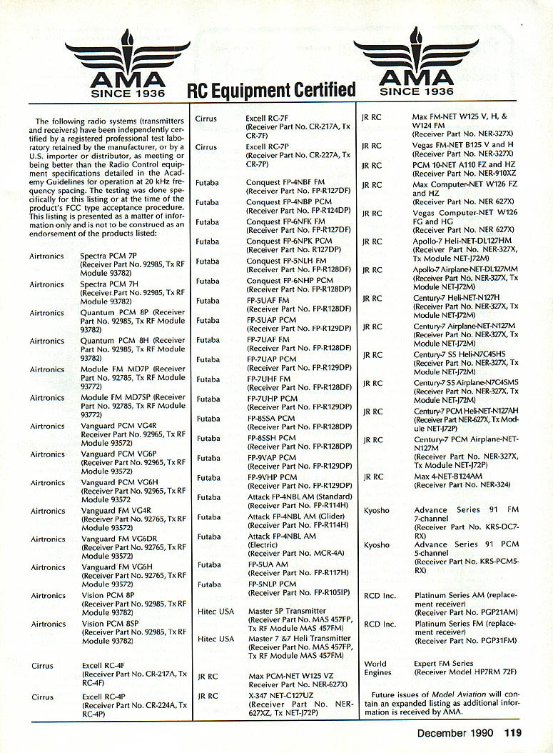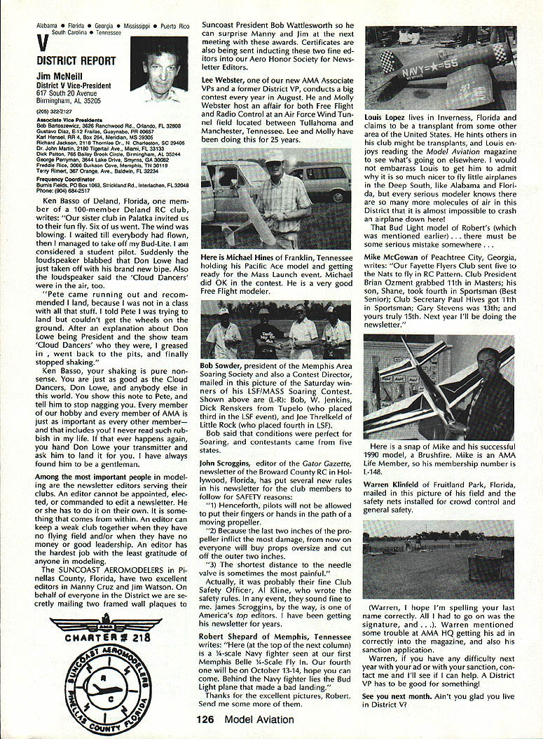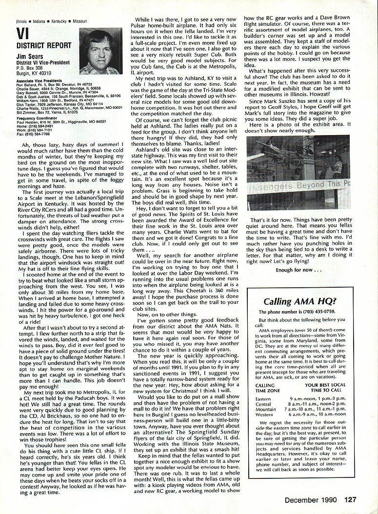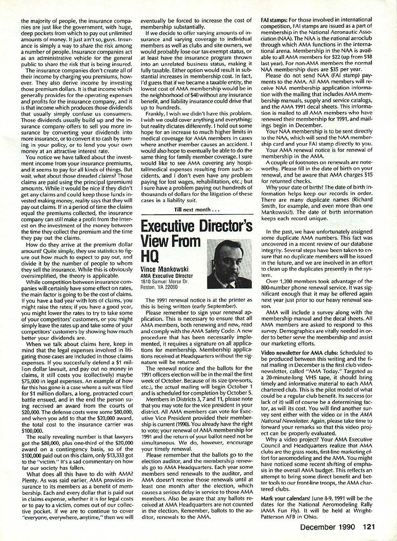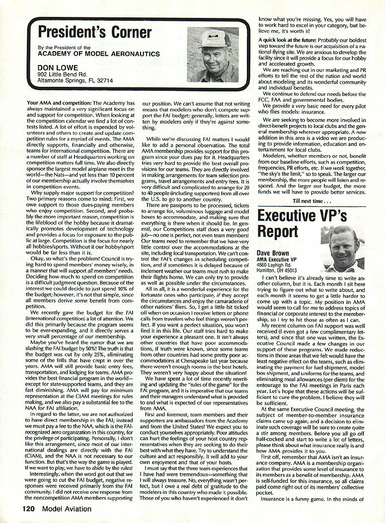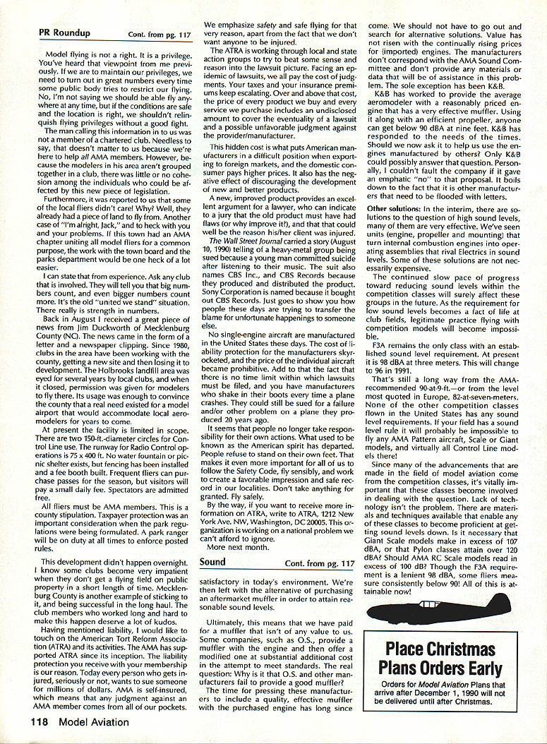 Geoffrey Styles Director Marketing r L PR Roundup Now suggestion comes up AMA should have speakers bureau sounds like great idea Im sure what pro ponents such scheme have mind times seems mean AMA HQ speak ers should available club meetings other times get impression mean non-AMA speakers should available shows conventions other non-AMA func tions Any program involving professional speak ers costs moneybig money talking about basic fee transportation hotel meal expenses other miscellaneous costs program involving volunteer speakers per haps AMA membership ranks would necessity local scope unless some well-to-do member felt like contributing time expenses wider travel Most clubs have enough skilled members provide instructional/educational sessions dur ing winter meetings town has aviationoriented people FAA EAA electronics com pany manufacturer aviation products etc often willing address club chosen topic Rotary Lions Kiwa nis other clubs get speakers Around town interesting visitors present think AMA has enough upcom ing expenses based normal needs plus Muncie property purchase necessary im provements preclude involvement potentially expensive HQ-supported speak ers program However Id like hear readers think good idea write let know would pro pose finance scheme Thanks telephone call some Fax communica tions recently informed us town con sidering ordinance forbid model flying park property Apparently complaint registered local police ejected some fliers though time no such dinance existed Due efforts mem ber parks department ordinance prepared public meeting held small town four out 137 AMA mem bers living nearby turned out public meeting very impressive sight town board see Continued page 118 Sound & Model Aeronautics Howard Crispin Jr letter Em Millenberg Fort Dodge IA points out problems havent resolved quest quiet operation model aircraft Em has solved problem satisfaction its easy others follow suit Thats suggest should dont recommend Ems solution modelers generally because doesnt change basic situation Ems letter have previously attached K&B Sport ster muffler Royal 40 made noticeable difference noise ma chinist make adapter plate latest experiment involved putting K&B 65 muffler SuperTigre 49 wasnt quite prepared combination hit engine mounted 40-size Im pulse nylon mount J-Tex SnuffVibes engine turning 10 x 8 Profi fiberglass prop 10400 rpm using Sig 10% fuel nine feet exhaust side asphalt read 84 dB Thats mis print eighty-four SuperTigre muffler mounts exhaust side engine K&B mounts other side bolt pat tern same put 1A-in drill bit drill press drilled out threads kept right going out back side bolts supplied K&B muffler long enough mount done K&B engine can still use SuperTigre muf fler using bolts nuts attach Perhaps enough arm twist ing K&B would market some adapters using its mufflers other engines Cost cer tainly isnt excessive K&B muffler adapter retails $1520 However sad fact life seems modelers just arent interested doin something about noise until its too late somebody elses fault Well Theres no doubt Em has found good combination application solution brings up some questionsand probably no answers K&B has swamped production demands necessitating move new location order increase capability situation aside question arises whether manufacturer could consider adapting its product another manufactur ers engines seems that might perhaps provide competitor means selling An answer question would prove teresting K&B should consider such course would have find ways mar keting item look financial benefits gained venture real alternative different isnt reason today manufacturer engine market cant develop provide satisfactory muffler en gines Present conditions require purchase engine muffler isnt Cont nued page 118 Are Ham AMA members fly models sixmeter frequencies 50 53 MHz sign please order help Academy better repre sent members use frequencies need know Place name address AMA number call sign Amateur frequencies use postcard mail AMA Head quarters February 11991 well draw two cards frequency hat award lucky winners prize First PlaceA brand new radio system six-meter frequency choice Second placeWhat else big juicy ham Help us help work FCC ARRL Drawing open AMA members current Amateur license holders Technician class higher AMA HO SERVICES STAFF 0 Executive Director vince Mankowaki 0 Director Operations Robert Volslavek 0 Personnel Manager Diane GalIsles 0 Technical pirector Bob underwood 0 Comptroller Lynne Collins 0 CompetitIon Services Director Micheline Madison 0 Special Services Director Carl Maroney 0 Membership Processing Supervisor Joyce Hager eting Director Geoff Styles ems Manager Reggie Watterson Director Internal CommunicationlEducation Doug Pratt 0 Publications Director Ross B McMullen 0 Events Coordinator Chip Smith S Museum Curator Hurst Bowers S General Counsel Bob Jackson December 1990 117 AMA HO Executive Director including reports AMA President Executive VP Vice-Presidents AMAs Executive Council equivalent Board Directors basically composed President Executive vice President 11 district Vice Presidents officers Executive Director provided space month AMA News publication What say space however matter personal viewpoint sole responsibility Ihe author views may may represent official position AMA Ihe Executive Council PR Roundup Cont pg 117 Model flying right privilege Youve heard viewpoint previ ously maintain privileges need turn out great numbers time some public body tries restrict flying No Im saying should able fly anytime conditions safe location right shouldnt relin quish flying privileges good fight man calling information us member chartered club Needless say doesnt matter us because help AMA members However cause modelers area arent grouped together club little no cohe sion among individuals could af fected new piece legislation Furthermore reported us some local fliers didnt care Well already piece land fly Another case Im alright Jack heck problem