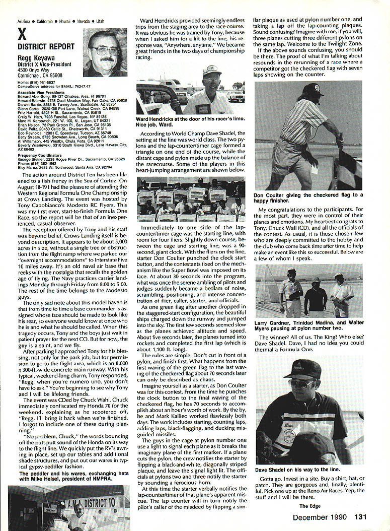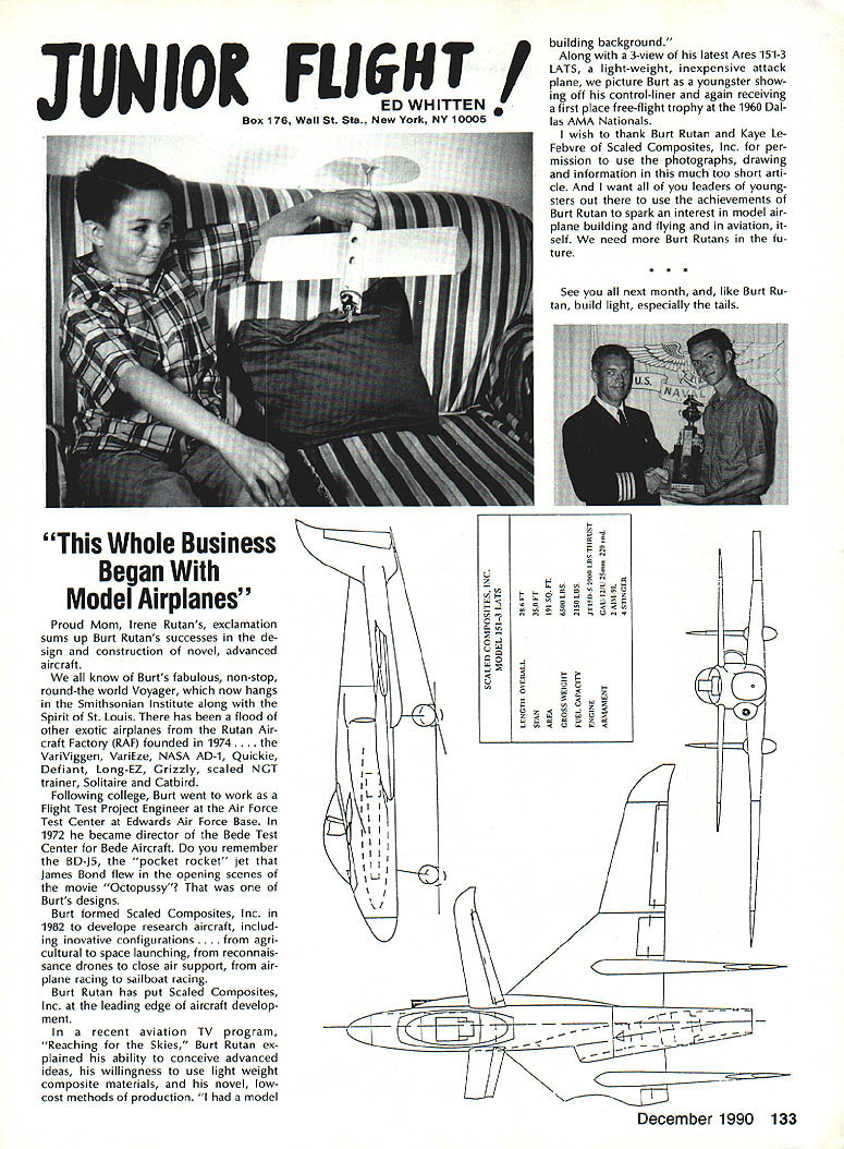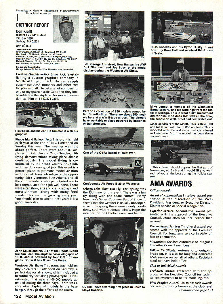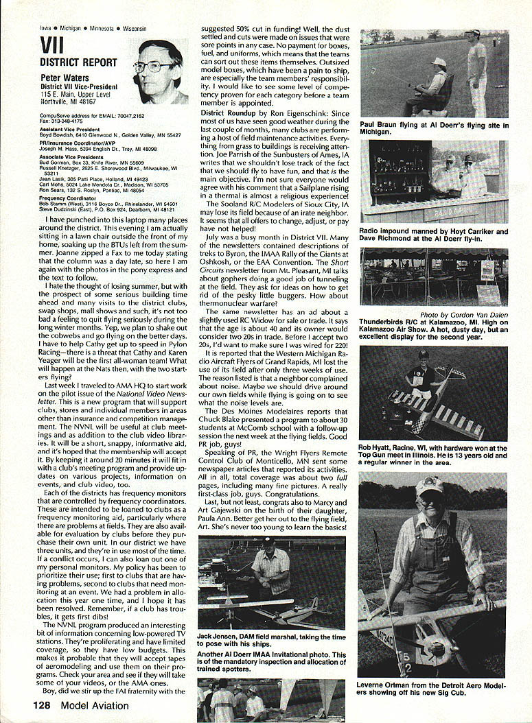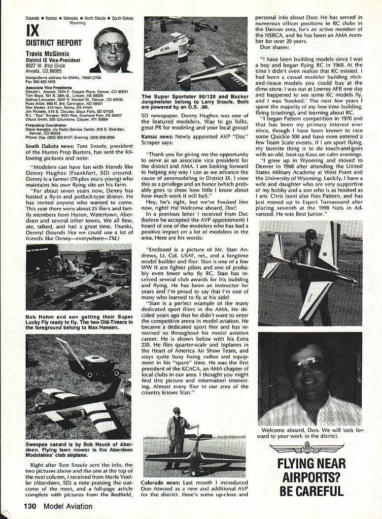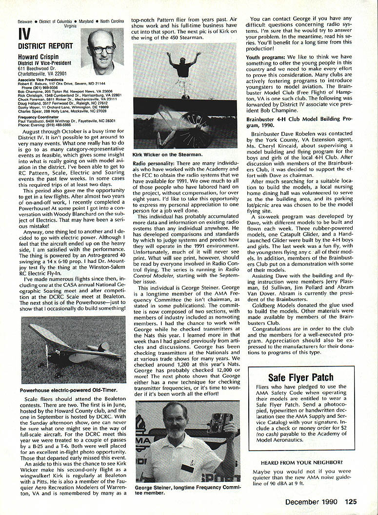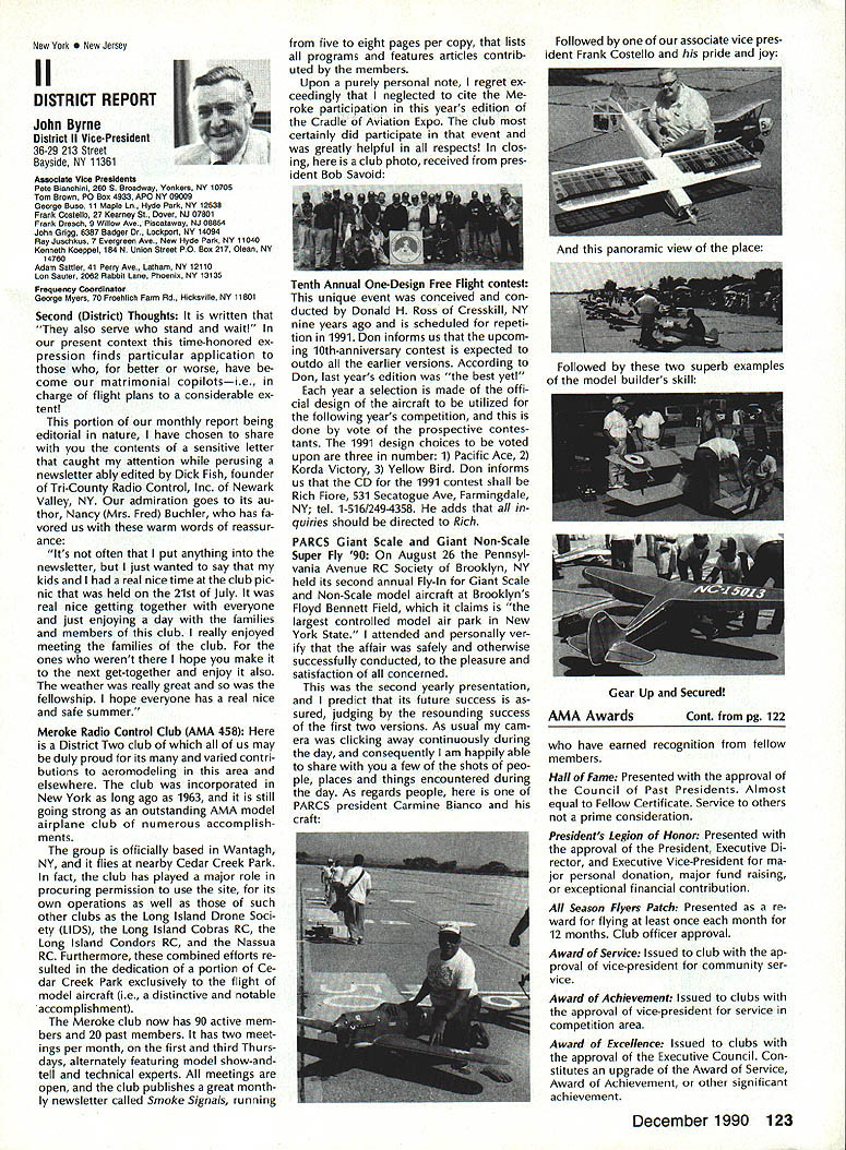 Geoffrey Styles Director Marketing r L PR Roundup Now suggestion comes up AMA should have speakers bureau sounds like great idea Im sure what pro ponents such scheme have mind times seems mean AMA HQ speak ers should available club meetings other times get impression mean non-AMA speakers should available shows conventions other non-AMA func tions Any program involving professional speak ers costs moneybig money talking about basic fee transportation hotel meal expenses other miscellaneous costs program involving volunteer speakers per haps AMA membership ranks would necessity local scope unless some well-to-do member felt like contributing time expenses wider travel Most clubs have enough skilled members provide instructional/educational sessions dur ing winter meetings town has aviationoriented people FAA EAA electronics com pany manufacturer aviation products etc often willing address club chosen topic Rotary Lions Kiwa nis other clubs get speakers Around town interesting visitors present think AMA has enough upcom ing expenses based normal needs plus Muncie property purchase necessary im provements preclude involvement potentially expensive HQ-supported speak ers program However Id like hear readers think good idea write let know would pro pose finance scheme Thanks telephone call some Fax communica tions recently informed us town con sidering ordinance forbid model flying park property Apparently complaint registered local police ejected some fliers though time no such dinance existed Due efforts mem ber parks department ordinance prepared public meeting held small town four out 137 AMA mem bers living nearby turned out public meeting very impressive sight town board see Continued page 118 Sound & Model Aeronautics Howard Crispin Jr letter Em Millenberg Fort Dodge IA points out problems havent resolved quest quiet operation model aircraft Em has solved problem satisfaction its easy others follow suit Thats suggest should dont recommend Ems solution modelers generally because doesnt change basic situation Ems letter have previously attached K&B Sport ster muffler Royal 40 made noticeable difference noise ma chinist make adapter plate latest experiment involved putting K&B 65 muffler SuperTigre 49 wasnt quite prepared combination hit engine mounted 40-size Im pulse nylon mount J-Tex SnuffVibes engine turning 10 x 8 Profi fiberglass prop 10400 rpm using Sig 10% fuel nine feet exhaust side asphalt read 84 dB Thats mis print eighty-four SuperTigre muffler mounts exhaust side engine K&B mounts other side bolt pat tern same put 1A-in drill bit drill press drilled out threads kept right going out back side bolts supplied K&B muffler long enough mount done K&B engine can still use SuperTigre muf fler using bolts nuts attach Perhaps enough arm twist ing K&B would market some adapters using its mufflers other engines Cost cer tainly isnt excessive K&B muffler adapter retails $1520 However sad fact life seems modelers just arent interested doin something about noise until its too late somebody elses fault Well Theres no doubt Em has found good combination application solution brings up some questionsand probably no answers K&B has swamped production demands necessitating move new location order increase capability situation aside question arises whether manufacturer could consider adapting its product another manufactur ers engines seems that might perhaps provide competitor means selling An answer question would prove teresting K&B should consider such course would have find ways mar keting item look financial benefits gained venture real alternative different isnt reason today manufacturer engine market cant develop provide satisfactory muffler en gines Present conditions require purchase engine muffler isnt Cont nued page 118 Are Ham AMA members fly models sixmeter frequencies 50 53 MHz sign please order help Academy better repre sent members use frequencies need know Place name address AMA number call sign Amateur frequencies use postcard mail AMA Head quarters February 11991 well draw two cards frequency hat award lucky winners prize First PlaceA brand new radio system six-meter frequency choice Second placeWhat else big juicy ham Help us help work FCC ARRL Drawing open AMA members current Amateur license holders Technician class higher AMA HO SERVICES STAFF 0 Executive Director vince Mankowaki 0 Director Operations Robert Volslavek 0 Personnel Manager Diane GalIsles 0 Technical pirector Bob underwood 0 Comptroller Lynne Collins 0 CompetitIon Services Director Micheline Madison 0 Special Services Director Carl Maroney 0 Membership Processing Supervisor Joyce Hager eting Director Geoff Styles ems Manager Reggie Watterson Director Internal CommunicationlEducation Doug Pratt 0 Publications Director Ross B McMullen 0 Events Coordinator Chip Smith S Museum Curator Hurst Bowers S General Counsel Bob Jackson December 1990 117 AMA HO Executive Director including reports AMA President Executive VP Vice-Presidents AMAs Executive Council equivalent Board Directors basically composed President Executive vice President 11 district Vice Presidents officers Executive Director provided space month AMA News publication What say space however matter personal viewpoint sole responsibility Ihe author views may may represent official position AMA Ihe Executive Council PR Roundup Cont pg 117 Model flying right privilege Youve heard viewpoint previ ously maintain privileges need turn out great numbers time some public body tries restrict flying No Im saying should able fly anytime conditions safe location right shouldnt relin quish flying privileges good fight man calling information us member chartered club Needless say doesnt matter us because help AMA members However cause modelers area arent grouped together club little no cohe sion among individuals could af fected new piece legislation Furthermore reported us some local fliers didnt care Well already piece land fly Another case Im alright Jack heck problem