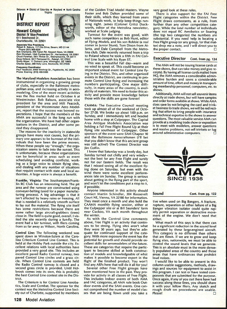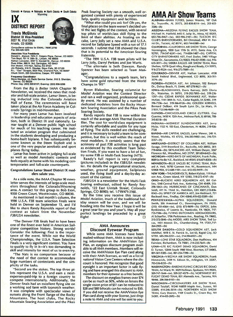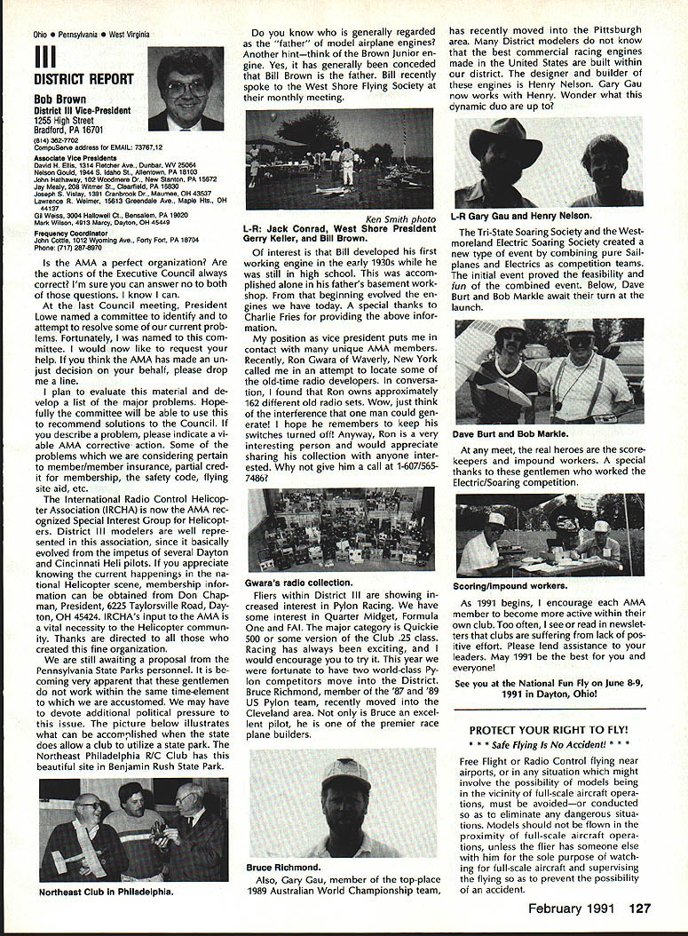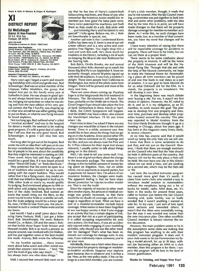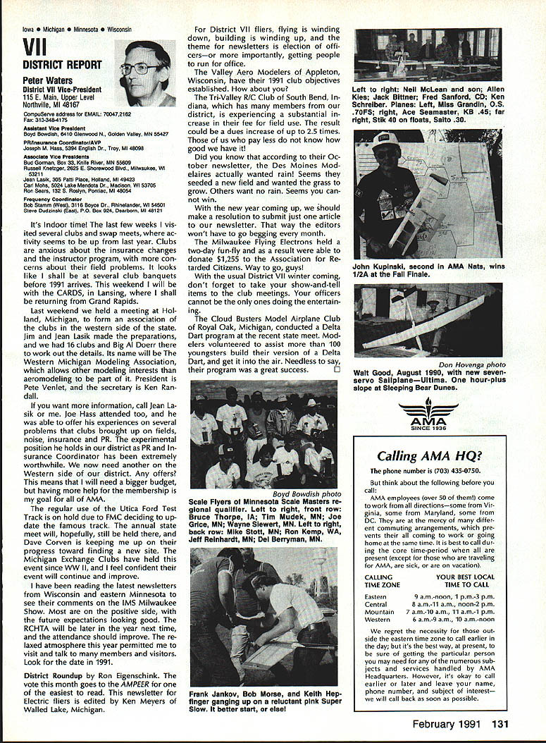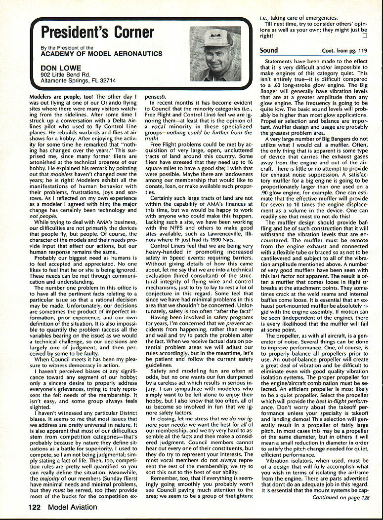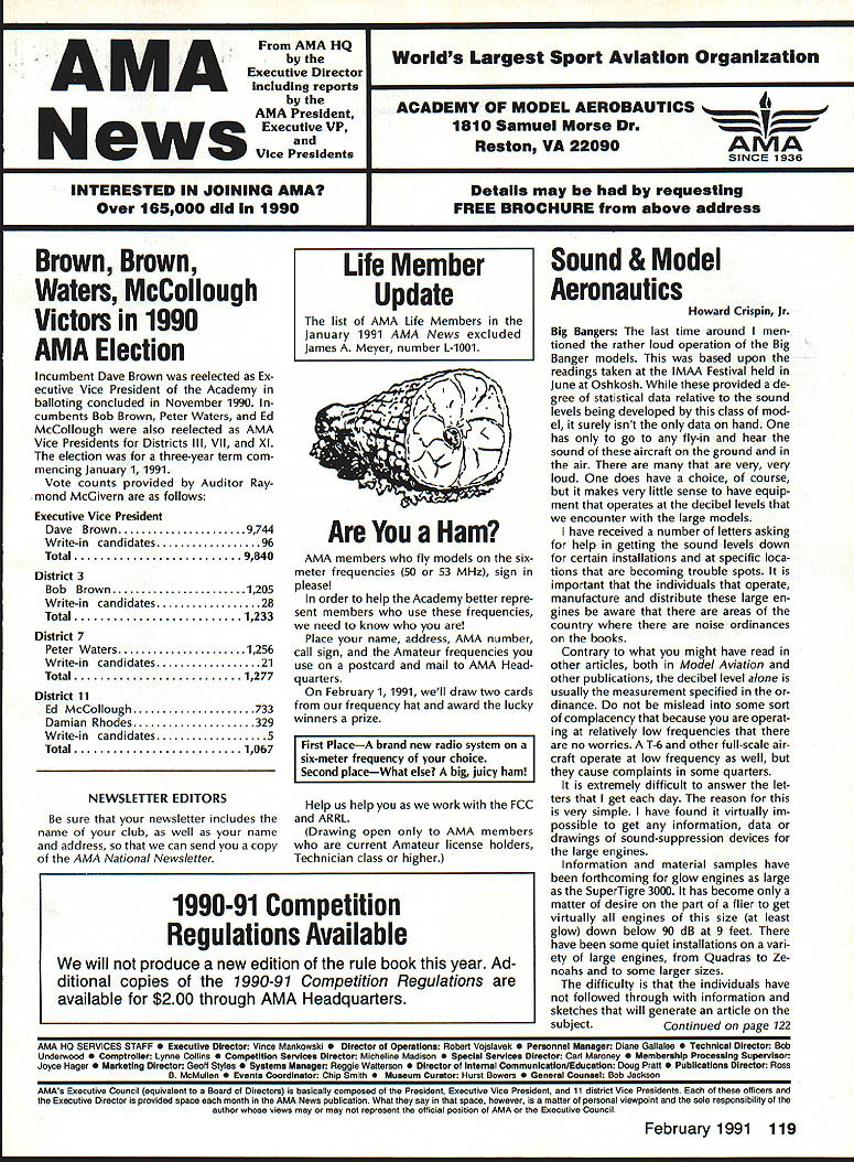 From AMA HQ theWorlds Largest Sport Aviation Organization AM Executive Director including reports theACADEMY OF MODEL AEROBAUTICS AMA President Executive VP1810 Samuel Morse Dr New Vice PresidentsReston VA 22090AMA WSINCE 1936 INTERESTED IN JOINING AMADetails may requesting Over 165000 dId 1990FREE BROCHURE above address Brown Brown Waters McCollough Victors 1990 AMA Election Incumbent Dave Brown reelected Ex ecutive Vice President Academy balloting concluded November 1990 cumbents Bob Brown Peter Waters Ed McCollough also reelected AMA Vice Presidents Districts Ill VII Xl election three-year term com mencing January 1 1991 Vote counts provided Auditor Ray mond McGivern follows Executive Vice President Dave Brown9744 Write-in candidates96 Total9840 District 3 Bob Brown1205 Write-in candidates28 Total1233 District 7 Peter Waters1256 Write-in candidates21 Total1277 District 11 Ed McCollough733 Damian Rhodes329 Write-in candidates5 Total1067 NEWSLETTER EDITORS sure newsletter includes name club well name address can send copy AMA National Newsletter Are Ham AMA members fly models sixmeter frequencies 50 53 MHz sign please order help Academy better repre sent members use frequencies need know Place name address AMA number call sign Amateur frequencies use postcard mail AMA Head quarters February 11991 well draw two cards frequency hat award lucky winners prize First PlaceA brand new radio system six-meter frequency choice Second placeWhat else big juicy ham Help us help work FCC ARRL Drawing open AMA members current Amateur license holders Technician class higher Sound & Model Aeronautics Howard Crispin Jr Big Dangers last time around men tioned rather loud operation Big Banger models based upon readings taken IMAA Festival held June Oshkosh provided de gree statistical data relative sound levels being developed class mod el surely isnt data hand has go fly-in hear sound aircraft ground air very very loud does have choice course makes very little sense have equip ment operates decibel levels encounter large models have received number letters asking help getting sound levels down certain installations specific loca tions becoming trouble spots important individuals operate manufacture distribute large en gines aware areas country noise ordinances books Contrary what might have read other articles both Model Aviation other publications decibel level alone usually measurement specified dinance mislead some sort complacency because operat ing relatively low frequencies no worries T-6 other full-scale air craft operate low frequency well cause complaints some quarters extremely difficult answer let ters get day reason very simple have found virtually im possible get information data drawings sound-suppression devices large engines Information material samples have forthcoming glow engines large SuperTigre 3000 has become matter desire part flier get virtually engines size least glow down below 90 dB 9 feet have some quiet installations vari ety large engines Quadras Ze noahs some larger sizes difficulty individuals have followed through information sketches will generate article subjectContinued page 122 AMA HO SERVICES STAFF S Executive Director ymca Mankowaki 0 Director Operations Robert voisiavek 0 Personnel Manager Diane Gailalee S Technical Director Bob underwood S Comptroller Lynne Collins 0 Competition Services Director Micheline Madison S Special Services Director Carl Maroney C Membership Processing Supervisor Joyce Hager S Marketing Director Geoff Styles S Systems Manager Reggie wstteraon S Director internal Communication/Education Doug Pratt C Publications Director Roas B McMullen S Events Coordinator Chip Smith C Museum Curator Hurst Bowers S Genersi Counsel Bob Jackeon February 1991 119 Life Member Update list AMA Life Members January 1991 AMA News excluded James Meyer number L-1001 1990-91 Competition Regulations Available will produce new edition rule book year Ad ditional copies 1990-9 1 Competition Regulations available $200 through AMA Headquarters AMAs Executive Council equivalent Board Directors basically composed ot President Executive vice President 11 district vice Presidents officers Executive Director provided space month AMA News publication what say space however matter personal viewpoint sole responsibility author views may may represent official position AMA Executive Council PR Roundup Geoffrey Styles Director Marketing September 1990 issue Model Avi ation magazine Bill Baker commented Louisiana legislation introduced defeated committee Bill 1002 case missed item would have placed control model aircraft flying hands parish county State confusion unnecessary probably prejudicial regulations might have sprung individual parish control could have made intol erable situation aeromodelers Loui siana combined lobbying program AMA HQ Louisiana clubs developed plan put action overwhelmed hearing knowledge facts bodies Com mittee amazed strength abil ities Louisiana delegation showed up hearing Baton Rouge state capital great example num bers count illustration make us realize want something have stand up counted As follow up story mail recently contained letter Shreveport Louisiana Area Radio Kontrol Society Inc Signed James Leisk President SHARKS contained copies invitations sent state legislators persons running office next ejection Included mailing list senators rep resentatives candidates local offices city council mayor school board invitations asked politicians attend club regional event special guests directed report annou nc ers stand could identified present invitations further stated funds derived event would nated Northwest ChapterAmerican Diabetes Association Model fliers Texas Oklahoma Arkansas Mississippi Alabama Tennessee well Louisiana ex pected participate fact high lighted special invitees SHARKS group deserves big pat back such detailed dedicated planning publicize event sport politicians office also candidates What better way spread knowledge benefits mo