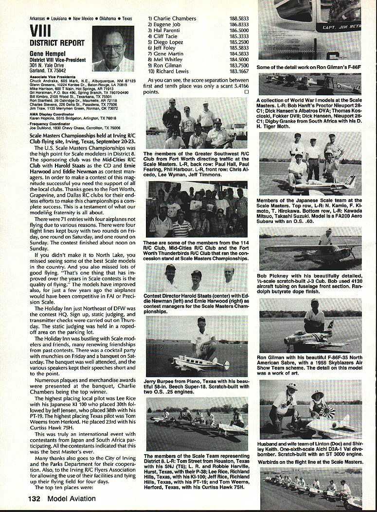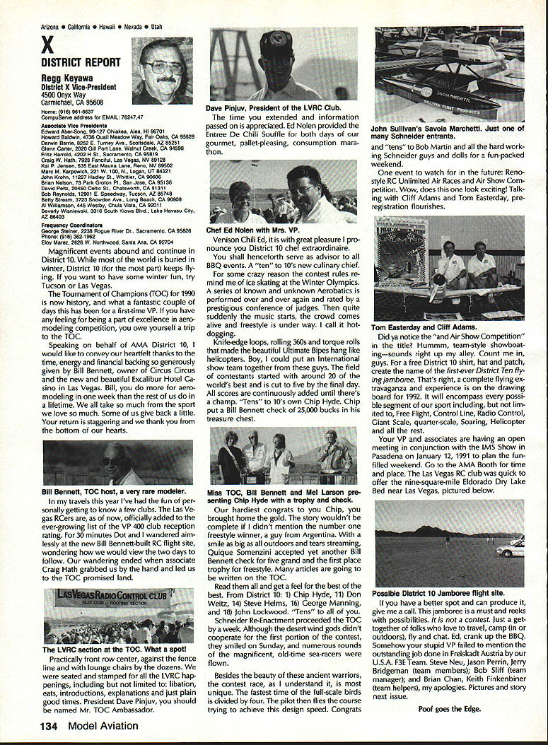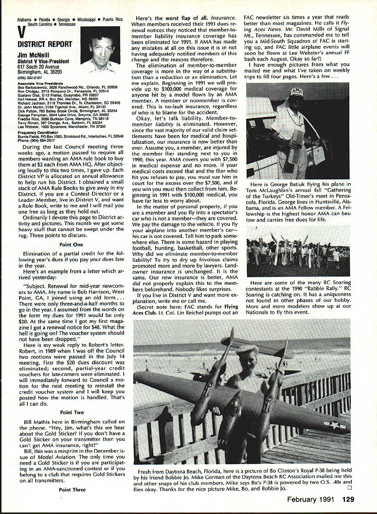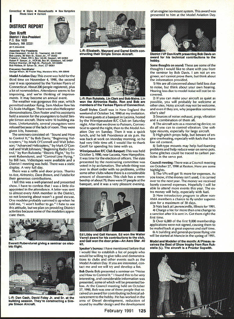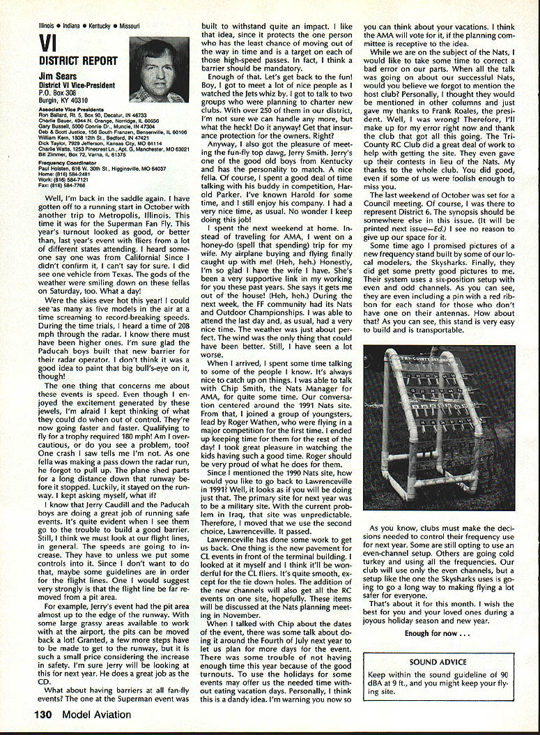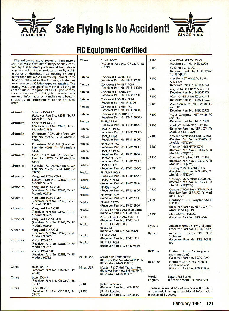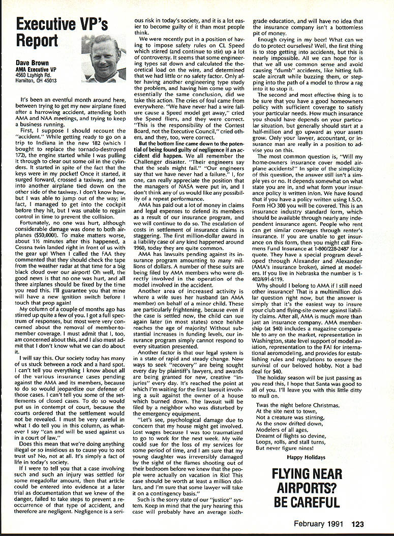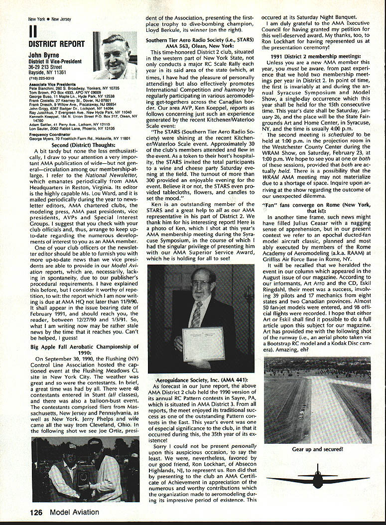 From AMA HQ theWorlds Largest Sport Aviation Organization AM Executive Director including reports theACADEMY OF MODEL AEROBAUTICS AMA President Executive VP1810 Samuel Morse Dr New Vice PresidentsReston VA 22090AMA WSINCE 1936 INTERESTED IN JOINING AMADetails may requesting Over 165000 dId 1990FREE BROCHURE above address Brown Brown Waters McCollough Victors 1990 AMA Election Incumbent Dave Brown reelected Ex ecutive Vice President Academy balloting concluded November 1990 cumbents Bob Brown Peter Waters Ed McCollough also reelected AMA Vice Presidents Districts Ill VII Xl election three-year term com mencing January 1 1991 Vote counts provided Auditor Ray mond McGivern follows Executive Vice President Dave Brown9744 Write-in candidates96 Total9840 District 3 Bob Brown1205 Write-in candidates28 Total1233 District 7 Peter Waters1256 Write-in candidates21 Total1277 District 11 Ed McCollough733 Damian Rhodes329 Write-in candidates5 Total1067 NEWSLETTER EDITORS sure newsletter includes name club well name address can send copy AMA National Newsletter Are Ham AMA members fly models sixmeter frequencies 50 53 MHz sign please order help Academy better repre sent members use frequencies need know Place name address AMA number call sign Amateur frequencies use postcard mail AMA Head quarters February 11991 well draw two cards frequency hat award lucky winners prize First PlaceA brand new radio system six-meter frequency choice Second placeWhat else big juicy ham Help us help work FCC ARRL Drawing open AMA members current Amateur license holders Technician class higher Sound & Model Aeronautics Howard Crispin Jr Big Dangers last time around men tioned rather loud operation Big Banger models based upon readings taken IMAA Festival held June Oshkosh provided de gree statistical data relative sound levels being developed class mod el surely isnt data hand has go fly-in hear sound aircraft ground air very very loud does have choice course makes very little sense have equip ment operates decibel levels encounter large models have received number letters asking help getting sound levels down certain installations specific loca tions becoming trouble spots important individuals operate manufacture distribute large en gines aware areas country noise ordinances books Contrary what might have read other articles both Model Aviation other publications decibel level alone usually measurement specified dinance mislead some sort complacency because operat ing relatively low frequencies no worries T-6 other full-scale air craft operate low frequency well cause complaints some quarters extremely difficult answer let ters get day reason very simple have found virtually im possible get information data drawings sound-suppression devices large engines Information material samples have forthcoming glow engines large SuperTigre 3000 has become matter desire part flier get virtually engines size least glow down below 90 dB 9 feet have some quiet installations vari ety large engines Quadras Ze noahs some larger sizes difficulty individuals have followed through information sketches will generate article subjectContinued page 122 AMA HO SERVICES STAFF S Executive Director ymca Mankowaki 0 Director Operations Robert voisiavek 0 Personnel Manager Diane Gailalee S Technical Director Bob underwood S Comptroller Lynne Collins 0 Competition Services Director Micheline Madison S Special Services Director Carl Maroney C Membership Processing Supervisor Joyce Hager S Marketing Director Geoff Styles S Systems Manager Reggie wstteraon S Director internal Communication/Education Doug Pratt C Publications Director Roas B McMullen S Events Coordinator Chip Smith C Museum Curator Hurst Bowers S Genersi Counsel Bob Jackeon February 1991 119 Life Member Update list AMA Life Members January 1991 AMA News excluded James Meyer number L-1001 1990-91 Competition Regulations Available will produce new edition rule book year Ad ditional copies 1990-9 1 Competition Regulations available $200 through AMA Headquarters AMAs Executive Council equivalent Board Directors basically composed ot President Executive vice President 11 district vice Presidents officers Executive Director provided space month AMA News publication what say space however matter personal viewpoint sole responsibility author views may may represent official position AMA Executive Council PR Roundup Geoffrey Styles Director Marketing September 1990 issue Model Avi ation magazine Bill Baker commented Louisiana legislation introduced defeated committee Bill 1002 case missed item would have placed control model aircraft flying hands parish county State confusion unnecessary probably prejudicial regulations might have sprung individual parish control could have made intol erable situation aeromodelers Loui siana combined lobbying program AMA HQ Louisiana clubs developed plan put action overwhelmed hearing knowledge facts bodies Com mittee amazed strength abil ities Louisiana delegation showed up hearing Baton Rouge state capital great example num bers count illustration make us realize want something have stand up counted As follow up story mail recently contained letter Shreveport Louisiana Area Radio Kontrol Society Inc Signed James Leisk President SHARKS contained copies invitations sent state legislators persons running office next ejection Included mailing list senators rep resentatives candidates local offices city council mayor school board invitations asked politicians attend club regional event special guests directed report annou nc ers stand could identified present invitations further stated funds derived event would nated Northwest ChapterAmerican Diabetes Association Model fliers Texas Oklahoma Arkansas Mississippi Alabama Tennessee well Louisiana ex pected participate fact high lighted special invitees SHARKS group deserves big pat back such detailed dedicated planning publicize event sport politicians office also candidates What better way spread knowledge benefits mo