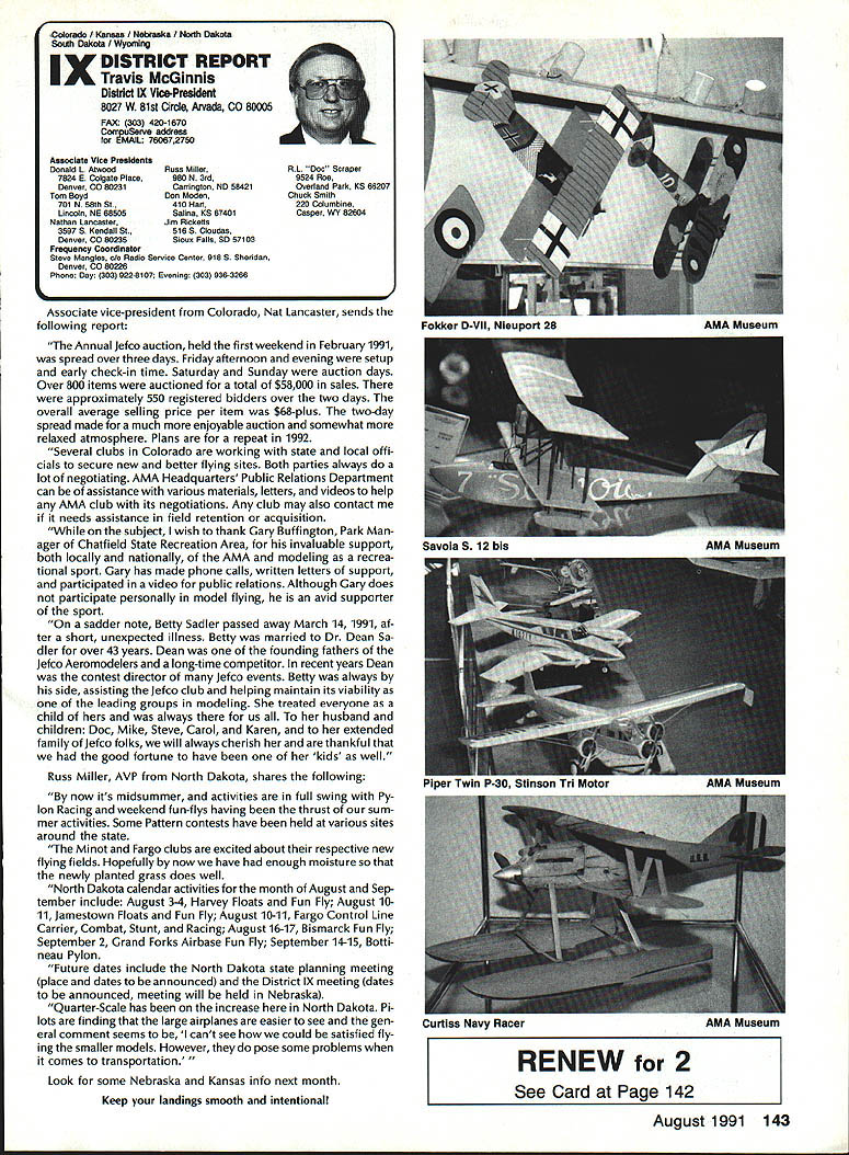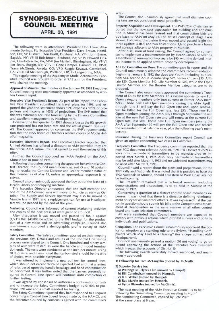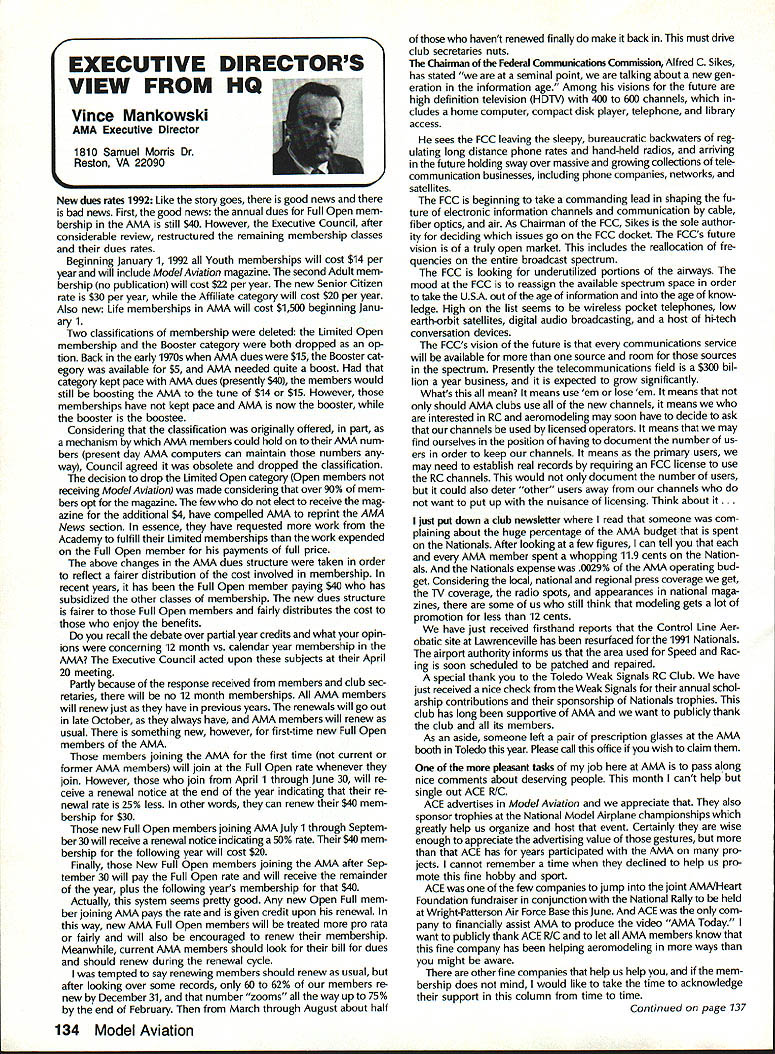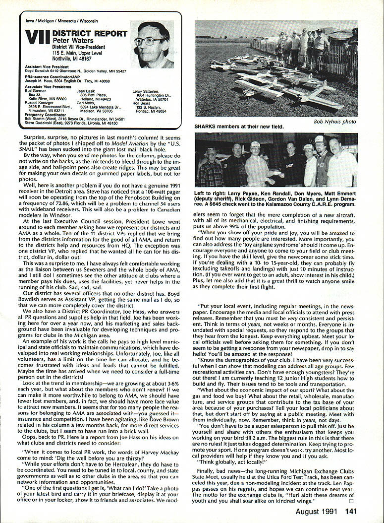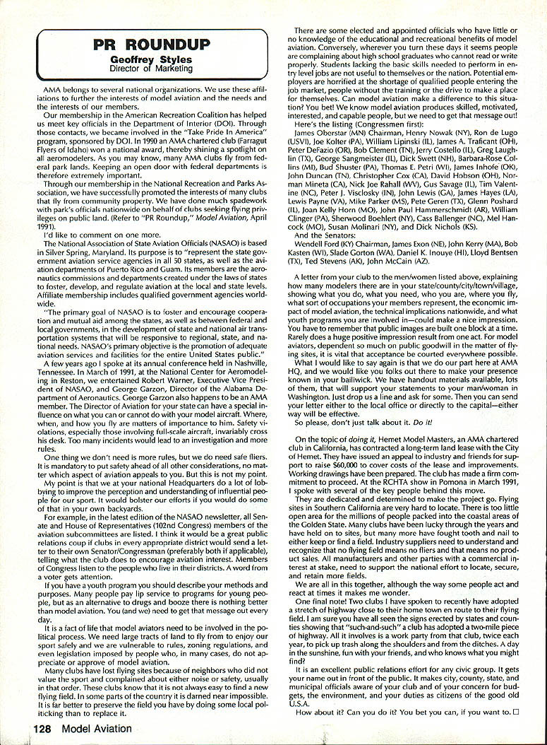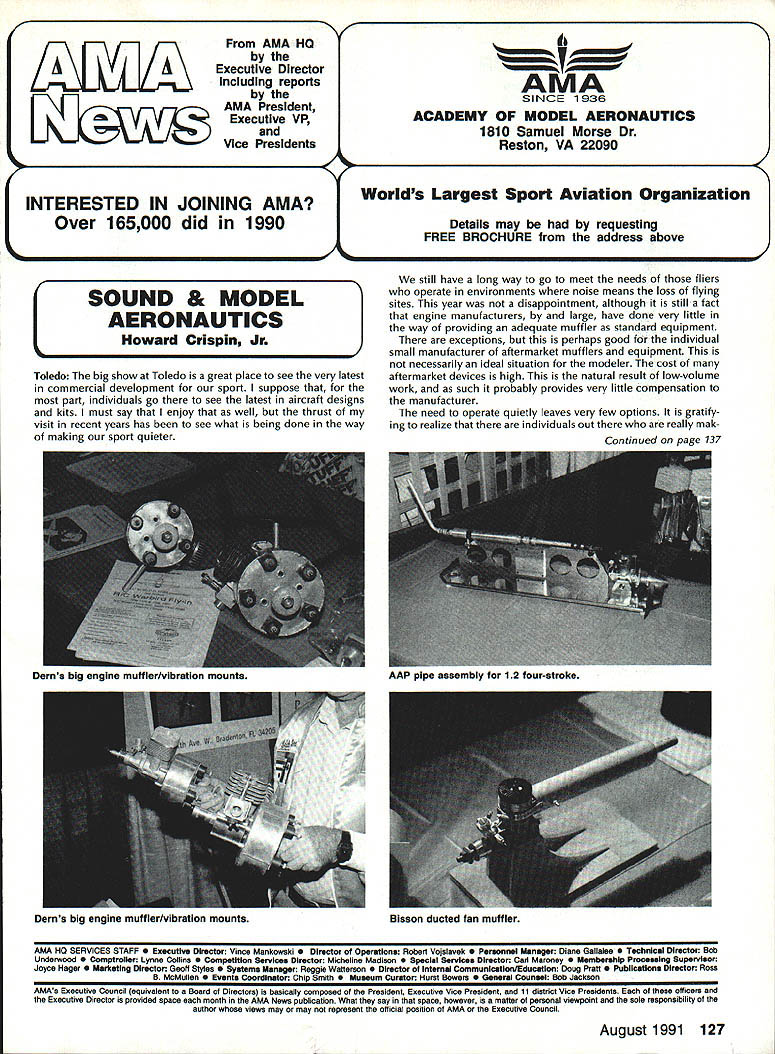 INTERESTED IN JOINING AMAWorlds Largest Sport Aviation Organization Over 165000 did 1990 ails may requesting FREE BROCHURE address above SOUND & MODEL AERONAUTICS Howard Crispin Jr Toledo big show Toledo great place see very latest commercial development sport suppose part individuals go see latest aircraft designs kits must say enjoy well thrust visit recent years has see what being done way making sport quieter Derns big engine muffler/vibration mounts j still have long way go meet needs fliers operate environments noise means loss flying sites year disappointment although still fact engine manufacturers large have done very little way providing adequate muffler standard equipment exceptions perhaps good individual small manufacturer aftermarket mufflers equipment necessarily ideal situation modeler cost aftermarket devices high natural result low-volume work such probably provides very little compensation manufacturer need operate quietly leaves very few options gratify ing realize individuals out really mak Continued page 137 AMA HO SERVICES STAFF 0 Executive Director Vince Mankowaki 0 DIrector Operations Robert Vojslsvek 0 Personnel Manager Diane Gallalee e Technical Director Bob underwood S Comptroller Lynn Collins 0 Competition Services Director Micheline Madison e Special Services Director Cart Maroney S Membership Processing Supervisor Joyce Hager eting Director Geoff Styles ems Manager Reggie Watterson 0 Director internal Communication/Educatlon Doug Pratt 0 Publications Director Ross B McMullen 0 Events Coocdinator Chip Smith 0 Museum Curator Hurst Bowers 0 General Counsel Bob Jackson August 1991 127 AMA HO Executive Director including reports AMA President Executive VP Vice Presidents AMA SINCE 1936 ACADEMY OF MODEL AERONAUTICS 1810 Samuel Morse Dr Reston VA 22090 Derns ig engine mutierivioration mounts AAP pipe assembly 12 four-Stroke Bisson ducted fan muffler AMAs Executive Council tectuivalent Board Directors basically composed President Executive Vice Prasident 11 district Vice Presidents officers Executive Director provided space month AMA News publication What ssy space however matter personal viewpoint sole responsibility author views may may represent official position AMA Executive Council PR ROUNDUP Geoffrey Styles Director Marketing AMA belongs severai national organizations use affil iations further interests model aviation needs interests members membership American Recreation Coalition has helped us meet key officials Department Interior DOI Through contacts became involved Take Pride America program sponsored DOI 1990 AMA chartered club Farragut Flyers Idaho won national award thereby shining spotlight aeromodelers As may know AMA clubs fly fed eral park lands Keeping open door federal departments therefore extremely important Through membership National Recreation Parks As sociation have successfully promoted interests clubs fly community property have done much spadework parks officials nationwide behalf clubs seeking flying priv ileges public land Refer PR Roundup ModelAviation April 1991 Id like comment National Association State Aviation Officials NASAO based Silver Spring Maryland Its purpose represent state gov ernment aviation service agencies 50 states well avi ation departments Puerto Rico Guam Its members aero nautics commissions departments created under laws states foster develop regulate aviation local state levels Affiliate membership includes qualified government agencies world wide primary goal NASAO foster encourage coopera tion mutual aid among states well between federal local governments development state national air trans portation systems will responsive regional state na tional needs NASAOs primary objective promotion adequate aviation services facilities entire United States public few years ago spoke its annual conference held Nashville Tennessee March 1991 National Center Aeromodel ing Reston entertained Robert Warner Executive Vice Presi dent NASAO George Garzon Director Alabama De partment Aeronautics George Garzon also happens AMA member Director Aviation state can have special fluence what can cannot model aircraft fly matters importance him Safety vi olations especially involving full-scale aircraft invariably cross desk Too incidents would lead investigation rules thing dont need rules need safe fliers mandatory put safety ahead other considerations no mat ter aspect aviation appeals point point national Headquarters lot lob bying improve perception understanding influential peo ple sport would bolster efforts would some own backyards example latest edition NASAO newsletter Sen ate House Representatives 102nd Congress members aviation subcommittees listed think would great public relations coup clubs appropriate district would send let ter own Senator/Congressman preferably both applicable telling what club does encourage aviation interest Members Congress listen people live districts word voter gets attention have youth program should describe methods purposes people pay lip service programs young peo ple alternative drugs booze nothing better model aviation need get message out day fact life model aviators need involved po litical process need large tracts land fly enjoy sport safely vulnerable rules zoning regulations legislation imposed people cases ap preciate approve model aviation clubs have lost flying sites because neighbors did value sport complained about either noise safety usually order clubs know always easy find new flying field some parts country darned near impossible far better preserve field have doing some local pol iticking replace some elected appointed officials have little no knowledge educational recreational benefits model aviation Conversely wherever turn days seems people complaining about high school graduates cannot read write properly Students lacking basic skills needed perform en try level jobs useful themselves nation Potential em ployers horrified shortage qualified people entering job market 