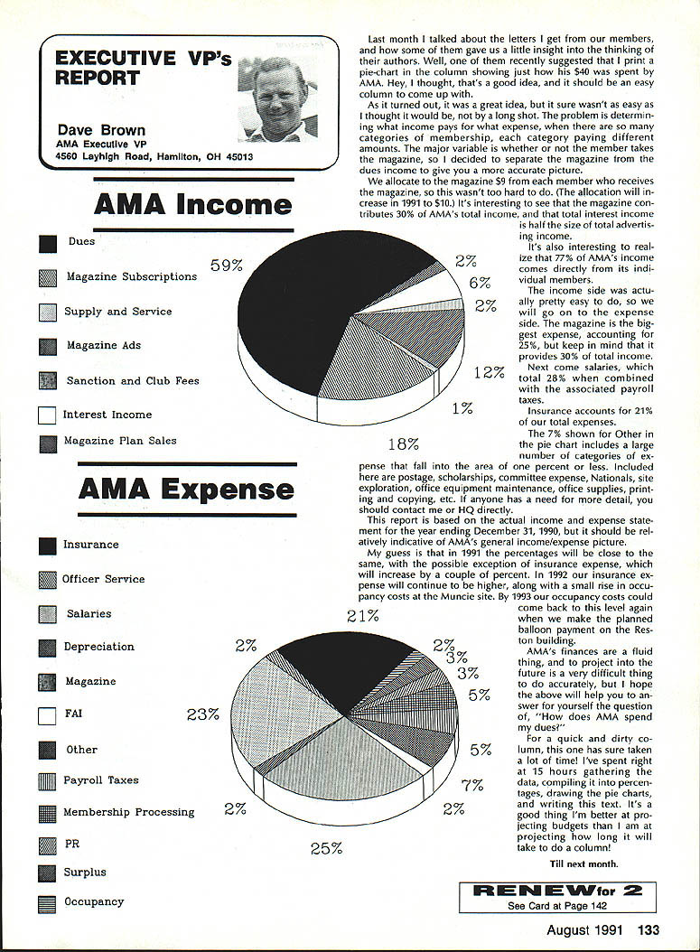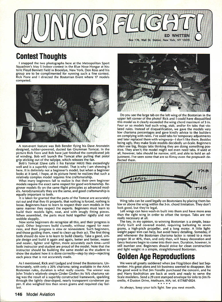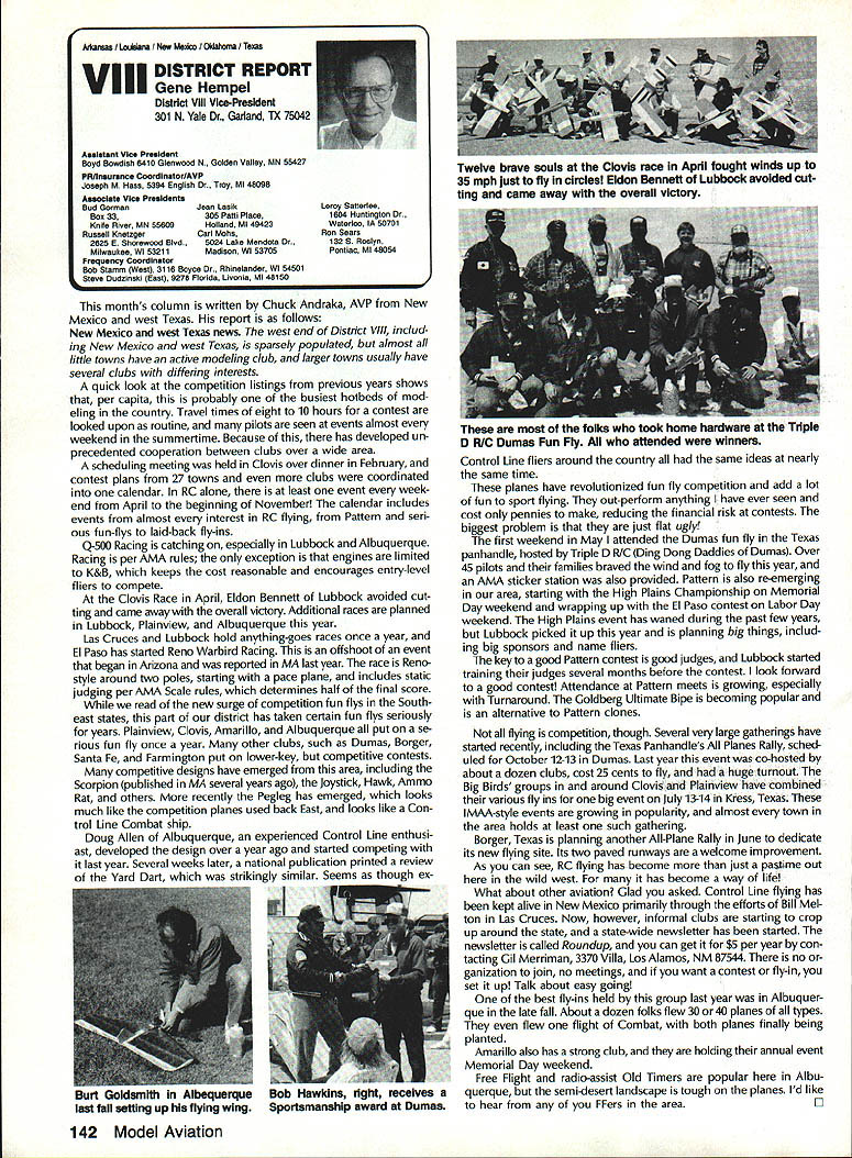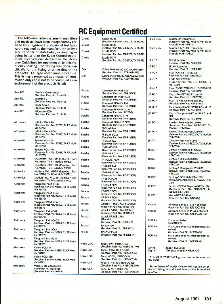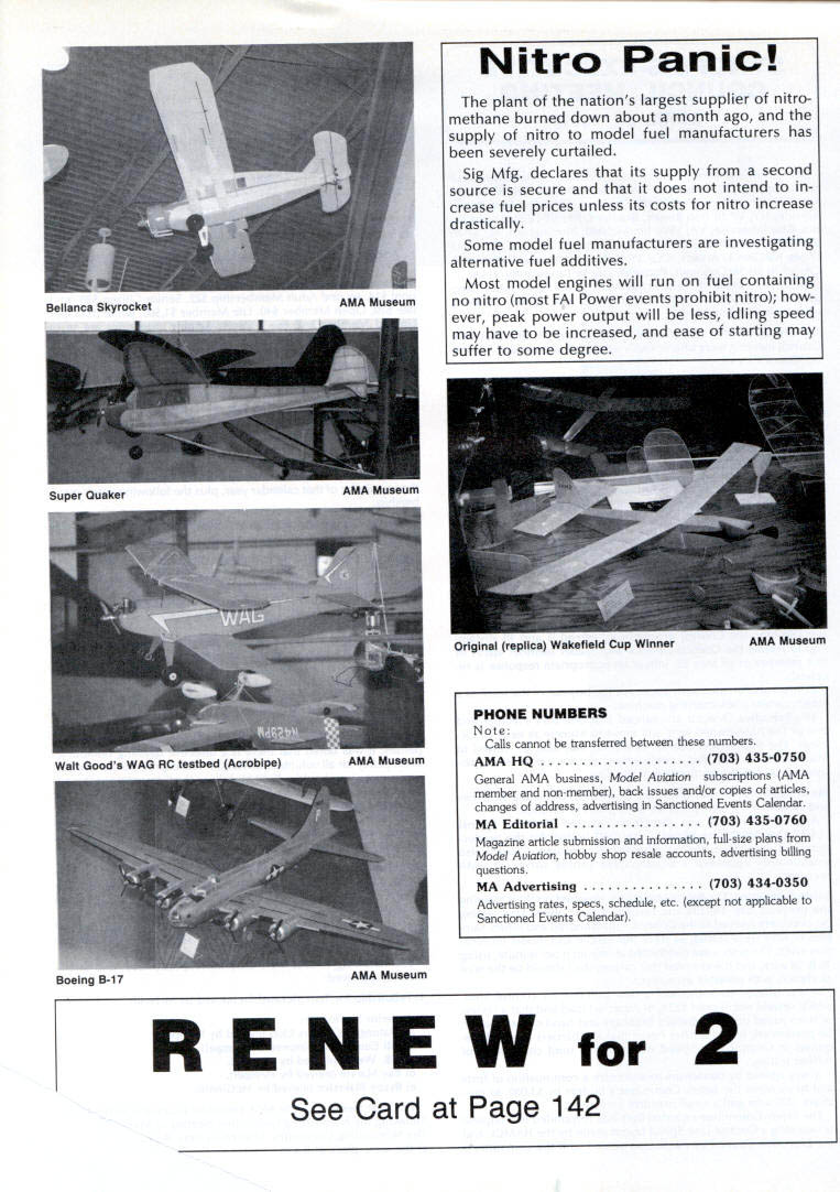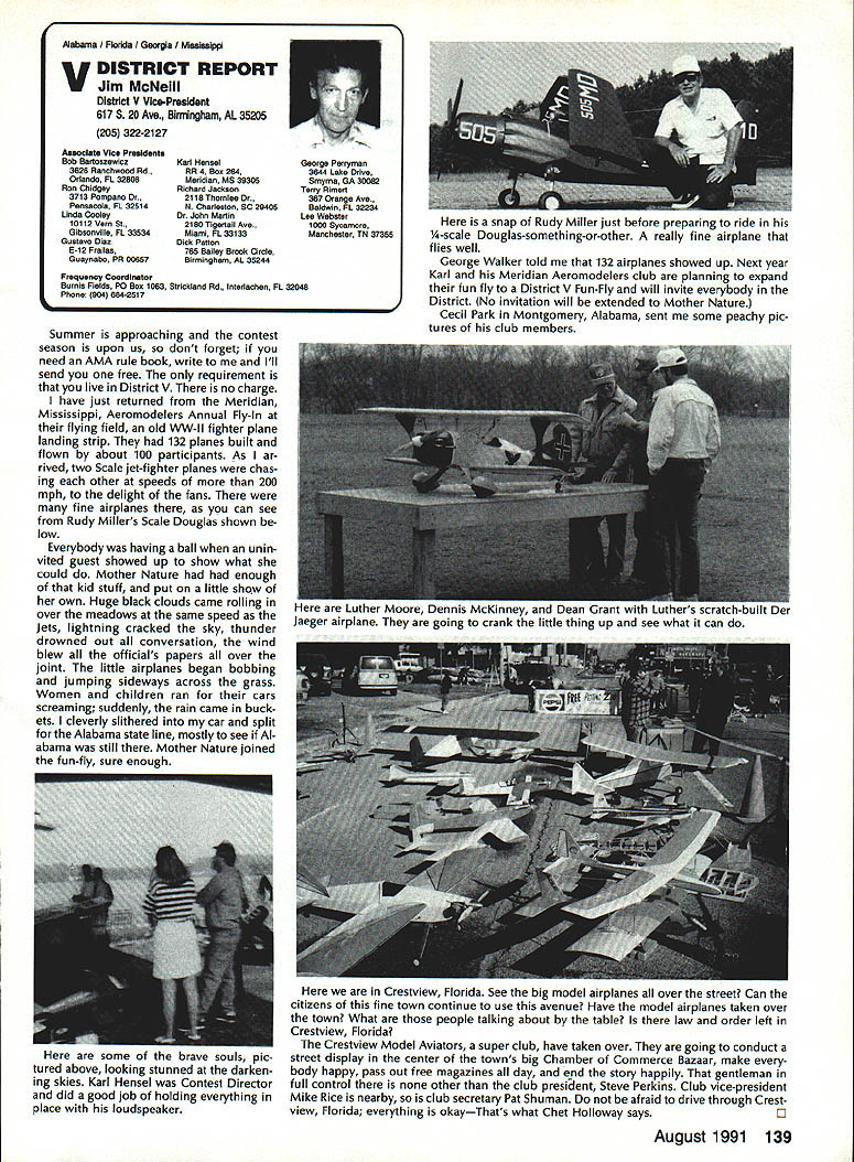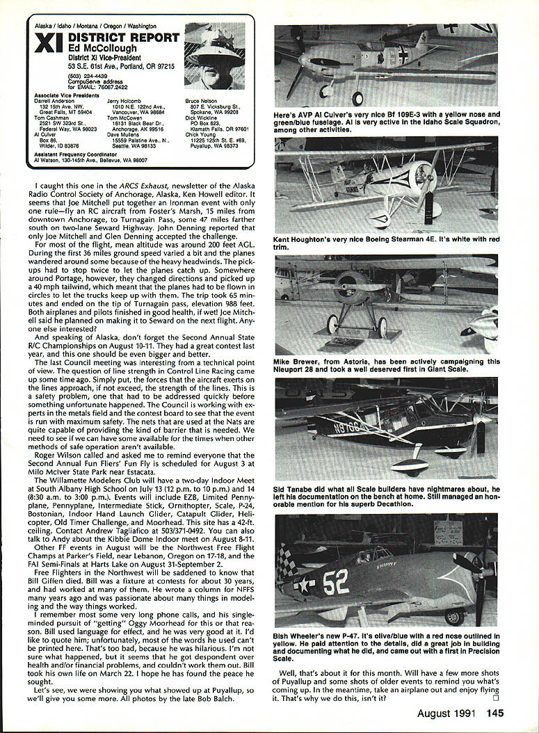 INTERESTED IN JOINING AMAWorlds Largest Sport Aviation Organization Over 165000 did 1990 ails may requesting FREE BROCHURE address above SOUND & MODEL AERONAUTICS Howard Crispin Jr Toledo big show Toledo great place see very latest commercial development sport suppose part individuals go see latest aircraft designs kits must say enjoy well thrust visit recent years has see what being done way making sport quieter Derns big engine muffler/vibration mounts j still have long way go meet needs fliers operate environments noise means loss flying sites year disappointment although still fact engine manufacturers large have done very little way providing adequate muffler standard equipment exceptions perhaps good individual small manufacturer aftermarket mufflers equipment necessarily ideal situation modeler cost aftermarket devices high natural result low-volume work such probably provides very little compensation manufacturer need operate quietly leaves very few options gratify ing realize individuals out really mak Continued page 137 AMA HO SERVICES STAFF 0 Executive Director Vince Mankowaki 0 DIrector Operations Robert Vojslsvek 0 Personnel Manager Diane Gallalee e Technical Director Bob underwood S Comptroller Lynn Collins 0 Competition Services Director Micheline Madison e Special Services Director Cart Maroney S Membership Processing Supervisor Joyce Hager eting Director Geoff Styles ems Manager Reggie Watterson 0 Director internal Communication/Educatlon Doug Pratt 0 Publications Director Ross B McMullen 0 Events Coocdinator Chip Smith 0 Museum Curator Hurst Bowers 0 General Counsel Bob Jackson August 1991 127 AMA HO Executive Director including reports AMA President Executive VP Vice Presidents AMA SINCE 1936 ACADEMY OF MODEL AERONAUTICS 1810 Samuel Morse Dr Reston VA 22090 Derns ig engine mutierivioration mounts AAP pipe assembly 12 four-Stroke Bisson ducted fan muffler AMAs Executive Council tectuivalent Board Directors basically composed President Executive Vice Prasident 11 district Vice Presidents officers Executive Director provided space month AMA News publication What ssy space however matter personal viewpoint sole responsibility author views may may represent official position AMA Executive Council PR ROUNDUP Geoffrey Styles Director Marketing AMA belongs severai national organizations use affil iations further interests model aviation needs interests members membership American Recreation Coalition has helped us meet key officials Department Interior DOI Through contacts became involved Take Pride America program sponsored DOI 1990 AMA chartered club Farragut Flyers Idaho won national award thereby shining spotlight aeromodelers As may know AMA clubs fly fed eral park lands Keeping open door federal departments therefore extremely important Through membership National Recreation Parks As sociation have successfully promoted interests clubs fly community property have done much spadework parks officials nationwide behalf clubs seeking flying priv ileges public land Refer PR Roundup ModelAviation April 1991 Id like comment National Association State Aviation Officials NASAO based Silver Spring Maryland Its purpose represent state gov ernment aviation service agencies 50 states well avi ation departments Puerto Rico Guam Its members aero nautics commissions departments created under laws states foster develop regulate aviation local state levels Affiliate membership includes qualified government agencies world wide primary goal NASAO foster encourage coopera tion mutual aid among states well between federal local governments development state national air trans portation systems will responsive regional state na tional needs NASAOs primary objective promotion adequate aviation services facilities entire United States public few years ago spoke its annual conference held Nashville Tennessee March 1991 National Center Aeromodel ing Reston entertained Robert Warner Executive Vice Presi dent NASAO George Garzon Director Alabama De partment Aeronautics George Garzon also happens AMA member Director Aviation state can have special fluence what can cannot model aircraft fly matters importance him Safety vi olations especially involving full-scale aircraft invariably cross desk Too incidents would lead investigation rules thing dont need rules need safe fliers mandatory put safety ahead other considerations no mat ter aspect aviation appeals point point national Headquarters lot lob bying improve perception understanding influential peo ple sport would bolster efforts would some own backyards example latest edition NASAO newsletter Sen ate House Representatives 102nd Congress members aviation subcommittees listed think would great public relations coup clubs appropriate district would send let ter own Senator/Congressman preferably both applicable telling what club does encourage aviation interest Members Congress listen people live districts word voter gets attention have youth program should describe methods purposes people pay lip service programs young peo ple alternative drugs booze nothing better model aviation need get message out day fact life model aviators need involved po litical process need large tracts land fly enjoy sport safely vulnerable rules zoning regulations legislation imposed people cases ap preciate approve model aviation clubs have lost flying sites because neighbors did value sport complained about either noise safety usually order clubs know always easy find new flying field some parts country darned near impossible far better preserve field have doing some local pol iticking replace some elected appointed officials have little no knowledge educational recreational benefits model aviation Conversely wherever turn days seems people complaining about high school graduates cannot read write properly Students lacking basic skills needed perform en try level jobs useful themselves nation Potential em ployers horrified shortage qualified people entering job market 