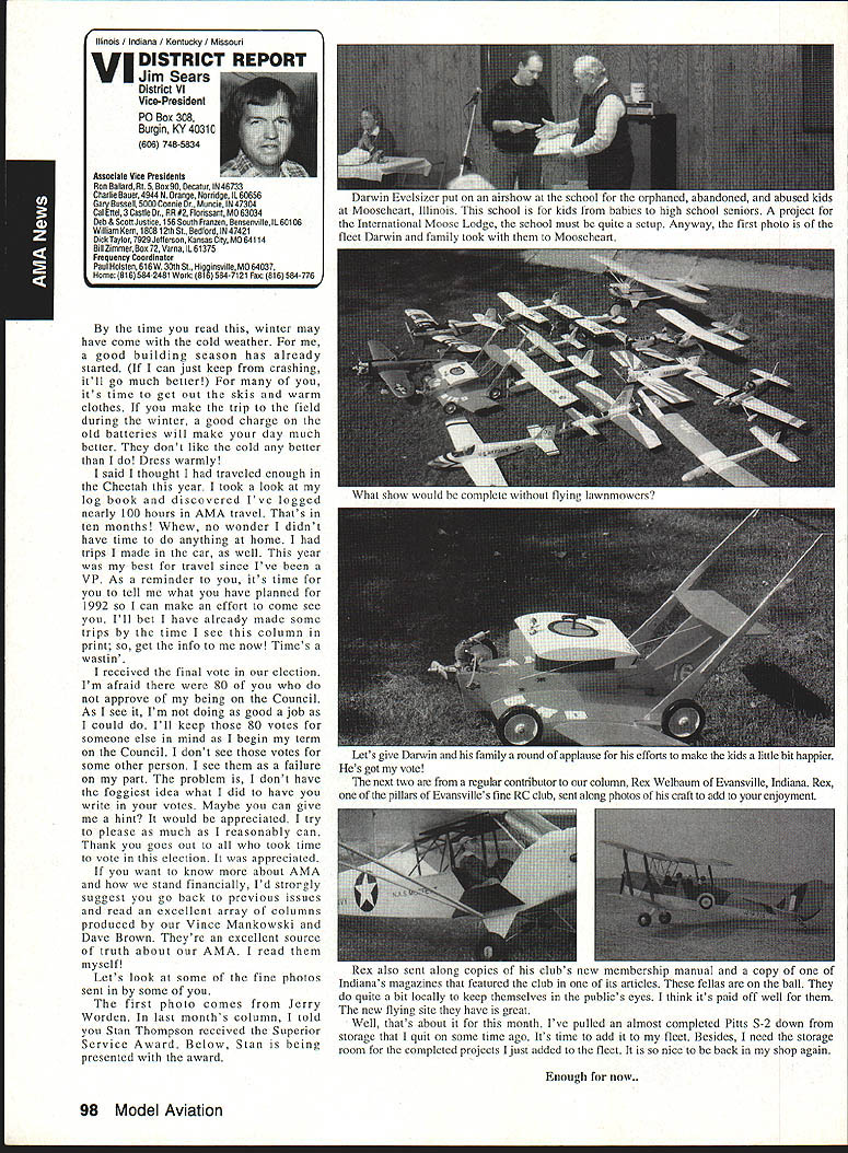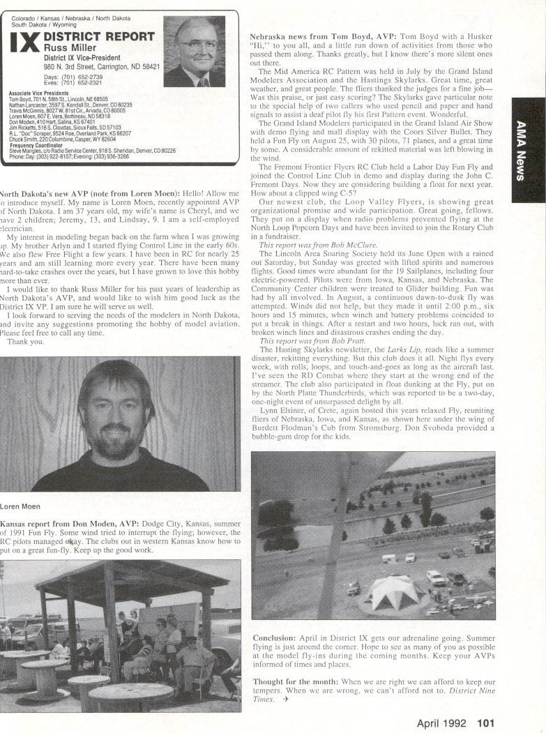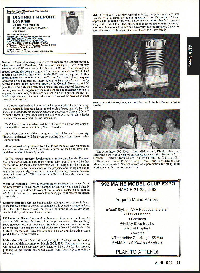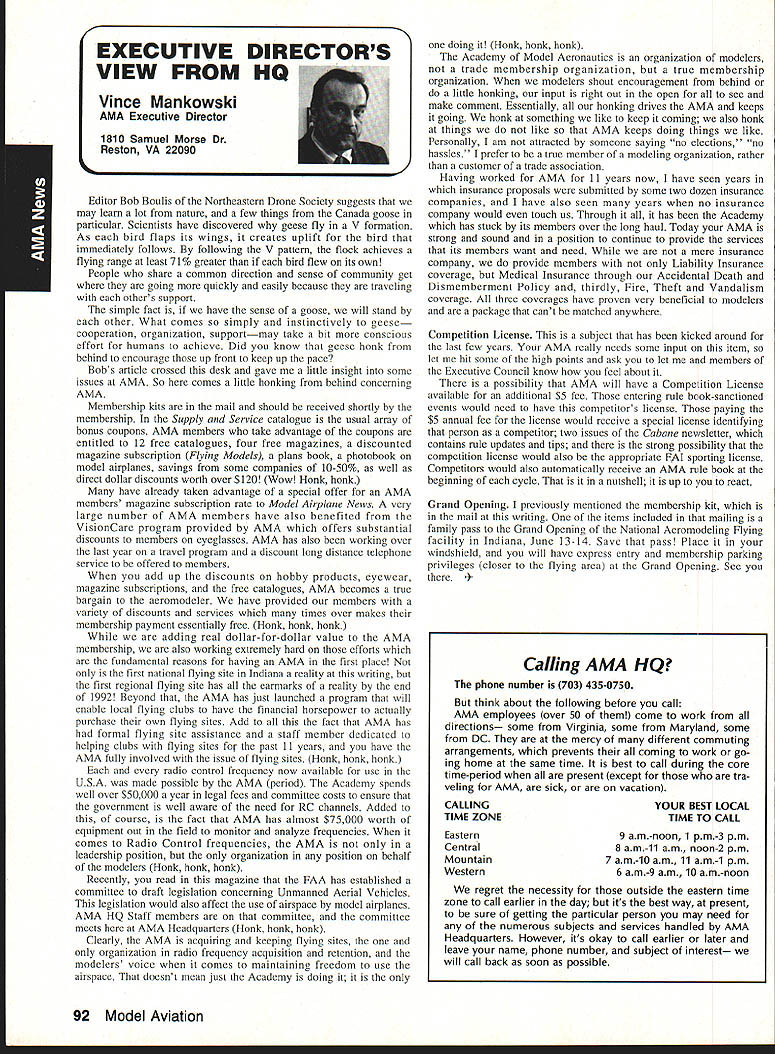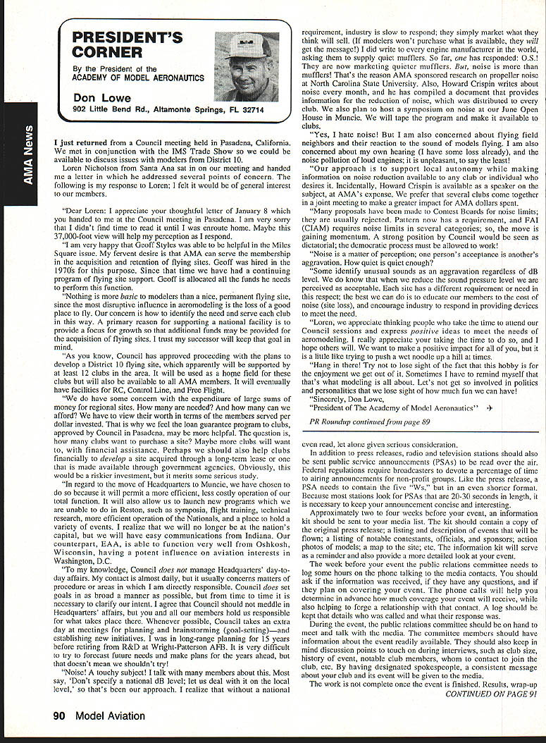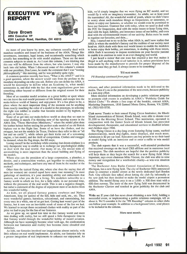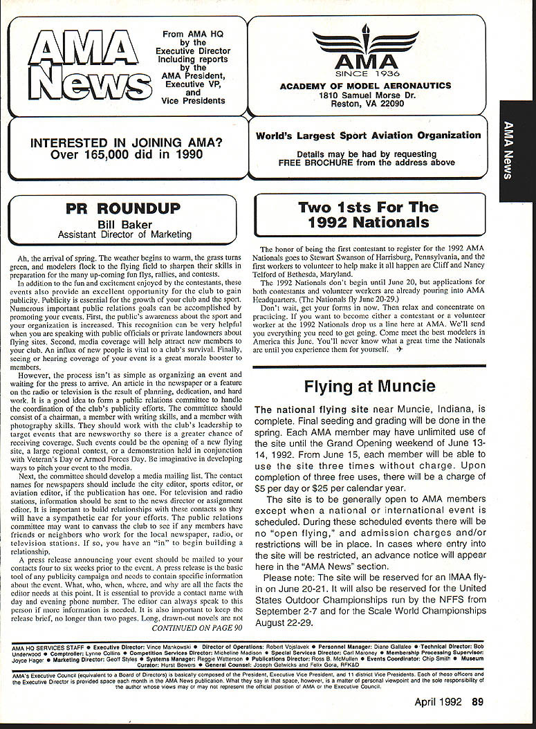 AA AMA HO Executive Director Including reports AMA resident Executive VP Vice Presidents AMA SINZE 1936 AL ACADEMY OF MODEL AERONAUTICS 1810 Samuel Morse Dr Reston VA 22090 INTERESTED IN JOINING AMA Worlds Largest Sp6rt Aviation Organization Over 165000 did 1990 ails may requesting FREE BROCHURE address above PR ROUNDUP Bill Baker Assistant Director Marketing Ah arrival spring weather begins warm grass turns green modelers flock flying field sharpen skills preparation up-coming fun flys rallies contests addition fun excitement enjoyed contestants events also provide excellent opportunity club gain publicity Publicity essential growth club sport Numerous important public relations goals can accomplished promoting events First publics awareness about sport organization increased recognition can very helpful speaking public officials private landowners about flying sites Second media coverage will help attract new members club An influx new people vital clubs survival Finally seeing hearing coverage event great morale booster members However process isnt simple organizing event waiting press arrive An article newspaper feature radio television result planning dedication hard work good idea form public relations committee handle coordination clubs publicity efforts committee should consist chairman member writing skills member photography skills should work clubs leadership target events newsworthy greater chance receiving coverage Such events could opening new flying site large regional contest demonstration held conjunction Veterans Day Armed Forces Day imaginative developing ways pitch event media Next committee should develop media mailing list contact names newspapers should include city editor sports editor aviation editor publication has television radio stations information should sent news director assignment editor important build relationships contacts will have sympathetic ear efforts public relations committee may want canvass club see members have friends neighbors work local newspaper radio television stations have begin building relationship press release announcing event should mailed contacts four six weeks prior event press release basic tool publicity campaign needs contain specific information about event What facts editor needs point essential provide contact name day evening phone number editor can always speak person information needed also important keep release brief no longer two pages Long drawn-out novels CONTINUED ON PAGE 90 ITwo Ists 1992 Nationals honor being first contestant register 1992 AMA Nationals goes Stewart Swanson Harrisburg Pennsylvania first workers volunteer help make happen Cliff Nancy Telford Bethesda Maryland 1992 Nationals dont begin until June 20 applications both contestants volunteer workers already pouring AMA Headquarters Nationals fly June 20-29 Dont wait get forms now relax concentrate practicing want become either contestant volunteer worker 1992 Nationals drop us line AMA Well send everything need get going Come meet best modelers America June Youll never know what great time Nationals until experience yourself ng Muncie national flying site near Muncie Indiana complete Final seeding grading will done spring AMA member may have unlimited use site until Grand Opening weekend June 1314 1992 June 15 member will able use site three times charge Upon completion three free uses will charge $5 per day $25 per calendar year site generally open AMA members except national international event scheduled During scheduled events will no open flying admission charges and/or restrictions will place cases entry site will restricted advance notice will appear AMA News section Please note site will reserved IMAA flyin June 20-21 will also reserved United States Outdoor Championships run NFFS September 2-7 Scale World Championships August 22-29 AMA HO SERVICES STAFF S Executive Director Vince Mankowski 0 Ofrector Operations Robert Vojalavek S Personnel Manager Diane Gallalee S Technical Director Bob Underwood troiler Lynne Collins 0 Competition Services Director Micheline Madison S Special Services Director Carl Maroney Membership Processing Supervisor Joyce Hager eting Director Geoff Styles 0 Systems Manager Reggie Watterson 0 Publications Director Ross B McMullen S Events Coordinator Chip Smith 0 Museum Curator Hurst Bowers 0 General Counsel Joseph Gelwicls Felix Gora RFK&D April 1992 89 AMAs Executive Council equivalent Board Directors basically composed President Executive Vice President 11 district Vice Presidents officers Executive Director provided space month AMA News publication What say space however matter personal viewpoint sole responsibility author views may may represent otticial position ot AMA Esecutive Council N just returned Council meeting held Pasadena California met conjunction IMS Trade Show could available discuss issues modelers District 10 Loren Nicholson Santa Ana sat meeting handed letter addressed several points concern following response Loren felt would general interest members Dear Loen appreciate thoughtful letter January 8 handed Council meeting Pasadena am very sorry didnt find time read until enroute home Maybe 37000-foot view will help perception respond am very happy Geoff Styles able helpful Miles Square issue fervent desire AMA can serve membership acquisition retention flying sites Geoff hired 1970s purpose Since time have continuing program flying site support Geoff allocated funds needs perform function Nothing basic modelers nice permanent flying site since disruptive influence aeromodeling loss good place fly concern identify need serve club way primary reason supporting national facility provide focus growth additional funds may provided acquisition flying sites trust successor will keep goal mind As know Council has approved proceeding plans develop District 10 flying site apparently will supported least 12 clubs area will used home field clubs will also available AMA members will eventually have facilities