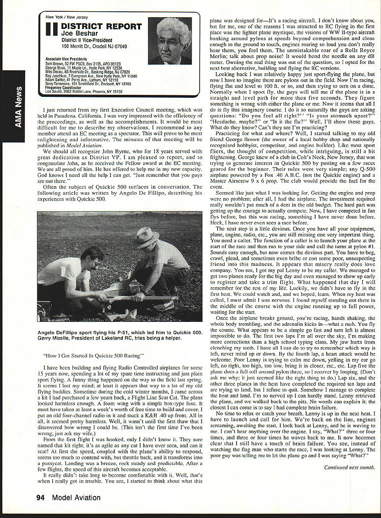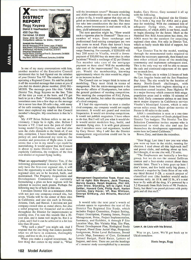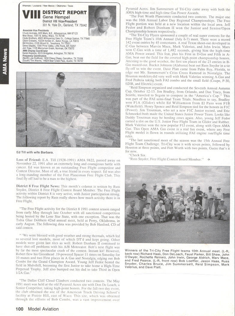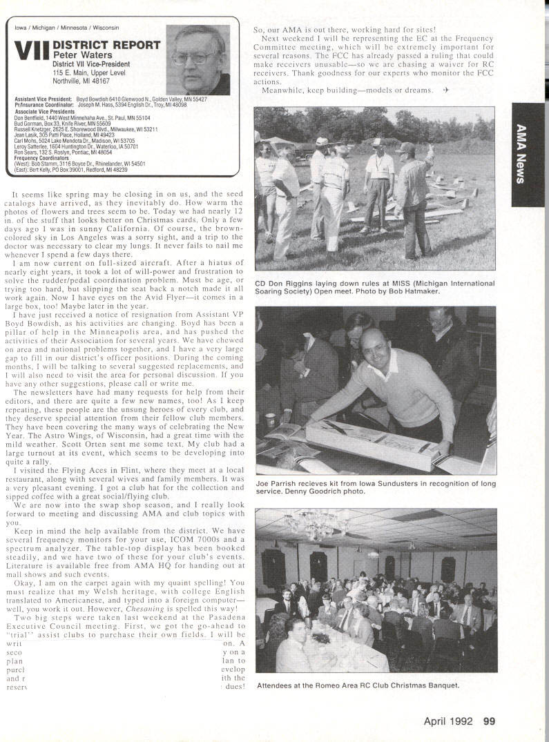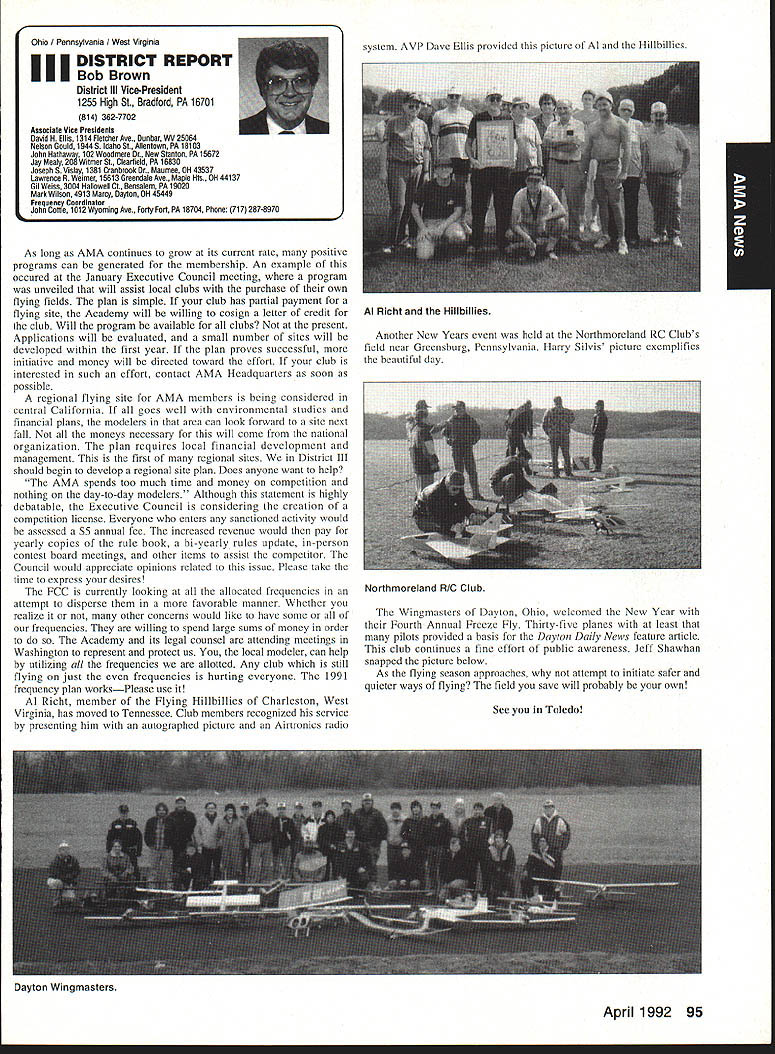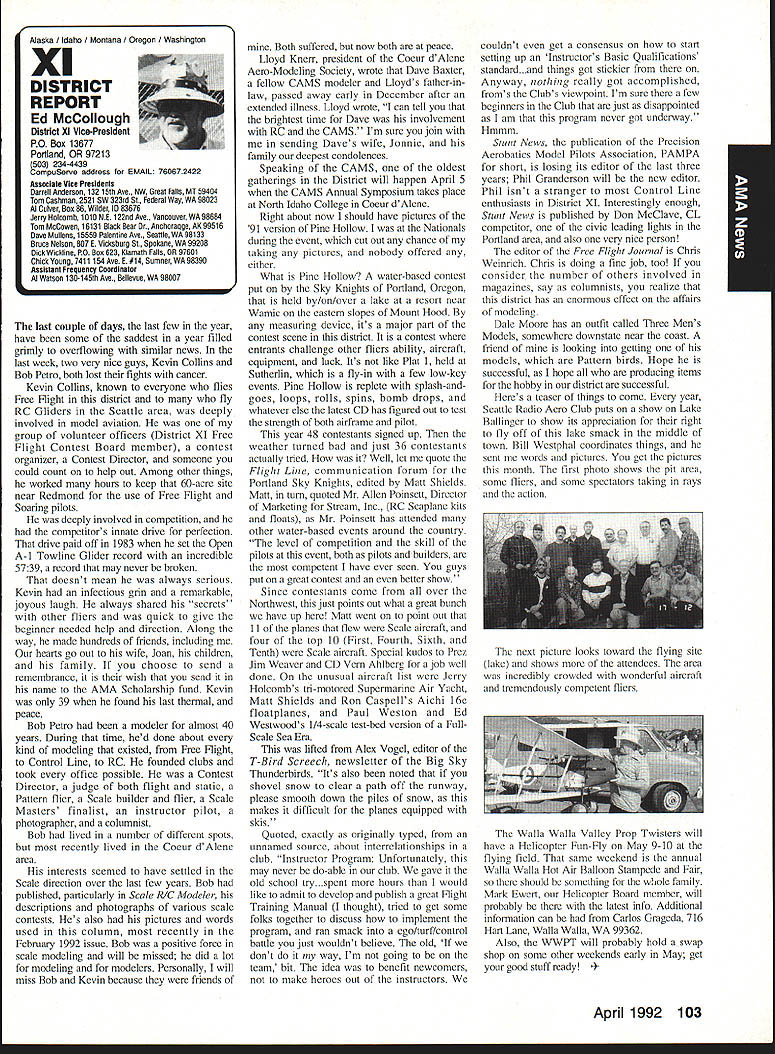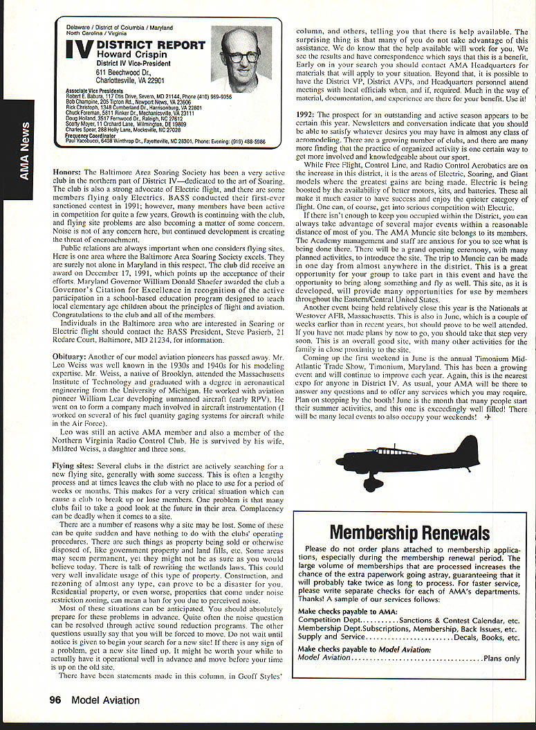 AA AMA HO Executive Director Including reports AMA resident Executive VP Vice Presidents AMA SINZE 1936 AL ACADEMY OF MODEL AERONAUTICS 1810 Samuel Morse Dr Reston VA 22090 INTERESTED IN JOINING AMA Worlds Largest Sp6rt Aviation Organization Over 165000 did 1990 ails may requesting FREE BROCHURE address above PR ROUNDUP Bill Baker Assistant Director Marketing Ah arrival spring weather begins warm grass turns green modelers flock flying field sharpen skills preparation up-coming fun flys rallies contests addition fun excitement enjoyed contestants events also provide excellent opportunity club gain publicity Publicity essential growth club sport Numerous important public relations goals can accomplished promoting events First publics awareness about sport organization increased recognition can very helpful speaking public officials private landowners about flying sites Second media coverage will help attract new members club An influx new people vital clubs survival Finally seeing hearing coverage event great morale booster members However process isnt simple organizing event waiting press arrive An article newspaper feature radio television result planning dedication hard work good idea form public relations committee handle coordination clubs publicity efforts committee should consist chairman member writing skills member photography skills should work clubs leadership target events newsworthy greater chance receiving coverage Such events could opening new flying site large regional contest demonstration held conjunction Veterans Day Armed Forces Day imaginative developing ways pitch event media Next committee should develop media mailing list contact names newspapers should include city editor sports editor aviation editor publication has television radio stations information should sent news director assignment editor important build relationships contacts will have sympathetic ear efforts public relations committee may want canvass club see members have friends neighbors work local newspaper radio television stations have begin building relationship press release announcing event should mailed contacts four six weeks prior event press release basic tool publicity campaign needs contain specific information about event What facts editor needs point essential provide contact name day evening phone number editor can always speak person information needed also important keep release brief no longer two pages Long drawn-out novels CONTINUED ON PAGE 90 ITwo Ists 1992 Nationals honor being first contestant register 1992 AMA Nationals goes Stewart Swanson Harrisburg Pennsylvania first workers volunteer help make happen Cliff Nancy Telford Bethesda Maryland 1992 Nationals dont begin until June 20 applications both contestants volunteer workers already pouring AMA Headquarters Nationals fly June 20-29 Dont wait get forms now relax concentrate practicing want become either contestant volunteer worker 1992 Nationals drop us line AMA Well send everything need get going Come meet best modelers America June Youll never know what great time Nationals until experience yourself ng Muncie national flying site near Muncie Indiana complete Final seeding grading will done spring AMA member may have unlimited use site until Grand Opening weekend June 1314 1992 June 15 member will able use site three times charge Upon completion three free uses will charge $5 per day $25 per calendar year site generally open AMA members except national international event scheduled During scheduled events will no open flying admission charges and/or restrictions will place cases entry site will restricted advance notice will appear AMA News section Please note site will reserved IMAA flyin June 20-21 will also reserved United States Outdoor Championships run NFFS September 2-7 Scale World Championships August 22-29 AMA HO SERVICES STAFF S Executive Director Vince Mankowski 0 Ofrector Operations Robert Vojalavek S Personnel Manager Diane Gallalee S Technical Director Bob Underwood troiler Lynne Collins 0 Competition Services Director Micheline Madison S Special Services Director Carl Maroney Membership Processing Supervisor Joyce Hager eting Director Geoff Styles 0 Systems Manager Reggie Watterson 0 Publications Director Ross B McMullen S Events Coordinator Chip Smith 0 Museum Curator Hurst Bowers 0 General Counsel Joseph Gelwicls Felix Gora RFK&D April 1992 89 AMAs Executive Council equivalent Board Directors basically composed President Executive Vice President 11 district Vice Presidents officers Executive Director provided space month AMA News publication What say space however matter personal viewpoint sole responsibility author views may may represent otticial position ot AMA Esecutive Council N just returned Council meeting held Pasadena California met conjunction IMS Trade Show could available discuss issues modelers District 10 Loren Nicholson Santa Ana sat meeting handed letter addressed several points concern following response Loren felt would general interest members Dear Loen appreciate thoughtful letter January 8 handed Council meeting Pasadena am very sorry didnt find time read until enroute home Maybe 37000-foot view will help perception respond am very happy Geoff Styles able helpful Miles Square issue fervent desire AMA can serve membership acquisition retention flying sites Geoff hired 1970s purpose Since time have continuing program flying site support Geoff allocated funds needs perform function Nothing basic modelers nice permanent flying site since disruptive influence aeromodeling loss good place fly concern identify need serve club way primary reason supporting national facility provide focus growth additional funds may provided acquisition flying sites trust successor will keep goal mind As know Council has approved proceeding plans develop District 10 flying site apparently will supported least 12 clubs area will used home field clubs will also available AMA members will eventually have facilities