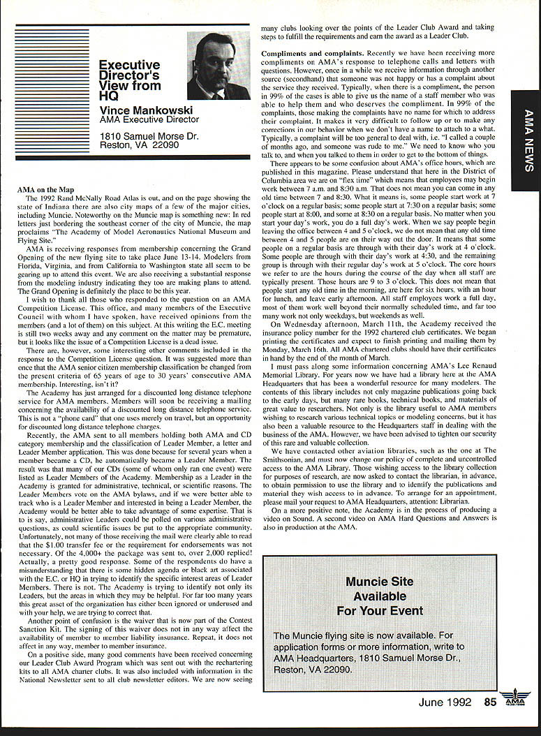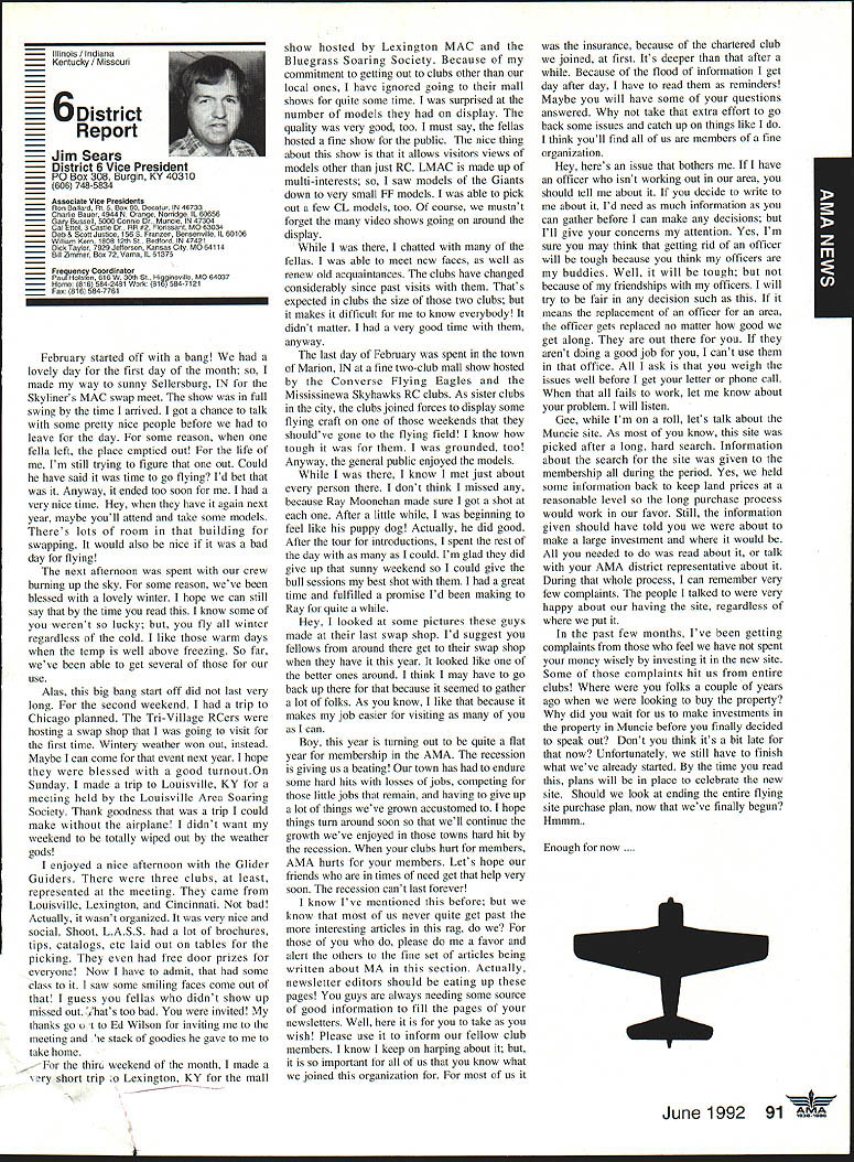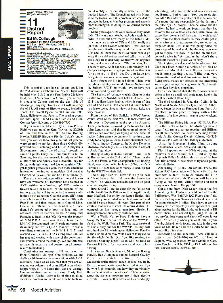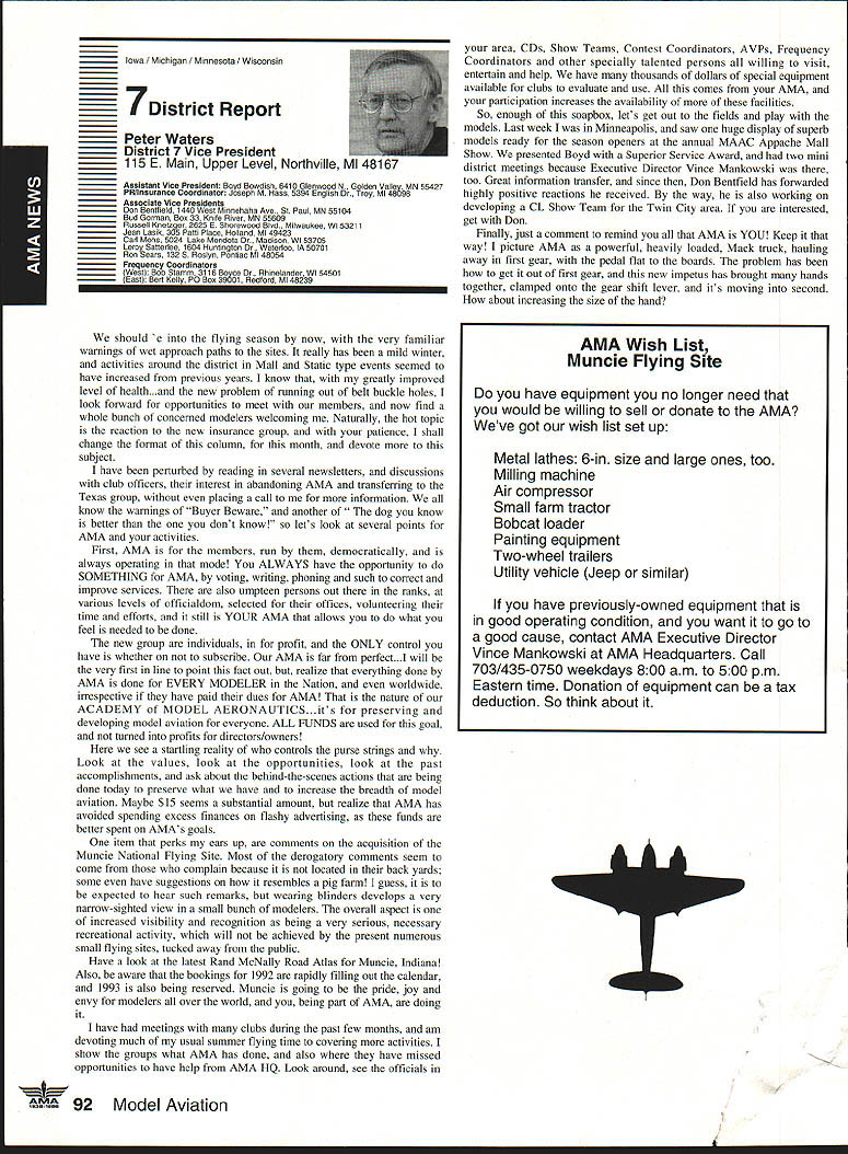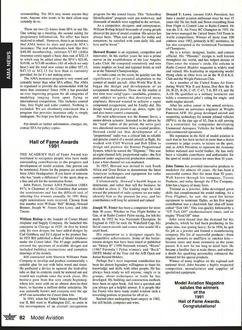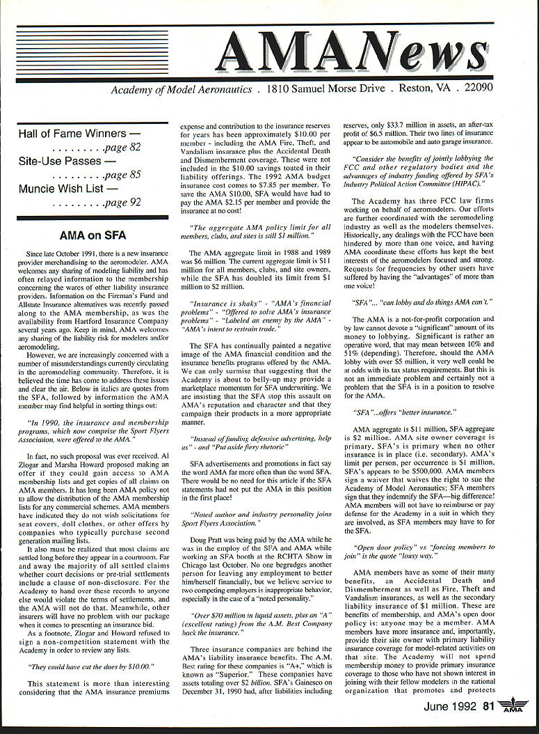 AMANeWS Academy Model Aeronautics Samuel Morse Drive on VA 0 Hall of Fame Winners page 82 Site-Use Passes page 85 Muncie Wish List page 92 AMA SFA Since late October 1991 new insurance provider merchandising aeromodeler AMA welcomes sharing modeling liability has often relayed information membership conceming wares other liability insurance providers Information Firemans Fund Allstate Insurance altematives recently passed along AMA membership availability Hartford Insurance Company several years ago Keep mind AMA welcomes sharing liability risk modelers and/or aeromodeling However increasingly concemed number misunderstandings currently circulating aeromodeling community Therefore believed time has come address issues clear air Below italics quotes SFA followed information AMA member may find helpful sorting things out 1990 insurance membership programs now comprise Sport Flyers Association offered AMA fact no such proposal ever received Al Zlogar Marsha Howard proposed making offer could gain access AMA membership lists get copies claims AMA members has long AMA policy allow distribution AMA membership lists commercial schemes AMA members have indicated wish solicitations seat covers doll clothes other offers companies typically purchase second generation mailing lists also must realized claims settled long before appear courtroom Far away majority settled claims whether court decisions pre-trial settlements include clause non-disclosure Academy hand over records anyone else would violate terms settlements AMA will Meanwhile other insurers will have no problem package comes presenting insurance bid As footnote Zlogar Howard refused sign non-competition statement Academy order review lists could have cut dues $1000 statement interesting considering AMA insurance premiums expense contribution insurance reserves years has approximately $1000 per member including AMA Fire Theft Vandalism insurance plus Accidental Death Dismemberment coverage included $1000 savings touted liability offerings 1992 AMA budget insurance cost comes $785 per member save AMA $1000 SFA would have pay AMA $215 per member provide insurance no cost aggregate AMA policy limit members clubs sites still $1 million AMA aggregate limit 1988 1989 $6 million current aggregate limit $11 million members clubs site owners SFA has doubled its limit $1 million $2 million Insurance shaky~ AMA s financial problems Offered solve AMAs insurance problems Labeled enemy AMA AMA s intent restrain trade SFA has continually painted negative image AMA financial condition insurance benefits programs offered AMA can surmise suggesting Academy about belly-up may provide marketplace momentum SEA underwriting insisting SEA stop assault AMAs reputation character campaign products appropriate manner Instead offlmnding defensive advertising help us Put aside fiery rhetoric SFA advertisements promotions fact say word AMA far often word SFA would no need article SFA statements put AMA position first place Noted author industry personality joins Sport Flyers Association Doug Pratt being paid AMA employ SFA AMA working SEA booth RCHTA Show Chicago last October No begrudges another person leaving employment better him/herself financially believe service two competing employers inappropriate behavior especially case noted personality Over $70 million liquid assets plus excellent rating AM Best company back insurance Three insurance companies behind AMAs liability insurance benefits AM Best rating companies known Superior companies have assets totaling over $2 billion SEAs Gainesco December 31 1990 after liabilities including reserves $337 million assets after-tax profit $65 million two lines insurance appear automobile auto garage insurance consider benefits jointly lobbying FC other regulatory bodies advantages industry funding offered SFA s Industry Political Action committee HIPAc Academy has three FCC law firms working behalf aeromodelers efforts further coordinated aeromodeling industry well modelers themselves Historically dealings FCC have hindered voice having AMA coordinate efforts has kept best interests aeromodelers focused strong Requests frequencies other users have suffered having advantages voice SEA . can lobby things AMA cant AMA not-for-profit corporation law cannot devote significant amount its money lobbying Significant rather operative word may mean between 10% 51% depending Therefore should AMA lobby over $5 million very well could odds its tax stains requirements immediate problem certainly problem SEA position resolve AMA SEA rs better insurance AMA aggregate $11 million SFA aggregate $2 million AMA site owner coverage primary SFAs primary no other insurance place ie secondary AMAs limit per person per occurrence $1 million SEA s appears $500000 AMA members sign waiver waives right sue Academy Model Aeronautics SFA members sign indemnify SEAbig difference AMA members will have reimburse pay defense Academy suit involved SEA members may have SEA Open door policy vs forcing members join quote lousy way AMA members have some benefits Accidental Death Dismemberment well Fire Theft Vandalism insurances well secondary liability insurance $1 million benefits membership AMAs open door policy anyone may member AMA members have insurance importantly provide site owner primary liability insurance coverage model-related activities site Academy will spend membership money provide primary insurance coverage have shown interest joining fellow modelers national organization promotes protects June1992 aeromodeling SFA may insure anyone want Anyone wants client may certainly two 2 letters SFA file setting up meeting second asking proprietary information No offer has received rebuff However insistence AMA lower its dues provide SFAs insurance real mathematics look like $4000 membership subtract $785 AMA insurance costs equals basic dues rate $3215 may added either SFAs $2500 $1000 $1500 numbers hear total now comes either $5715 $4715 $4215 less curr