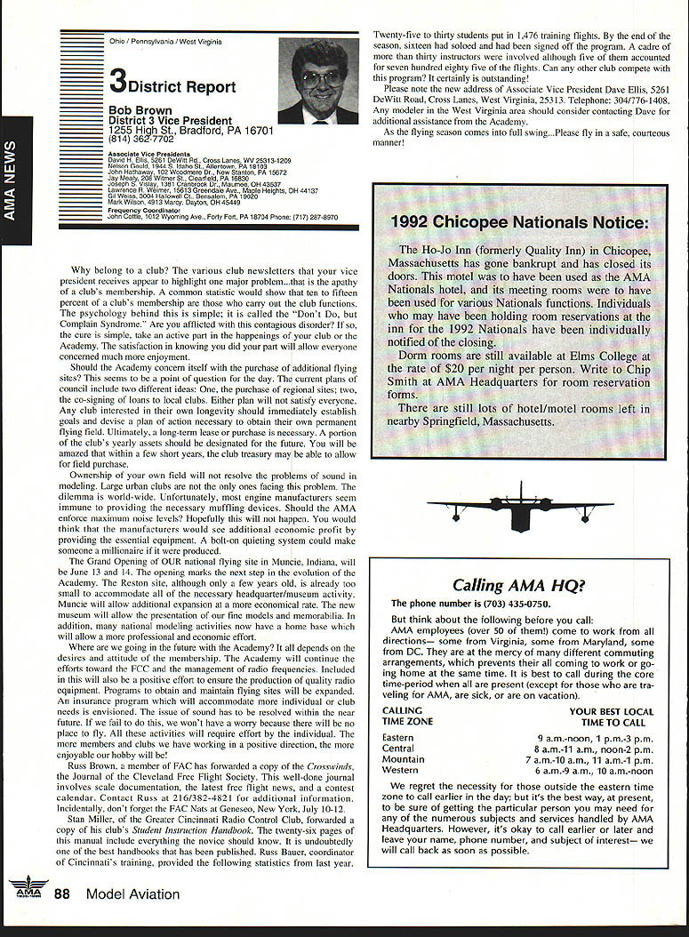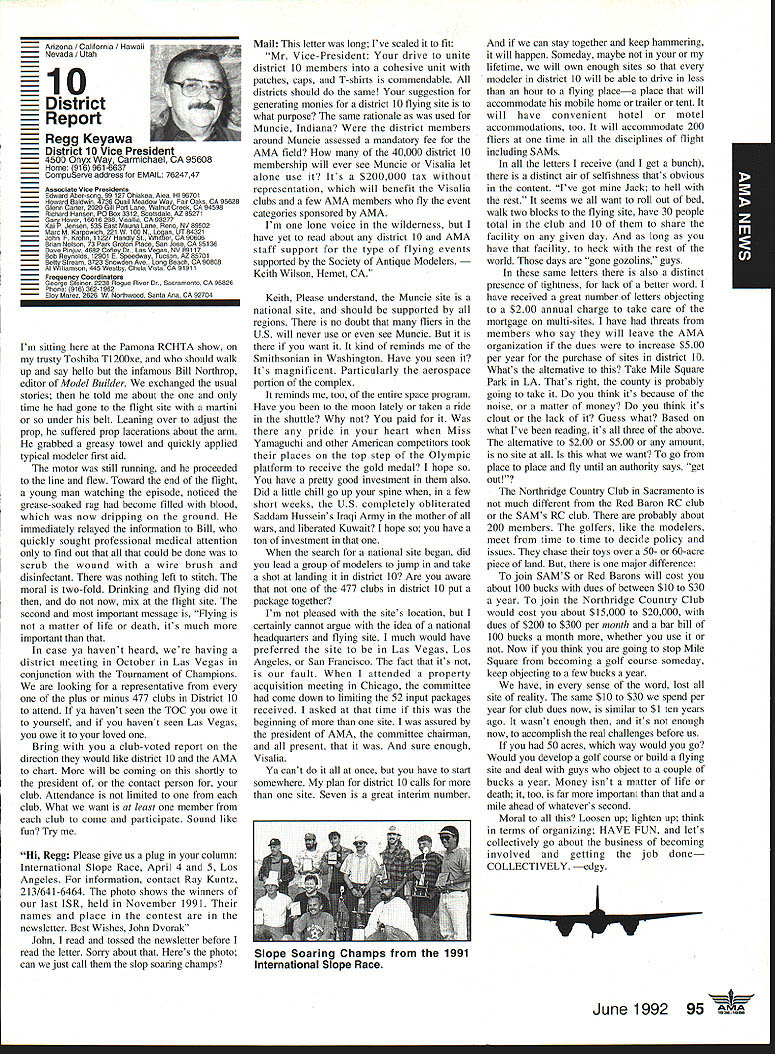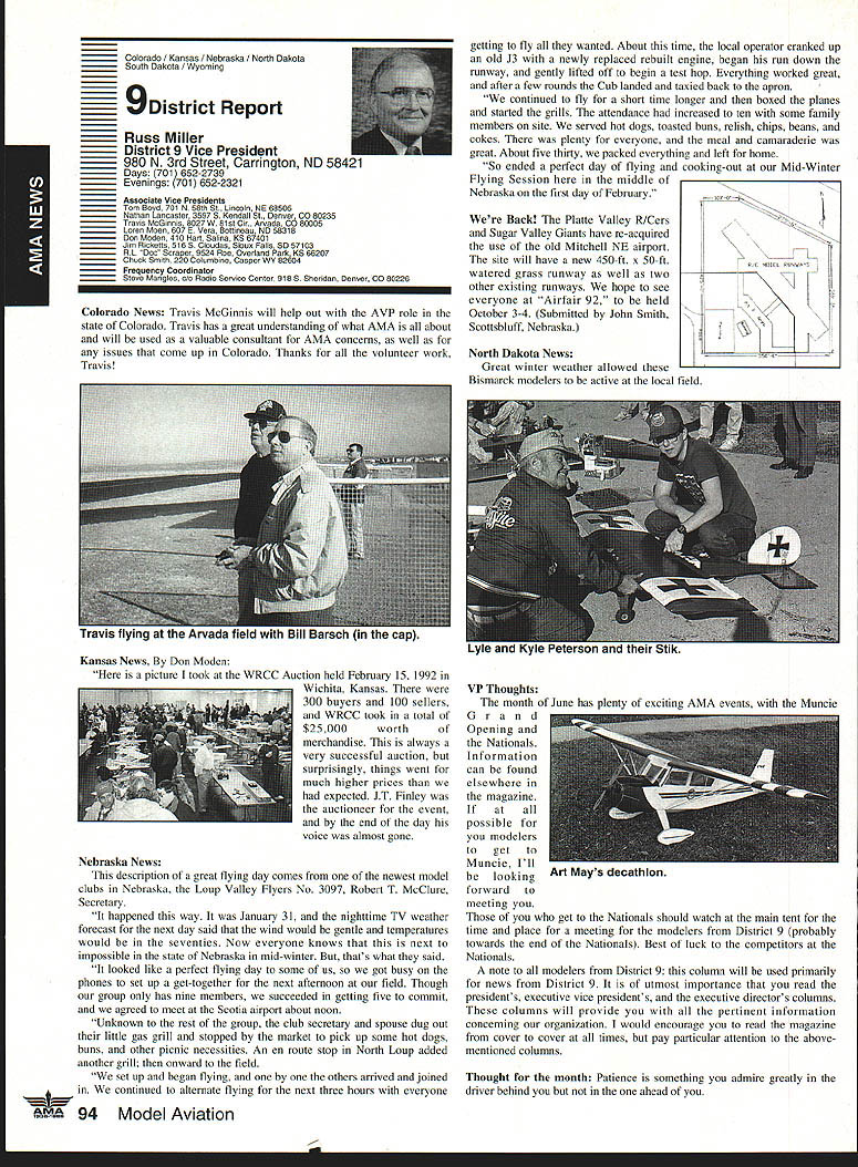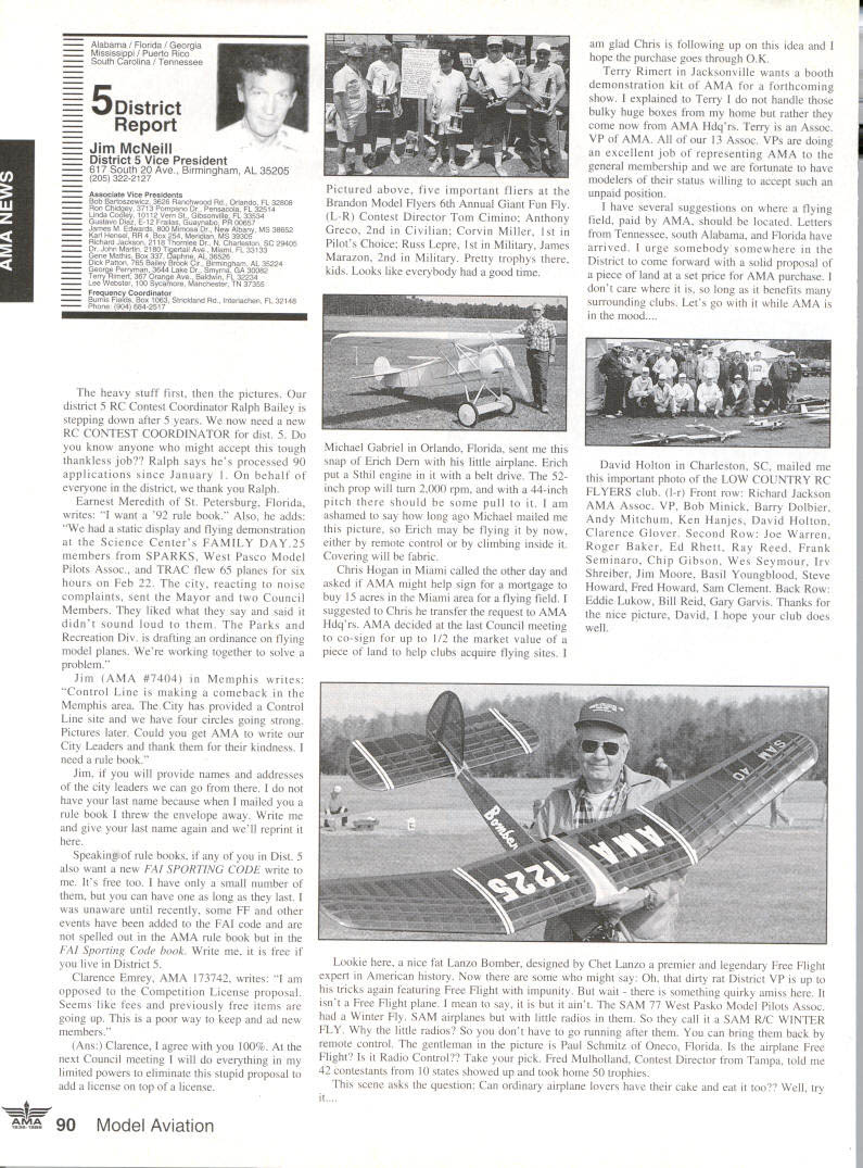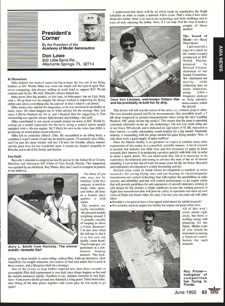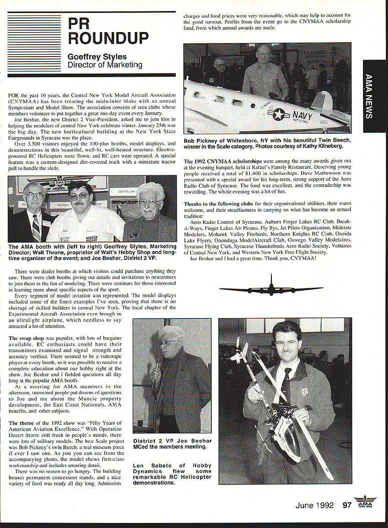 AMANeWS Academy Model Aeronautics Samuel Morse Drive on VA 0 Hall of Fame Winners page 82 Site-Use Passes page 85 Muncie Wish List page 92 AMA SFA Since late October 1991 new insurance provider merchandising aeromodeler AMA welcomes sharing modeling liability has often relayed information membership conceming wares other liability insurance providers Information Firemans Fund Allstate Insurance altematives recently passed along AMA membership availability Hartford Insurance Company several years ago Keep mind AMA welcomes sharing liability risk modelers and/or aeromodeling However increasingly concemed number misunderstandings currently circulating aeromodeling community Therefore believed time has come address issues clear air Below italics quotes SFA followed information AMA member may find helpful sorting things out 1990 insurance membership programs now comprise Sport Flyers Association offered AMA fact no such proposal ever received Al Zlogar Marsha Howard proposed making offer could gain access AMA membership lists get copies claims AMA members has long AMA policy allow distribution AMA membership lists commercial schemes AMA members have indicated wish solicitations seat covers doll clothes other offers companies typically purchase second generation mailing lists also must realized claims settled long before appear courtroom Far away majority settled claims whether court decisions pre-trial settlements include clause non-disclosure Academy hand over records anyone else would violate terms settlements AMA will Meanwhile other insurers will have no problem package comes presenting insurance bid As footnote Zlogar Howard refused sign non-competition statement Academy order review lists could have cut dues $1000 statement interesting considering AMA insurance premiums expense contribution insurance reserves years has approximately $1000 per member including AMA Fire Theft Vandalism insurance plus Accidental Death Dismemberment coverage included $1000 savings touted liability offerings 1992 AMA budget insurance cost comes $785 per member save AMA $1000 SFA would have pay AMA $215 per member provide insurance no cost aggregate AMA policy limit members clubs sites still $1 million AMA aggregate limit 1988 1989 $6 million current aggregate limit $11 million members clubs site owners SFA has doubled its limit $1 million $2 million Insurance shaky~ AMA s financial problems Offered solve AMAs insurance problems Labeled enemy AMA AMA s intent restrain trade SFA has continually painted negative image AMA financial condition insurance benefits programs offered AMA can surmise suggesting Academy about belly-up may provide marketplace momentum SEA underwriting insisting SEA stop assault AMAs reputation character campaign products appropriate manner Instead offlmnding defensive advertising help us Put aside fiery rhetoric SFA advertisements promotions fact say word AMA far often word SFA would no need article SFA statements put AMA position first place Noted author industry personality joins Sport Flyers Association Doug Pratt being paid AMA employ SFA AMA working SEA booth RCHTA Show Chicago last October No begrudges another person leaving employment better him/herself financially believe service two competing employers inappropriate behavior especially case noted personality Over $70 million liquid assets plus excellent rating AM Best company back insurance Three insurance companies behind AMAs liability insurance benefits AM Best rating companies known Superior companies have assets totaling over $2 billion SEAs Gainesco December 31 1990 after liabilities including reserves $337 million assets after-tax profit $65 million two lines insurance appear automobile auto garage insurance consider benefits jointly lobbying FC other regulatory bodies advantages industry funding offered SFA s Industry Political Action committee HIPAc Academy has three FCC law firms working behalf aeromodelers efforts further coordinated aeromodeling industry well modelers themselves Historically dealings FCC have hindered voice having AMA coordinate efforts has kept best interests aeromodelers focused strong Requests frequencies other users have suffered having advantages voice SEA . can lobby things AMA cant AMA not-for-profit corporation law cannot devote significant amount its money lobbying Significant rather operative word may mean between 10% 51% depending Therefore should AMA lobby over $5 million very well could odds its tax stains requirements immediate problem certainly problem SEA position resolve AMA SEA rs better insurance AMA aggregate $11 million SFA aggregate $2 million AMA site owner coverage primary SFAs primary no other insurance place ie secondary AMAs limit per person per occurrence $1 million SEA s appears $500000 AMA members sign waiver waives right sue Academy Model Aeronautics SFA members sign indemnify SEAbig difference AMA members will have reimburse pay defense Academy suit involved SEA members may have SEA Open door policy vs forcing members join quote lousy way AMA members have some benefits Accidental Death Dismemberment well Fire Theft Vandalism insurances well secondary liability insurance $1 million benefits membership AMAs open door policy anyone may member AMA members have insurance importantly provide site owner primary liability insurance coverage model-related activities site Academy will spend membership money provide primary insurance coverage have shown interest joining fellow modelers national organization promotes protects June1992 aeromodeling SFA may insure anyone want Anyone wants client may certainly two 2 letters SFA file setting up meeting second asking proprietary information No offer has received rebuff However insistence AMA lower its dues provide SFAs insurance real mathematics look like $4000 membership subtract $785 AMA insurance costs equals basic dues rate $3215 may added either SFAs $2500 $1000 $1500 numbers hear total now comes either $5715 $4715 $4215 less curr