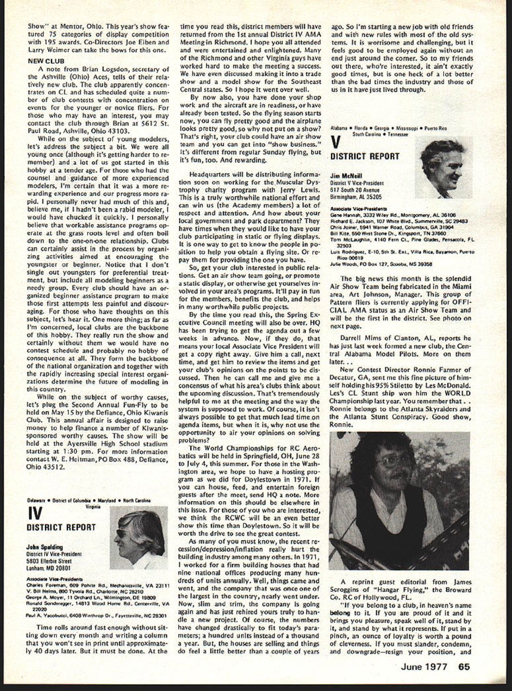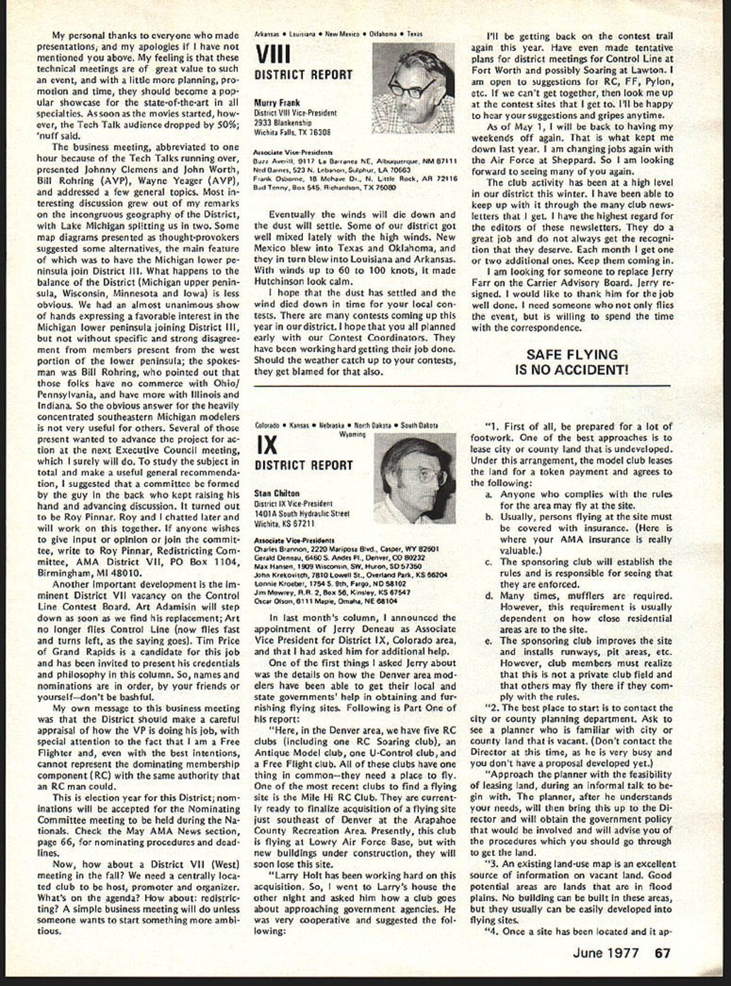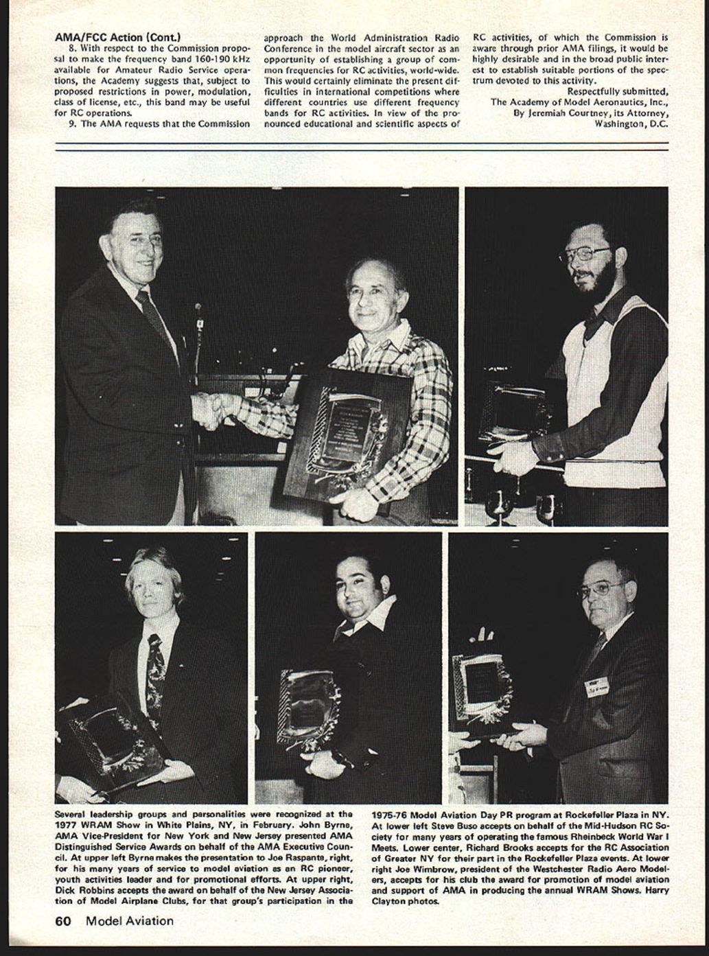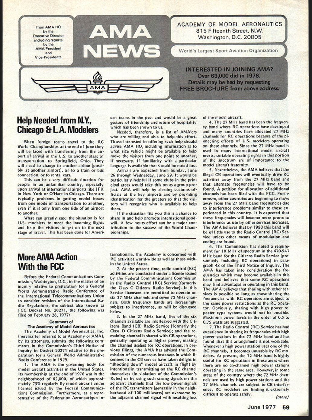 Help Needed fmm NY Chicago & LA Modelers foreign teams travel RC World Championships end June will faced transferring air port arrival US another stage transportation Springfield Ohio will need change another airline possi bly another airport train bus connection rental cars can very difficult situation people unfamiliar country especially upon arrival international airports like JFK New York OHare Chicago typically problems getting model boxes mode transportation another side airport another What can greatly ease situation US modelers meet incoming flights help visitors get next stage travel has done Amen AMA Action FCC Before Federal Communications Com mission Washington DC matter inquiry relative preparation General World Administrative Radio Conference International Telecommunications Union consider revision International Ra dio Regulations subject also known FCC Docket No 20271 following filed February 28 1977 Comment Academy Model Aeronautics Academy Model Aeronautics Inc hereinafter referred Academy AMA its attorneys submits following com ments Commissions Third Notice Inquiry Docket 20271 relative pre paration General World Administrative Radio Conference 1979 1 AMA governing body model aircraft activities United States Its membership end 1976 neighborhood 62000 approxi mately 75% regularly fly model aircraft under licenses issued Federal Communica tions Commission Furthermore repre sentative Federation Aeronautique Incan teams past would great gesture friendship return hospitality has shown us Needed therefore list AMAers willing able help effort interested offering such help should advise AMA HQ including information what size vehicle might available help move visitors point another necessary familiarity particular language available should noted too Arrivals expected Sunday June 26 through Wednesday June 29 would particularly helpful some clubs prin cipal areas would take group pro ject AMA will help alerting customs ficials key airports providing identification greeters visi tors will recognize available help situation fits chance share help promote international good will few hours effort can major con tribution success World Cham pionships ternationale Academy concerned RC activities world-wide well United States 2 present time radio control RC activities conducted under license issued Federal Communications Commission Radio Control RC Service formerly Class C Citizens Radio Service Service licensees permitted operate six 27 MHz channels seven 72 MHz chan nels Both frequency bands increasingly subject interference will discussed below 3 27 MHz band five six channels available interleaved Cit izens Band CB Radio Service formerly Class D Citizens Radio Service re maining channel shared CB operations generally operating higher power making channel useless RC operations pre vious filings AMA has advised Com mission numerous instances li censees CB service have taken delight shooting down model aircraft flight intentionally transmitting RC channel themselves violation Commission s Rules using such strong signals adjacent channels low power signals RC transmitters generally neigh borhood 100 milliwatts overcome adjacent channel signal resulting loss model aircraft 4 27 MHz band has frequen cy band RC operations have developed countries have allocated 27 MHz channels RC operations because pi oneering efforts US modelers operating channels Since 27 MI-lz band used international model aircraft meets suitable operating rights portion spectrum importance model aircraft fraternity 5 Nevertheless AMA believes illegal CB operations will eventually drive RC activities away 27 MHz band alternate frequencies will have found petition allocation additional channels has filed FCC Furth ermore other countries beginning move away 27 MHz band frequencies due interference problems similar ex perienced country expected frequencies will become prone interference use other services increases AMA believes 1980 band will little use Radio Control RC Ser vice unless other means modulation coding found 6 Commission has noted require ment 10 MHz spectrum 470-947 MHz band Citizens Radio Service pre sumably including RC operations para graph 48 Third Notice Inquiry AMA has taken consideration fre quencies may become available band believes some RC operations may find advantages operating band AMA believes sharing other ser vices possible long sharing frequencies RC operators subject same power restrictions RC opera tor Obviously sharing high power re peater type systems would possible Maximum power levels order 05 075 watts suggested 7 Radio Control RC Service has experience sharing its frequencies high power stations 72 MHz band has found arrangement workable Whenever high power station uses RC channels becomes unusable RC mo delers present 72 MHz band highly useful RC operations areas no co-channel high power stations operating same area However some areas country 72 MHz chan nels used high power stations 27 MHz channels subject CB interfer ence RC modelers finding extremely difficult operate safely June 1977 59 AMA HO Executive Director including reports AMA President Vice-Presidents L ACADEMY OF MODEL AERONAUTICS 81 5 Fifteenth Street NW Washington DC 20005 AMA/FCC Action Cont 8 With respect Commission propo sal make frequency band 160-190 kHz available Amateur Radio Service opera tions Academy suggests subject proposed restrictions power modulation class license etc band may useful RC operations 9 The AMA requests Commission approach World Administration Radio Conference model aircraft sector opportunity establishing group com mon frequencies RC activities world-wide would certainly eliminate present dif ficulties international competitions different countries use different frequency bands RC activities view pro nounced educational scientific aspects RC activities Commission aware through prior AMA filings would highly desirable broad public inter est establish suitable portions spec trum devoted activi