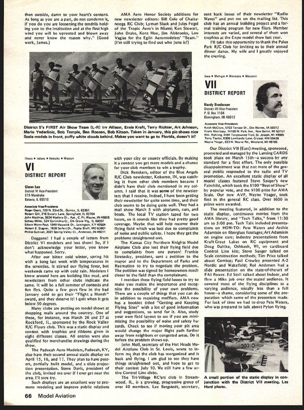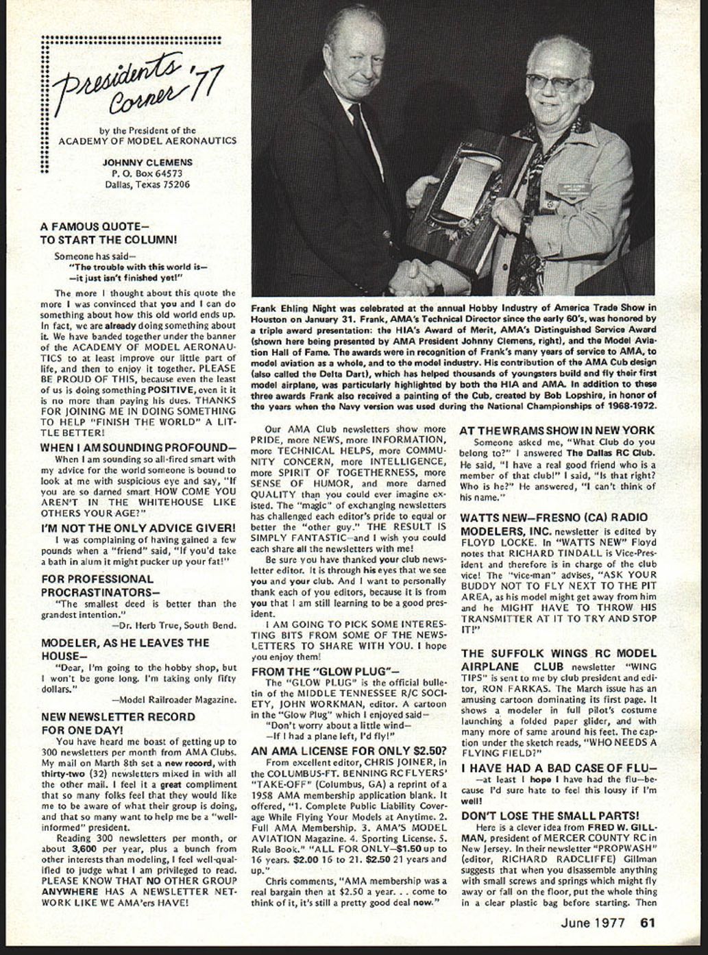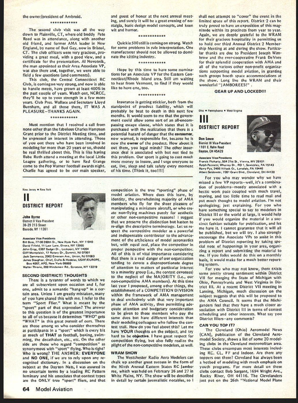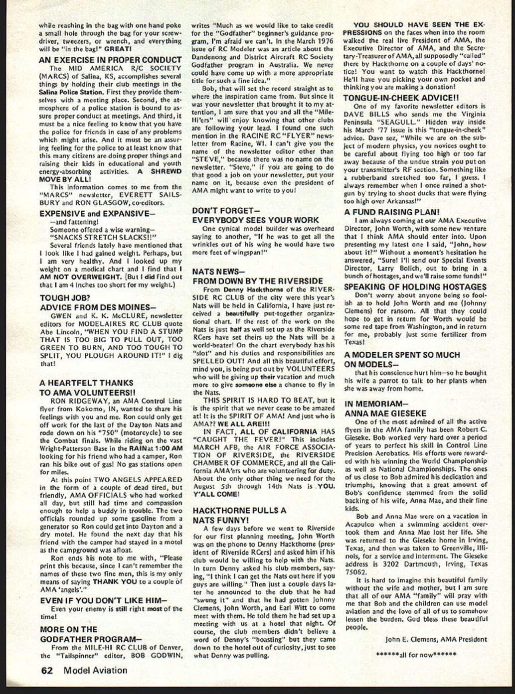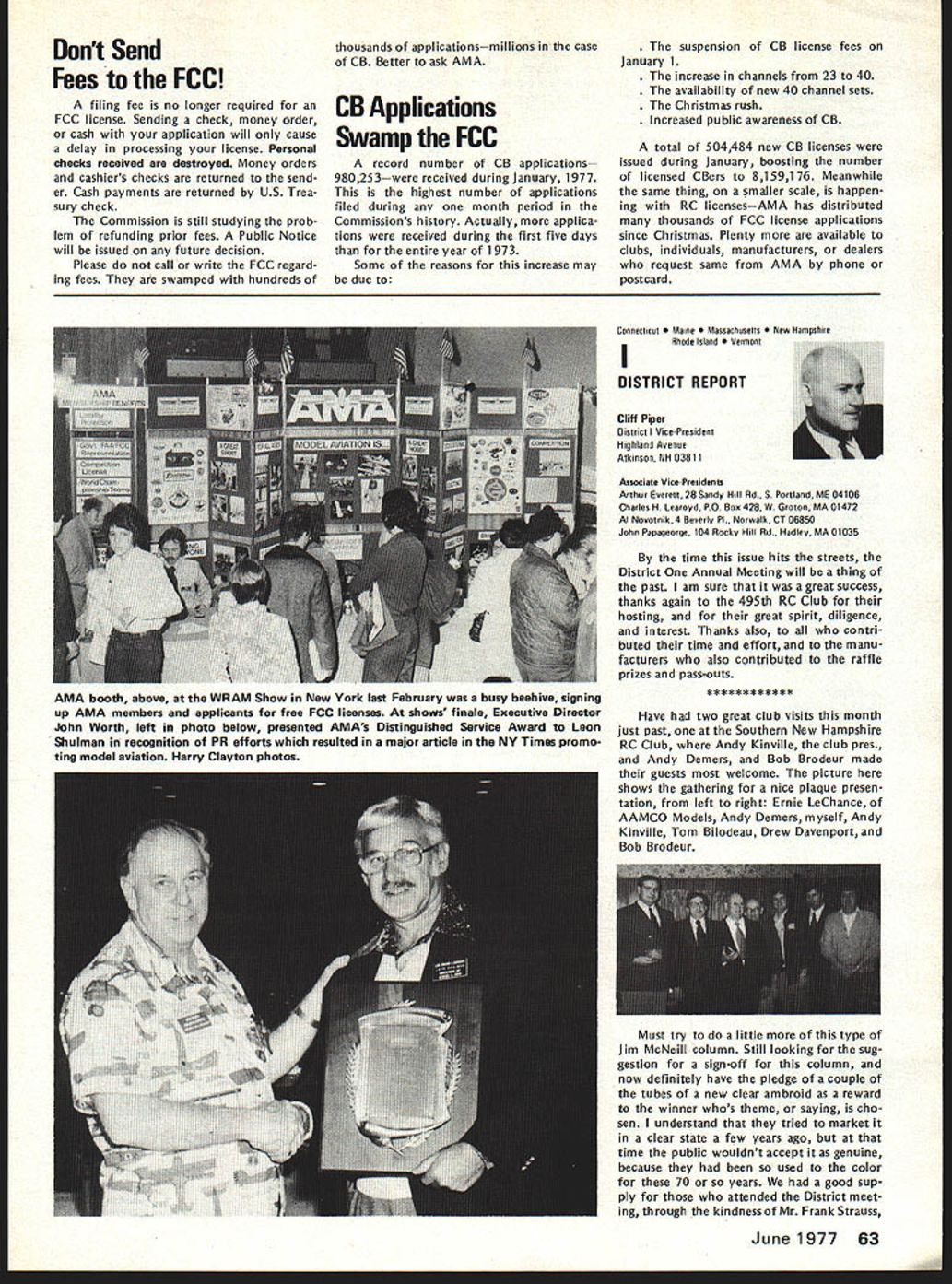 Help Needed fmm NY Chicago & LA Modelers foreign teams travel RC World Championships end June will faced transferring air port arrival US another stage transportation Springfield Ohio will need change another airline possi bly another airport train bus connection rental cars can very difficult situation people unfamiliar country especially upon arrival international airports like JFK New York OHare Chicago typically problems getting model boxes mode transportation another side airport another What can greatly ease situation US modelers meet incoming flights help visitors get next stage travel has done Amen AMA Action FCC Before Federal Communications Com mission Washington DC matter inquiry relative preparation General World Administrative Radio Conference International Telecommunications Union consider revision International Ra dio Regulations subject also known FCC Docket No 20271 following filed February 28 1977 Comment Academy Model Aeronautics Academy Model Aeronautics Inc hereinafter referred Academy AMA its attorneys submits following com ments Commissions Third Notice Inquiry Docket 20271 relative pre paration General World Administrative Radio Conference 1979 1 AMA governing body model aircraft activities United States Its membership end 1976 neighborhood 62000 approxi mately 75% regularly fly model aircraft under licenses issued Federal Communica tions Commission Furthermore repre sentative Federation Aeronautique Incan teams past would great gesture friendship return hospitality has shown us Needed therefore list AMAers willing able help effort interested offering such help should advise AMA HQ including information what size vehicle might available help move visitors point another necessary familiarity particular language available should noted too Arrivals expected Sunday June 26 through Wednesday June 29 would particularly helpful some clubs prin cipal areas would take group pro ject AMA will help alerting customs ficials key airports providing identification greeters visi tors will recognize available help situation fits chance share help promote international good will few hours effort can major con tribution success World Cham pionships ternationale Academy concerned RC activities world-wide well United States 2 present time radio control RC activities conducted under license issued Federal Communications Commission Radio Control RC Service formerly Class C Citizens Radio Service Service licensees permitted operate six 27 MHz channels seven 72 MHz chan nels Both frequency bands increasingly subject interference will discussed below 3 27 MHz band five six channels available interleaved Cit izens Band CB Radio Service formerly Class D Citizens Radio Service re maining channel shared CB operations generally operating higher power making channel useless RC operations pre vious filings AMA has advised Com mission numerous instances li censees CB service have taken delight shooting down model aircraft flight intentionally transmitting RC channel themselves violation Commission s Rules using such strong signals adjacent channels low power signals RC transmitters generally neigh borhood 100 milliwatts overcome adjacent channel signal resulting loss model aircraft 4 27 MHz band has frequen cy band RC operations have developed countries have allocated 27 MHz channels RC operations because pi oneering efforts US modelers operating channels Since 27 MI-lz band used international model aircraft meets suitable operating rights portion spectrum importance model aircraft fraternity 5 Nevertheless AMA believes illegal CB operations will eventually drive RC activities away 27 MHz band alternate frequencies will have found petition allocation additional channels has filed FCC Furth ermore other countries beginning move away 27 MHz band frequencies due interference problems similar ex perienced country expected frequencies will become prone interference use other services increases AMA believes 1980 band will little use Radio Control RC Ser vice unless other means modulation coding found 6 Commission has noted require ment 10 MHz spectrum 470-947 MHz band Citizens Radio Service pre sumably including RC operations para graph 48 Third Notice Inquiry AMA has taken consideration fre quencies may become available band believes some RC operations may find advantages operating band AMA believes sharing other ser vices possible long sharing frequencies RC operators subject same power restrictions RC opera tor Obviously sharing high power re peater type systems would possible Maximum power levels order 05 075 watts suggested 7 Radio Control RC Service has experience sharing its frequencies high power stations 72 MHz band has found arrangement workable Whenever high power station uses RC channels becomes unusable RC mo delers present 72 MHz band highly useful RC operations areas no co-channel high power stations operating same area However some areas country 72 MHz chan nels used high power stations 27 MHz channels subject CB interfer ence RC modelers finding extremely difficult operate safely June 1977 59 AMA HO Executive Director including reports AMA President Vice-Presidents L ACADEMY OF MODEL AERONAUTICS 81 5 Fifteenth Street NW Washington DC 20005 AMA/FCC Action Cont 8 With respect Commission propo sal make frequency band 160-190 kHz available Amateur Radio Service opera tions Academy suggests subject proposed restrictions power modulation class license etc band may useful RC operations 9 The AMA requests Commission approach World Administration Radio Conference model aircraft sector opportunity establishing group com mon frequencies RC activities world-wide would certainly eliminate present dif ficulties international competitions different countries use different frequency bands RC activities view pro nounced educational scientific aspects RC activities Commission aware through prior AMA filings would highly desirable broad public inter est establish suitable portions spec trum devoted activi