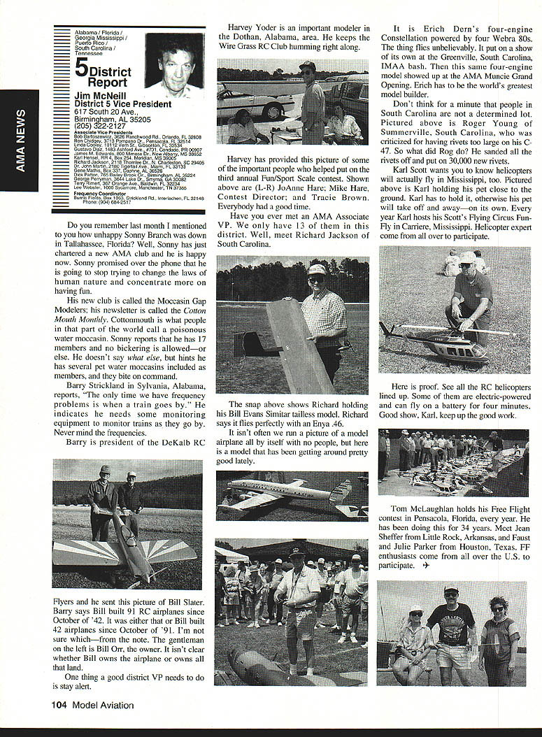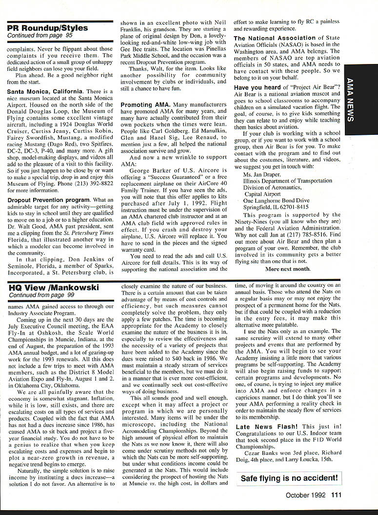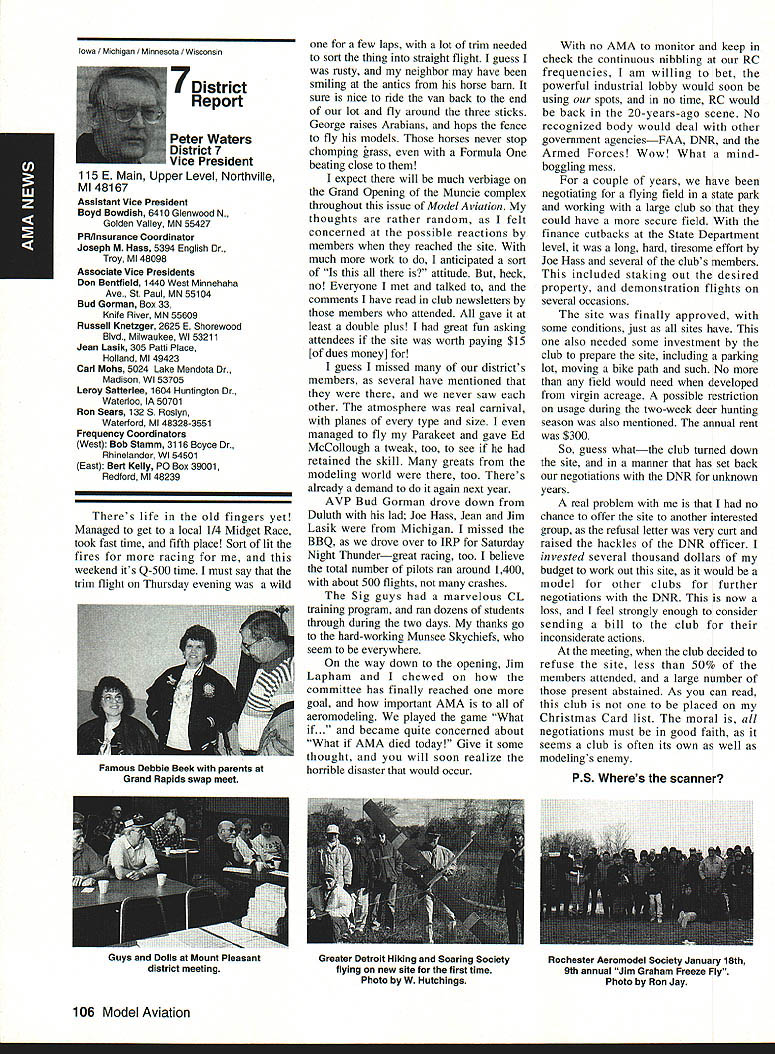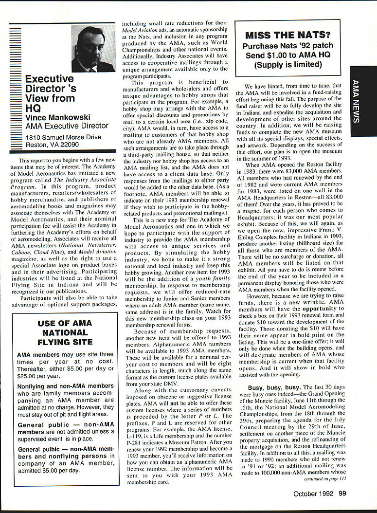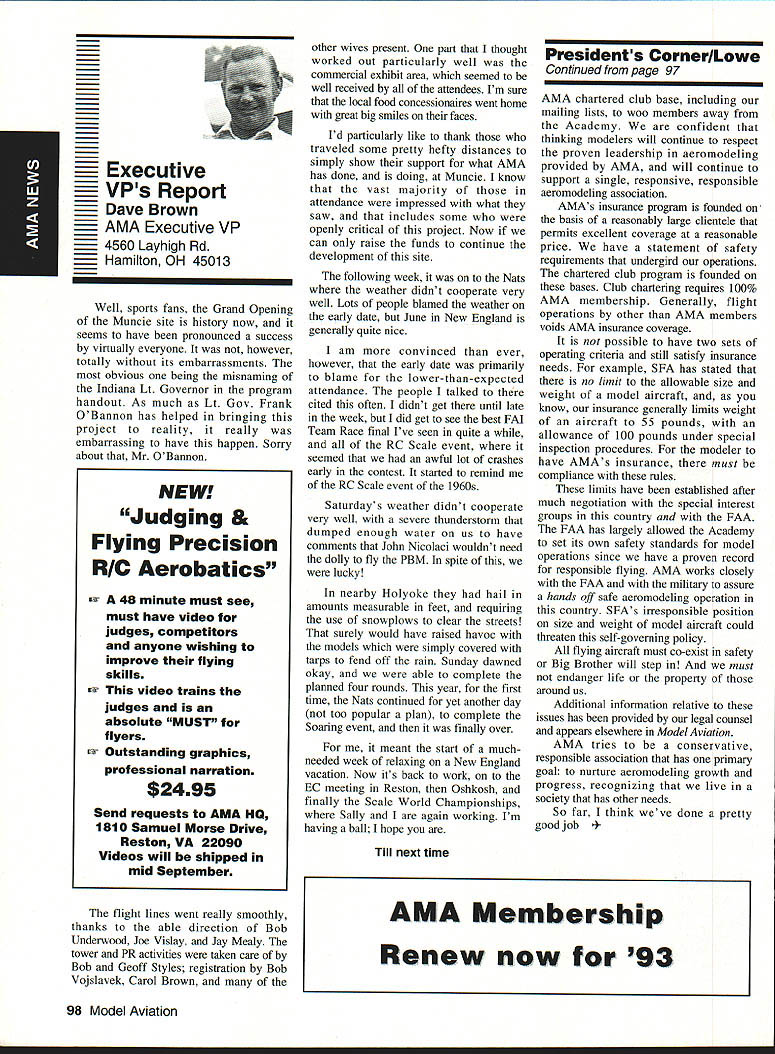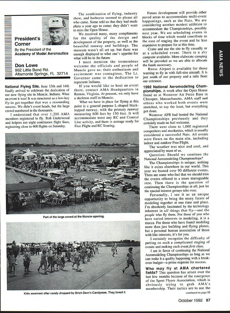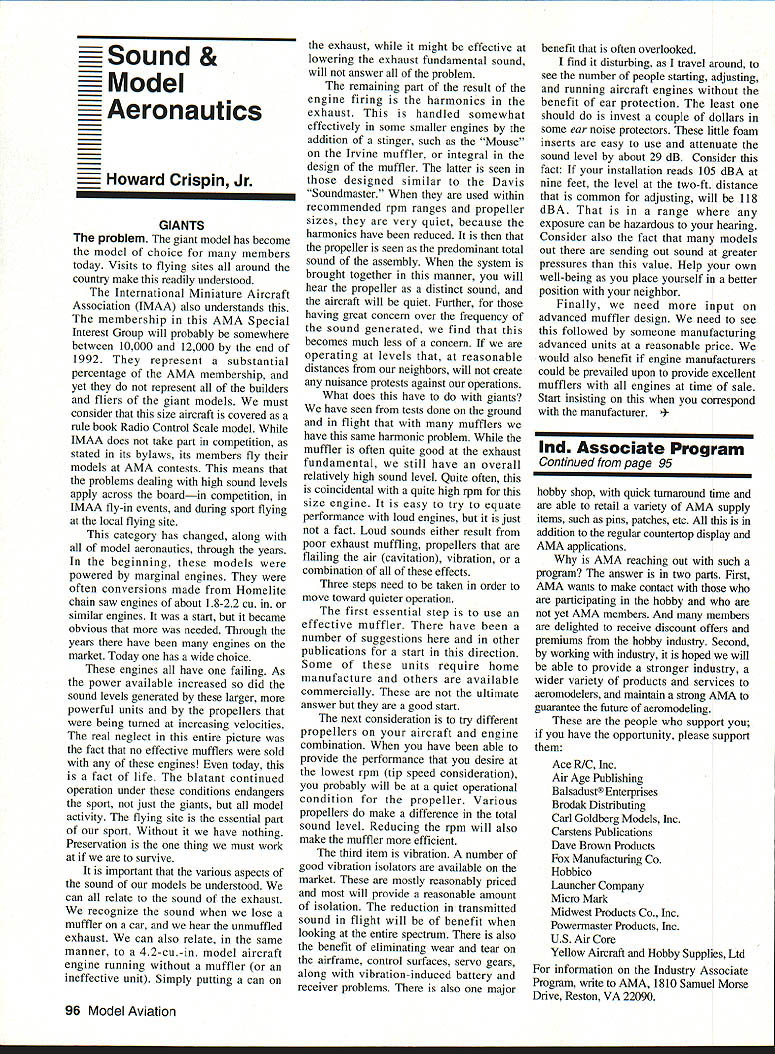AMANews SUNSET AEROMODELERS Saint Cloud Facilitythats name lovely site shown photo Jim Squires good enough have aerial shot made sent print Prior becoming RC site landfill SASC has plans turn picture-perfect place Jim stated letter support backing 1810 Samuel Morse Drive Reston VA 22090 AMA national organization dedicated aeromodeling instrumental bolstering its case local government So think insurance item needed enjoy model aviation would like suggest think deeply AMA offers much just protection against injury financial loss EAA Calendars 1993 have received advance copy EAAs new calendar being much person promote products after have fair everyone must tell impressed quality photos airplane buff arent nice item workshop office Information can obtained Sharon Ramey Associates PO Box 2045 Petoskey MI 49770 early offer includes free videotape called Fascination Flight 30 minutes action aspects flying Think about Sounds like good deal Chesapeake Bay RC CIubThis club found necessary print full-page letter its newsletter about activity could threaten its field Apparently some members have careless flight patterns making new set field rules mandatory Neighbors complained Department Natural Resources clubs landlord Rather risk loss because complacency club executive immediately enacted new regulations pit area being relocated Tighter restrictions being placed flight patterns New signs installed obeyed notice emphasizes new rules enforcedseriously users field being asked sign pledge signifies understand will adhere new field rules Does sound like familiar situation Sitting desk often hear irresponsible inconsiderate flying behavior has resulted neighborhood continued page 111 Academy Model Aeronautics has launched new program product manufacturers retailers/wholesalers hobby merchandise publishers aeromodeling books magazines $250 annual fee will entitle industry businesses Model Aviation magazine subscription newsletters AMANational Newsletter Cabane Cloud Nine addition involved Industry Associate Program will have right use special Associate logo product boxes advertising Participants program will listed National Flying Site pages Model Aviation National Newsletter Further half-page ad participating companies will placed National Newsletter annually Participants program will able take advantage optional support package includes slight reduction rates Model Aviation ads sponsorship annual National Aeromodeling Championships inclusion program book produced AMA such World Championships other national events Industry Associates will also have access cooperative mailings through unique arrangement made available program participants facilitate cooperative mailings third-party mailing house will used safeguard industry customer lists AMA membership list mailings will checked against Direct Marketing Association mail preference list Conditions mailing program assure companys mailing list remains its own private property program will prove attractive retail segment aeromodeling marketplace Hobby shops participate Industry Associate Program will also able take advantage cooperative mailing programs local hobby shops exchange would between customer data base AIVIA membership within certain zip code area Hobby shops also able take advantage fax membership applications renewals local continued page 96 October 1992 95 Academy Model Aeronautics Sunset Aeromodelers Saint Cloud I-acuity __ PR Roundup Geoffrey Styles ctor Marketing Key Dates August 21 29 Scale World Championships Muncie Indiana September Membership Renewal.1993 Renewal Membership Notices Mail September 4 7 NFFS AAAA Free Flight Contest Muncie Indiana September 5-91992 22nd US Free Flight Championships Lost Hills California October 8 11 Free Flight Finals Lost Hills California October 29 November 1 RCHTA Radio Control Hobby Trade Association Show Chicago Illinois November 15 Deadline Officer Election Ballot Return Sound & Model Aeronautics Howard Crispin Jr GIANTS problem giant model has become model choice members today Visits flying sites around country make readily understood International Miniature Aircraft Association IMAA also understands membership AMA Special Interest Group will probably somewhere between 10000 12000 end 1992 represent substantial percentage AMA membership yet represent builders fliers giant models must consider size aircraft covered rule book Radio Control Scale model IMAA does take part competition stated its bylaws its members fly models AMA contests means problems dealing high sound levels apply across boardin competition IMAA fly-in events during sport flying local flying site category has changed along model aeronautics through years beginning models powered marginal engines often conversions made Homelite chain saw engines about 18-22 cu similar engines start became obvious needed Through years have engines market Today has wide choice engines have failing As power available increased did sound levels generated larger powerful units propellers being turned increasing velocities real neglect entire picture fact no effective mufflers sold engines today fact life blatant continued operation under conditions endangers sport just giants model activity flying site essential part sport Without have nothing Preservation thing must work survive important various aspects sound models understood can relate sound exhaust recognize sound lose muffler car hear unmuffled exhaust can also relate same manner 42-cu-in model aircraft engine running muffler ineffective unit Simply putting can exhaust might effective lowering exhaust fundamental sound will answer problem remaining part result engine firing harmonics exhaust handled somewhat effectively some smaller engines addition stinger such Mouse Irvine muffler integral design muffler latter seen designed similar Davis Soundmaster used within recommended rpm ranges propeller sizes very quiet because harmonics have reduced propeller seen predominant total sound assembly system bro