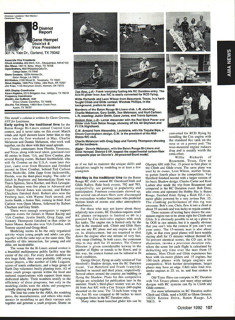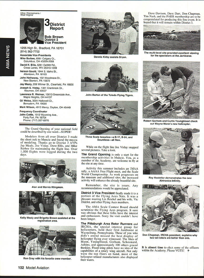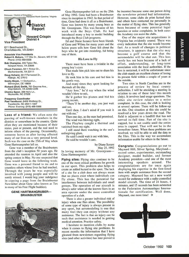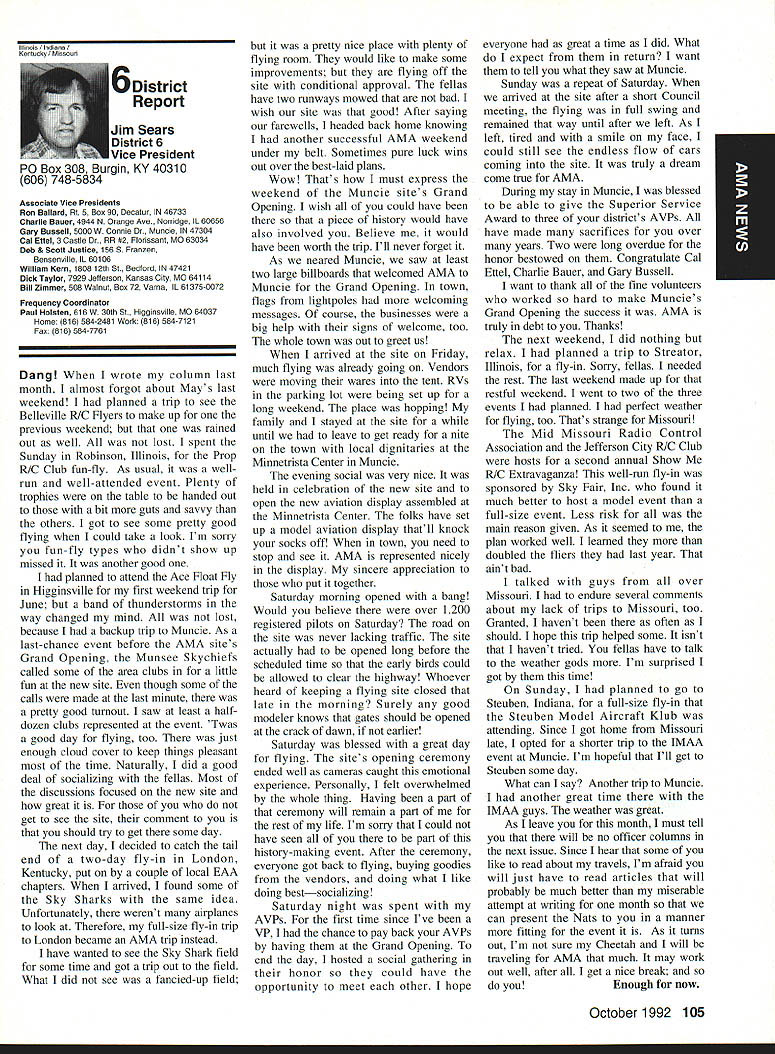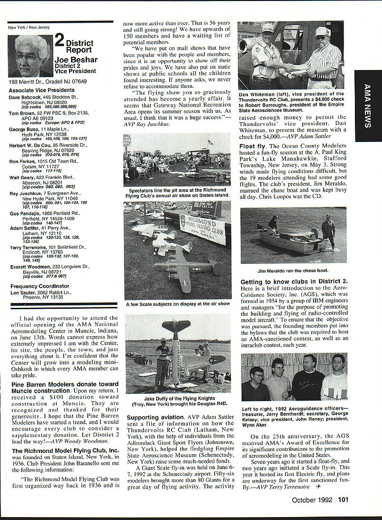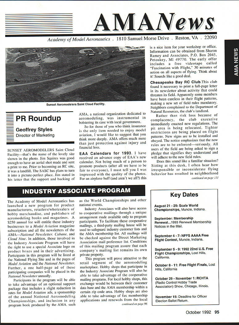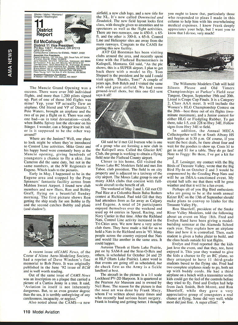 AMANews SUNSET AEROMODELERS Saint Cloud Facilitythats name lovely site shown photo Jim Squires good enough have aerial shot made sent print Prior becoming RC site landfill SASC has plans turn picture-perfect place Jim stated letter support backing 1810 Samuel Morse Drive Reston VA 22090 AMA national organization dedicated aeromodeling instrumental bolstering its case local government So think insurance item needed enjoy model aviation would like suggest think deeply AMA offers much just protection against injury financial loss EAA Calendars 1993 have received advance copy EAAs new calendar being much person promote products after have fair everyone must tell impressed quality photos airplane buff arent nice item workshop office Information can obtained Sharon Ramey Associates PO Box 2045 Petoskey MI 49770 early offer includes free videotape called Fascination Flight 30 minutes action aspects flying Think about Sounds like good deal Chesapeake Bay RC CIubThis club found necessary print full-page letter its newsletter about activity could threaten its field Apparently some members have careless flight patterns making new set field rules mandatory Neighbors complained Department Natural Resources clubs landlord Rather risk loss because complacency club executive immediately enacted new regulations pit area being relocated Tighter restrictions being placed flight patterns New signs installed obeyed notice emphasizes new rules enforcedseriously users field being asked sign pledge signifies understand will adhere new field rules Does sound like familiar situation Sitting desk often hear irresponsible inconsiderate flying behavior has resulted neighborhood continued page 111 Academy Model Aeronautics has launched new program product manufacturers retailers/wholesalers hobby merchandise publishers aeromodeling books magazines $250 annual fee will entitle industry businesses Model Aviation magazine subscription newsletters AMANational Newsletter Cabane Cloud Nine addition involved Industry Associate Program will have right use special Associate logo product boxes advertising Participants program will listed National Flying Site pages Model Aviation National Newsletter Further half-page ad participating companies will placed National Newsletter annually Participants program will able take advantage optional support package includes slight reduction rates Model Aviation ads sponsorship annual National Aeromodeling Championships inclusion program book produced AMA such World Championships other national events Industry Associates will also have access cooperative mailings through unique arrangement made available program participants facilitate cooperative mailings third-party mailing house will used safeguard industry customer lists AMA membership list mailings will checked against Direct Marketing Association mail preference list Conditions mailing program assure companys mailing list remains its own private property program will prove attractive retail segment aeromodeling marketplace Hobby shops participate Industry Associate Program will also able take advantage cooperative mailing programs local hobby shops exchange would between customer data base AIVIA membership within certain zip code area Hobby shops also able take advantage fax membership applications renewals local continued page 96 October 1992 95 Academy Model Aeronautics Sunset Aeromodelers Saint Cloud I-acuity __ PR Roundup Geoffrey Styles ctor Marketing Key Dates August 21 29 Scale World Championships Muncie Indiana September Membership Renewal.1993 Renewal Membership Notices Mail September 4 7 NFFS AAAA Free Flight Contest Muncie Indiana September 5-91992 22nd US Free Flight Championships Lost Hills California October 8 11 Free Flight Finals Lost Hills California October 29 November 1 RCHTA Radio Control Hobby Trade Association Show Chicago Illinois November 15 Deadline Officer Election Ballot Return Sound & Model Aeronautics Howard Crispin Jr GIANTS problem giant model has become model choice members today Visits flying sites around country make readily understood International Miniature Aircraft Association IMAA also understands membership AMA Special Interest Group will probably somewhere between 10000 12000 end 1992 represent substantial percentage AMA membership yet represent builders fliers giant models must consider size aircraft covered rule book Radio Control Scale model IMAA does take part competition stated its bylaws its members fly models AMA contests means problems dealing high sound levels apply across boardin competition IMAA fly-in events during sport flying local flying site category has changed along model aeronautics through years beginning models powered marginal engines often conversions made Homelite chain saw engines about 18-22 cu similar engines start became obvious needed Through years have engines market Today has wide choice engines have failing As power available increased did sound levels generated larger powerful units propellers being turned increasing velocities real neglect entire picture fact no effective mufflers sold engines today fact life blatant continued operation under conditions endangers sport just giants model activity flying site essential part sport Without have nothing Preservation thing must work survive important various aspects sound models understood can relate sound exhaust recognize sound lose muffler car hear unmuffled exhaust can also relate same manner 42-cu-in model aircraft engine running muffler ineffective unit Simply putting can exhaust might effective lowering exhaust fundamental sound will answer problem remaining part result engine firing harmonics exhaust handled somewhat effectively some smaller engines addition stinger such Mouse Irvine muffler integral design muffler latter seen designed similar Davis Soundmaster used within recommended rpm ranges propeller sizes very quiet because harmonics have reduced propeller seen predominant total sound assembly system bro