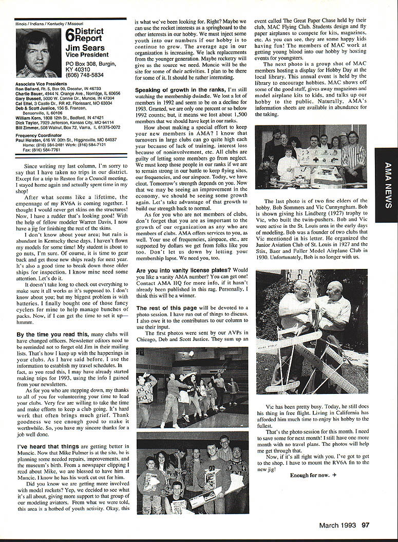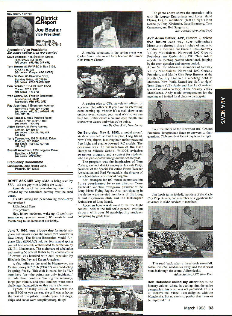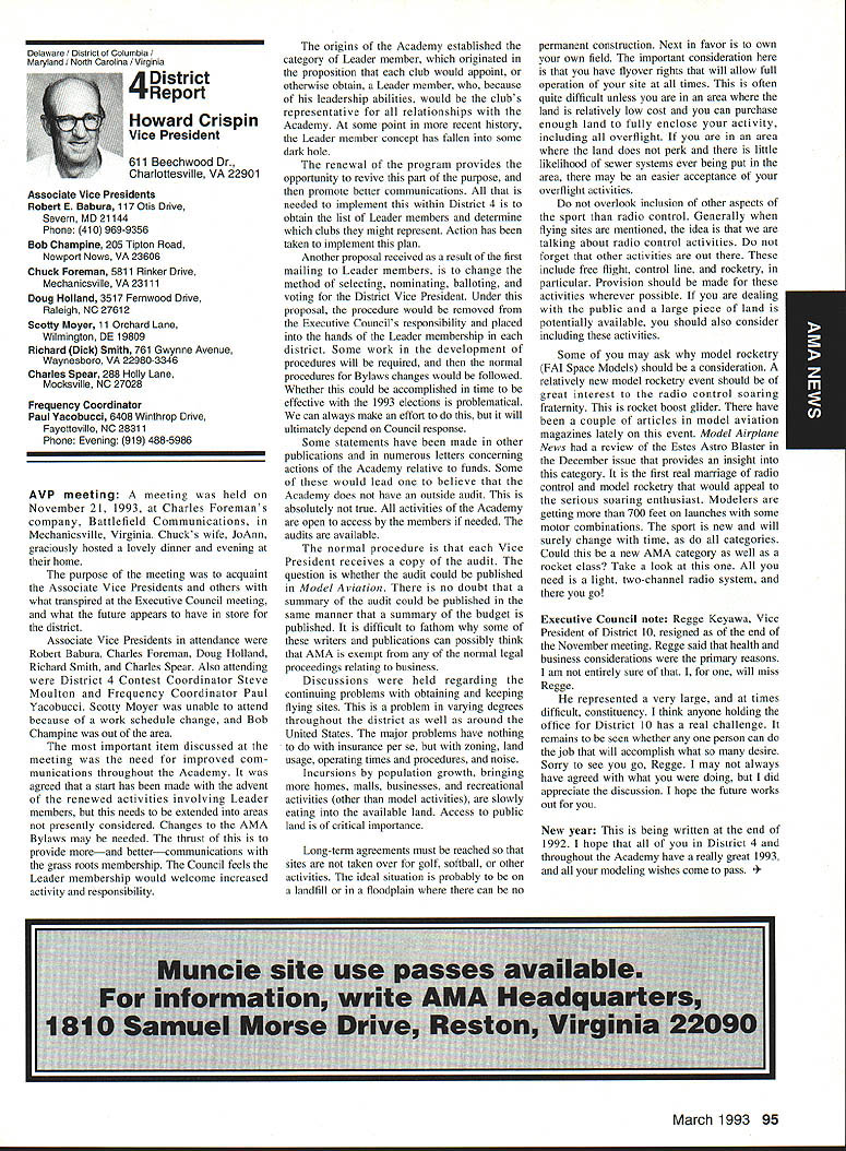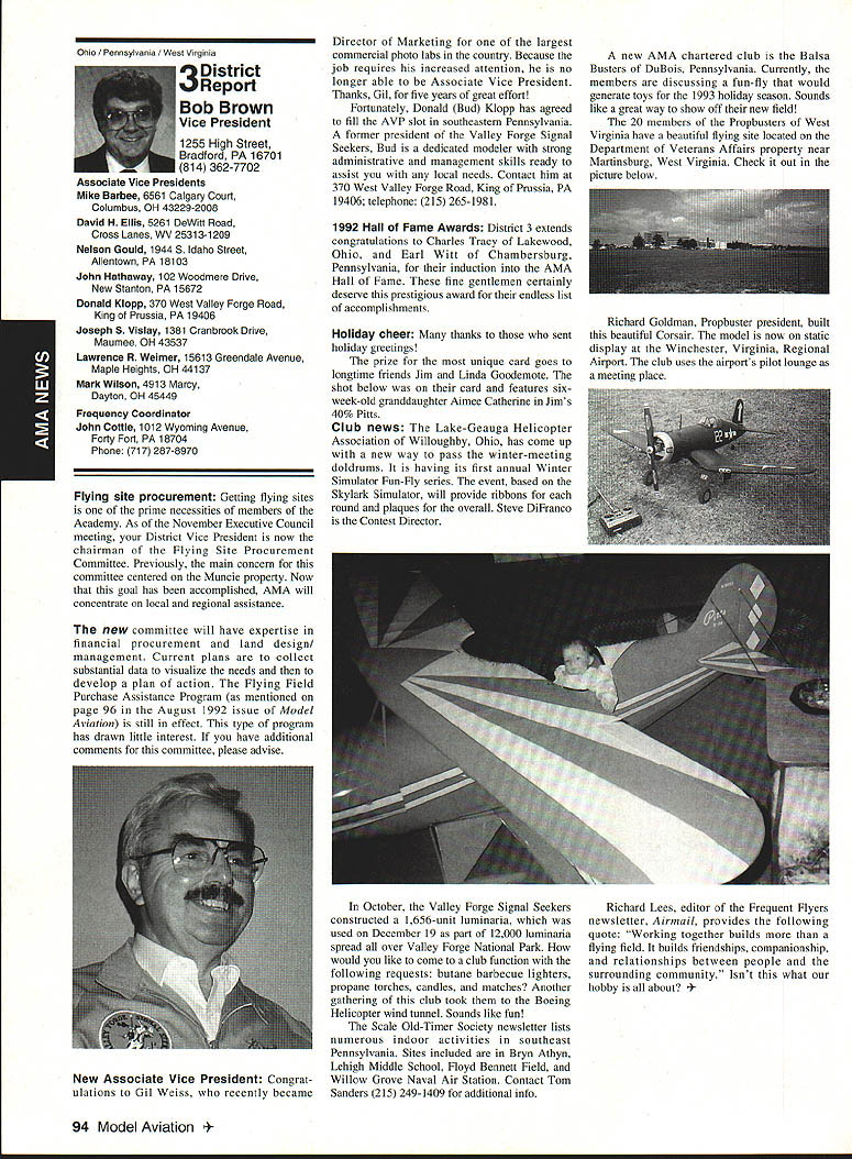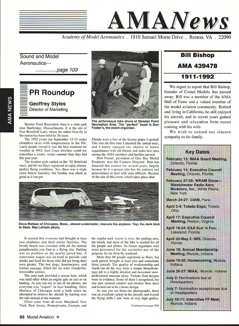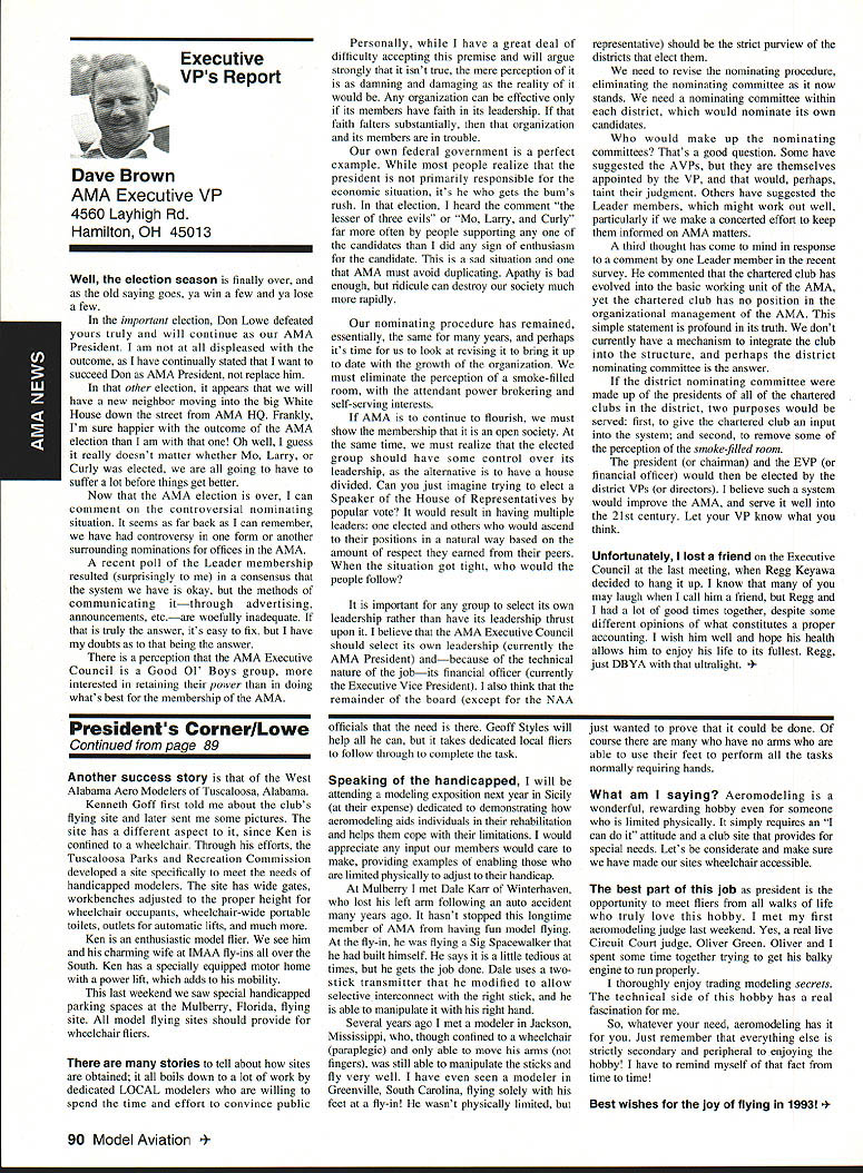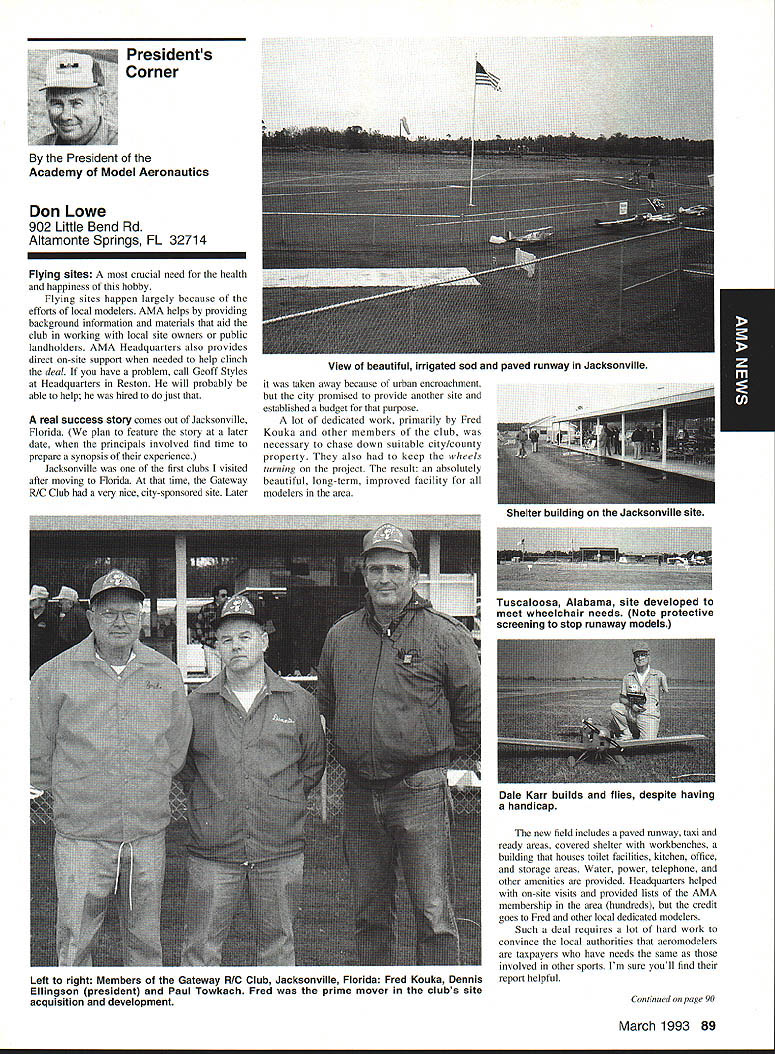 AMANews Academy Model Aeronautics 1810 Samuel Morse Drive on VA 0 Sound Model Aeronautics page 103 PR Roundup Geoffrey Styles Director Marketing Streeter Point Recreation Area State park near Sturbridge Massachusetts site East Brimfield Lake oldest float-fly nation has held 26 years 1992 event ran September 12-13 under cloudless skies temperatures 80s Local people vowed best weekend weather 1992 East Coast dwellers could remember cooler wetter summer past year weather gods smiled 92 Brimfield meet 66 fun-fliers registered enjoy almostperfect flying conditions Yes slight cross breeze Saturday Sunday about good can get seemed everyone brought least two airplanes entire families lovely beach crowded normal paraphernalia find flying site Parking no problem nearby paved lots concession wagon hand provide cold drinks food did bring own picnic hot dogs hamburgers Italian sausage filled air wonderful irresistible aromas state park provided rescue boat used often engine quit taxi landing As can see photos everyone expert boat handling Dave Matlasz Chicopee took bath attempted retrieve aircraft leaning over side instead transom Fliers came over Marylaid New York New Jersey Pennsylvania Georgia Florida few license plates spotted first time attended annual meet really enjoyed chance renew acquaintance old friends make new ones among AMA members families present Don Foster president Gee Bee Model Products Contest Director Don has directed contest several years largely because person has patience perseverance deal state officials Because size event takes place after regular park season over parking area beach lake needed people planes So Foster negotiates state personnel exclusive use property float-fly weekend 60 people registered fliers person brought least two sometimes three aircraft quality workmanship finish ran way simple MonoKote type job highly detailed decorated semi professional museum piece Various float designs evidence Some recognized pair seemed smaller sleeker turned out home design As can see photographs excellent variety aircraft overall flying skills saw very high quality Bill Bishop AMA 439478 1911-1992 regret report Bill Bishop founder Comet Models has passed away Bill member AMA Hall Fame valued member model aviation community Retired living California still enjoyed aircraft recent years gained pleasure relaxation ocean cruising wife wish extend sincere sympathy family 88 Model Aviation uresque lake shore iresur rains Recreation Area perfect head Don Fosters event organizer Dave Matlasz Chicopee Mass almost underwater rescues airplane Yep dark blob Dave Ray Latham photo Continued page 104 Presidents Corner President Academy ot Model Aeronautics Don Lowe 902 Little Bend Rd Altamonte Springs FL 32714 Flying sites crucial need health happiness hobby Flying sites happen largely because efforts local modelers AMA helps providing background information materials aid club working local site owners public landholders AMA Headquarters also provides direct on-site support needed help clinch deal have problem call Geoff Styles Headquarters Reston will probably able help hired just real success story comes out Jacksonville Florida plan feature story later date principals involved find time prepare synopsis experience Jacksonville first clubs visited after moving Florida time Gateway RIC Club very nice city-sponsored site Later taken away because urban encroachment city promised provide another site established budget purpose lot dedicated work primarily Fred Kouka other members club necessary chase down suitable city/county property also keep wheels turning project result absolutely beautiful long-term improved facility modelers area new field includes paved runway taxi ready areas covered shelter workbenches building houses toilet facilities kitchen office storage areas Water power telephone other amenities provided Headquarters helped on-site visits provided lists AMA membership area hundreds credit goes Fred other local dedicated modelers Such deal requires lot hard work convince local authorities aeromodelers taxpayers have needs same involved other sports Im sure youll find report helpful Continued page 90 March 1993 89 View beautiful irrigated sod paved runway Jacksonville hItr building Jacksonville site Tuscaloosa Alabama site developed meet wheelchair needs Note protective screening stop runaway models Dale Karr builds flies despite having handicap Left right Members Gateway WV Club Jacksonville Florida Fred Kouka Dennis Ellingson president Paul Towkach Fred prime mover clubs site acquisition development Executive VPs Report Dave Brown AMA Executive VP 4560 Layhigh Rd Hamilton OH 45013 Well election season finally over old saying goes ya win few ya lose few important election Don Lowe defeated yours truly will continue AMA President am displeased outcome have continually stated want succeed Don AMA President replace him other election appears will have new neighbor moving big White House down street AMA HQ Frankly Im sure happier outcome AMA election am Oh well guess really doesnt matter whether Mo Larry Curly elected going have suffer lot before things get better Now AMA election over can comment controversial nominating situation seems far back can remember have controversy form another surrounding nominations offices AMA recent poll Leader membership resulted surprisingly consensus system have okay methods communicating itthrough advertising announcements etcare woefully inadequate truly answer its easy fix have doubts being answer perception AMA Executive Council Good 01 Boys group interested retaining power doing whats best membership AMA Personally have great deal difficulty accepting premise will argue strongly isnt true mere perception damning damaging reality would Any organization can effective its members have faith its leadership faith falters substantially organization its members trouble own federal government perfect example people realize president primarily responsib