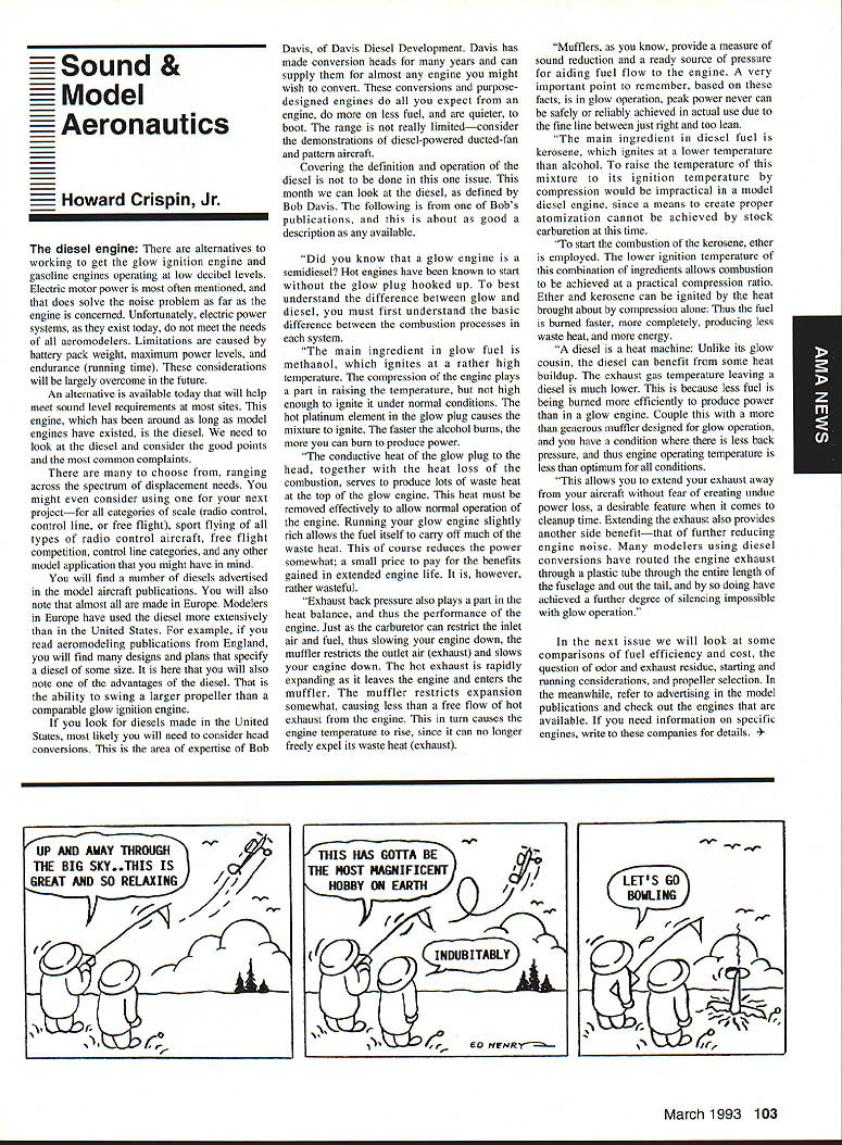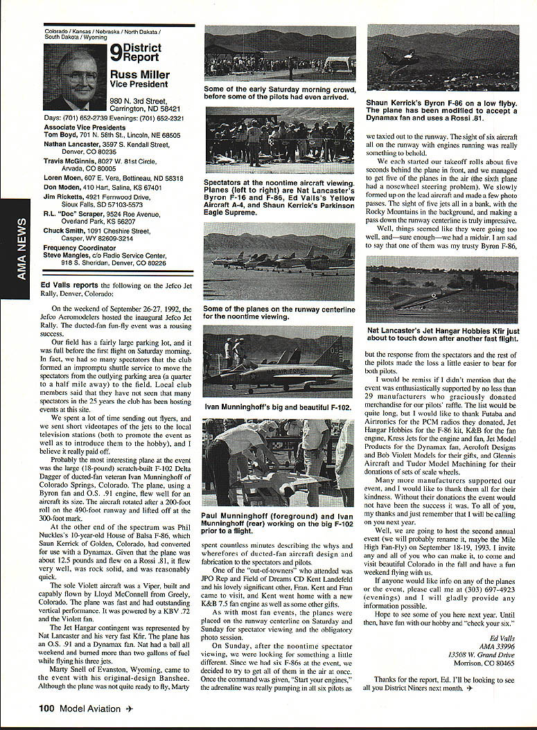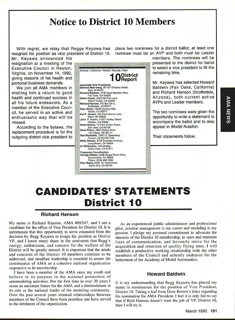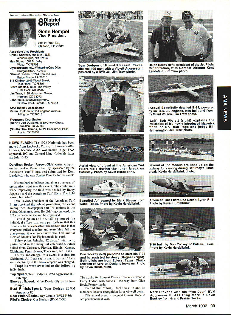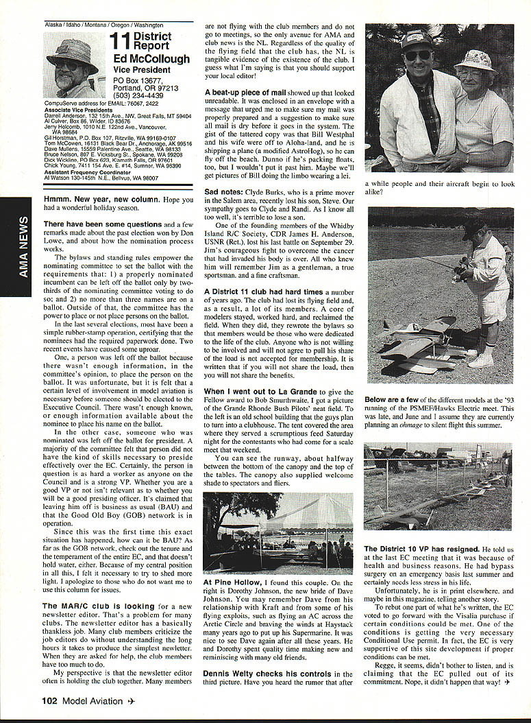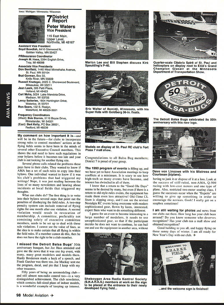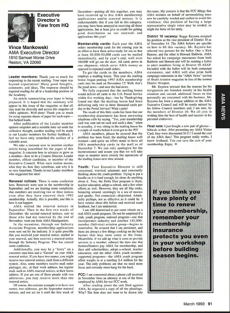 AMANews Academy Model Aeronautics 1810 Samuel Morse Drive on VA 0 Sound Model Aeronautics page 103 PR Roundup Geoffrey Styles Director Marketing Streeter Point Recreation Area State park near Sturbridge Massachusetts site East Brimfield Lake oldest float-fly nation has held 26 years 1992 event ran September 12-13 under cloudless skies temperatures 80s Local people vowed best weekend weather 1992 East Coast dwellers could remember cooler wetter summer past year weather gods smiled 92 Brimfield meet 66 fun-fliers registered enjoy almostperfect flying conditions Yes slight cross breeze Saturday Sunday about good can get seemed everyone brought least two airplanes entire families lovely beach crowded normal paraphernalia find flying site Parking no problem nearby paved lots concession wagon hand provide cold drinks food did bring own picnic hot dogs hamburgers Italian sausage filled air wonderful irresistible aromas state park provided rescue boat used often engine quit taxi landing As can see photos everyone expert boat handling Dave Matlasz Chicopee took bath attempted retrieve aircraft leaning over side instead transom Fliers came over Marylaid New York New Jersey Pennsylvania Georgia Florida few license plates spotted first time attended annual meet really enjoyed chance renew acquaintance old friends make new ones among AMA members families present Don Foster president Gee Bee Model Products Contest Director Don has directed contest several years largely because person has patience perseverance deal state officials Because size event takes place after regular park season over parking area beach lake needed people planes So Foster negotiates state personnel exclusive use property float-fly weekend 60 people registered fliers person brought least two sometimes three aircraft quality workmanship finish ran way simple MonoKote type job highly detailed decorated semi professional museum piece Various float designs evidence Some recognized pair seemed smaller sleeker turned out home design As can see photographs excellent variety aircraft overall flying skills saw very high quality Bill Bishop AMA 439478 1911-1992 regret report Bill Bishop founder Comet Models has passed away Bill member AMA Hall Fame valued member model aviation community Retired living California still enjoyed aircraft recent years gained pleasure relaxation ocean cruising wife wish extend sincere sympathy family 88 Model Aviation uresque lake shore iresur rains Recreation Area perfect head Don Fosters event organizer Dave Matlasz Chicopee Mass almost underwater rescues airplane Yep dark blob Dave Ray Latham photo Continued page 104 Presidents Corner President Academy ot Model Aeronautics Don Lowe 902 Little Bend Rd Altamonte Springs FL 32714 Flying sites crucial need health happiness hobby Flying sites happen largely because efforts local modelers AMA helps providing background information materials aid club working local site owners public landholders AMA Headquarters also provides direct on-site support needed help clinch deal have problem call Geoff Styles Headquarters Reston will probably able help hired just real success story comes out Jacksonville Florida plan feature story later date principals involved find time prepare synopsis experience Jacksonville first clubs visited after moving Florida time Gateway RIC Club very nice city-sponsored site Later taken away because urban encroachment city promised provide another site established budget purpose lot dedicated work primarily Fred Kouka other members club necessary chase down suitable city/county property also keep wheels turning project result absolutely beautiful long-term improved facility modelers area new field includes paved runway taxi ready areas covered shelter workbenches building houses toilet facilities kitchen office storage areas Water power telephone other amenities provided Headquarters helped on-site visits provided lists AMA membership area hundreds credit goes Fred other local dedicated modelers Such deal requires lot hard work convince local authorities aeromodelers taxpayers have needs same involved other sports Im sure youll find report helpful Continued page 90 March 1993 89 View beautiful irrigated sod paved runway Jacksonville hItr building Jacksonville site Tuscaloosa Alabama site developed meet wheelchair needs Note protective screening stop runaway models Dale Karr builds flies despite having handicap Left right Members Gateway WV Club Jacksonville Florida Fred Kouka Dennis Ellingson president Paul Towkach Fred prime mover clubs site acquisition development Executive VPs Report Dave Brown AMA Executive VP 4560 Layhigh Rd Hamilton OH 45013 Well election season finally over old saying goes ya win few ya lose few important election Don Lowe defeated yours truly will continue AMA President am displeased outcome have continually stated want succeed Don AMA President replace him other election appears will have new neighbor moving big White House down street AMA HQ Frankly Im sure happier outcome AMA election am Oh well guess really doesnt matter whether Mo Larry Curly elected going have suffer lot before things get better Now AMA election over can comment controversial nominating situation seems far back can remember have controversy form another surrounding nominations offices AMA recent poll Leader membership resulted surprisingly consensus system have okay methods communicating itthrough advertising announcements etcare woefully inadequate truly answer its easy fix have doubts being answer perception AMA Executive Council Good 01 Boys group interested retaining power doing whats best membership AMA Personally have great deal difficulty accepting premise will argue strongly isnt true mere perception damning damaging reality would Any organization can effective its members have faith its leadership faith falters substantially organization its members trouble own federal government perfect example people realize president primarily responsib