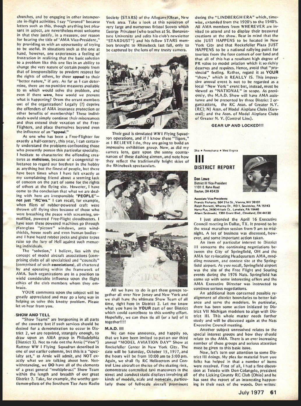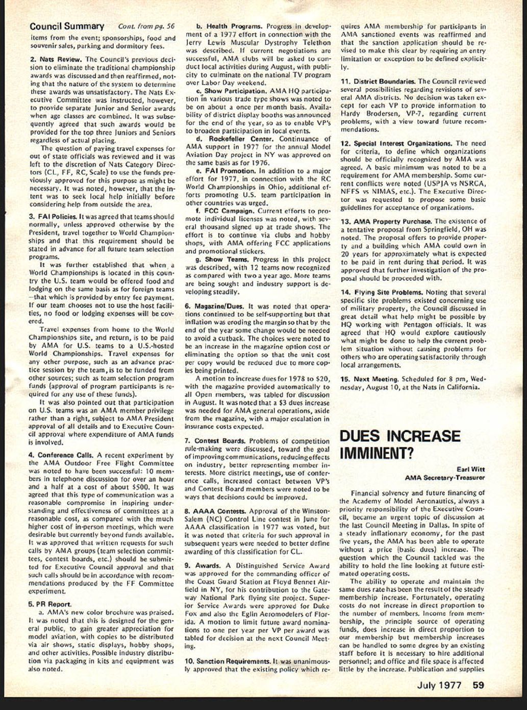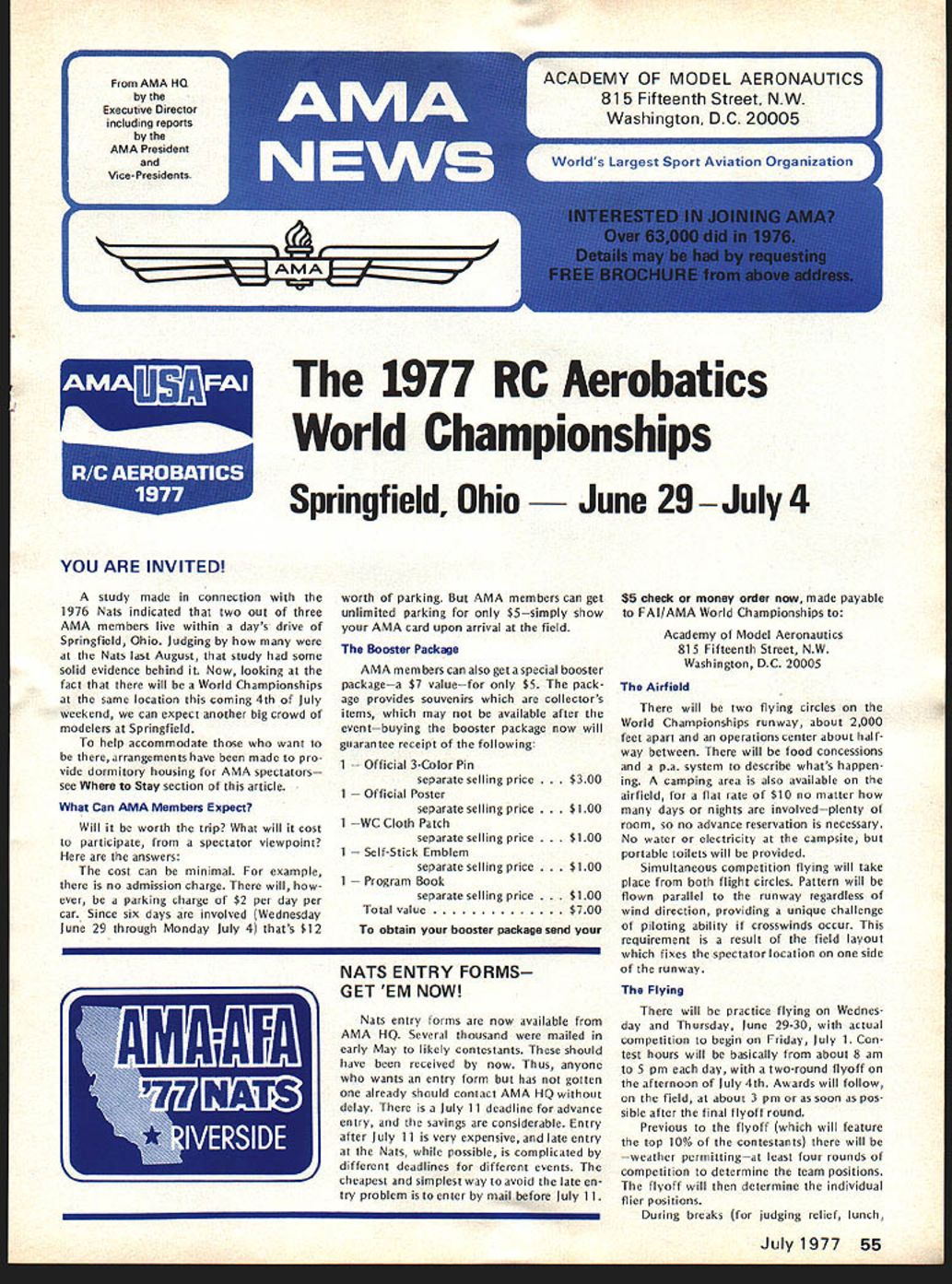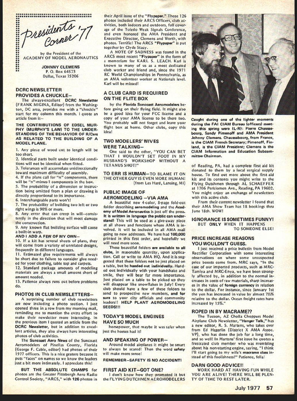 World Championships E 1Aj I~U Springfield OhioJune 29July 4 YOU ARE INVITED study made connection 1976 Nats indicated two out three AMA members live within days drive Springfield Ohio Judging Nats last August study some solid evidence behind Now looking fact will World Championships same location coming 4th July weekend can expect another big crowd modelers Springfield help accommodate want arrangements have made pro vide dormitory housing AMA spectators see Stay section article What Can AMA Members Expect Will worth trip What will cost participate spectator viewpoint answers cost can minimal example no admission charge will ever parking charge $2 per day per car Since six days involved Wednesday June 29 through Monday July 4 thats $12 worth parking AMA members can get unlimited parking $5simply show AMA card upon arrival field Booster Package AMA members can also get special booster packagea $7 valuefor $5 pack age provides souvenirs collectors items may available after eventbuying booster package now will guarantee receipt following 1 -- Official 3-Color Pin separate selling price . $300 1 cial Poster separate selling price 0 1 WC Cloth Patch separate selling price 00 1 -Stick Emblem separate selling price 00 1 ram Book separate selling price 00 Total value 0 obtain booster package send NATS ENTRY FORMS GET EM NOW Nats entry torms now available AMA HQ Several thousand mailed early May likely contestants should have received now Thus anyone wants entry form has gotten already should contact AMA HQ delay July 11 deadline advance entry savings considerable Entry after July 11 very expensive late entry Nats possible complicated different deadlines different events cheapest simplest way avoid late en try problem enter mail before July 11 $5 check money order now made payable FAI/AMA World Championships Academy Model Aeronautics 815 Fifteenth Street NW Washington DC 20005 Airfield will two flying circles World Championships runway about 2000 feet apart operations center about half way between will food concessions pa system describe whats happen ing camping area also available airfield flat rate $10 no matter days nights involved--plenty room no advance reservation necessary No water electricity campsite portable toilets will provided Simultaneous competition flying will take place both flight circles Pattern will flown parallel runway regardless wind direction providing unique challenge piloting ability crosswinds occur requirement result field layout fixes spectator location side runway Flying will practice flying Wednes day Thursday June 29-30 actual competition begin Friday July 1 Con test hours will basically about 8 am 5 pm day two-round flyoff afternoon July 4th Awards will follow field about 3 pm soon pos sible after final flyoff round Previous flyoff will feature top 10% contestants will weather permitting-at least four rounds competition determine team positions flyoff will determine individual flier positions During breaks judging relief lunch July1977 55 AMA HQ Executive Director including reports AMA President Vice-Presidents r ACADEMY OF MODEL AERONAUTICS Washington DC 200051 81 5 Fifteenth Street NW Worlds Largest Sport Aviation Organization 1977 RC Aerobatics etc special demonstration fiights planned show new developments tech niques equipment etc last championships held US Doylestown PA 1971 may remember first successful outdoor public demonstrations RC Helicopter flying AMA members attend World Championships spectators wont disap pointed will continuous action accompanied quick reporting scores special effort being made direction including use Olympic-type flash cards Closed-circuit television coverage will also operation show whats happening flight lines other locationsTV receiv ers away flight lines will enable everyone keep up contest various other airfield locations Fees parking program sales etc plus donations needed AMA break financially AMA member officials donating time sup plies services facilities must bought rented during contest period Also team entry fees maximum limited FAI barely cover team mem ber housing food costs Furthermore travel food lodging costs about 12 ficials outside US including judges must covered Stay AMA HQ has motel list Spring field area Rooms will also available AMA member spectators families non-air conditioned dormitories Wittenberg University Springfield $6 per per son per night Morning evening meals college will also availablesend dorm information Awards Ceremony Having airport following competition makes possible present participate enables spectators news media get pictures share cere monies head home early evening Lots happening make RC/WC week greatest modeling event yearmag azine deadlines prevent complete reporting time basic message however Springfield will place during 4th July weekend havent al ready made plans come dont delay ac commodations getting scarce cant come get Booster Package anywayit will provide collector items event SUMMARY OF APRIL 16 COUNCIL MEETING 1 Financial Review slightly revised version budget accepted January approved noting current membership slightly ahead predictions AMA ended first quarter 1977 within budget Check signing authority various HQ staff members approved 1977 RC World Championships project authorized commit up $25000 ex penses expectation ex penses would offset various income Continued page 59 56 Model Aviation 44 *4 ~IJ President ACADEMY OF MODEL AERONAUTICS JOHNNY CLEMENS P 0 Box 64573 Dallas Texas 75206 DCRC NEWSLETTER PROVIDES CHUCKLE always-excellent DCRC Newsletter FRANK MIGINA Editor Washing ton DC area provides chuckle start column month quote article THE CONTRIBUTIONS OF EDSEL MUR PHY MURPHYS LAW TO THE UNDER STANDING OF THE BEHAVIOR OF R/Cers AS RELATED TO THE BUILDING OF MODEL PLANE 1 Any piece wood cut length will too short 2 Identical parts built under identical condi tions will identical fitted 3 Tolerances will accumulate unidirectionally toward maximum difficulty assembly 4 