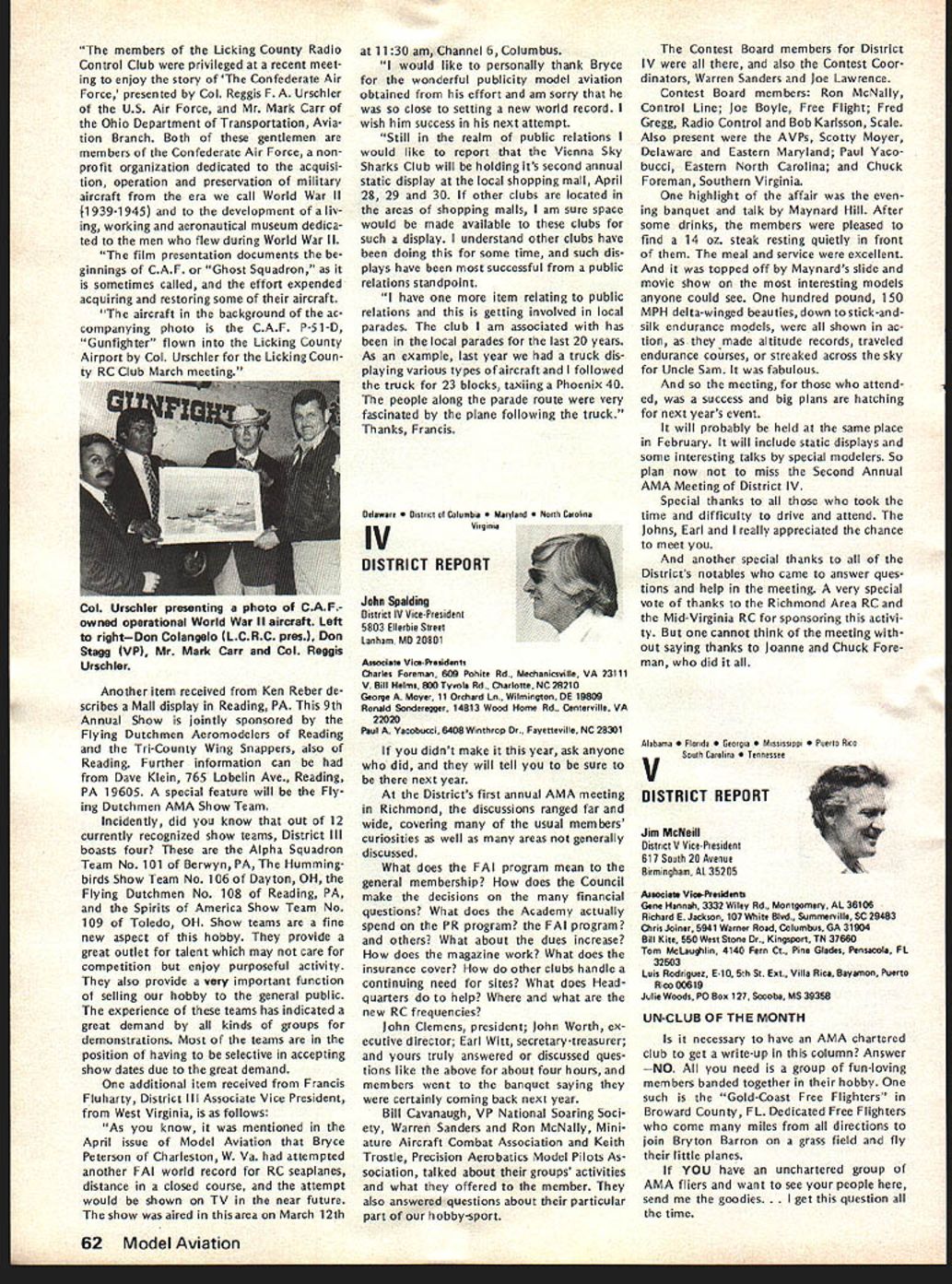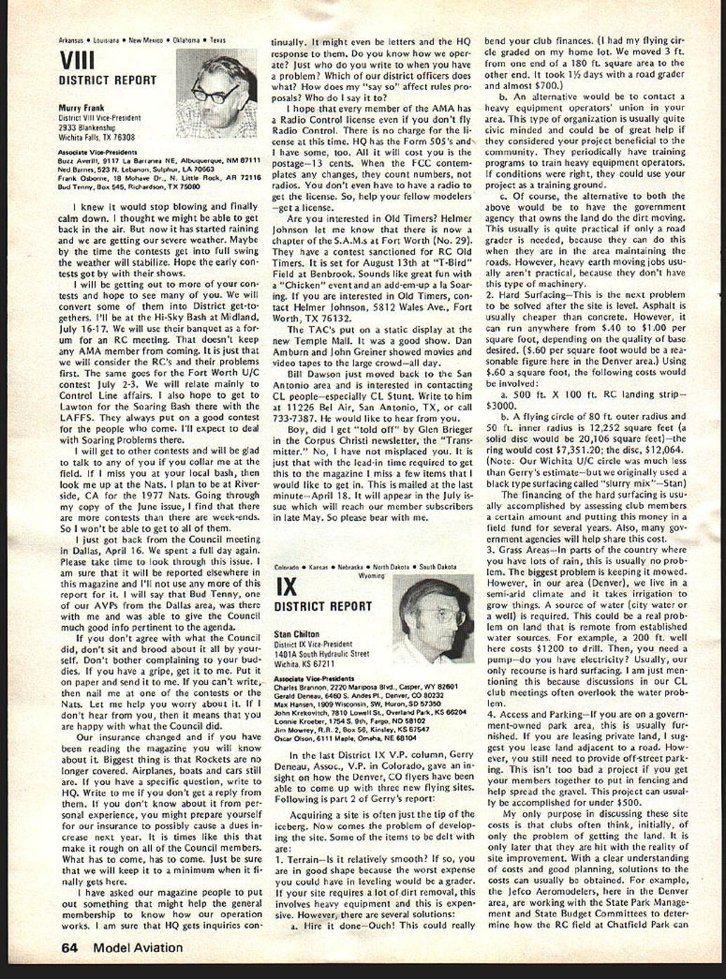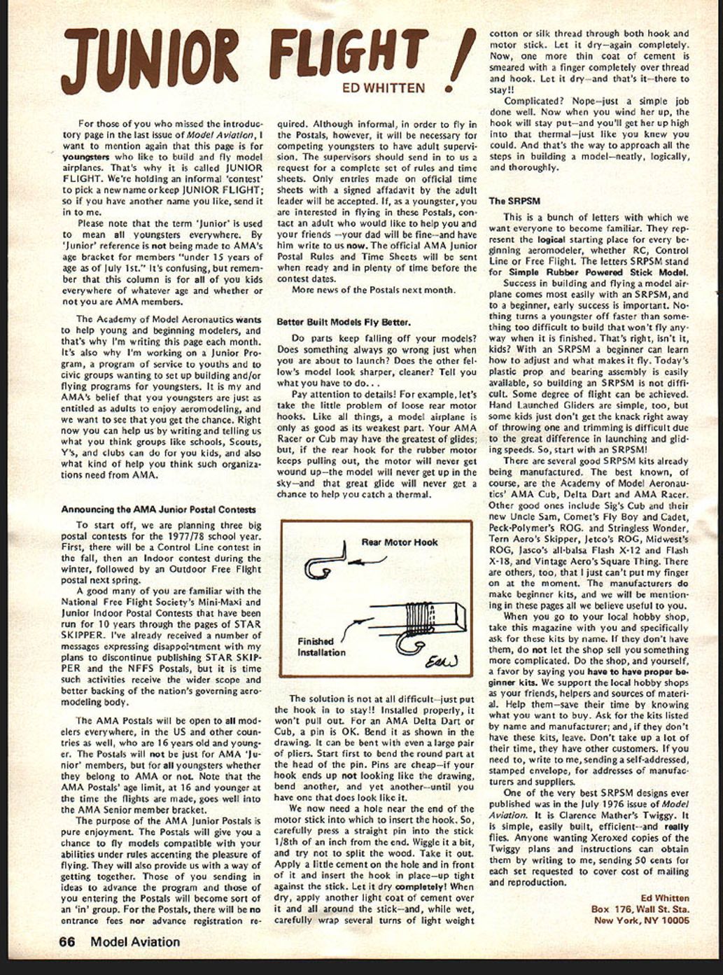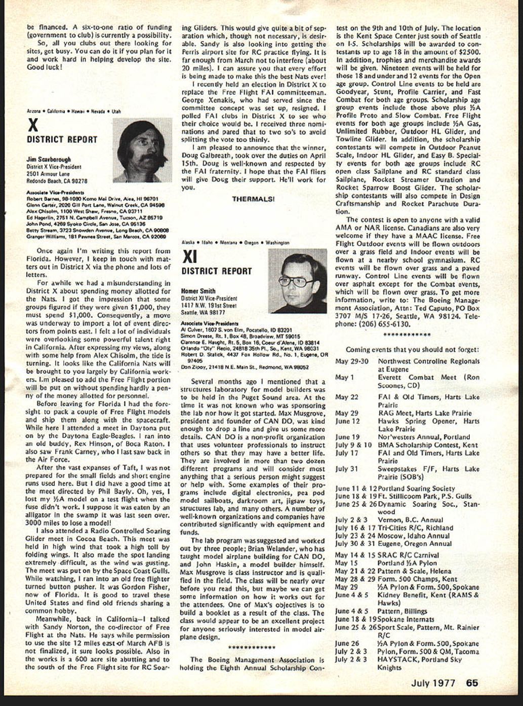 World Championships E 1Aj I~U Springfield OhioJune 29July 4 YOU ARE INVITED study made connection 1976 Nats indicated two out three AMA members live within days drive Springfield Ohio Judging Nats last August study some solid evidence behind Now looking fact will World Championships same location coming 4th July weekend can expect another big crowd modelers Springfield help accommodate want arrangements have made pro vide dormitory housing AMA spectators see Stay section article What Can AMA Members Expect Will worth trip What will cost participate spectator viewpoint answers cost can minimal example no admission charge will ever parking charge $2 per day per car Since six days involved Wednesday June 29 through Monday July 4 thats $12 worth parking AMA members can get unlimited parking $5simply show AMA card upon arrival field Booster Package AMA members can also get special booster packagea $7 valuefor $5 pack age provides souvenirs collectors items may available after eventbuying booster package now will guarantee receipt following 1 -- Official 3-Color Pin separate selling price . $300 1 cial Poster separate selling price 0 1 WC Cloth Patch separate selling price 00 1 -Stick Emblem separate selling price 00 1 ram Book separate selling price 00 Total value 0 obtain booster package send NATS ENTRY FORMS GET EM NOW Nats entry torms now available AMA HQ Several thousand mailed early May likely contestants should have received now Thus anyone wants entry form has gotten already should contact AMA HQ delay July 11 deadline advance entry savings considerable Entry after July 11 very expensive late entry Nats possible complicated different deadlines different events cheapest simplest way avoid late en try problem enter mail before July 11 $5 check money order now made payable FAI/AMA World Championships Academy Model Aeronautics 815 Fifteenth Street NW Washington DC 20005 Airfield will two flying circles World Championships runway about 2000 feet apart operations center about half way between will food concessions pa system describe whats happen ing camping area also available airfield flat rate $10 no matter days nights involved--plenty room no advance reservation necessary No water electricity campsite portable toilets will provided Simultaneous competition flying will take place both flight circles Pattern will flown parallel runway regardless wind direction providing unique challenge piloting ability crosswinds occur requirement result field layout fixes spectator location side runway Flying will practice flying Wednes day Thursday June 29-30 actual competition begin Friday July 1 Con test hours will basically about 8 am 5 pm day two-round flyoff afternoon July 4th Awards will follow field about 3 pm soon pos sible after final flyoff round Previous flyoff will feature top 10% contestants will weather permitting-at least four rounds competition determine team positions flyoff will determine individual flier positions During breaks judging relief lunch July1977 55 AMA HQ Executive Director including reports AMA President Vice-Presidents r ACADEMY OF MODEL AERONAUTICS Washington DC 200051 81 5 Fifteenth Street NW Worlds Largest Sport Aviation Organization 1977 RC Aerobatics etc special demonstration fiights planned show new developments tech niques equipment etc last championships held US Doylestown PA 1971 may remember first successful outdoor public demonstrations RC Helicopter flying AMA members attend World Championships spectators wont disap pointed will continuous action accompanied quick reporting scores special effort being made direction including use Olympic-type flash cards Closed-circuit television coverage will also operation show whats happening flight lines other locationsTV receiv ers away flight lines will enable everyone keep up contest various other airfield locations Fees parking program sales etc plus donations needed AMA break financially AMA member officials donating time sup plies services facilities must bought rented during contest period Also team entry fees maximum limited FAI barely cover team mem ber housing food costs Furthermore travel food lodging costs about 12 ficials outside US including judges must covered Stay AMA HQ has motel list Spring field area Rooms will also available AMA member spectators families non-air conditioned dormitories Wittenberg University Springfield $6 per per son per night Morning evening meals college will also availablesend dorm information Awards Ceremony Having airport following competition makes possible present participate enables spectators news media get pictures share cere monies head home early evening Lots happening make RC/WC week greatest modeling event yearmag azine deadlines prevent complete reporting time basic message however Springfield will place during 4th July weekend havent al ready made plans come dont delay ac commodations getting scarce cant come get Booster Package anywayit will provide collector items event SUMMARY OF APRIL 16 COUNCIL MEETING 1 Financial Review slightly revised version budget accepted January approved noting current membership slightly ahead predictions AMA ended first quarter 1977 within budget Check signing authority various HQ staff members approved 1977 RC World Championships project authorized commit up $25000 ex penses expectation ex penses would offset various income Continued page 59 56 Model Aviation 44 *4 ~IJ President ACADEMY OF MODEL AERONAUTICS JOHNNY CLEMENS P 0 Box 64573 Dallas Texas 75206 DCRC NEWSLETTER PROVIDES CHUCKLE always-excellent DCRC Newsletter FRANK MIGINA Editor Washing ton DC area provides chuckle start column month quote article THE CONTRIBUTIONS OF EDSEL MUR PHY MURPHYS LAW TO THE UNDER STANDING OF THE BEHAVIOR OF R/Cers AS RELATED TO THE BUILDING OF MODEL PLANE 1 Any piece wood cut length will too short 2 Identical parts built under identical condi tions will identical fitted 3 Tolerances will accumulate unidirectionally toward maximum difficulty assembly 4 