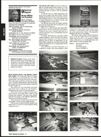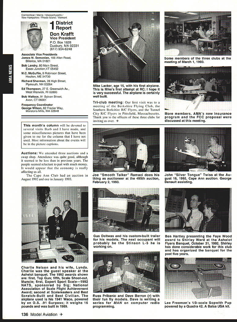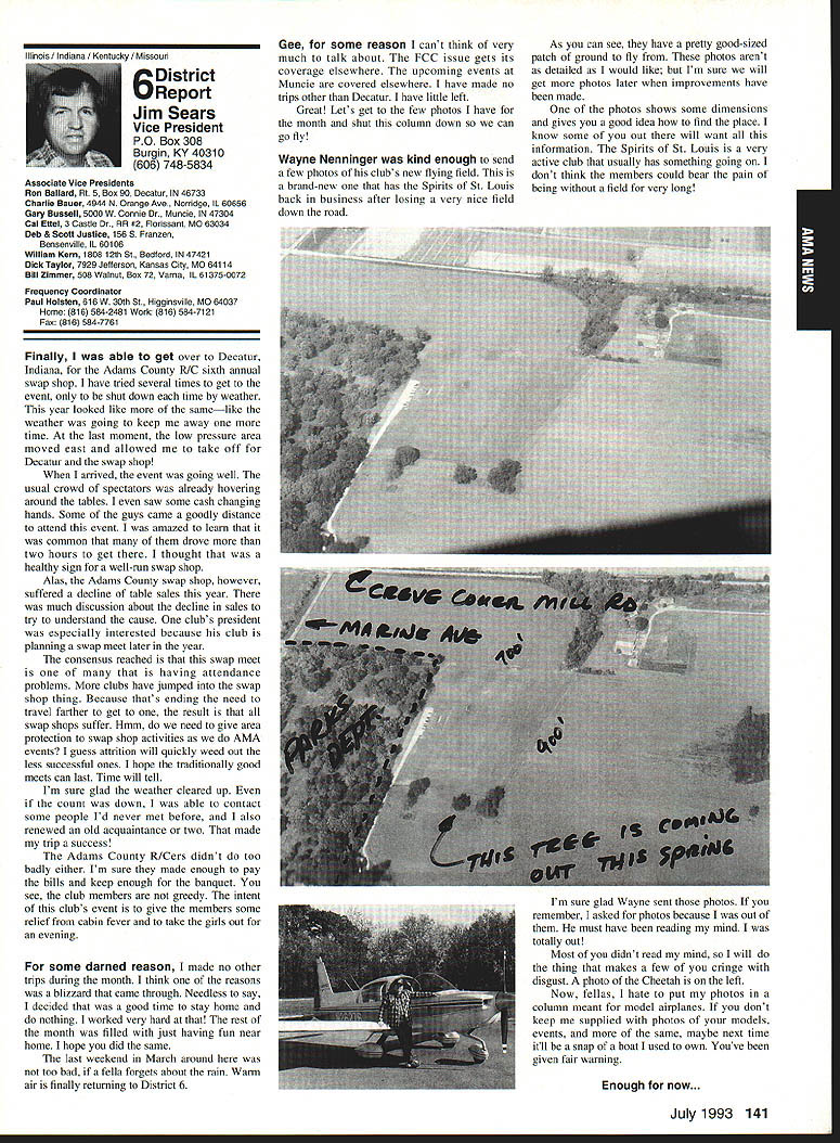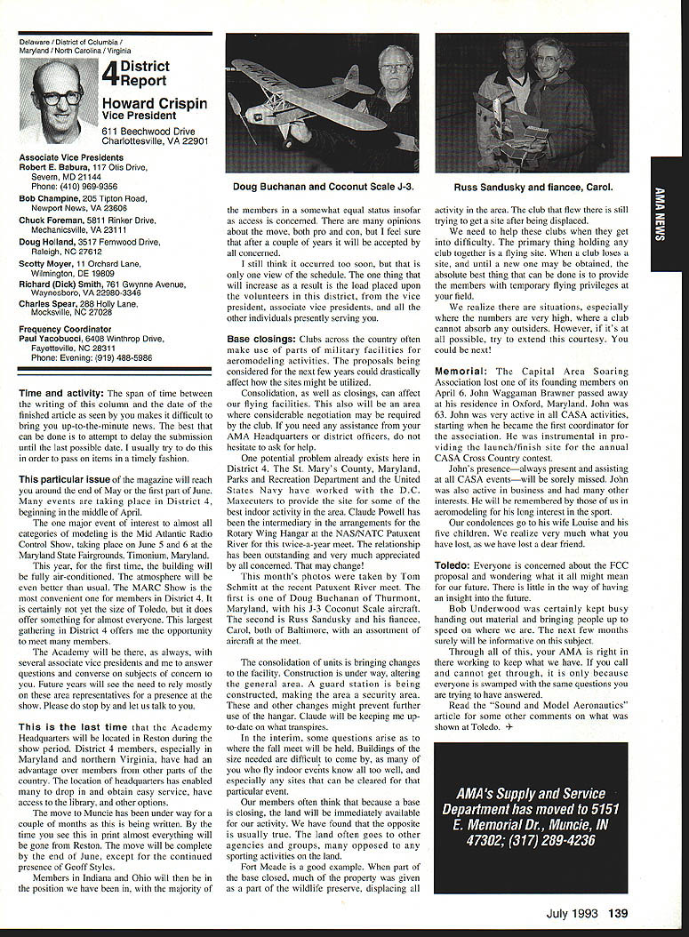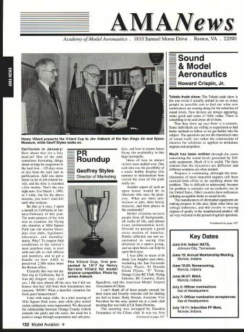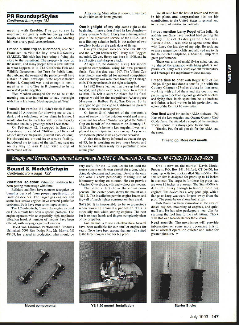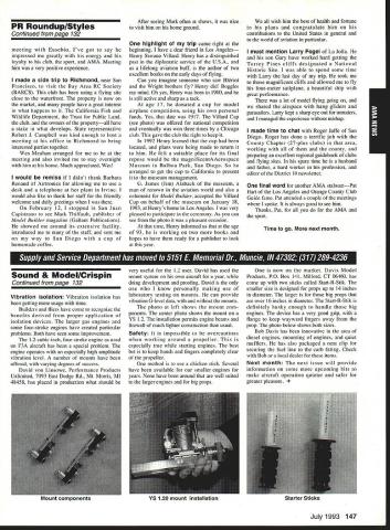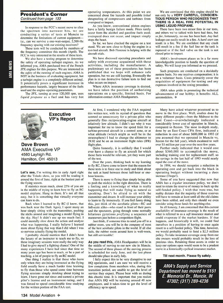 AMANews Academy Model Aeronautics 1810 Samuel Morse Drive Reston VA 22090 California January about July lead-in odd sometimes frustrating things about writing magazines lead time120 days less start date publication Add factor lot job-related travel time extended few months Thats ease right now March 11993 write above reasons wont read until after midyear may spent month California Jan uary-February year main purpose visit examine flying site situation Mile Square Park old marine base plus visit clubs legislators educators manufac turers inspect field conditions nations populous state meet talk club officers members get handle AMA perceived 2500 miles Reston office Certainly first trip California longest stay yes did miss almost rain did see houses slid foundations canyons WOW What horrible situation poor homeowners met clubs joint meeting Mile Square Park users nine clubs plus model rocket enthusiasts represented discussed relationship between Orange County controls park users need positive image through cooperation safe prac tices ensure future flying site availability huge metropolis Ideas attract visitors mulled over such idea possibility static hobby display summer demonstrate varied uses park really Another aspect such open house would illustrate uses prop erty What pro fessions jobs family interests places community Model aviation attracts people backgrounds walks life almost socioeconomic level Overall present good cross section America Public officials ac customed seeing diversity sports group open house can help open eyes able meet Los Angeles area clubs including San Fernando Valley Flyers El Dorado Silent Flyers F Troop Orange Coast RC Club Flying Falcons RC Country Scale Squadron American Model Airport Association Chino cant thank people enough warm friendly welcome making feel home Betty Stream Associate Vice President area joined joint club meeting held Cal State-Pomona meeting arranged Eusebio Fernandez Chino club first Continued page 147 Sound & Model Aeronautics Howard Crispin Jr Toledo trade show Toledo trade show event usually attend see people possible find out what new contrivances coming along reduction sound levels New devices always appearing some good some little value something said about show up says concern Some individuals willing experiment find better methods follow get further subject questions theoretical ones sound itself rather relationship theories solutions applied miniature engines propellers Much has written through years concerning sound levels generated fullscale equipment Much useful facts remain dynamics different different solutions often needed Progress continuing although man ufacturers imported engines still have exerted little effort anything about problem difficult understand because problem certainly exclusive United States Other countries have ordinances defining acceptable limits sound levels manufacturers aftermarket equipment making progress area Quite often cottage industries results varying degrees quality manufacmred product very welcome pursuit quieter operation Continued page 147 132 Model Aviation y Villard presents Villard Cup Jim Alaback San Diego Air Space Museum Geoff Styles looks PR Roundup Geoffrey Styles Director Marketing Villard Cup first pre sented 1917 Henry Serrano Villard model airplane competition Photo James Alaback Key Dates June 3-6 Indoor NATS Johnson City Tennessee June 19 Annual Membership Meeting Muncie Indiana June 19-20 Homecoming Muncie Indiana June 26-27 IMAA Muncie Indiana July 2 Officer nominations due Headquarters July 7 Officer nomination acceptances due Headquarters July 10-11 Intercities FF Meet Muncie Indiana residents President Academy Model Aeronautics Don Lowe 902 Little Bend Road Altamonte Springs FL 32714 mighty busy year Academy As probably know already headquarters moving Muncie departments will place July year easy task fraught decisions actions involving facility setup moving personnel equipment along hiring new personnel Some headquarters staff have elected move will delays because will interviewing hiring significant number new people will take time train asking patience during process intend best meet important needs AMA will maintain office presence Reston person Geoffrey Styles will work out Reston area will away office much time helping clubs flying site retention acquisition club support roles has already spent considerable time California area Southeast club support massive importance Geoff man full-time effort setup Muncie initially will use part existing museum building office space permanent office facility will added following sale AMAs building Reston less expensive keep up facility Muncie site improvement continues number events scheduled year second gathering Muncie will June Homecoming strongly encourage can take part will multifaceted event lots model flying rocket demos competition kite flying street rod show much Yall come Well return Lawrenceville year National Aeromodeling Championships indications great event fall AMA will host Free Flight World Championships Lost Hills California technical side line educational charter AMA becoming involved technical side hobby growth aeromodeling has brought about special challenges AMA know has deeply involved frequency acquisition will continue push back frontiers model radio activities cooperation model industry have helped establish requirements performed experiments general learned what necessary allow quality operation todays difficult electromagnetic environment Continued page 134 July1993 133 JPX turbojet engine mocked up F-16 model fuselage aft end Exhaust gas temperature being measured determine effect installation Aluminum liner installed aft fuselage small fire start partially melted liner blew out aft end thermocoupled temperature measurement Note starter hose left ignition module right engine very careful methodical modeler Presidents Corner Continued page 133 response FCCs recent move slice spectrum narrower bits con