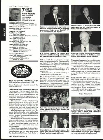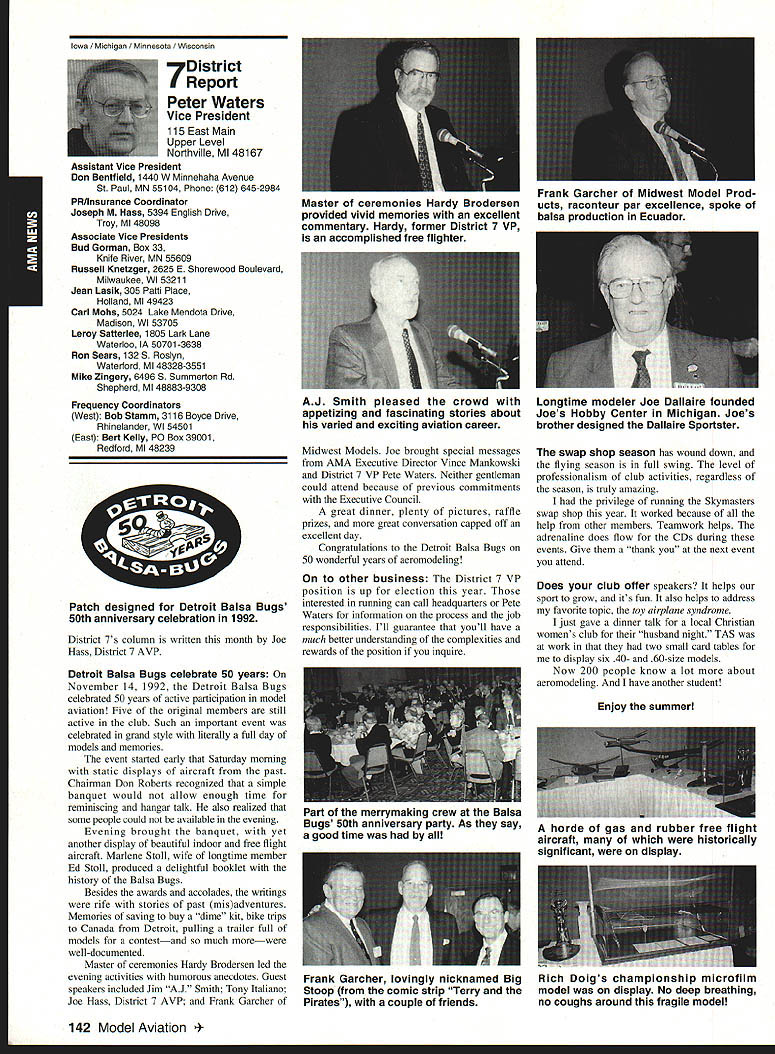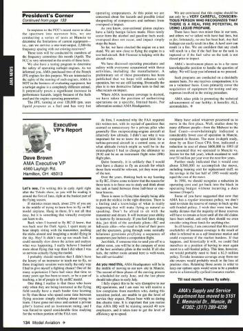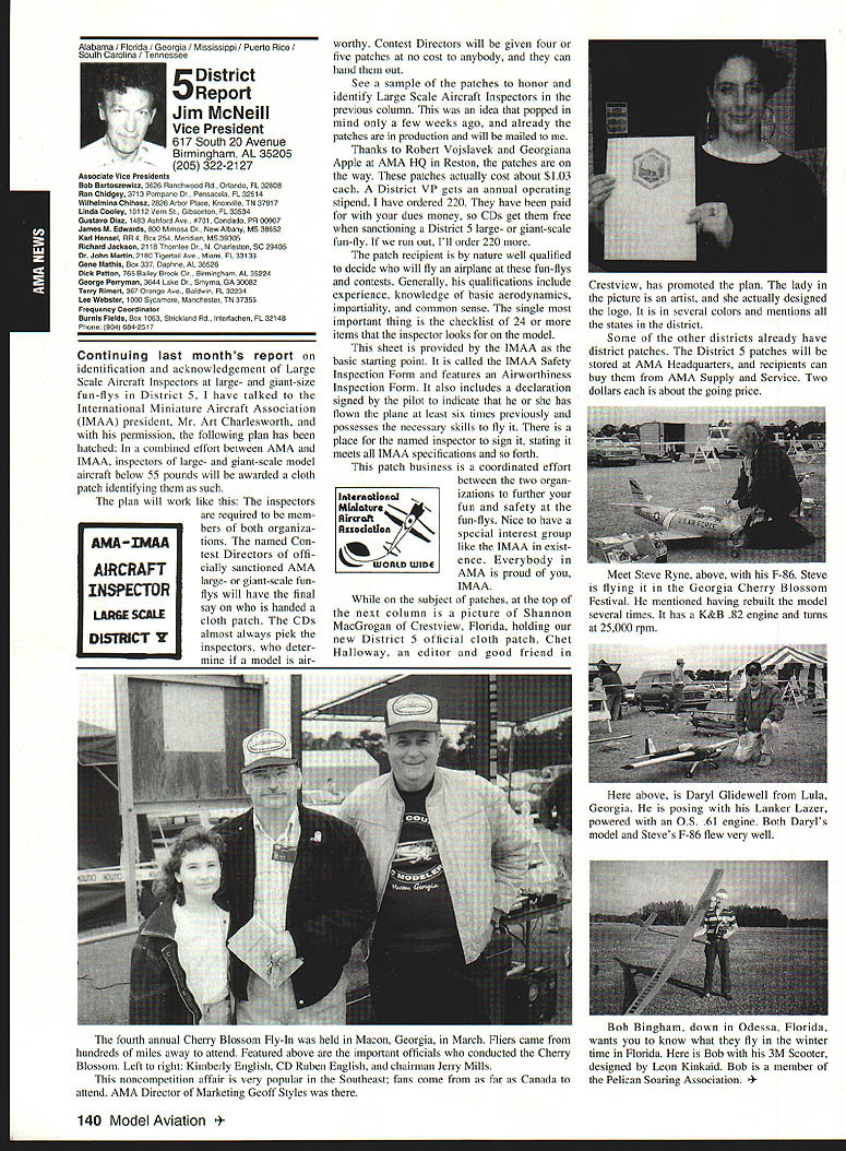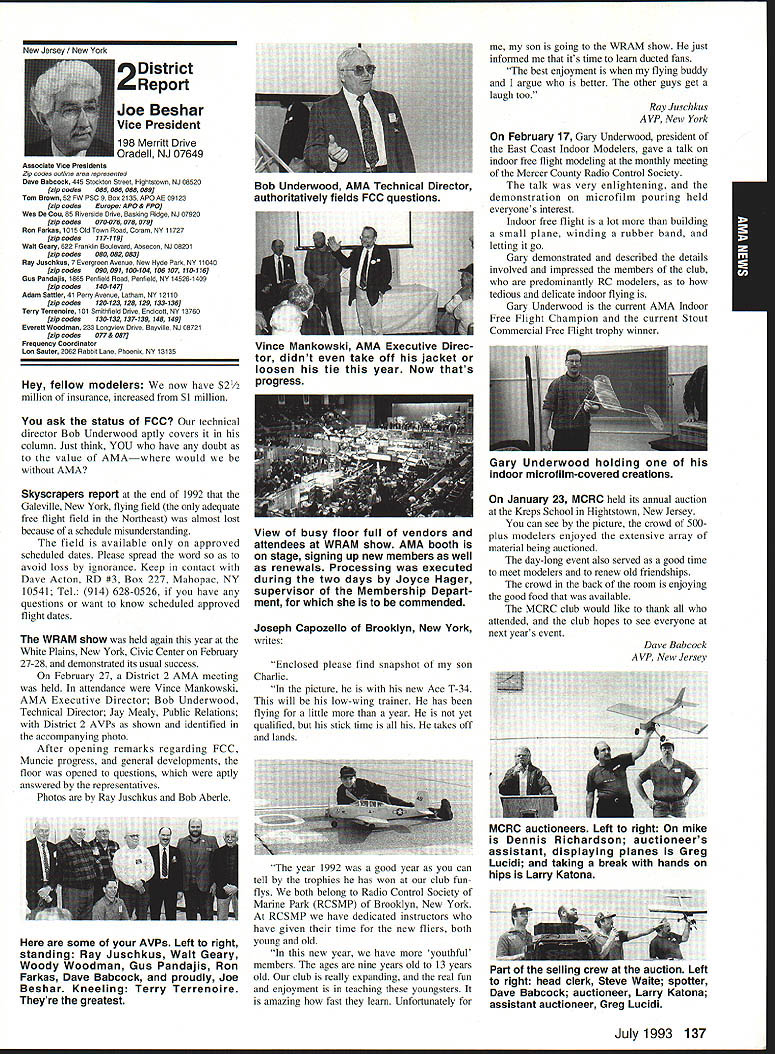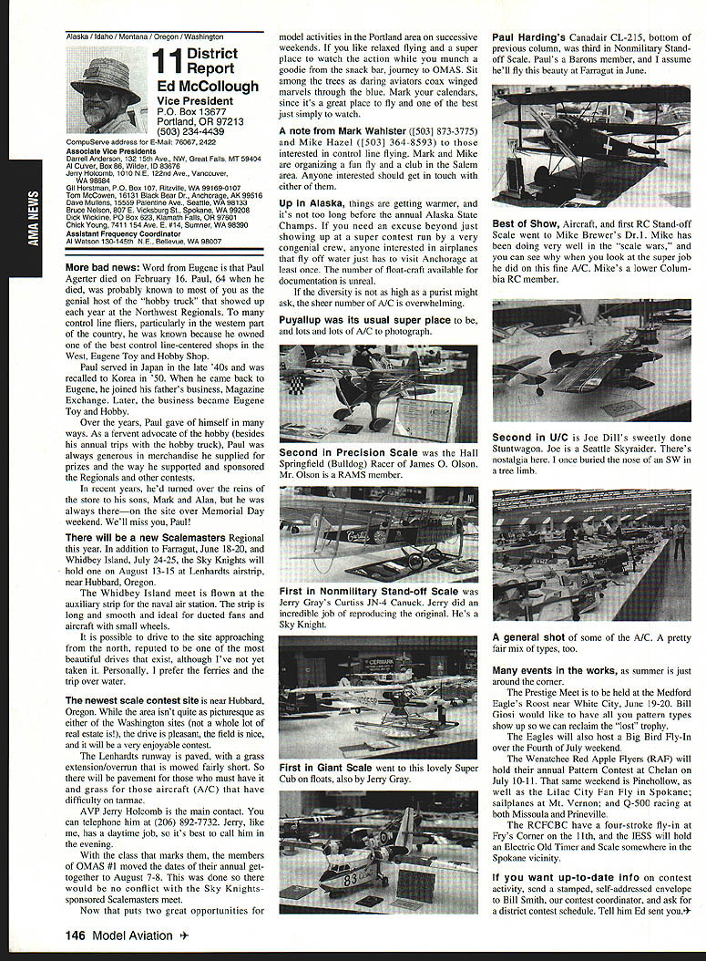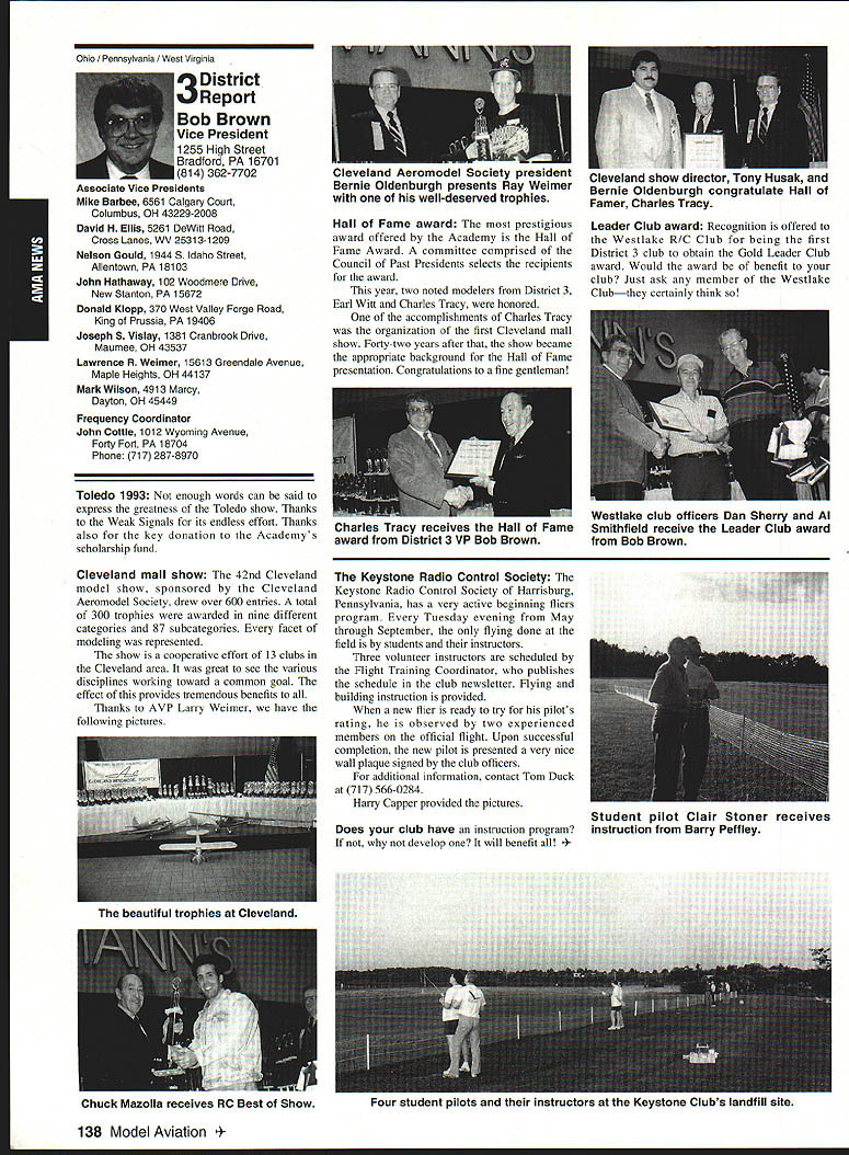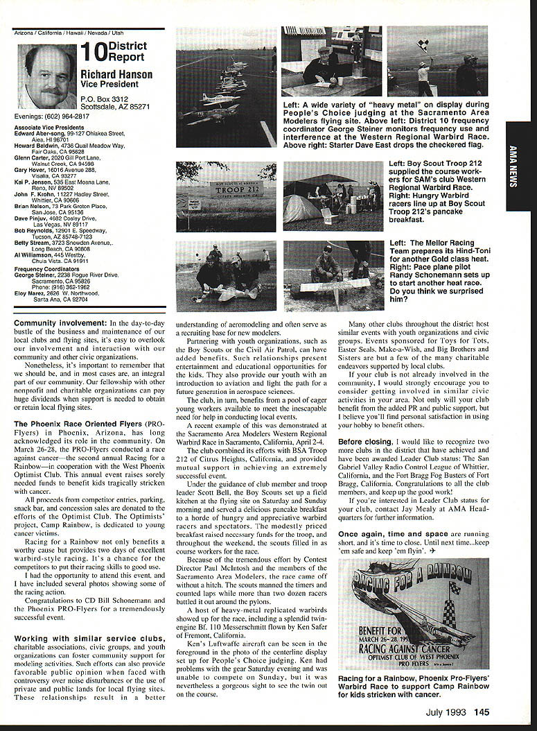 AMANews Academy Model Aeronautics 1810 Samuel Morse Drive Reston VA 22090 California January about July lead-in odd sometimes frustrating things about writing magazines lead time120 days less start date publication Add factor lot job-related travel time extended few months Thats ease right now March 11993 write above reasons wont read until after midyear may spent month California Jan uary-February year main purpose visit examine flying site situation Mile Square Park old marine base plus visit clubs legislators educators manufac turers inspect field conditions nations populous state meet talk club officers members get handle AMA perceived 2500 miles Reston office Certainly first trip California longest stay yes did miss almost rain did see houses slid foundations canyons WOW What horrible situation poor homeowners met clubs joint meeting Mile Square Park users nine clubs plus model rocket enthusiasts represented discussed relationship between Orange County controls park users need positive image through cooperation safe prac tices ensure future flying site availability huge metropolis Ideas attract visitors mulled over such idea possibility static hobby display summer demonstrate varied uses park really Another aspect such open house would illustrate uses prop erty What pro fessions jobs family interests places community Model aviation attracts people backgrounds walks life almost socioeconomic level Overall present good cross section America Public officials ac customed seeing diversity sports group open house can help open eyes able meet Los Angeles area clubs including San Fernando Valley Flyers El Dorado Silent Flyers F Troop Orange Coast RC Club Flying Falcons RC Country Scale Squadron American Model Airport Association Chino cant thank people enough warm friendly welcome making feel home Betty Stream Associate Vice President area joined joint club meeting held Cal State-Pomona meeting arranged Eusebio Fernandez Chino club first Continued page 147 Sound & Model Aeronautics Howard Crispin Jr Toledo trade show Toledo trade show event usually attend see people possible find out what new contrivances coming along reduction sound levels New devices always appearing some good some little value something said about show up says concern Some individuals willing experiment find better methods follow get further subject questions theoretical ones sound itself rather relationship theories solutions applied miniature engines propellers Much has written through years concerning sound levels generated fullscale equipment Much useful facts remain dynamics different different solutions often needed Progress continuing although man ufacturers imported engines still have exerted little effort anything about problem difficult understand because problem certainly exclusive United States Other countries have ordinances defining acceptable limits sound levels manufacturers aftermarket equipment making progress area Quite often cottage industries results varying degrees quality manufacmred product very welcome pursuit quieter operation Continued page 147 132 Model Aviation y Villard presents Villard Cup Jim Alaback San Diego Air Space Museum Geoff Styles looks PR Roundup Geoffrey Styles Director Marketing Villard Cup first pre sented 1917 Henry Serrano Villard model airplane competition Photo James Alaback Key Dates June 3-6 Indoor NATS Johnson City Tennessee June 19 Annual Membership Meeting Muncie Indiana June 19-20 Homecoming Muncie Indiana June 26-27 IMAA Muncie Indiana July 2 Officer nominations due Headquarters July 7 Officer nomination acceptances due Headquarters July 10-11 Intercities FF Meet Muncie Indiana residents President Academy Model Aeronautics Don Lowe 902 Little Bend Road Altamonte Springs FL 32714 mighty busy year Academy As probably know already headquarters moving Muncie departments will place July year easy task fraught decisions actions involving facility setup moving personnel equipment along hiring new personnel Some headquarters staff have elected move will delays because will interviewing hiring significant number new people will take time train asking patience during process intend best meet important needs AMA will maintain office presence Reston person Geoffrey Styles will work out Reston area will away office much time helping clubs flying site retention acquisition club support roles has already spent considerable time California area Southeast club support massive importance Geoff man full-time effort setup Muncie initially will use part existing museum building office space permanent office facility will added following sale AMAs building Reston less expensive keep up facility Muncie site improvement continues number events scheduled year second gathering Muncie will June Homecoming strongly encourage can take part will multifaceted event lots model flying rocket demos competition kite flying street rod show much Yall come Well return Lawrenceville year National Aeromodeling Championships indications great event fall AMA will host Free Flight World Championships Lost Hills California technical side line educational charter AMA becoming involved technical side hobby growth aeromodeling has brought about special challenges AMA know has deeply involved frequency acquisition will continue push back frontiers model radio activities cooperation model industry have helped establish requirements performed experiments general learned what necessary allow quality operation todays difficult electromagnetic environment Continued page 134 July1993 133 JPX turbojet engine mocked up F-16 model fuselage aft end Exhaust gas temperature being measured determine effect installation Aluminum liner installed aft fuselage small fire start partially melted liner blew out aft end thermocoupled temperature measurement Note starter hose left ignition module right engine very careful methodical modeler Presidents Corner Continued page 133 response FCCs recent move slice spectrum narrower bits con