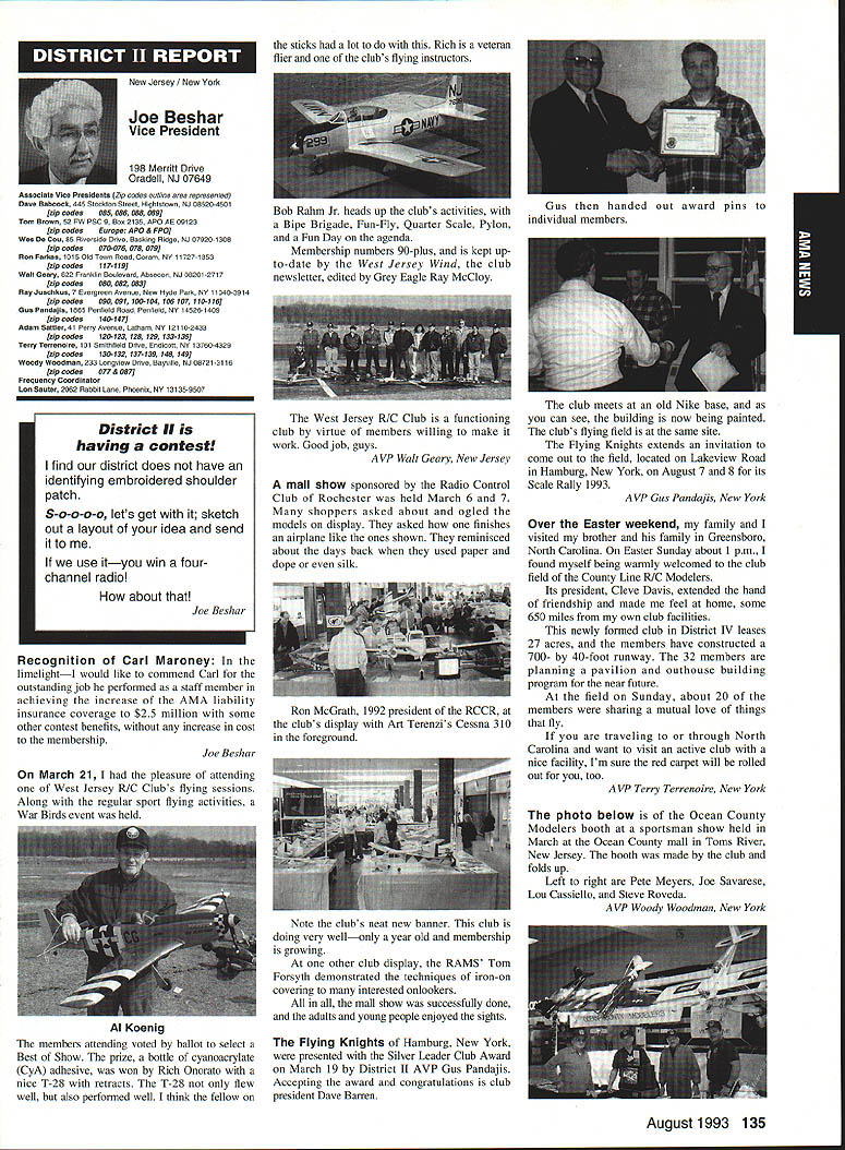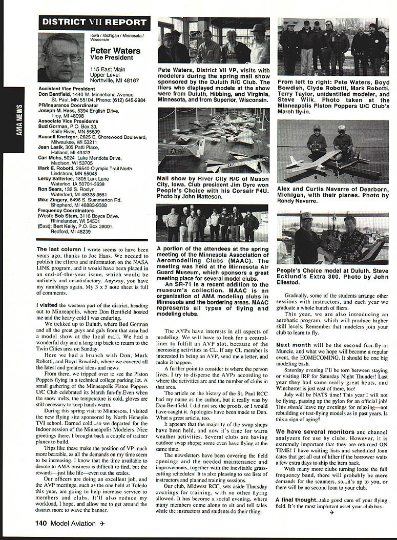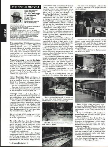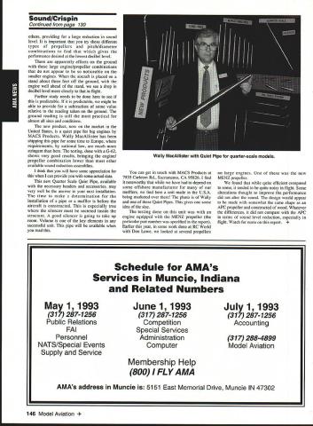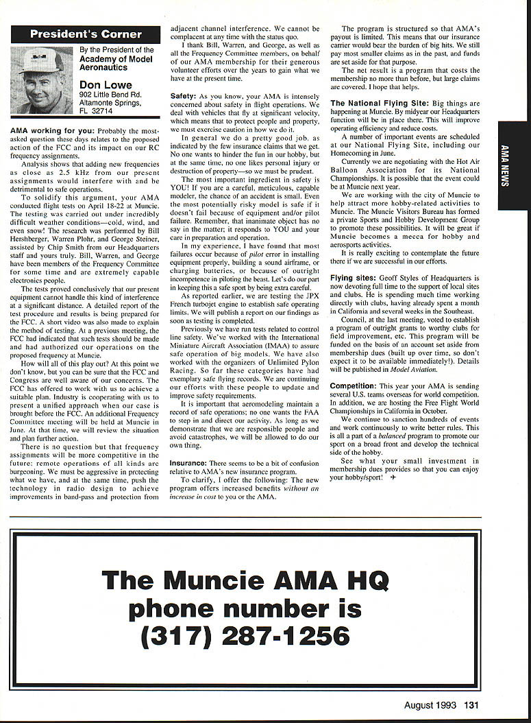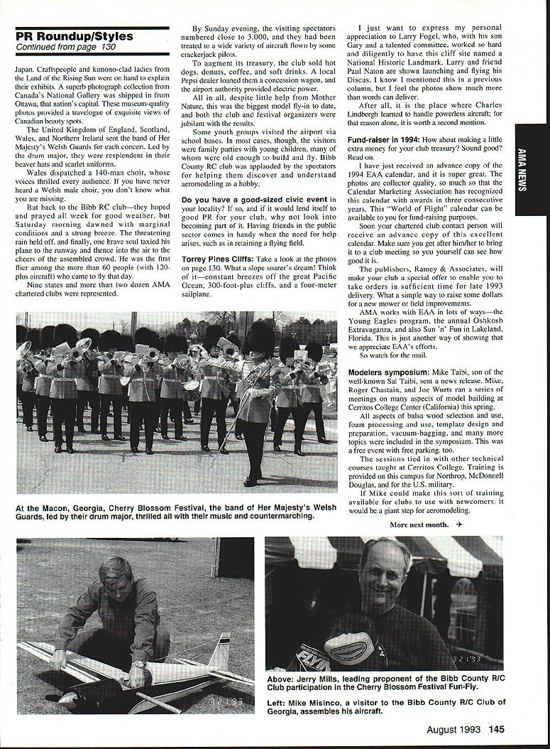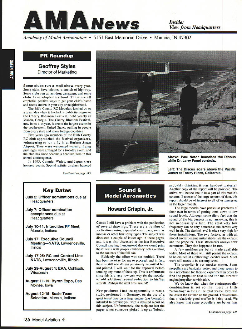 A News Academy Model Aeronautics East Memorial Drive ie IN 47302 Some clubs run mall show year Some clubs have adopted stretch highway Some clubs run antidrug campaign some clubs have adopted school emphatic positive ways get clubs name needs known city neighborhood Bibb County RC Modelers latched great idea hitched its publicity wagon Cherry Blossom Festival held yearly Macon Georgia Cherry Blossom Festival now its 11th year largest events southeastem United States pulling people state foreign countries Five years ago members Bibb County RC club approached festival organizers volunteering run fly-in Herbert Smart Airport welcomed warmly flying privileges arranged two-day event club has since become headline item annual extravaganza 1993 Canada Wales Japan honored guests Special artistic displays honored Continued page 145 Cans I still have problem publication several drawings number applications using expended small cans such mousse other hair spray types subject discussed couple issues ago pages also discussed last Executive Council meeting understood would print items proper cautionary notes relating contents full can Evidently editor notified has no okay proceed fact still design previously submitted printed will wait approval before sending up unfortunate since very low-cost way modeler add additional sound reduction his/her aircraft Perhaps next time around New products opportunity read study performed Germany use quiet tuned pipe large engine gas bumer intended provide detailed report subject Unfortunately recipient lost paper someone picked up Toledo probably thinking handout material Another copy report will provided arrival will too late part months column Because large amount data report should interest us interested larger models large models have particular problems own terms getting down low sound levels Although some fliers feel sound big bangers annoying necessarily fact relatively low frequency can very noticeable carries very well air decibel level often very high installations two factors model aircraft engine installations exhaust propeller statements always draw comments also happen true few mufflers being made available today Most will still permit exhaust emitted rather high decibel level Much work still needs accomplished propeller yet another matter Some propellers basically noisy seems reluctance fliers experiment order find propeller best suited aircraft engine/propeller combination know engine/propeller combination set little unloading air total decibel level will less air ground assumes relatively good muffler being used also know some propellers better Continued page 146 130 Model Aviation de View Headquarters Geoffrey Styles Director Marketing Above Paul Naton launches Discus Dr Larry Fogel controls Left The Discus soars above Pacific Ocean Torrey Pines California Howard Crispin Jr Key Dates July 2 Officer nominations due Headquarters July 7 Officer nomination acceptances due Headquarters July 10-11 Intercities FF Meet Muncie Indiana July 17 Executive Council MeetingNATS Lawrenceville Illinois July 17-25 RC Control Line NATS Lawrenceville Illinois July 29-August 4 EAA Oshkosh Wisconsin August 11-15 Byron Expo Des Moines Iowa August 12-15 Scale Team Selection Muncie Indiana AMA working Probably mostasked question days relates proposed action FCC its impact RC frequency assignments Analysis shows adding new frequencies close 25 kHz present assignments would interfere detrimental safe operations solidify argument AMA conducted flight tests April 18-22 Muncie testing carried out under incredibly difficult weather conditionscold wind snow research performed Bill Hershberger Warren Plohr George Steiner assisted Chip Smith Headquarters staff yours truly Bill Warren George have members Frequency Committee some time extremely capable electronics people tests proved conclusively tat present equipment cannot handle kind interference significant distance detailed report test procedure results being prepared FCC short video also made explain method testing previous meeting FCC indicated such tests should made authorized operations proposed frequency Muncie will play out point dont know can sure FCC Congress well aware concerns FCC has offered work us achieve suitable plan Industry cooperating us present unified approach case brought before FCC An additional Frequency Committee meeting will held Muncie June time will review situation plan further action no question frequency assignments will competitive future remote operations kinds burgeoning must aggressive protecting what have same time push technology radio design achieve improvements band-pass protection adjacent channel interference cannot complacent time status quo thank Bill Warren George well Frequency Committee members behalf AMA membership generous volunteer efforts over years gain what have present time Safety As know AMA intensely concerned about safety flight operations deal vehicles fly significant velocity means protect people property must exercise caution general pretty good job indicated few insurance claims get No wants hinder fun hobby same time no likes personal injury destruction propertyso must prudent important ingredient safety YOU careful meticulous capable modeler chance accident small potentially risky model safe doesnt fail because equipment and/or pilot failure Remember inanimate object has no say matter responds YOU care preparation operation experience have found failures occur because pilot error installing equipment properly building sound airframe charging batteries because outright incompetence piloting beast Lets part keeping safe sport being extra careful As reported earlier testing JPX French turbojet engine establish safe operating limits will publish report findings soon testing completed Previously have run tests related control line safety Weve worked Insemational Miniature Aircraft Association IMAA assure safe operation big models have also worked organizers Unlimited Pylon R