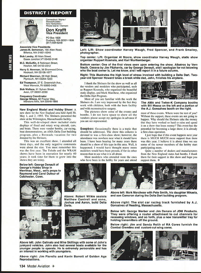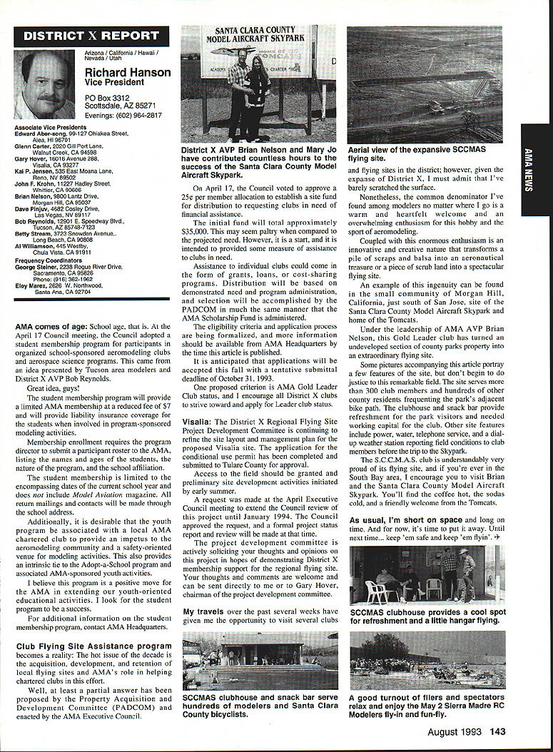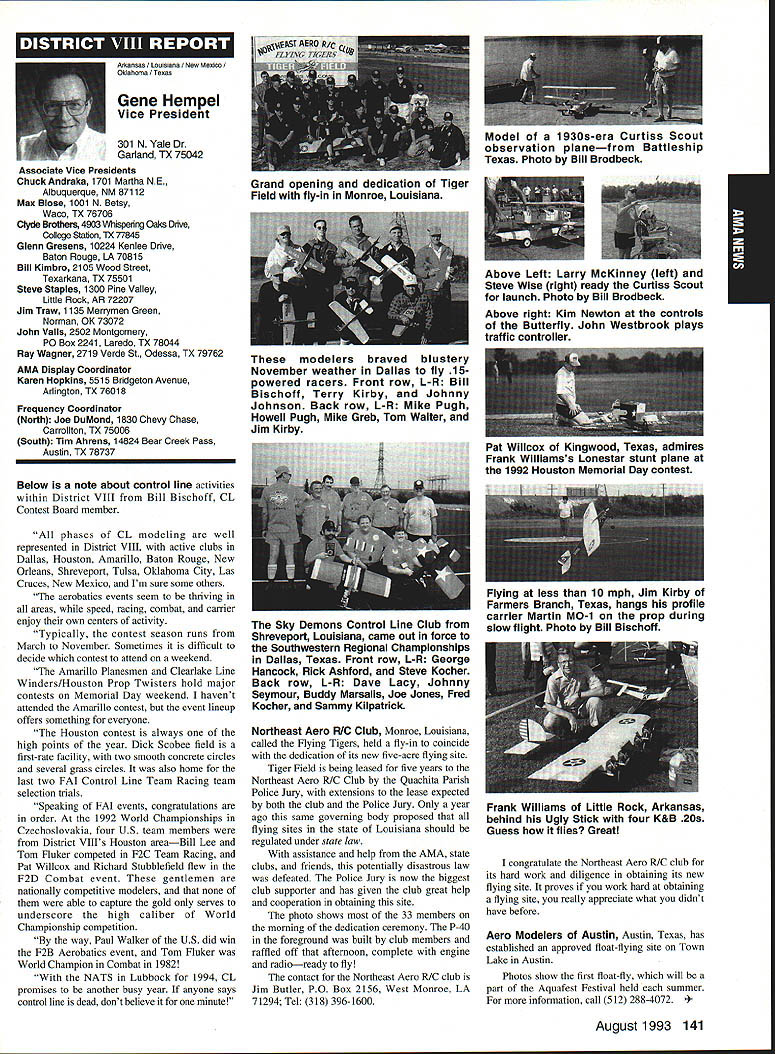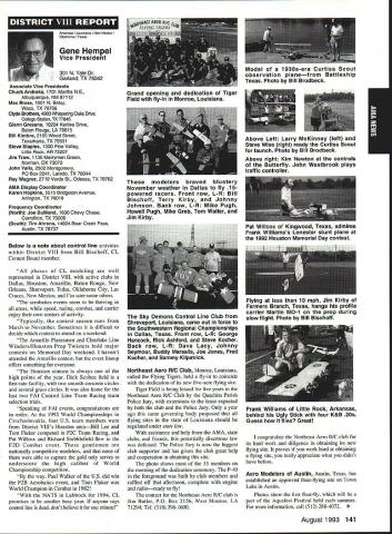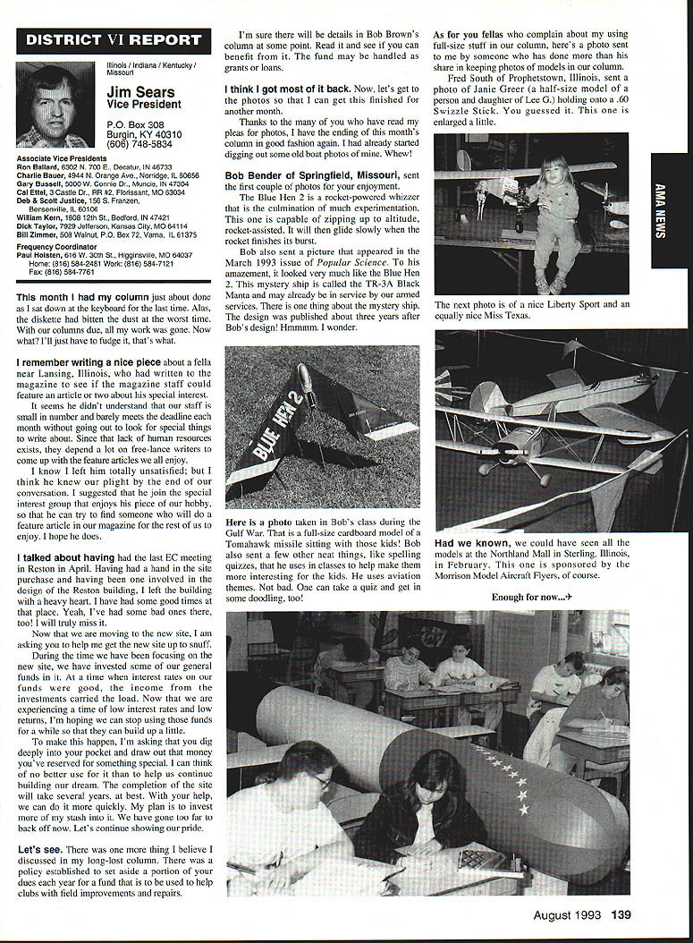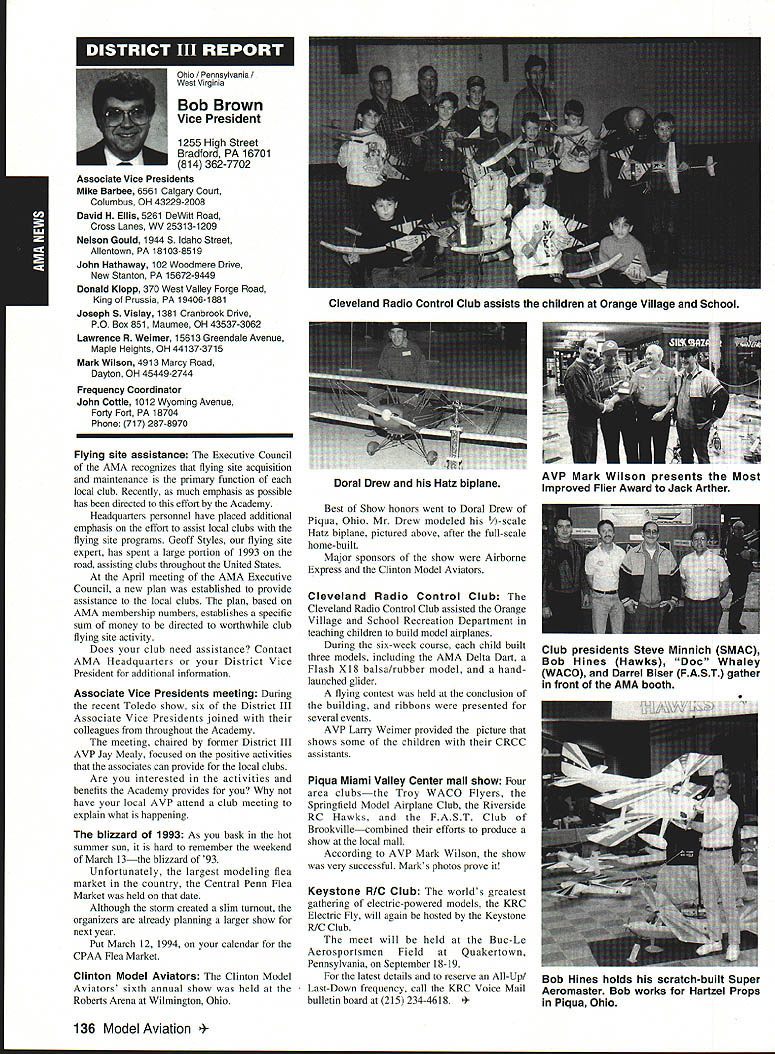 A News Academy Model Aeronautics East Memorial Drive ie IN 47302 Some clubs run mall show year Some clubs have adopted stretch highway Some clubs run antidrug campaign some clubs have adopted school emphatic positive ways get clubs name needs known city neighborhood Bibb County RC Modelers latched great idea hitched its publicity wagon Cherry Blossom Festival held yearly Macon Georgia Cherry Blossom Festival now its 11th year largest events southeastem United States pulling people state foreign countries Five years ago members Bibb County RC club approached festival organizers volunteering run fly-in Herbert Smart Airport welcomed warmly flying privileges arranged two-day event club has since become headline item annual extravaganza 1993 Canada Wales Japan honored guests Special artistic displays honored Continued page 145 Cans I still have problem publication several drawings number applications using expended small cans such mousse other hair spray types subject discussed couple issues ago pages also discussed last Executive Council meeting understood would print items proper cautionary notes relating contents full can Evidently editor notified has no okay proceed fact still design previously submitted printed will wait approval before sending up unfortunate since very low-cost way modeler add additional sound reduction his/her aircraft Perhaps next time around New products opportunity read study performed Germany use quiet tuned pipe large engine gas bumer intended provide detailed report subject Unfortunately recipient lost paper someone picked up Toledo probably thinking handout material Another copy report will provided arrival will too late part months column Because large amount data report should interest us interested larger models large models have particular problems own terms getting down low sound levels Although some fliers feel sound big bangers annoying necessarily fact relatively low frequency can very noticeable carries very well air decibel level often very high installations two factors model aircraft engine installations exhaust propeller statements always draw comments also happen true few mufflers being made available today Most will still permit exhaust emitted rather high decibel level Much work still needs accomplished propeller yet another matter Some propellers basically noisy seems reluctance fliers experiment order find propeller best suited aircraft engine/propeller combination know engine/propeller combination set little unloading air total decibel level will less air ground assumes relatively good muffler being used also know some propellers better Continued page 146 130 Model Aviation de View Headquarters Geoffrey Styles Director Marketing Above Paul Naton launches Discus Dr Larry Fogel controls Left The Discus soars above Pacific Ocean Torrey Pines California Howard Crispin Jr Key Dates July 2 Officer nominations due Headquarters July 7 Officer nomination acceptances due Headquarters July 10-11 Intercities FF Meet Muncie Indiana July 17 Executive Council MeetingNATS Lawrenceville Illinois July 17-25 RC Control Line NATS Lawrenceville Illinois July 29-August 4 EAA Oshkosh Wisconsin August 11-15 Byron Expo Des Moines Iowa August 12-15 Scale Team Selection Muncie Indiana AMA working Probably mostasked question days relates proposed action FCC its impact RC frequency assignments Analysis shows adding new frequencies close 25 kHz present assignments would interfere detrimental safe operations solidify argument AMA conducted flight tests April 18-22 Muncie testing carried out under incredibly difficult weather conditionscold wind snow research performed Bill Hershberger Warren Plohr George Steiner assisted Chip Smith Headquarters staff yours truly Bill Warren George have members Frequency Committee some time extremely capable electronics people tests proved conclusively tat present equipment cannot handle kind interference significant distance detailed report test procedure results being prepared FCC short video also made explain method testing previous meeting FCC indicated such tests should made authorized operations proposed frequency Muncie will play out point dont know can sure FCC Congress well aware concerns FCC has offered work us achieve suitable plan Industry cooperating us present unified approach case brought before FCC An additional Frequency Committee meeting will held Muncie June time will review situation plan further action no question frequency assignments will competitive future remote operations kinds burgeoning must aggressive protecting what have same time push technology radio design achieve improvements band-pass protection adjacent channel interference cannot complacent time status quo thank Bill Warren George well Frequency Committee members behalf AMA membership generous volunteer efforts over years gain what have present time Safety As know AMA intensely concerned about safety flight operations deal vehicles fly significant velocity means protect people property must exercise caution general pretty good job indicated few insurance claims get No wants hinder fun hobby same time no likes personal injury destruction propertyso must prudent important ingredient safety YOU careful meticulous capable modeler chance accident small potentially risky model safe doesnt fail because equipment and/or pilot failure Remember inanimate object has no say matter responds YOU care preparation operation experience have found failures occur because pilot error installing equipment properly building sound airframe charging batteries because outright incompetence piloting beast Lets part keeping safe sport being extra careful As reported earlier testing JPX French turbojet engine establish safe operating limits will publish report findings soon testing completed Previously have run tests related control line safety Weve worked Insemational Miniature Aircraft Association IMAA assure safe operation big models have also worked organizers Unlimited Pylon R