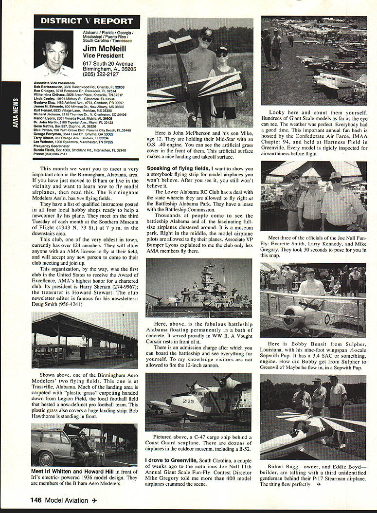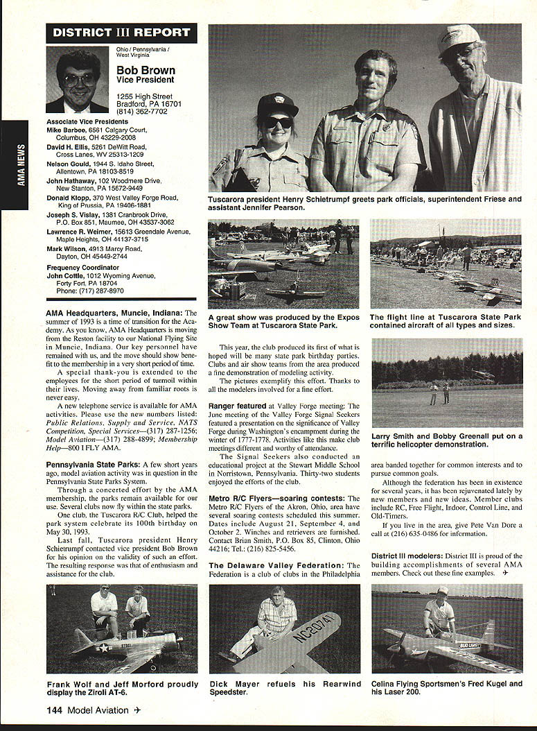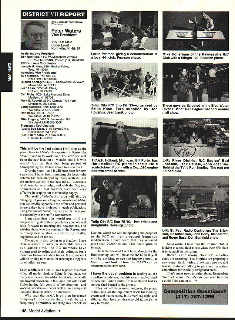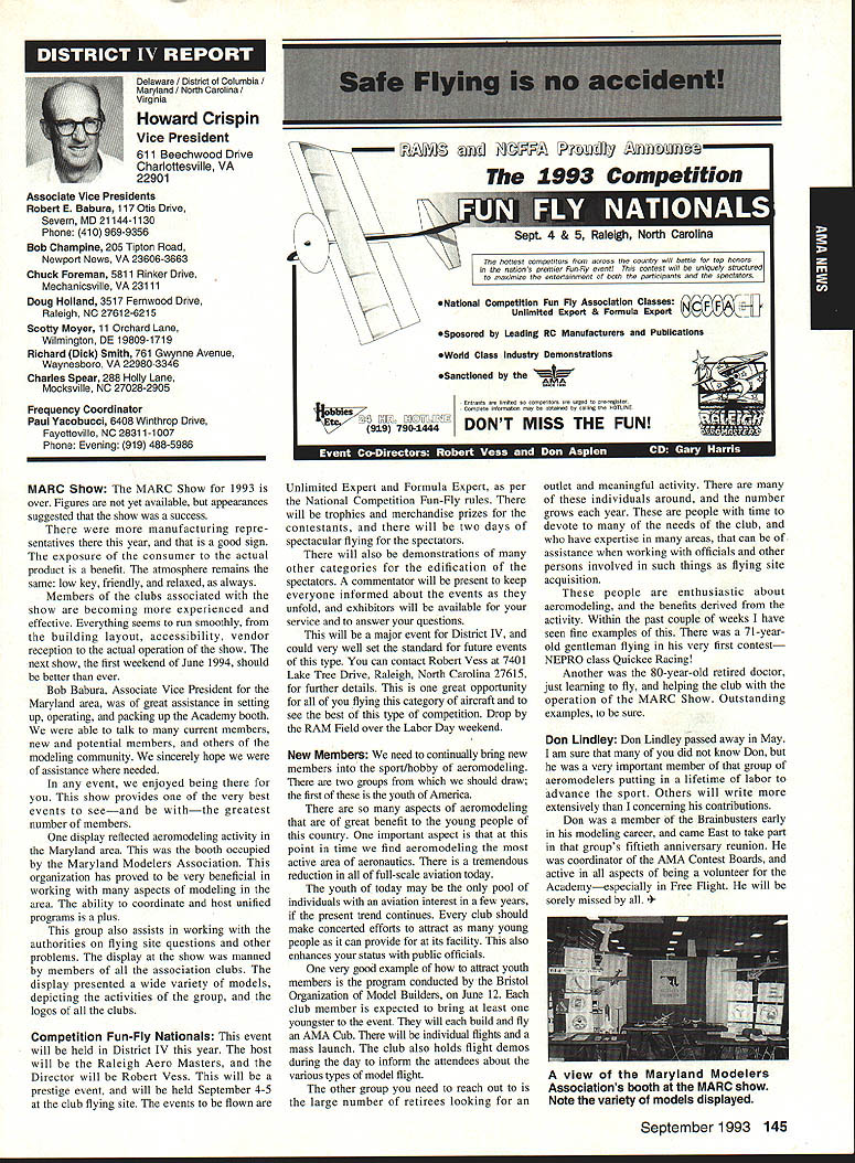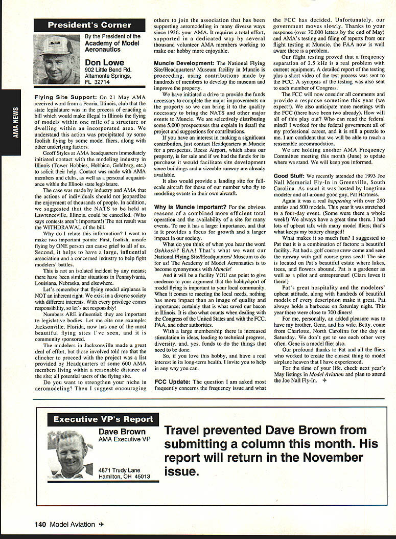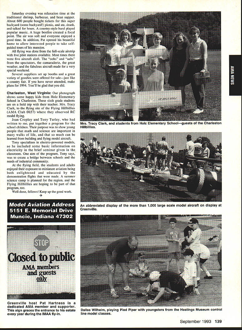 A Mews Inside View Headquarters Academy Model Aeronautics East Memorial Drive ie IN 47302 Mufflers Fox Manufacturing Company recently began production new muffler 40-45 cubic inch displacement engine 45 engine operated test Weather other factors prevented taking look until past week results very good think users engines will quite satisfied mufflers means getting sound levels down acceptable levels As usual running engine provide guide power application concerned sound suppression capabilities new muffler performs well market respect especially operated within reasonable engine speeds also did look combinations propellers engine speed engine rebuilt required breaking did run lean did look several propellers noted couple factors APC 11 x 8 tried proved bit too much prop engine Perhaps break-in would help engine turned 8900 rpmnot exactly poor performance decibel level propeller 80 very very quiet operation APC 10 x 8 will closely approach what people will expect engine needle set turn 11000 meter indicated 845 dBA would indicate engine 40 would operate site meet sound requirements does mean should operate propeller will keep propeller speed some speed approximating speed during test Another 1000 rpm would still keep down below 90 dBA Interesting factors about muffler some correspondence Duke Fox some years ago AMA has arrived photos historic move Muncie see page 141 Vince Mankowskis report Hastings Nebraska RC Model Club Hastings Nebraska has organized program young people its effort counteract often-heard complaint enough young people sport summer 1992 classes held Hastings Museum children aged nine 12 Overall 21 youngsters taught build fly 049-size control line planes So kids interested club hold morning afternoon classes Using materials donated club members plans club-made kits engines hardware kept costs reasonable level Club members plan repeat performance summer 1993 Sorry story will appear little late help year better late never letter signed Dallas Wilhelm Jr Robert Lyons received appeal CL plans 049 19-35 old magazines would like assist energetic club heart Nebraska please send anything can part Hastings Museum c/n Joan Janzen 1330 North Burlington Avenue Hastings NE 68901 Thank Greenville South Carolina glorious events year has Joe Nall Memorial Fly-In May 13-16 1993 held estate Pat Hartness Greenville South Carolina Joe Nail Federal Aviation Administration FAA executive killed plane crash near Caracas Venezuela some years ago Eleventh Annual Giant Scale Fly-In sponsored IMAA open IMAAIAMA members keeps memory well-respected wellloved man alive Pat Hartness AMA member successful businessman opened 300-acre estate again year AMA members families 5500 people passed through gates 000 airplanes graced pit areas runway skies 300 pilots showed off skills truly beautiful array Giant Scale models Several full-scale airplanes flown parked viewing Hartoess owns PT-17 J-3 Cub Ken Peppard old friend FAA Washington flew Jim Davis retired FAA Warrenton Virginia Jims Cessna 172 Jim Rhyne veteran spent much service Far East came Pilatus Porter also received visit AV-6 home-built pilot didnt introduce himself Contest Director Mike Gregory Green ville Kirby McKinney Reuben Byrd designated IMAA spokesmen volunteers numbered dozens ably assisted employees Hartness International worked butts off four days Mother Nature cooperated provided great Thursday interrupted rain high winds around 3 pm Friday Saturday Sunday terrific days weatherwise apart few pilots wrote off airplane everyone great time flying 138 Model Aviation rd Crispin Jr Five moving vans arrived AMA-Muncie morning June 10 photos AMAs move page 141 Geoffrey Styles Director Marketing Continued page 153 Jack Sheekss CL version name plane modelsoon construction article feature Saturday evening relaxation time traditional shrimp barbecue bean supper About 600 people bought tickets super backyard some backyard picnic ate drank talked hours country-style band played popular music huge bonfire created focal point air soft everyone enjoyed good time addition Pat opened beautiful home allow interested people take selfguided tours mansion flying done full-scale airstrip five pilot stations available Most times five aircraft aloft oohs aahs spectators camaraderie great weather fabulous aircraft made very special weekend Several suppliers set up booths great variety goodies offered salejust like country fair have never attended make plans 1994 Youll glad did Charleston West Virginia photograph shows some happy kids Holz Elementary School Charleston sixth grade students field trip teacher Mrs Tracy Clark flying site Flying Hillbillies AMA Club 0657 observed RC model flying Jean Cropley Tony Turley written put together program school children purpose show young people math science important walks life much can learned building flying model aircraft Tony specializes electric-powered models included some basic information electricity brief seminar given classroom aim program Tony says create bridge between schools needs industrial community flying field students adults enjoyed exposure miniature aviation being both enlightened educated demonstration flights made summer science camp planned region Flying Hillbillies hoping part program too Well done fellows Keep up good work ember 1993 139 ~nts Holz Elementary Schoolguests Charleston An abbreviated display 1000 large scale model aircraft display Greenville Greenville host Pat Hartness dedicated AMA member supporter sign graces entrance estate year during IMAA fly-in Dallas Wilhelm playing Pied Piper youngsters Hastings Museum control line model classes Flying Site Support 21 May AMA received word Peoria Illinois club state legislature process enacting bill would make illegal illinois flying models within mile structure dwelling within incorporated area understand action precipitated some foolish flying some model fliers along other underlying factors Geoff Styles AMA headquarters immediately initiated c