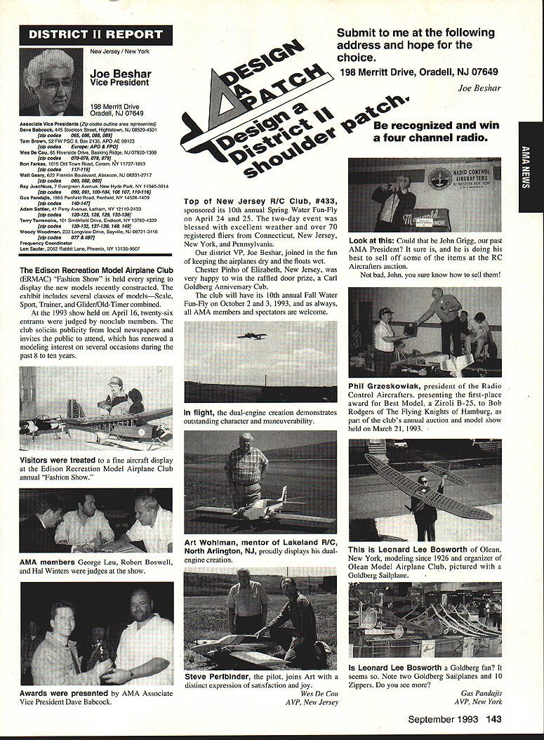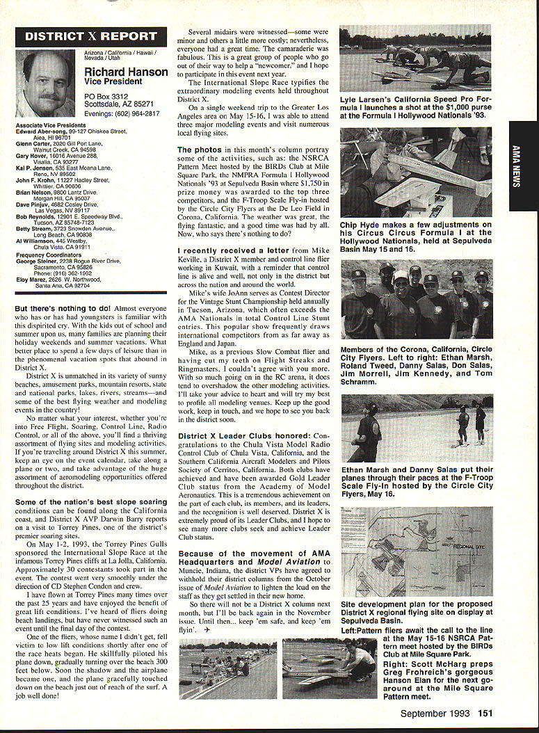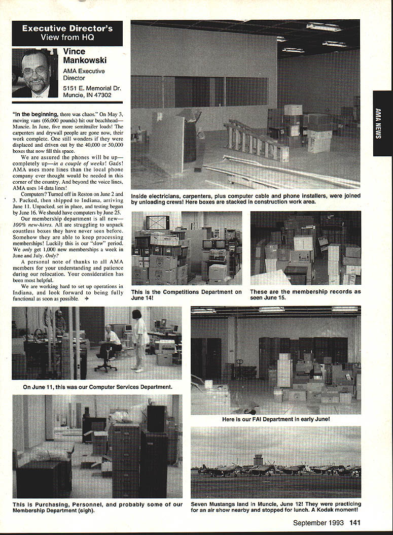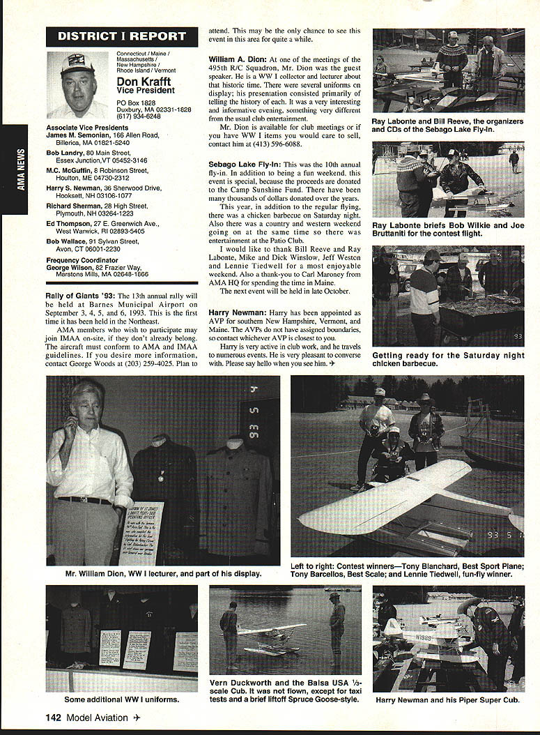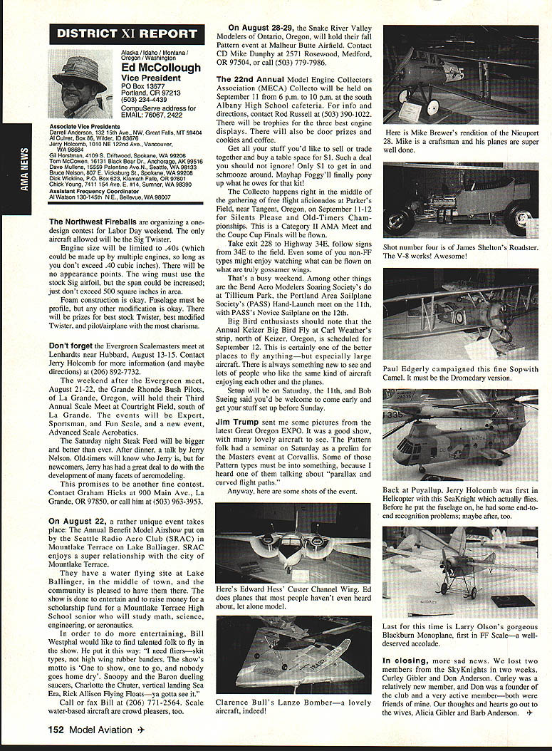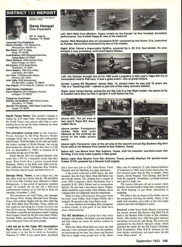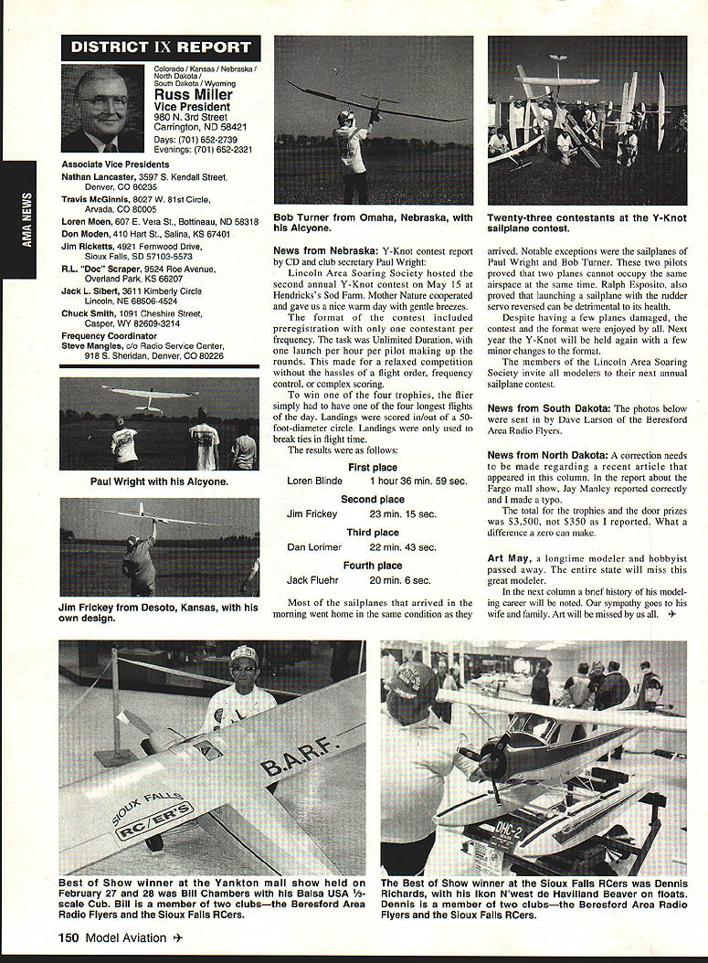 A Mews Inside View Headquarters Academy Model Aeronautics East Memorial Drive ie IN 47302 Mufflers Fox Manufacturing Company recently began production new muffler 40-45 cubic inch displacement engine 45 engine operated test Weather other factors prevented taking look until past week results very good think users engines will quite satisfied mufflers means getting sound levels down acceptable levels As usual running engine provide guide power application concerned sound suppression capabilities new muffler performs well market respect especially operated within reasonable engine speeds also did look combinations propellers engine speed engine rebuilt required breaking did run lean did look several propellers noted couple factors APC 11 x 8 tried proved bit too much prop engine Perhaps break-in would help engine turned 8900 rpmnot exactly poor performance decibel level propeller 80 very very quiet operation APC 10 x 8 will closely approach what people will expect engine needle set turn 11000 meter indicated 845 dBA would indicate engine 40 would operate site meet sound requirements does mean should operate propeller will keep propeller speed some speed approximating speed during test Another 1000 rpm would still keep down below 90 dBA Interesting factors about muffler some correspondence Duke Fox some years ago AMA has arrived photos historic move Muncie see page 141 Vince Mankowskis report Hastings Nebraska RC Model Club Hastings Nebraska has organized program young people its effort counteract often-heard complaint enough young people sport summer 1992 classes held Hastings Museum children aged nine 12 Overall 21 youngsters taught build fly 049-size control line planes So kids interested club hold morning afternoon classes Using materials donated club members plans club-made kits engines hardware kept costs reasonable level Club members plan repeat performance summer 1993 Sorry story will appear little late help year better late never letter signed Dallas Wilhelm Jr Robert Lyons received appeal CL plans 049 19-35 old magazines would like assist energetic club heart Nebraska please send anything can part Hastings Museum c/n Joan Janzen 1330 North Burlington Avenue Hastings NE 68901 Thank Greenville South Carolina glorious events year has Joe Nall Memorial Fly-In May 13-16 1993 held estate Pat Hartness Greenville South Carolina Joe Nail Federal Aviation Administration FAA executive killed plane crash near Caracas Venezuela some years ago Eleventh Annual Giant Scale Fly-In sponsored IMAA open IMAAIAMA members keeps memory well-respected wellloved man alive Pat Hartness AMA member successful businessman opened 300-acre estate again year AMA members families 5500 people passed through gates 000 airplanes graced pit areas runway skies 300 pilots showed off skills truly beautiful array Giant Scale models Several full-scale airplanes flown parked viewing Hartoess owns PT-17 J-3 Cub Ken Peppard old friend FAA Washington flew Jim Davis retired FAA Warrenton Virginia Jims Cessna 172 Jim Rhyne veteran spent much service Far East came Pilatus Porter also received visit AV-6 home-built pilot didnt introduce himself Contest Director Mike Gregory Green ville Kirby McKinney Reuben Byrd designated IMAA spokesmen volunteers numbered dozens ably assisted employees Hartness International worked butts off four days Mother Nature cooperated provided great Thursday interrupted rain high winds around 3 pm Friday Saturday Sunday terrific days weatherwise apart few pilots wrote off airplane everyone great time flying 138 Model Aviation rd Crispin Jr Five moving vans arrived AMA-Muncie morning June 10 photos AMAs move page 141 Geoffrey Styles Director Marketing Continued page 153 Jack Sheekss CL version name plane modelsoon construction article feature Saturday evening relaxation time traditional shrimp barbecue bean supper About 600 people bought tickets super backyard some backyard picnic ate drank talked hours country-style band played popular music huge bonfire created focal point air soft everyone enjoyed good time addition Pat opened beautiful home allow interested people take selfguided tours mansion flying done full-scale airstrip five pilot stations available Most times five aircraft aloft oohs aahs spectators camaraderie great weather fabulous aircraft made very special weekend Several suppliers set up booths great variety goodies offered salejust like country fair have never attended make plans 1994 Youll glad did Charleston West Virginia photograph shows some happy kids Holz Elementary School Charleston sixth grade students field trip teacher Mrs Tracy Clark flying site Flying Hillbillies AMA Club 0657 observed RC model flying Jean Cropley Tony Turley written put together program school children purpose show young people math science important walks life much can learned building flying model aircraft Tony specializes electric-powered models included some basic information electricity brief seminar given classroom aim program Tony says create bridge between schools needs industrial community flying field students adults enjoyed exposure miniature aviation being both enlightened educated demonstration flights made summer science camp planned region Flying Hillbillies hoping part program too Well done fellows Keep up good work ember 1993 139 ~nts Holz Elementary Schoolguests Charleston An abbreviated display 1000 large scale model aircraft display Greenville Greenville host Pat Hartness dedicated AMA member supporter sign graces entrance estate year during IMAA fly-in Dallas Wilhelm playing Pied Piper youngsters Hastings Museum control line model classes Flying Site Support 21 May AMA received word Peoria Illinois club state legislature process enacting bill would make illegal illinois flying models within mile structure dwelling within incorporated area understand action precipitated some foolish flying some model fliers along other underlying factors Geoff Styles AMA headquarters immediately initiated c