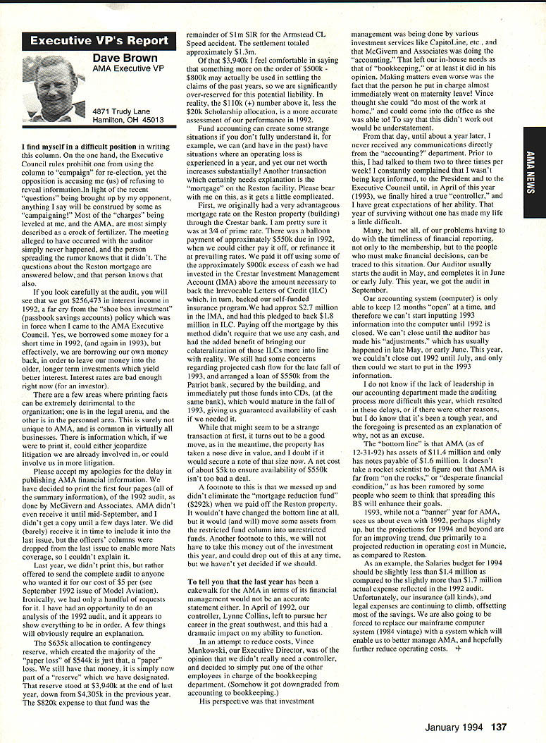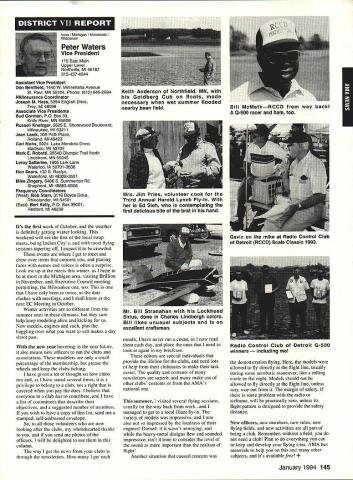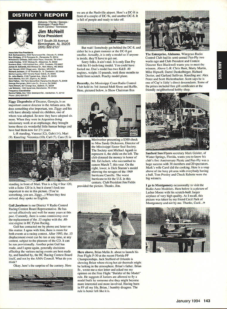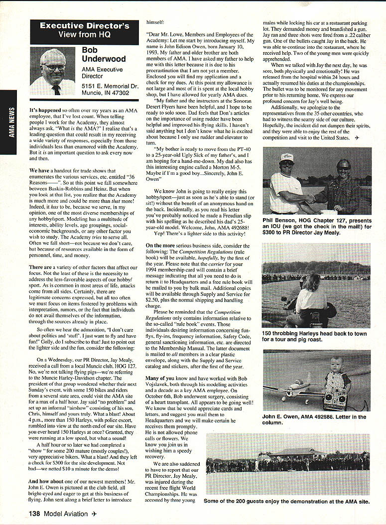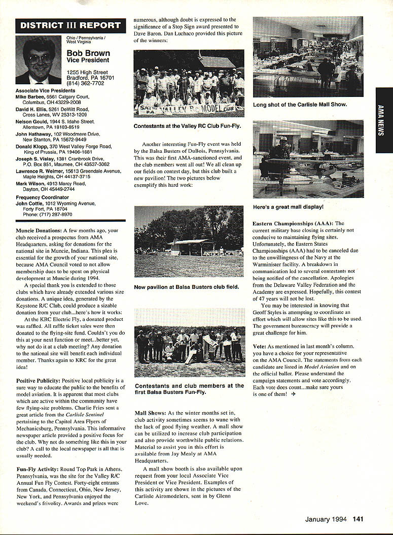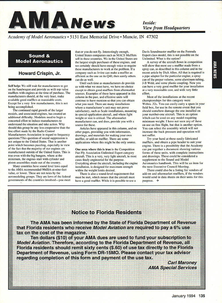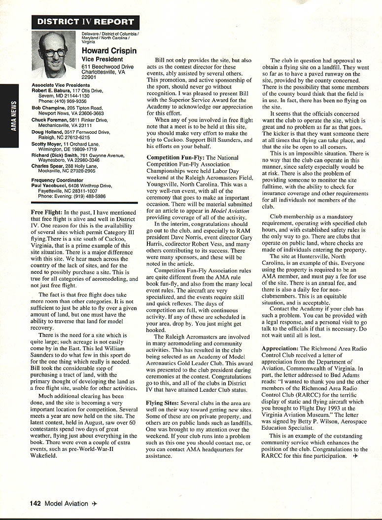 ANews Academy Model Aeronautics East Memorial Drive ie IN 47302 Self help still wait manufacturers get bandwagoo provide us top value mufflers engines time purchase manufacturers should very least make available good mufflers reasonable costs Except very few manufacturers being accomplished continued rapid growth larger models associated engines has created additional difficulty Modelers need begin concerted effort induce manufacturers understand situation take action should group less cooperative fine effort made Radio control Manufacturers Association regard frequency questionsThis question sound suppression unique United States another point becomes puzzling especially view fact majority engines manufactured outside United States true big bangers minimum engines start cylinder piston assemblies made out country countries have sound level laws equal AMA recommended 9OdBA-at-nine-feet value lower rules aeromodeling groups laws federal goveruments countries involvedyou meet fly Interestingly enough United States companies such MACS Mufflers sell countries United States largest single purchaser engines certainly should have enough voice require manufacturers work problem company such Irvine can make muffler efficient its Q40 surely others can well Until such time manufacturers provide us what must have have no choice except obtain good mufflers aftermarket sources Examples have appeared column past effective units will continue have mention can obtain what need installations manufacturers unit may prove satisfactory such Scale installations mounting special-application aircraft light weight size critical aftermarket manufacturer can does provide source Articles have appeared column other pages providing information drawings materials making own muffler add-on muffler some applications might source area true Competition Fun Fly Association Unlimited Expert category aircraft very very light aircraft cases finely engineered purpose Everything about aircraft including engine installation designed maximum strength within weight limits desired also sound-level requirement must met means aircraft must have good muffler possible use Davis Soundmaster muffler Formula Expert class model possible Unlimited What option survey aircraft flown competition will show use muffler made spray can described column recent article Dick Allen required pipe adapter particular engine spray can proper volume some aluminum tubing J-B Weld some plastic coupling Now can have very good muffler installation very reasonable cost very little effort Most installations recent championships category Webra 32s can easily carry spare field box use remote event should somehow damage installed number-one aircraft option can used model requiring minimum weight have seen use free flight another option can select assembly will increase back pressure operation will suffer Try hand easily fabricated mufflers obtain pipe header suit engine possibility Academy can put together document showing various forms units complete instructions drawings could considered supplement Sound Model Aeronautics handbook will item next Executive Council Meeting could also listing vendors add-on aftermarket mufflers vendors would send data sheets units purpose 4January1994 135 Inside View Headquarters Howard Crispin Jr S President Academy Model Aeronautics Don Lowe 902 Little Bend Rd Altamonte Springs FL 32714 Communications have recently accused some AMA failing communicate becoming secret society nature AMAs business organization such members have voice what difficulty providing mechanism allows everyone wants heard heard order meet need AMA organized form representative democracy Since possible assemble member place time choose representatives speak us Essentially function very much like Congress United States major difference nominations representatives comes directly membership large will first agree communication membership involvement total process important Thats function Most s business performed volunteers several thousand contribute some way process surely aware Council VP AVP Leader member arrangement must also aware contest boards multitudinous conmiittees contest directors etc part process AMA gives away over $80000 year worth free memberships help some way also must aware Model Aviation magazine National Newsletter district newsletters Cloud 9 publication etc also used inform members AMA Headquarters also fields thousands calls members has two FAX machines always has 1-800 numbers available members inquiries district holds district meetings hold national membership meeting year hold AVP meetings trade shows write thousands letters constituents spite accused some being secretive No circulate council agenda before meetings hold plebiscites conduct surveys once year publish minutes council meetings make financial records available anyone legitimate need have published financial statements years will see another soon ModelAviation have made current event videos give clubs VPs AVPs attend shows club meetings events much possible interface membership VP has budget help 12 VPs 100 AVPs provided CompuServe send Geoff Styles road constantly meet clubs help solve site problems have substantial PR budget tell world about aeromodeling have same problem Congress US has communicate very best ability make enlightened judgement get will never make everyone happy whole feel pretty darn good job yes now get little bit irritated people say dont communicate realize member has right voice opinion also realize vast majority could care less concemed about flying models having fun vocal minority want heard listen use input make judgement hope will best anyone has magic formula welding needs 170000 members responsive association would like hear Members may heard Council sessions am very formal person interest getting job done has never instance am aware member present Council meeting allowed voice opinions have always invited comment obvious interest subject under