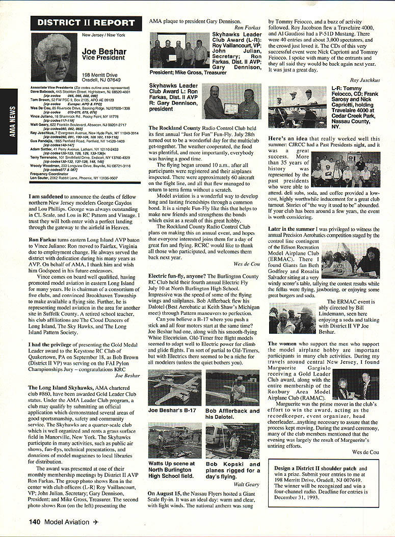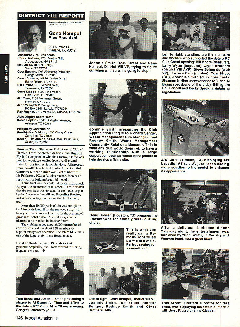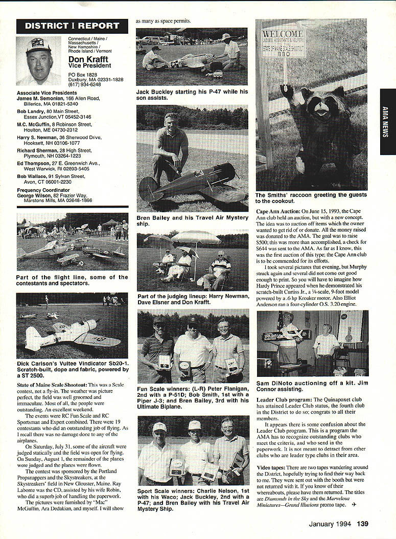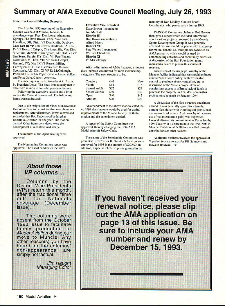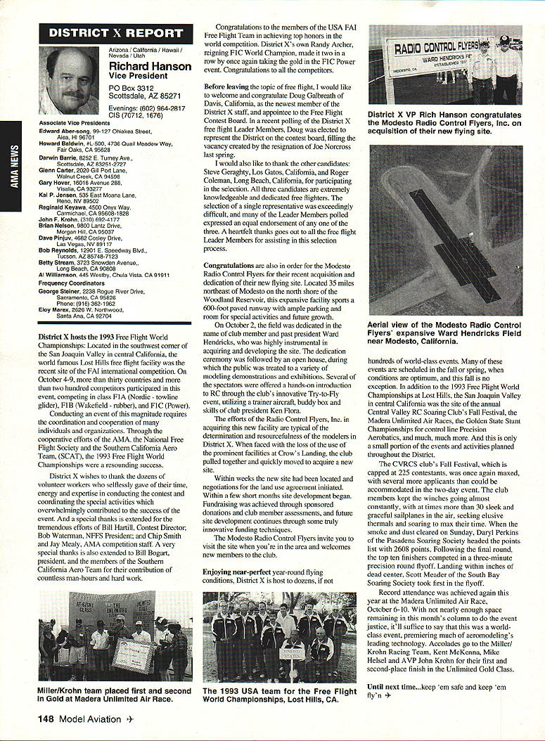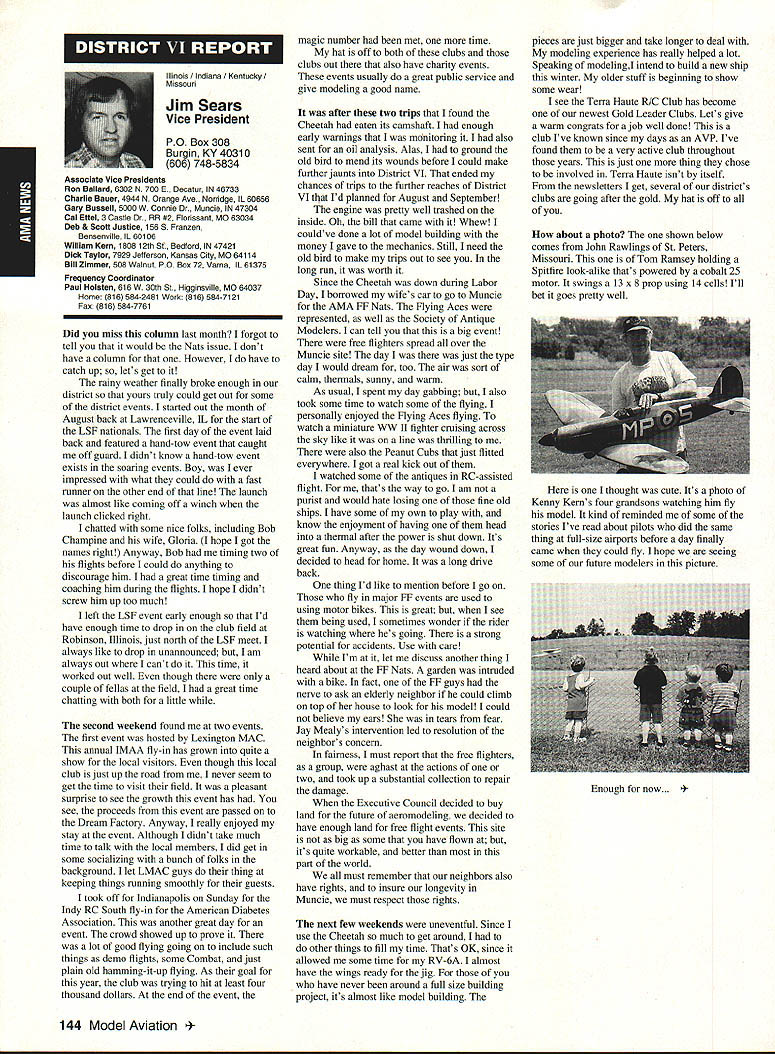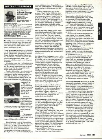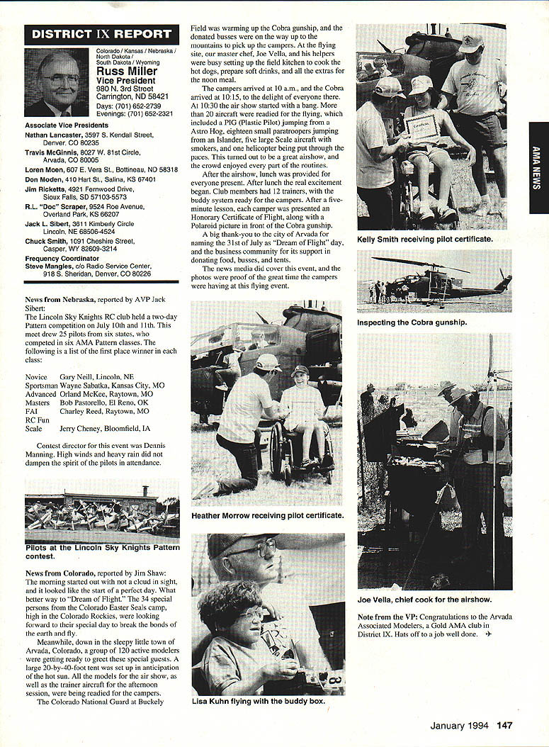 ANews Academy Model Aeronautics East Memorial Drive ie IN 47302 Self help still wait manufacturers get bandwagoo provide us top value mufflers engines time purchase manufacturers should very least make available good mufflers reasonable costs Except very few manufacturers being accomplished continued rapid growth larger models associated engines has created additional difficulty Modelers need begin concerted effort induce manufacturers understand situation take action should group less cooperative fine effort made Radio control Manufacturers Association regard frequency questionsThis question sound suppression unique United States another point becomes puzzling especially view fact majority engines manufactured outside United States true big bangers minimum engines start cylinder piston assemblies made out country countries have sound level laws equal AMA recommended 9OdBA-at-nine-feet value lower rules aeromodeling groups laws federal goveruments countries involvedyou meet fly Interestingly enough United States companies such MACS Mufflers sell countries United States largest single purchaser engines certainly should have enough voice require manufacturers work problem company such Irvine can make muffler efficient its Q40 surely others can well Until such time manufacturers provide us what must have have no choice except obtain good mufflers aftermarket sources Examples have appeared column past effective units will continue have mention can obtain what need installations manufacturers unit may prove satisfactory such Scale installations mounting special-application aircraft light weight size critical aftermarket manufacturer can does provide source Articles have appeared column other pages providing information drawings materials making own muffler add-on muffler some applications might source area true Competition Fun Fly Association Unlimited Expert category aircraft very very light aircraft cases finely engineered purpose Everything about aircraft including engine installation designed maximum strength within weight limits desired also sound-level requirement must met means aircraft must have good muffler possible use Davis Soundmaster muffler Formula Expert class model possible Unlimited What option survey aircraft flown competition will show use muffler made spray can described column recent article Dick Allen required pipe adapter particular engine spray can proper volume some aluminum tubing J-B Weld some plastic coupling Now can have very good muffler installation very reasonable cost very little effort Most installations recent championships category Webra 32s can easily carry spare field box use remote event should somehow damage installed number-one aircraft option can used model requiring minimum weight have seen use free flight another option can select assembly will increase back pressure operation will suffer Try hand easily fabricated mufflers obtain pipe header suit engine possibility Academy can put together document showing various forms units complete instructions drawings could considered supplement Sound Model Aeronautics handbook will item next Executive Council Meeting could also listing vendors add-on aftermarket mufflers vendors would send data sheets units purpose 4January1994 135 Inside View Headquarters Howard Crispin Jr S President Academy Model Aeronautics Don Lowe 902 Little Bend Rd Altamonte Springs FL 32714 Communications have recently accused some AMA failing communicate becoming secret society nature AMAs business organization such members have voice what difficulty providing mechanism allows everyone wants heard heard order meet need AMA organized form representative democracy Since possible assemble member place time choose representatives speak us Essentially function very much like Congress United States major difference nominations representatives comes directly membership large will first agree communication membership involvement total process important Thats function Most s business performed volunteers several thousand contribute some way process surely aware Council VP AVP Leader member arrangement must also aware contest boards multitudinous conmiittees contest directors etc part process AMA gives away over $80000 year worth free memberships help some way also must aware Model Aviation magazine National Newsletter district newsletters Cloud 9 publication etc also used inform members AMA Headquarters also fields thousands calls members has two FAX machines always has 1-800 numbers available members inquiries district holds district meetings hold national membership meeting year hold AVP meetings trade shows write thousands letters constituents spite accused some being secretive No circulate council agenda before meetings hold plebiscites conduct surveys once year publish minutes council meetings make financial records available anyone legitimate need have published financial statements years will see another soon ModelAviation have made current event videos give clubs VPs AVPs attend shows club meetings events much possible interface membership VP has budget help 12 VPs 100 AVPs provided CompuServe send Geoff Styles road constantly meet clubs help solve site problems have substantial PR budget tell world about aeromodeling have same problem Congress US has communicate very best ability make enlightened judgement get will never make everyone happy whole feel pretty darn good job yes now get little bit irritated people say dont communicate realize member has right voice opinion also realize vast majority could care less concemed about flying models having fun vocal minority want heard listen use input make judgement hope will best anyone has magic formula welding needs 170000 members responsive association would like hear Members may heard Council sessions am very formal person interest getting job done has never instance am aware member present Council meeting allowed voice opinions have always invited comment obvious interest subject under