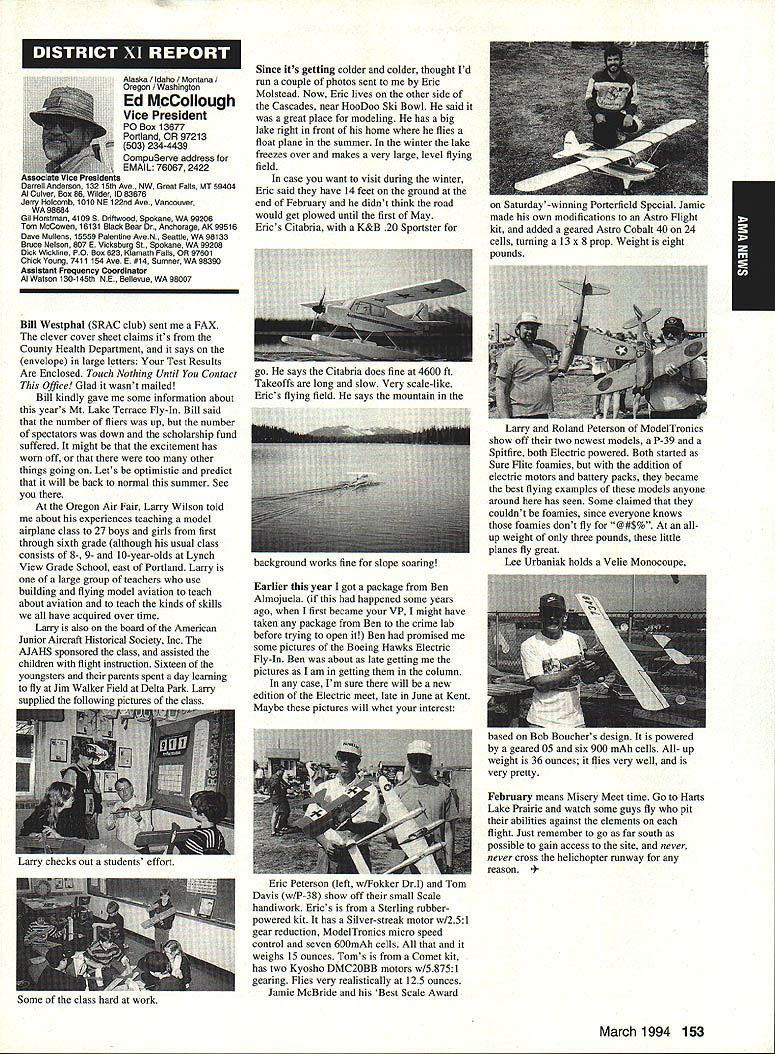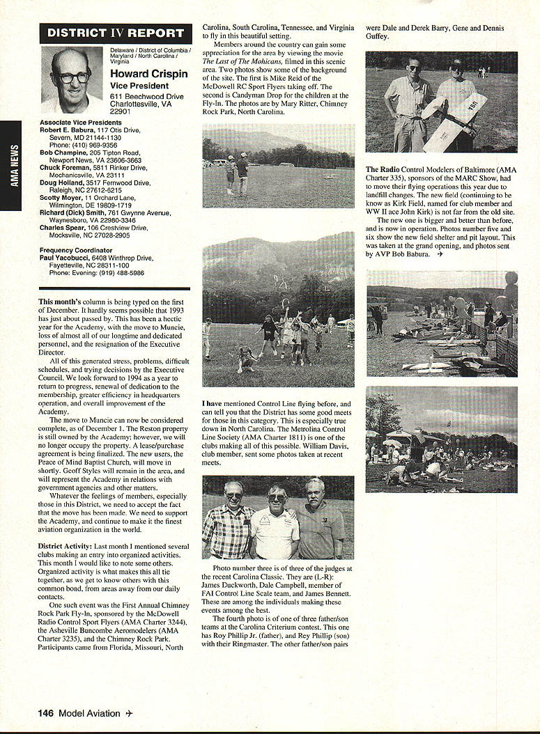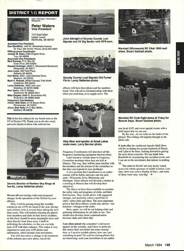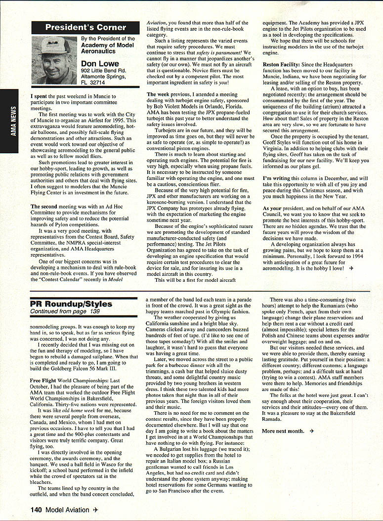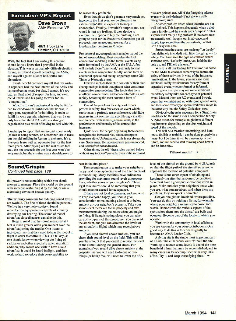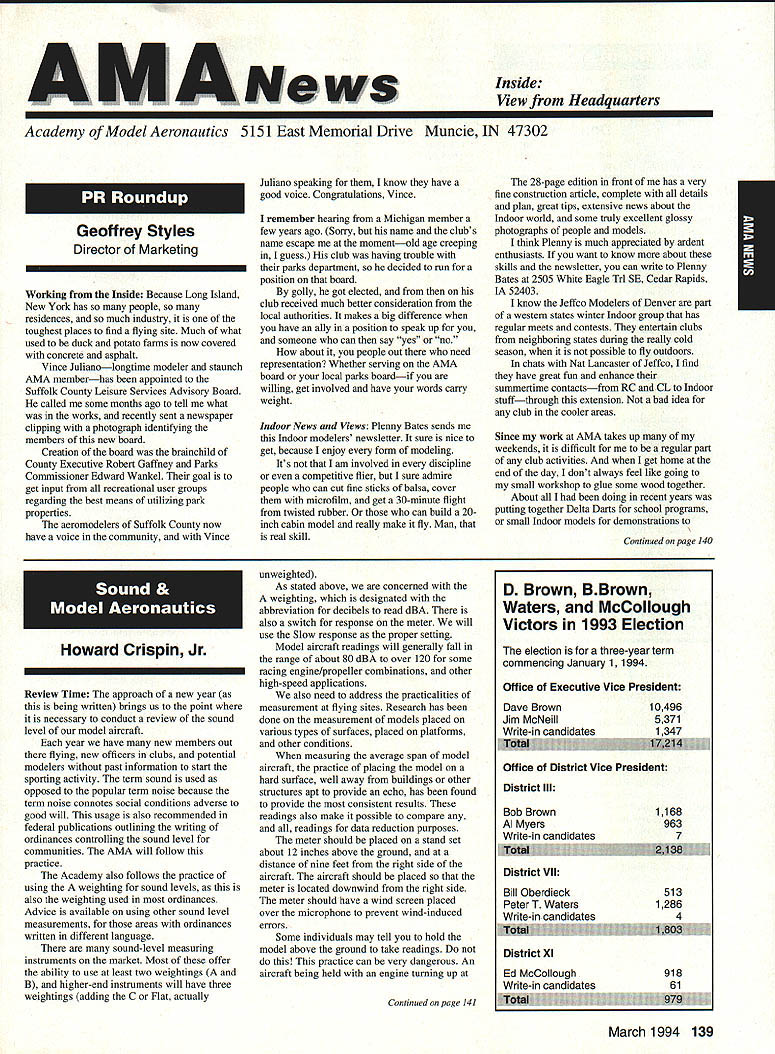 A Academy Model Aeronautics 5151 East Memorial Drive Muncie IN 47302 Working Inside Because Long Island New York has people residences much industry toughest places find flying site Much what used duck potato farms now covered concrete asphalt Vince Julianolongtime modeler staunch AMA memberhas appointed Suffolk county Leisure Services Advisory Board called some months ago tell what works recently sent newspaper clipping photograph identifying members new board Creation board bralnchild County Executive Robert Gaffney Parks Commissioner Edward Wankel goal get input recreational user groups regarding best means utilizing park properties aeromodelers Suffolk County now have voice community Vince Juliano speaking know have good voice Congratulations Vince remember hearing Michigan member few years ago Sorry name clubs name escape momentold age creeping guess club having trouble parks department decided run position board golly got elected club received much better consideration local authorities makes big difference have ally position speak up someone can say yes no about people out need representation Whether serving AMA board local parks boardif willing get involved have words carry weight Indoor News Views Plenny Bates sends Indoor modelers newsletter sure nice get because enjoy fonn modeling Its am involved discipline competitive flier sure admire people can cut fine sticks balsa cover microfilm get 30-minute flight twisted rubber can build 20inch cabin model really make fly Man real skill 28-page edition front has very fine construction article complete detalls plan great tips extensive news about Indoor world some truly excellent glossy photographs people models think Plenny much appreciated ardent enthusiasts want know about skills newsletter can write Plenny Bates 2505 White Eagle Tri SE Cedar Rapids IA 52403 know Jeffen Modelers Denver part westem states winter Indoor group has regular meets contests entertaln clubs neighboring states during really cold season possible fly outdoors chats Nat Lancaster Jeffco find have great fun enhance summertime contactsfrom RC CL Indoor stuffthrough extension bad idea club cooler areas Since work AMA takes up weekends difficult regular part club activities get home end day dont always feel like going small workshop glue some wood together About doing recent years putting together Delta Darts school programs small Indoor models demonstrations Continued page 140 Review Time approach new year being written brings us point necessary conduct review sound level model aircraft year have new members out flying new officers clubs potential modelers past information start sporting activity term sound used opposed popular term noise because term noise connotes social conditions adverse good will usage also recommended federal publications outlining writing ordinances controlling sound level communities AMA will follow practice Academy also follows practice using weighting sound levels also weighting used ordinances Advice available using other sound level measurements areas ordinances written different language sound-level measuring instruments market Most offer ability use least two weightings B higher-end instruments will have three weightings adding C Flat actually unweighted As stated above concerned weighting designated abbreviation decibels read dBA also switch response meter will use Slow response proper setting Model aircraft readings will generally fall range about 80 dBA over 120 some racing engine/propeller combinations other high-speed applications also need address practicalities measurement flying sites Research has done measurement models placed various types surfaces placed platforms other conditions measuring average span model aircraft practice placing model hard surface well away buildings other structures apt provide echo has found provide consistent results readings also make possible compare readings data reduction purposes meter should placed stand set about 12 inches above ground distance nine feet right side aircraft aircraft should placed meter located downwind right side meter should have wind screen placed over microphone prevent wind-induced errors Some individuals may tell hold model above ground take readings practice can very dangerous An aircraft being held engine turning up Continued page 141 March 1994 139 Inside View Headquarters Geoffrey Styles Director Marketing r Howard Crispin Jr 0 Brown BBrown Waters McCollough Victors 1993 Election election three-year term commencing January 1 1994 Office Executive Vice President Dave Brown10496 Jim MoNeill5371 Write-in candidates1347 Office District Vice President District III Bob Brown1168 Al Myers963 Write-in candidates7 Z1 District VII Bill Oberdieck513 Peter T Waters1286 Write-in candidates4 District Xl Ed McCollough918 Write-in candidates61 ste spent past weekend Muncie participate two important committee meetings first meeting work City Muncie organize Airfest 1995 extravaganza would feature aeromodeling hotair balloons possibly full-scale flying demonstrations other attractions Such event would work toward objective showcasing aeromodeling general public well fellow model fliers Such promotions lead greater interest hobby-sport leading growth well promoting public relations government authorities others deal flying sites often suggest modelers Muncie Flying Center investment future second meeting Ad Hoc Committee provide mechanisms improving safety reduce potential hazards Pylon competitions very good meeting representatives Contest Board Safety Committee NMPRA special-interest organization AMA Headquarters representatives biggest concerns developing mechanism deal rule-book non-rule-book events have observed Contest Calendar recently Model Aviation found half listed flying events non-rule-book category Such listing represents varied events require safety procedures must continue stress safety paramount cannot fly manner jeopardizes anothers safety own must fly aircraft ques