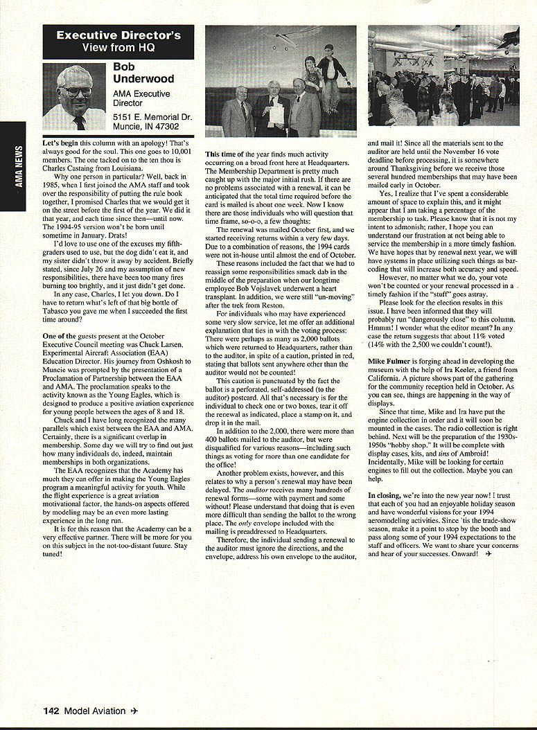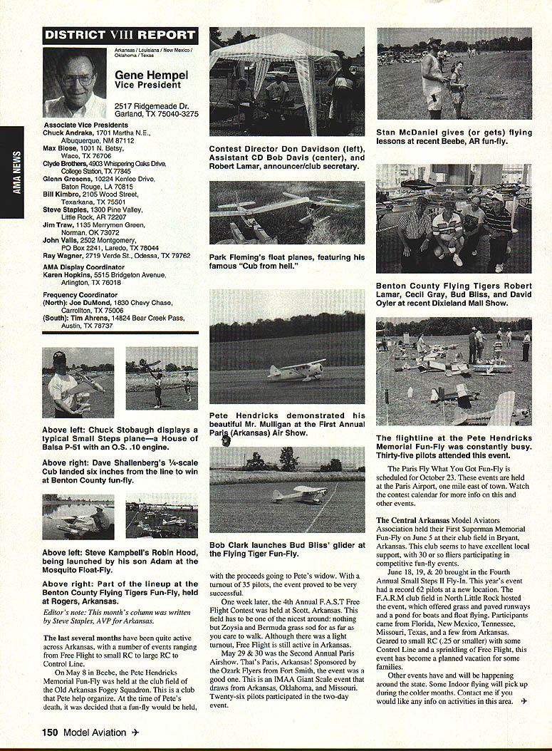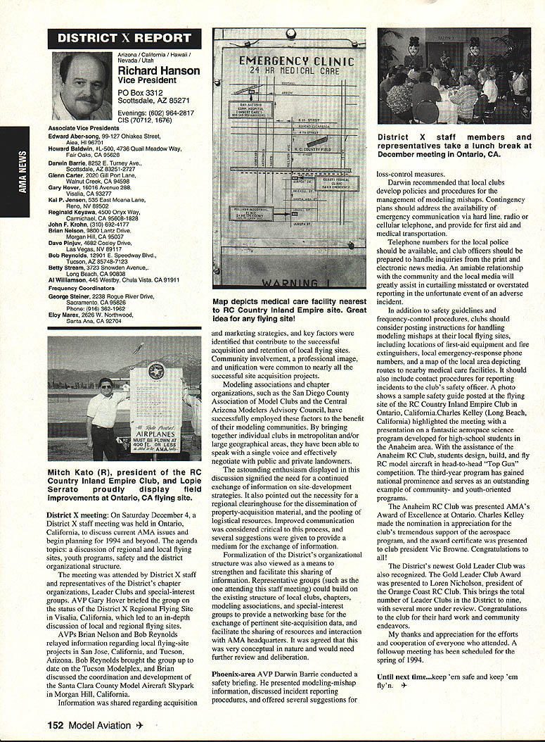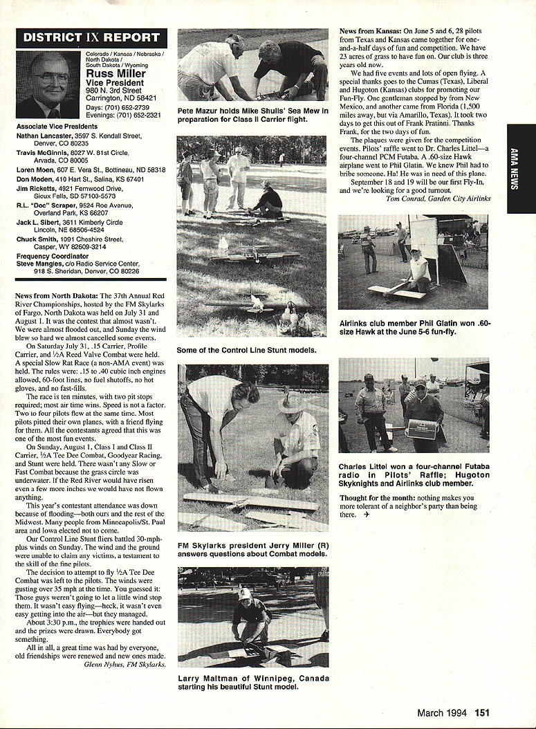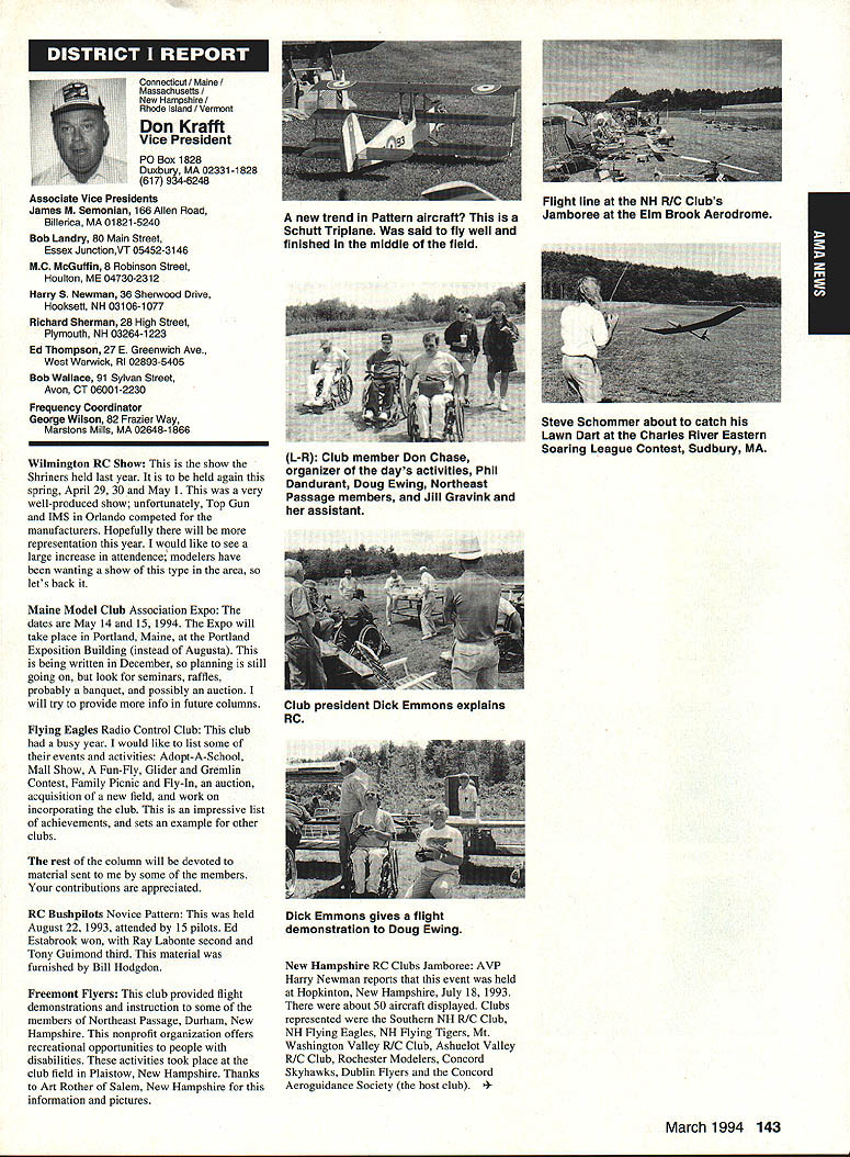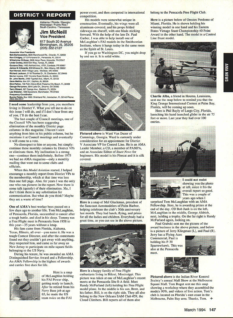 A Academy Model Aeronautics 5151 East Memorial Drive Muncie IN 47302 Working Inside Because Long Island New York has people residences much industry toughest places find flying site Much what used duck potato farms now covered concrete asphalt Vince Julianolongtime modeler staunch AMA memberhas appointed Suffolk county Leisure Services Advisory Board called some months ago tell what works recently sent newspaper clipping photograph identifying members new board Creation board bralnchild County Executive Robert Gaffney Parks Commissioner Edward Wankel goal get input recreational user groups regarding best means utilizing park properties aeromodelers Suffolk County now have voice community Vince Juliano speaking know have good voice Congratulations Vince remember hearing Michigan member few years ago Sorry name clubs name escape momentold age creeping guess club having trouble parks department decided run position board golly got elected club received much better consideration local authorities makes big difference have ally position speak up someone can say yes no about people out need representation Whether serving AMA board local parks boardif willing get involved have words carry weight Indoor News Views Plenny Bates sends Indoor modelers newsletter sure nice get because enjoy fonn modeling Its am involved discipline competitive flier sure admire people can cut fine sticks balsa cover microfilm get 30-minute flight twisted rubber can build 20inch cabin model really make fly Man real skill 28-page edition front has very fine construction article complete detalls plan great tips extensive news about Indoor world some truly excellent glossy photographs people models think Plenny much appreciated ardent enthusiasts want know about skills newsletter can write Plenny Bates 2505 White Eagle Tri SE Cedar Rapids IA 52403 know Jeffen Modelers Denver part westem states winter Indoor group has regular meets contests entertaln clubs neighboring states during really cold season possible fly outdoors chats Nat Lancaster Jeffco find have great fun enhance summertime contactsfrom RC CL Indoor stuffthrough extension bad idea club cooler areas Since work AMA takes up weekends difficult regular part club activities get home end day dont always feel like going small workshop glue some wood together About doing recent years putting together Delta Darts school programs small Indoor models demonstrations Continued page 140 Review Time approach new year being written brings us point necessary conduct review sound level model aircraft year have new members out flying new officers clubs potential modelers past information start sporting activity term sound used opposed popular term noise because term noise connotes social conditions adverse good will usage also recommended federal publications outlining writing ordinances controlling sound level communities AMA will follow practice Academy also follows practice using weighting sound levels also weighting used ordinances Advice available using other sound level measurements areas ordinances written different language sound-level measuring instruments market Most offer ability use least two weightings B higher-end instruments will have three weightings adding C Flat actually unweighted As stated above concerned weighting designated abbreviation decibels read dBA also switch response meter will use Slow response proper setting Model aircraft readings will generally fall range about 80 dBA over 120 some racing engine/propeller combinations other high-speed applications also need address practicalities measurement flying sites Research has done measurement models placed various types surfaces placed platforms other conditions measuring average span model aircraft practice placing model hard surface well away buildings other structures apt provide echo has found provide consistent results readings also make possible compare readings data reduction purposes meter should placed stand set about 12 inches above ground distance nine feet right side aircraft aircraft should placed meter located downwind right side meter should have wind screen placed over microphone prevent wind-induced errors Some individuals may tell hold model above ground take readings practice can very dangerous An aircraft being held engine turning up Continued page 141 March 1994 139 Inside View Headquarters Geoffrey Styles Director Marketing r Howard Crispin Jr 0 Brown BBrown Waters McCollough Victors 1993 Election election three-year term commencing January 1 1994 Office Executive Vice President Dave Brown10496 Jim MoNeill5371 Write-in candidates1347 Office District Vice President District III Bob Brown1168 Al Myers963 Write-in candidates7 Z1 District VII Bill Oberdieck513 Peter T Waters1286 Write-in candidates4 District Xl Ed McCollough918 Write-in candidates61 ste spent past weekend Muncie participate two important committee meetings first meeting work City Muncie organize Airfest 1995 extravaganza would feature aeromodeling hotair balloons possibly full-scale flying demonstrations other attractions Such event would work toward objective showcasing aeromodeling general public well fellow model fliers Such promotions lead greater interest hobby-sport leading growth well promoting public relations government authorities others deal flying sites often suggest modelers Muncie Flying Center investment future second meeting Ad Hoc Committee provide mechanisms improving safety reduce potential hazards Pylon competitions very good meeting representatives Contest Board Safety Committee NMPRA special-interest organization AMA Headquarters representatives biggest concerns developing mechanism deal rule-book non-rule-book events have observed Contest Calendar recently Model Aviation found half listed flying events non-rule-book category Such listing represents varied events require safety procedures must continue stress safety paramount cannot fly manner jeopardizes anothers safety own must fly aircraft ques