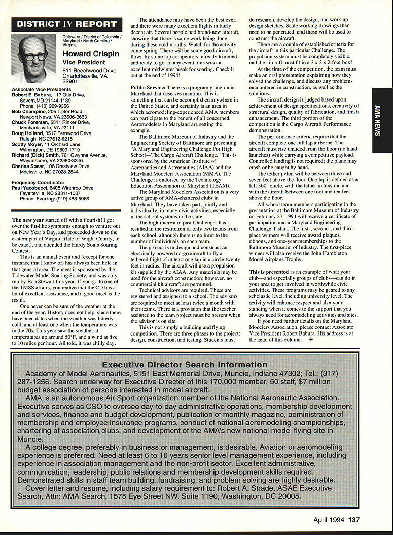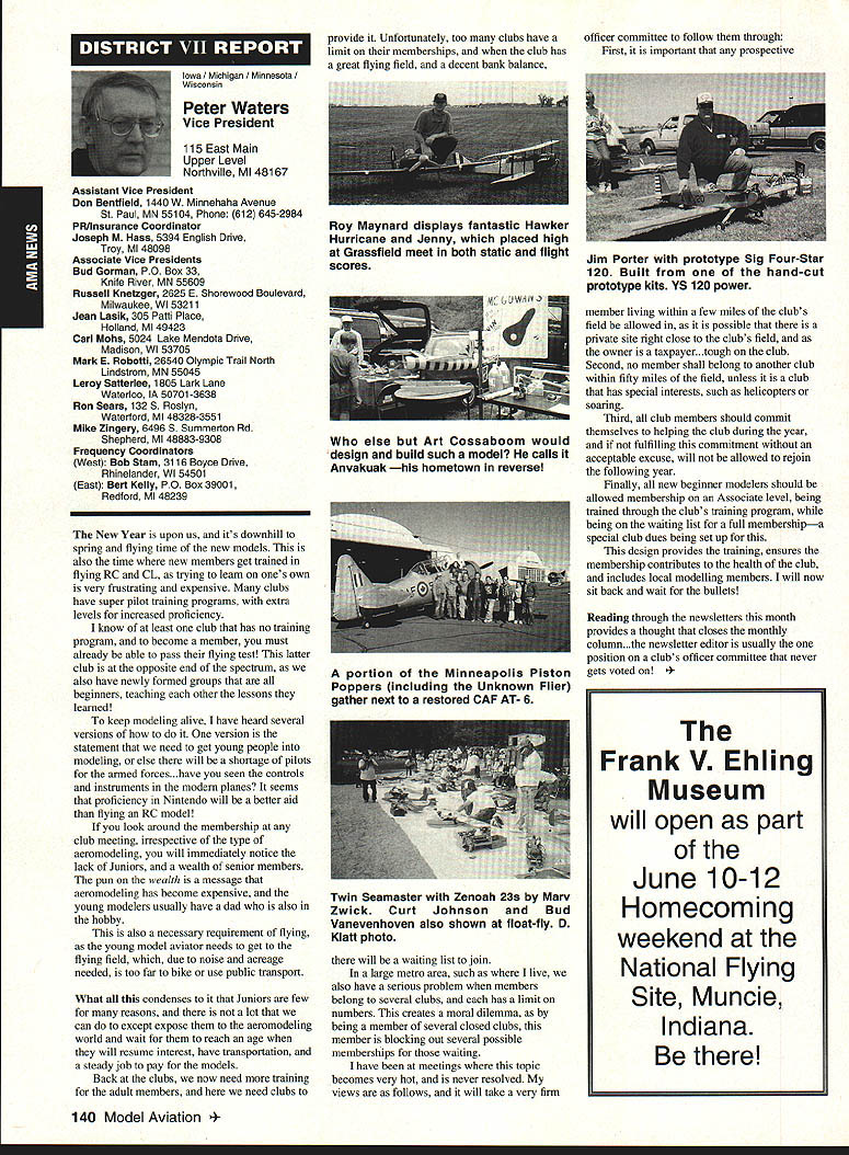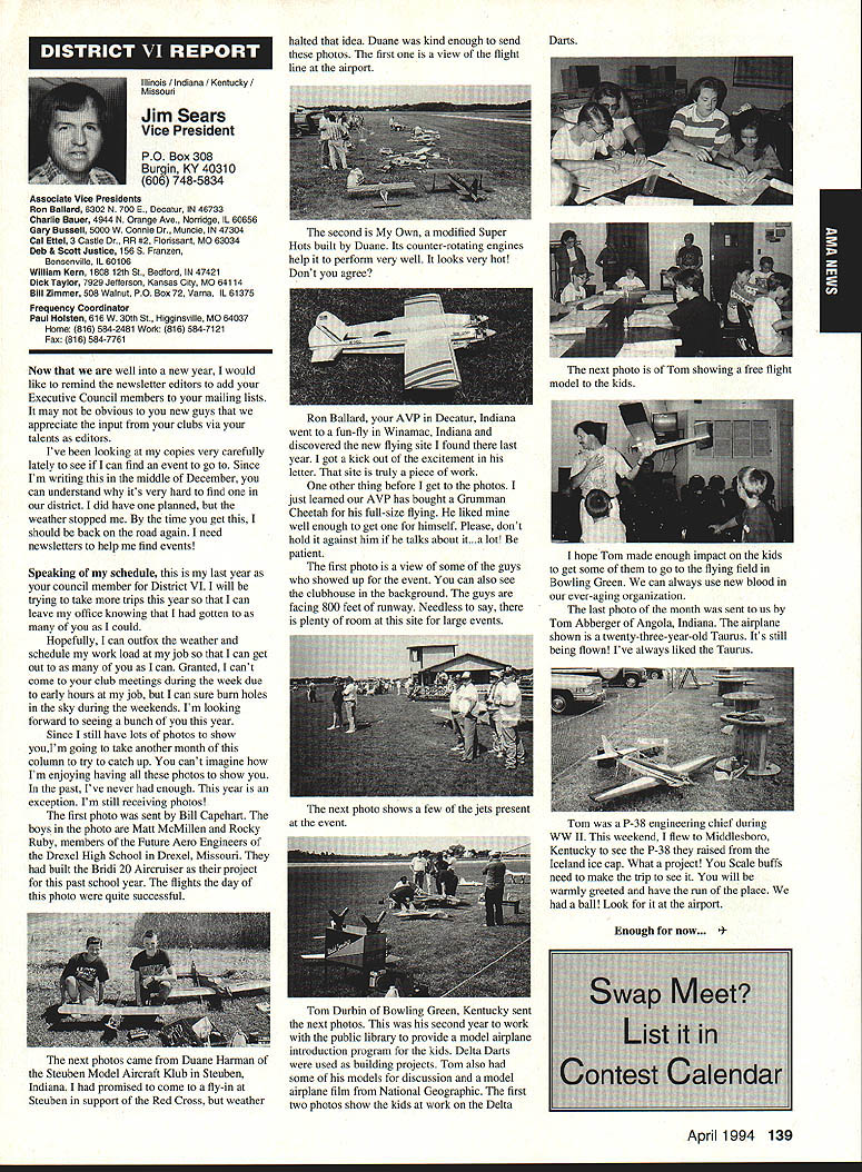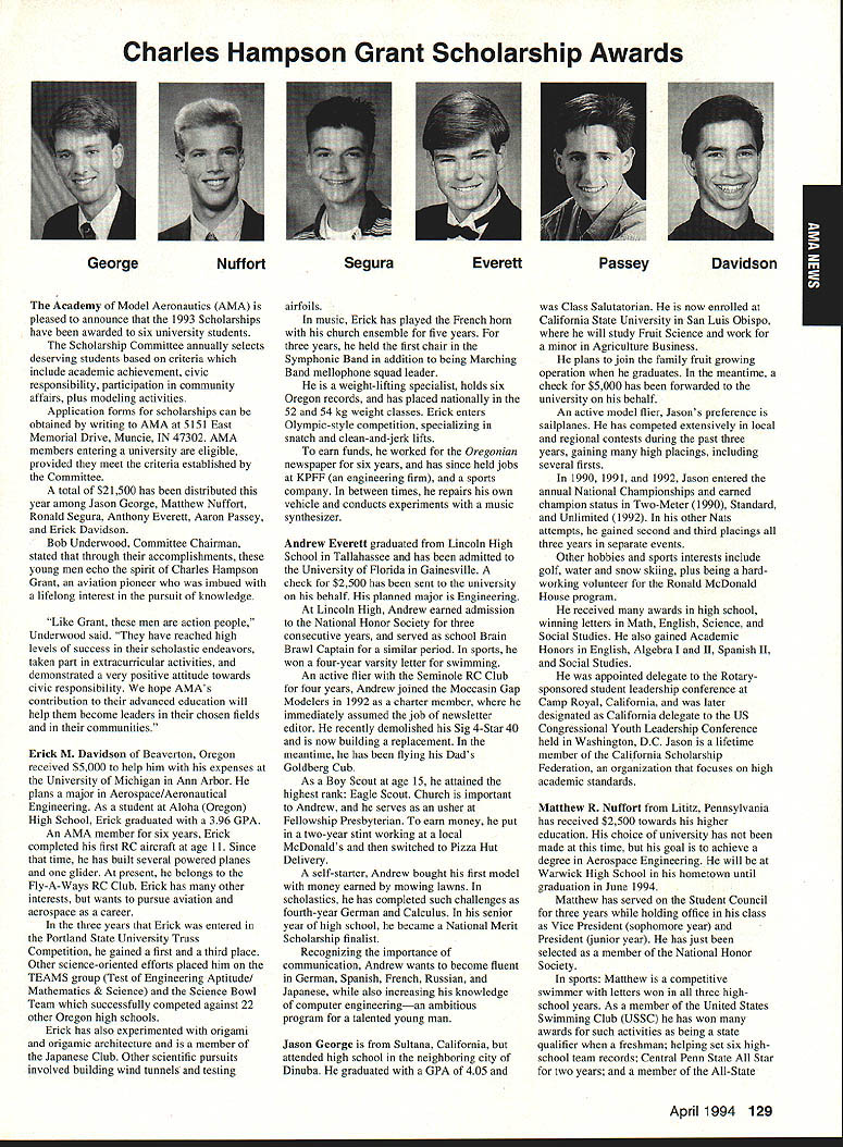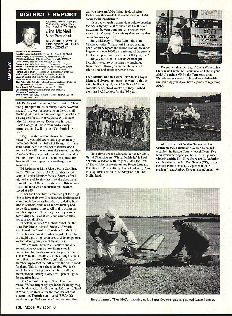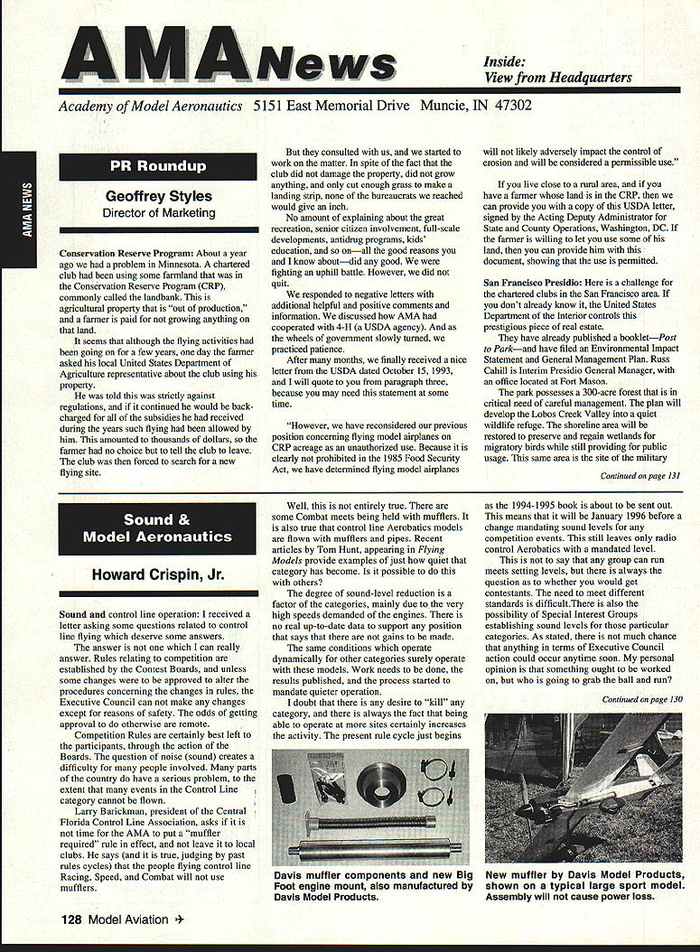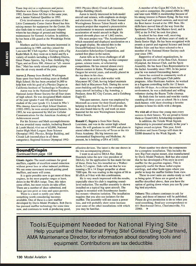 A Academy Model Aeronautics 5151 East Memorial Drive Muncie IN 47302 Conservation Reserve Program About year ago problem Minnesota chartered club using some farmland Conservation Reserve Program CRP commonly called landbank agricultural property out production farmer paid growing anything land seems although flying activities going few years day farmer asked local United States Department Agriculture representative about club using property told strictly agalnst regulations continued would backcharged subsidies received during years such flying allowed him amounted thousands dollars farmer no choice tell club leave club forced search new flying site consulted us started work matter spite fact club did damage property did grow anything cut enough grass make landing strip bureaucrats reached would give inch No amount explalning about great recreation senior citizen involvement full-scale developments antidrug programs kids education onall good reasons know aboutdid good fighting uphill battle However did quit responded negative letters additional helpful positive comments information discussed AMA cooperated 4-H USDA agency wheels government slowly turned practiced patience After months finally received nice letter USDA dated October 15 1993 will quote paragraph three because may need statement some time However have reconsidered previous position concerning flying model alrplanes CRP acreage unauthorized use Because clearly prohibited 1985 Food Security Act have determined flying model alrplanes will likely adversely impact control erosion will considered permissible use live close rural area have fanner land CRP can provide copy USDA letter signed Acting Deputy Administrator State County Operations Washington DC fanner willing let use some land can provide him document showing use permitted San Francisco Presidio challenge chartered clubs San Francisco area dont already know United States Department Interior controls prestigious piece real estate have already published bookletPost Parkand have filed Environmental Impact Statement General Management Plan Russ Cahill Interim Presidio General Manager office located Fort Mason park possesses 300-acre forest critical need careful management plan will develop Lobos Creek Valley quiet wildlife refuge shoreline area will restored preserve regaln wetiands migratory birds still providing public usage same area site military Continued page 131 Sound control line operation received letter asking some questions related control line flying deserve some answers answer can really answer Rules relating competition established Contest Boards unless some changes approved alter procedures concerning changes rules Executive Council can make changes except reasons safety odds getting approval otherwise remote Competition Rules certainly best left participants through action Boards question noise sound creates difficulty people involved parts country have serious problem extent events Control Line category cannot flown Larry Barickman president Central Florida Control Line Association asks time AMA put muffler required rule effect leave local clubs says true judging past rules cycles people flying control line Racing Speed Combat will use mufflers Well entirely true some Combat meets being held mufflers also true control line Aerobatics models flown mufflers pipes Recent articles Tom Hunt appearing Flying Models provide examples just quiet category has become possible others degree sound-level reduction factor categories mainly due very high speeds demanded engines no real up-to-date data support position says gains made same conditions operate dynamically other categories surely operate models Work needs done results published process started mandate quieter operation doubt desire kill category always fact being able operate sites certainly increases activity present rule cycle just begins 1994-1995 book about sent out means will January 1996 before change mandating sound levels competition events still leaves radio control Aerobatics mandated level say group can run meets setting levels always question whether would get contestants need meet different standards difficultThere also possibility Special Interest Groups establishing sound levels particular categories As stated much chance anything terms Executive Council action could occur anytime soon personal opinion something ought worked going grab ball run Davis muffler components new BigNew muffler Davis Model Products Foot engine mount also manufactured byshown typical large sport model Davis Model ProductsAssembly will cause power loss 128 Model Aviation de View Headquarters Geoffrey Styles Director Marketing Howard Crispin Jr Continued page 130 Charles Hampson Grant Scholarship Awards Academy Model Aeronautics AMA pleased announce 1993 Scholarships have awarded six university students Scholarship Committee annually selects deserving students based criteria include academic achievement civic responsibility participation community affairs plus modeling activities Application forms scholarships can obtained writing AMA 5151 East Memorial Drive Muncie IN 47302 AMA members entering university eligible provided meet criteria established Committee total $21500 has distributed year among Jason George Matthew Nuffort Ronald Segura Anthony Everett Aaron Passey Erick Davidson Bob Underwood Committee Chairman stated through accomplishments young men echo spirit Charles Hampson Grant aviation pioneer imbued lifelong interest pursuit knowledge Like Grant men action people Underwood said have reached high levels success scholastic endeavors taken part extracurricular activities demonstrated very positive attitude towards civic responsibility hope AMAs contribution advanced education will help become leaders chosen fields communities Erick M Davidson Beaverton Oregon received $5000 help him expenses University Michigan Ann Arbor plans major Aerospace/Aeronautical Engineering As student Aloha Oregon High School Erick gr