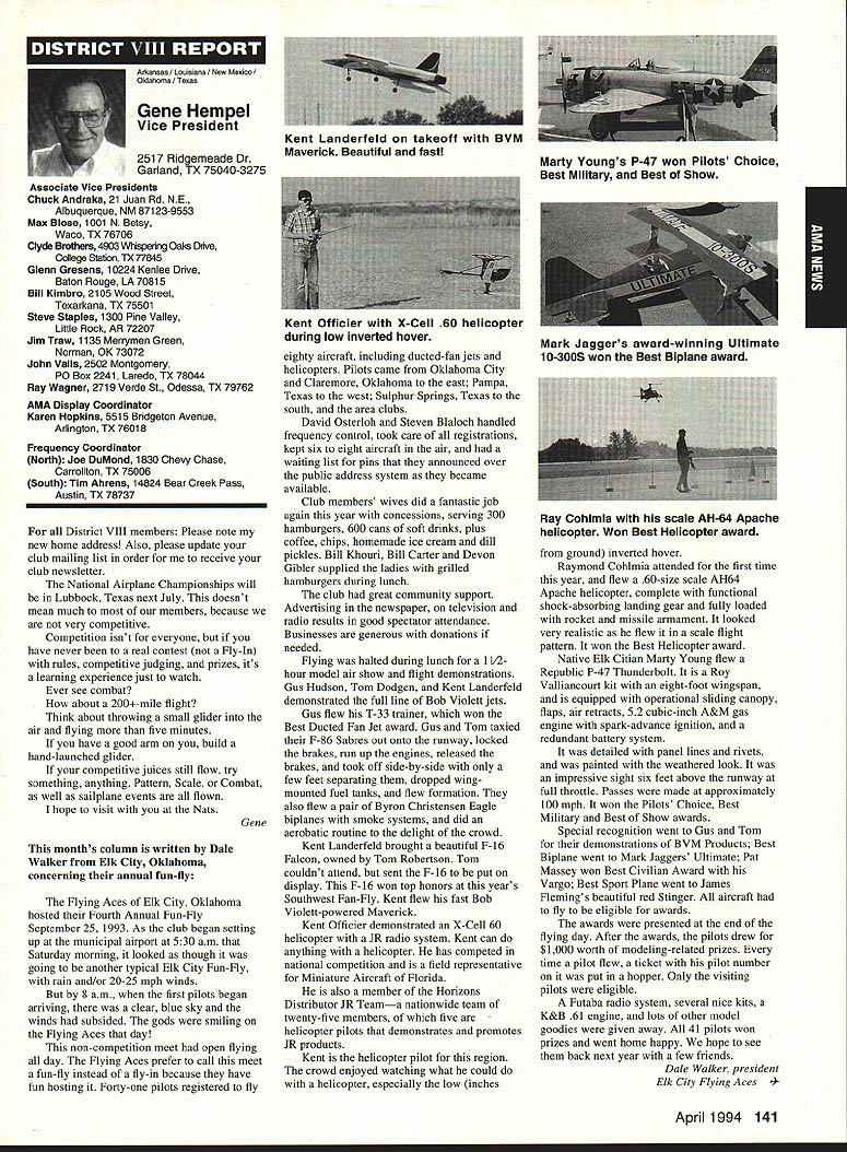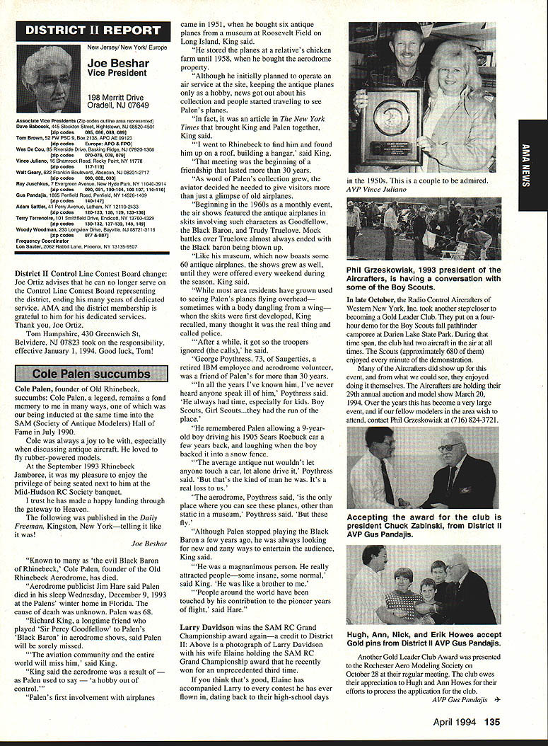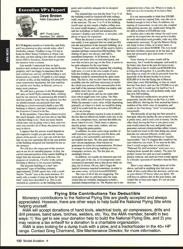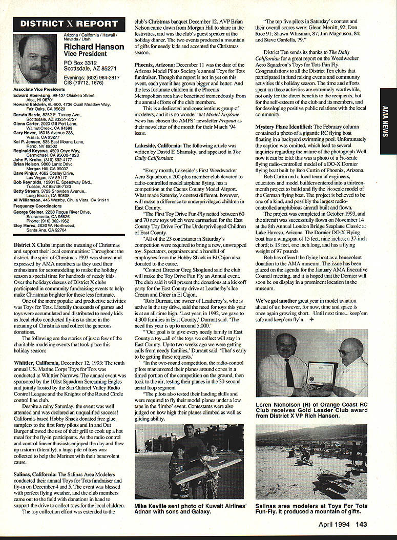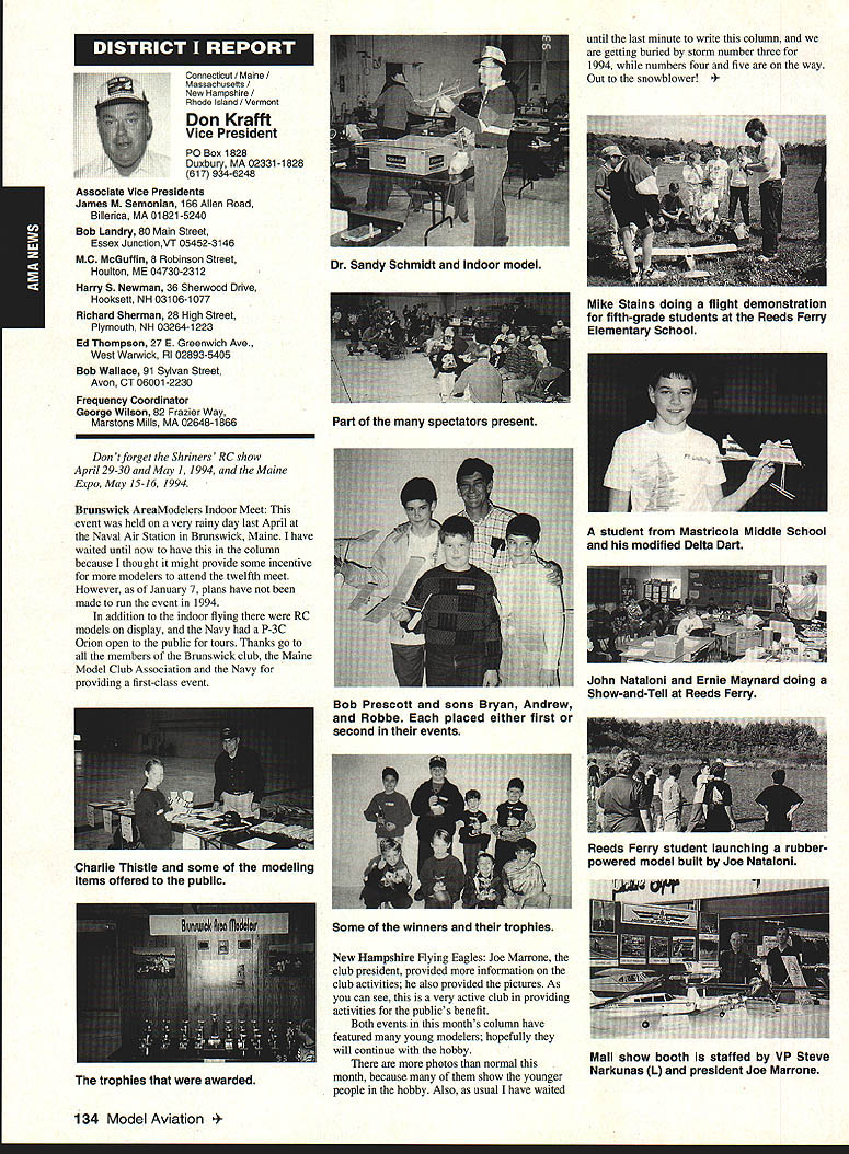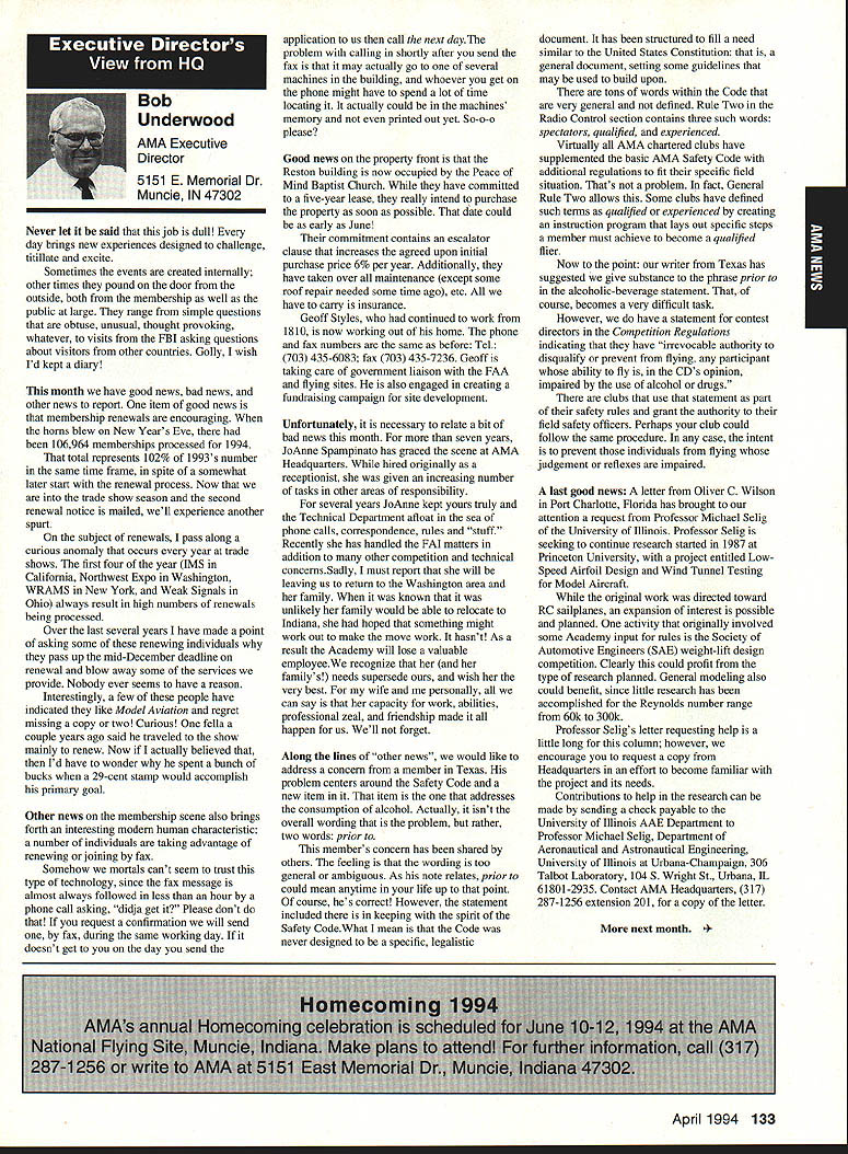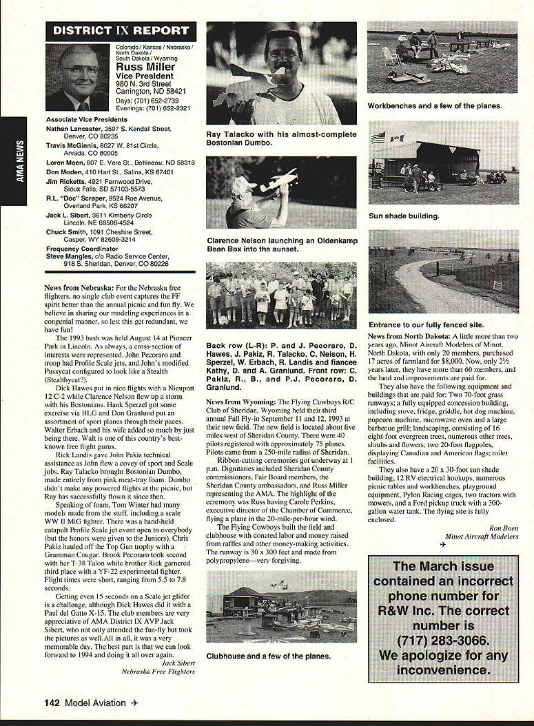 A Academy Model Aeronautics 5151 East Memorial Drive Muncie IN 47302 Conservation Reserve Program About year ago problem Minnesota chartered club using some farmland Conservation Reserve Program CRP commonly called landbank agricultural property out production farmer paid growing anything land seems although flying activities going few years day farmer asked local United States Department Agriculture representative about club using property told strictly agalnst regulations continued would backcharged subsidies received during years such flying allowed him amounted thousands dollars farmer no choice tell club leave club forced search new flying site consulted us started work matter spite fact club did damage property did grow anything cut enough grass make landing strip bureaucrats reached would give inch No amount explalning about great recreation senior citizen involvement full-scale developments antidrug programs kids education onall good reasons know aboutdid good fighting uphill battle However did quit responded negative letters additional helpful positive comments information discussed AMA cooperated 4-H USDA agency wheels government slowly turned practiced patience After months finally received nice letter USDA dated October 15 1993 will quote paragraph three because may need statement some time However have reconsidered previous position concerning flying model alrplanes CRP acreage unauthorized use Because clearly prohibited 1985 Food Security Act have determined flying model alrplanes will likely adversely impact control erosion will considered permissible use live close rural area have fanner land CRP can provide copy USDA letter signed Acting Deputy Administrator State County Operations Washington DC fanner willing let use some land can provide him document showing use permitted San Francisco Presidio challenge chartered clubs San Francisco area dont already know United States Department Interior controls prestigious piece real estate have already published bookletPost Parkand have filed Environmental Impact Statement General Management Plan Russ Cahill Interim Presidio General Manager office located Fort Mason park possesses 300-acre forest critical need careful management plan will develop Lobos Creek Valley quiet wildlife refuge shoreline area will restored preserve regaln wetiands migratory birds still providing public usage same area site military Continued page 131 Sound control line operation received letter asking some questions related control line flying deserve some answers answer can really answer Rules relating competition established Contest Boards unless some changes approved alter procedures concerning changes rules Executive Council can make changes except reasons safety odds getting approval otherwise remote Competition Rules certainly best left participants through action Boards question noise sound creates difficulty people involved parts country have serious problem extent events Control Line category cannot flown Larry Barickman president Central Florida Control Line Association asks time AMA put muffler required rule effect leave local clubs says true judging past rules cycles people flying control line Racing Speed Combat will use mufflers Well entirely true some Combat meets being held mufflers also true control line Aerobatics models flown mufflers pipes Recent articles Tom Hunt appearing Flying Models provide examples just quiet category has become possible others degree sound-level reduction factor categories mainly due very high speeds demanded engines no real up-to-date data support position says gains made same conditions operate dynamically other categories surely operate models Work needs done results published process started mandate quieter operation doubt desire kill category always fact being able operate sites certainly increases activity present rule cycle just begins 1994-1995 book about sent out means will January 1996 before change mandating sound levels competition events still leaves radio control Aerobatics mandated level say group can run meets setting levels always question whether would get contestants need meet different standards difficultThere also possibility Special Interest Groups establishing sound levels particular categories As stated much chance anything terms Executive Council action could occur anytime soon personal opinion something ought worked going grab ball run Davis muffler components new BigNew muffler Davis Model Products Foot engine mount also manufactured byshown typical large sport model Davis Model ProductsAssembly will cause power loss 128 Model Aviation de View Headquarters Geoffrey Styles Director Marketing Howard Crispin Jr Continued page 130 Charles Hampson Grant Scholarship Awards Academy Model Aeronautics AMA pleased announce 1993 Scholarships have awarded six university students Scholarship Committee annually selects deserving students based criteria include academic achievement civic responsibility participation community affairs plus modeling activities Application forms scholarships can obtained writing AMA 5151 East Memorial Drive Muncie IN 47302 AMA members entering university eligible provided meet criteria established Committee total $21500 has distributed year among Jason George Matthew Nuffort Ronald Segura Anthony Everett Aaron Passey Erick Davidson Bob Underwood Committee Chairman stated through accomplishments young men echo spirit Charles Hampson Grant aviation pioneer imbued lifelong interest pursuit knowledge Like Grant men action people Underwood said have reached high levels success scholastic endeavors taken part extracurricular activities demonstrated very positive attitude towards civic responsibility hope AMAs contribution advanced education will help become leaders chosen fields communities Erick M Davidson Beaverton Oregon received $5000 help him expenses University Michigan Ann Arbor plans major Aerospace/Aeronautical Engineering As student Aloha Oregon High School Erick gr