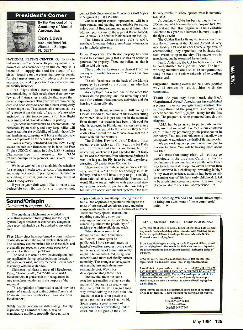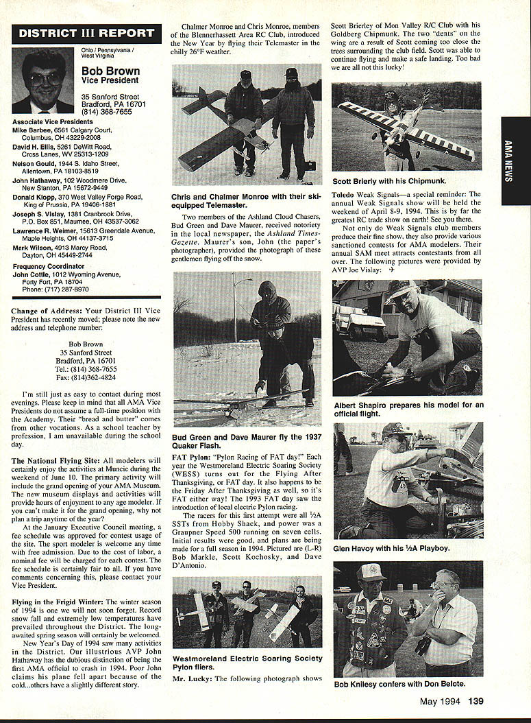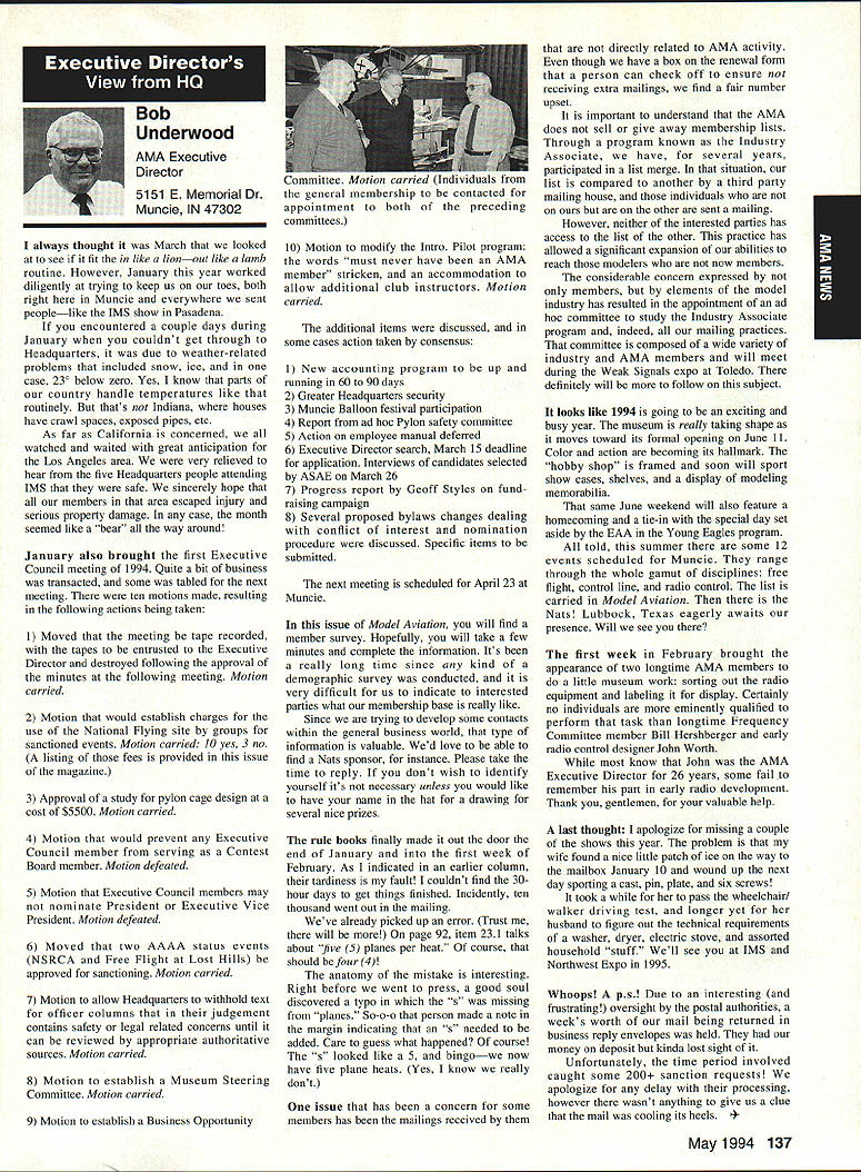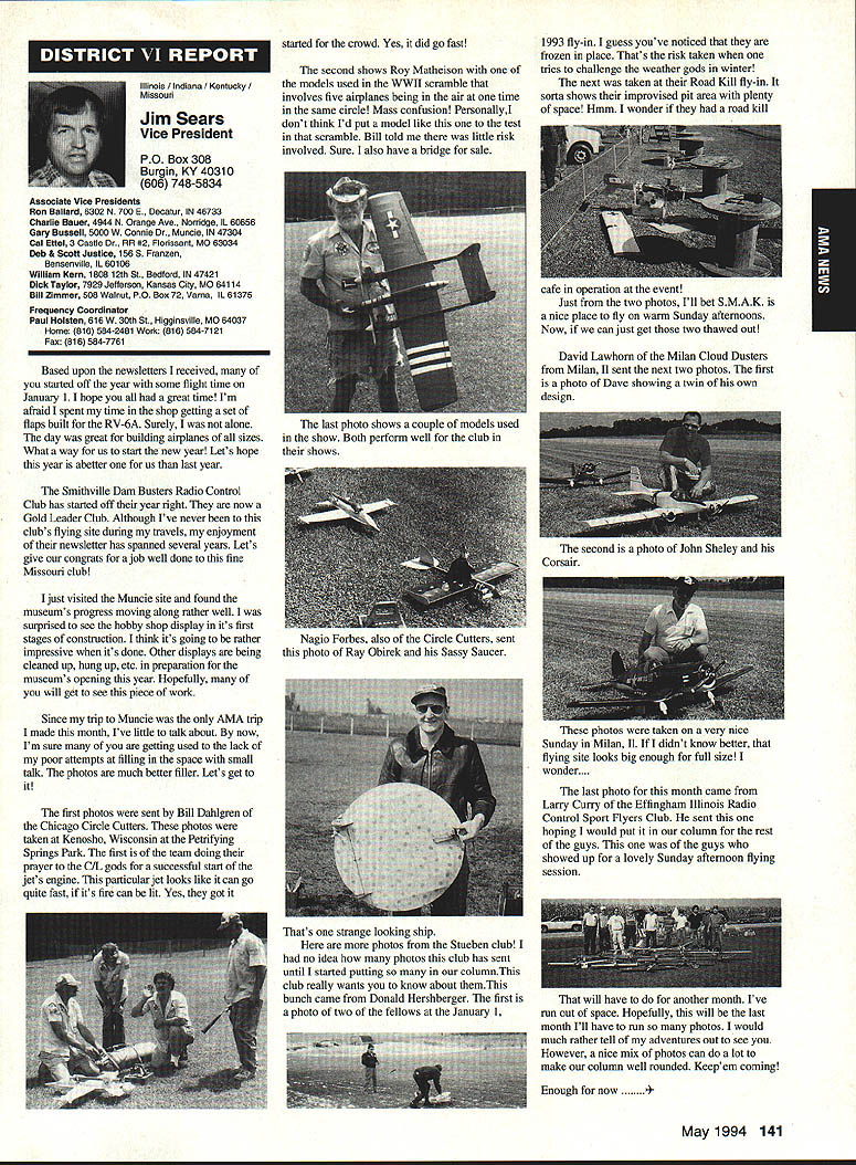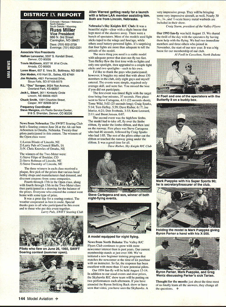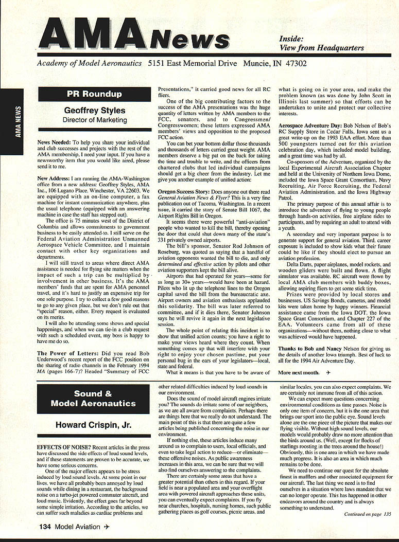 News Academy Model Aeronautics 5151 East Memorial Drive Muncie IN 47302 News Needed help share individual club successes projects rest AMA membership need input have newsworthy item would like aired please send New Address am running AMA-Washington office new address Geoffrey Styles AMA Inc 106 Lugano Place Winchester VA 22603 equipped on-line computer fax machine instant communication anywhere plus usual telephone equipped answering machine case staff has stepped out office 75 minutes west District Columbia allows commitments government business easily attendedto still serve Federal Aviation Administration Unmanned Aerospace Vehicle Committee maintain contact other key organizations departments will still travel areas direct AMA assistance needed flying site matters impact such trip can multiplied involvement other business Its AMA members funds spent AMA personnel travel its hard justify expensive trip sole purpose try collect few good reasons go given place dont rule Out special reason either request evaluated its merits will also attending some shows special happenings can tie-in club request such scheduled event boss happy have Power Letters Did read Bob Underwoods recent report FCC position sharing radio channels February 1994 MA pages 166-7 Headed Summary FCC Presentations carried good news RC fliers big contributing factors success AMA presentations huge quantity letters written AMA members FCC senators Congressmen/ Congresswomen letters expressed AMA members views opposition proposed FCC action can bet bottom dollar thousands thousands letters carried great weight AMA members deserve big pat back taking time trouble write officers chartered clubs led individual campaigns should get big cheer industry Let give another example unified action Oregon Success Story Does anyone out read General Aviation News & Flyer very fine publication out Tacoma Washington recent issue carried story Senate Bill 1067 Airport Rights Bill Oregon seems powerful anti-aviation people wanted kill bill thereby opening door could shut down states 331 privately owned airports bills sponsor Senator Rod Johnson Roseburg quoted saying handful aviation opponents wanted bill die determined arid effective action pilots other aviation supporters kept bill alive Airports operated yearssome long 30 yearswould have hazard Pilots lit up telephone lines Oregon capital saved bill bureaucratic axe Airport owners aviation enthusiasts applauded solidarity bill later referred committee dies Senator Johnson says will revive again next legislative session whole point relating incident show unified action counts have right make views heard count something comes up will interfere right enjoy chosen pastime put personal bug ears legislators-local state federal What means have aware what going area make problem known done John Scott Illinois last summer efforts can undertaken unite protect collective interests Aerospace Adventure Day Bob Nelson Bobs RC Supply Store Cedar Falls Iowa sent us great write-up 1993 EAA effort 500 youngsters turned out aviation celebration day included model building great time Co-sponsors Adventure organized local Experimental Aircraft Association Chapter held University Northern Iowa Dome included Iowa Space Grant Consortium Navy Recruiting Air Force Recruiting Federal Aviation Administration Iowa Highway Patrol primary purpose annual affair introduce adventure flying young people through hands-on activities free airplane rides participants requiring adult attend youth secondary very important purpose generate support general aviation Third career exposure included show kids what future could like should elect pursue aviation profession Delta Darts paper airplanes model rockets wooden gliders built flown flight simulator available RC aircraft flown local AMA club members buddy boxes allowing aspiring fliers get some stick time Prizes provided local stores businesses US Savings Bonds cameras model kits taken home happy winners Financial assistance came Iowa DOT Iowa Space Grant Consortium Chapter 227 EAA Volunteers came organizationswithout nothing close what achieved would have happened Thanks Bob Nancy Nelson giving us details another Iowa triumph Best luck 1994 Air Adventure Day next month EFFECTS OF NOISE Recent articles press have discussed side effects loud sound levels statements proven accurate have some serious concerns major effects appears stress induced loud sound levels some point lives have probably annoyed loud sounds dining restaurant background noise turbo-jet powered comnnuter aircraft loud music Evidently effect goes far beyond some simple irritation According articles can suffer such maladies cardiac problems other related difficulties induced loud sounds environment Does sound model aircraft engines irritate sounds irritate some neighbors aware complaints Perhaps things really understand main point quite few articles being published concerning noise environment nothing else articles induce around us complain users local officials take legal action reduceor eliminate offensive noises As public awareness increases area can sure will also find ourselves answering complaints certainly some areas have greater potential others regard field near populated area overflight area powered aircraft approaches units can eventually expect complaints fly near churches hospitals nursing homes such public gathering places golf courses picnic areas similar locales can also expect complaints certainly immune action can expect questions concerning environmental conditions time passes Noise item concern area brings sport public eye Sound levels alone piece picture makes flying visible Without high sound levels models would prubably draw no attention birds around us Well except flocks starlings roosting trees around house Obviously area have made much progress also area much remains done need continue quest absolute finest mufflers other associated equipment aircraft last thing need find ourselves situati