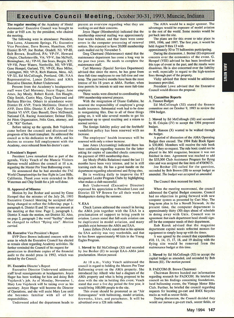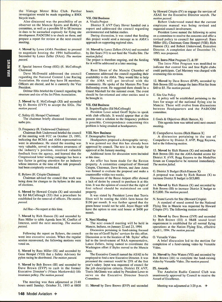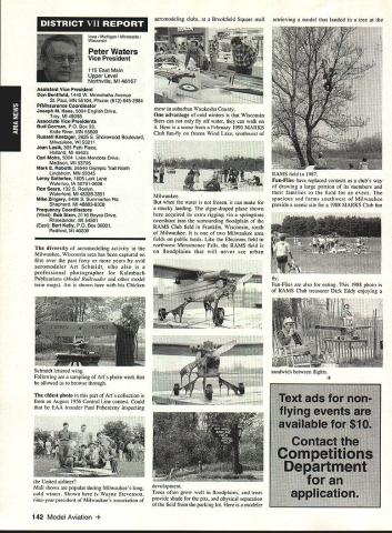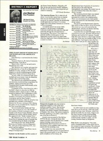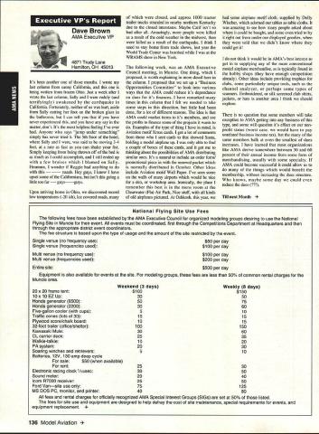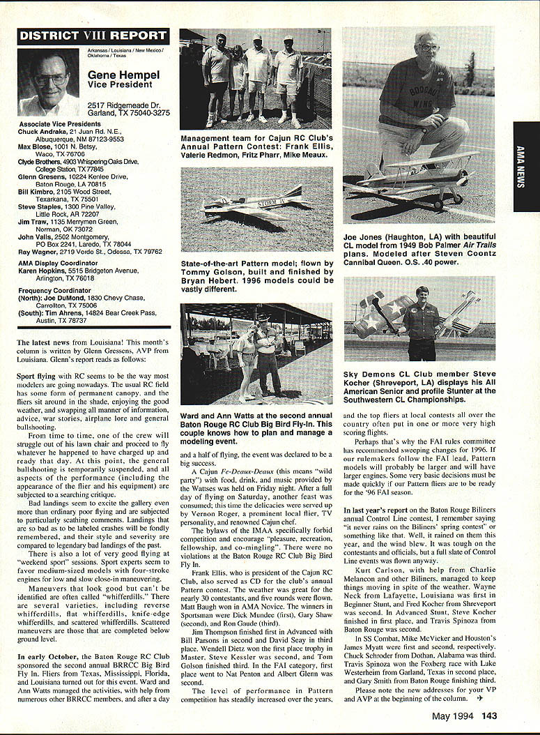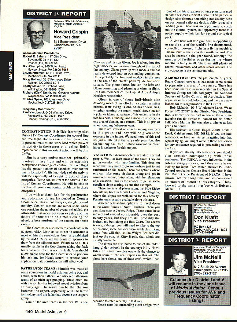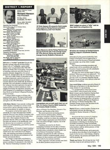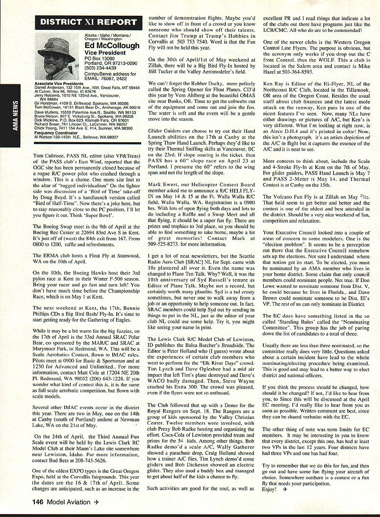 News Academy Model Aeronautics 5151 East Memorial Drive Muncie IN 47302 News Needed help share individual club successes projects rest AMA membership need input have newsworthy item would like aired please send New Address am running AMA-Washington office new address Geoffrey Styles AMA Inc 106 Lugano Place Winchester VA 22603 equipped on-line computer fax machine instant communication anywhere plus usual telephone equipped answering machine case staff has stepped out office 75 minutes west District Columbia allows commitments government business easily attendedto still serve Federal Aviation Administration Unmanned Aerospace Vehicle Committee maintain contact other key organizations departments will still travel areas direct AMA assistance needed flying site matters impact such trip can multiplied involvement other business Its AMA members funds spent AMA personnel travel its hard justify expensive trip sole purpose try collect few good reasons go given place dont rule Out special reason either request evaluated its merits will also attending some shows special happenings can tie-in club request such scheduled event boss happy have Power Letters Did read Bob Underwoods recent report FCC position sharing radio channels February 1994 MA pages 166-7 Headed Summary FCC Presentations carried good news RC fliers big contributing factors success AMA presentations huge quantity letters written AMA members FCC senators Congressmen/ Congresswomen letters expressed AMA members views opposition proposed FCC action can bet bottom dollar thousands thousands letters carried great weight AMA members deserve big pat back taking time trouble write officers chartered clubs led individual campaigns should get big cheer industry Let give another example unified action Oregon Success Story Does anyone out read General Aviation News & Flyer very fine publication out Tacoma Washington recent issue carried story Senate Bill 1067 Airport Rights Bill Oregon seems powerful anti-aviation people wanted kill bill thereby opening door could shut down states 331 privately owned airports bills sponsor Senator Rod Johnson Roseburg quoted saying handful aviation opponents wanted bill die determined arid effective action pilots other aviation supporters kept bill alive Airports operated yearssome long 30 yearswould have hazard Pilots lit up telephone lines Oregon capital saved bill bureaucratic axe Airport owners aviation enthusiasts applauded solidarity bill later referred committee dies Senator Johnson says will revive again next legislative session whole point relating incident show unified action counts have right make views heard count something comes up will interfere right enjoy chosen pastime put personal bug ears legislators-local state federal What means have aware what going area make problem known done John Scott Illinois last summer efforts can undertaken unite protect collective interests Aerospace Adventure Day Bob Nelson Bobs RC Supply Store Cedar Falls Iowa sent us great write-up 1993 EAA effort 500 youngsters turned out aviation celebration day included model building great time Co-sponsors Adventure organized local Experimental Aircraft Association Chapter held University Northern Iowa Dome included Iowa Space Grant Consortium Navy Recruiting Air Force Recruiting Federal Aviation Administration Iowa Highway Patrol primary purpose annual affair introduce adventure flying young people through hands-on activities free airplane rides participants requiring adult attend youth secondary very important purpose generate support general aviation Third career exposure included show kids what future could like should elect pursue aviation profession Delta Darts paper airplanes model rockets wooden gliders built flown flight simulator available RC aircraft flown local AMA club members buddy boxes allowing aspiring fliers get some stick time Prizes provided local stores businesses US Savings Bonds cameras model kits taken home happy winners Financial assistance came Iowa DOT Iowa Space Grant Consortium Chapter 227 EAA Volunteers came organizationswithout nothing close what achieved would have happened Thanks Bob Nancy Nelson giving us details another Iowa triumph Best luck 1994 Air Adventure Day next month EFFECTS OF NOISE Recent articles press have discussed side effects loud sound levels statements proven accurate have some serious concerns major effects appears stress induced loud sound levels some point lives have probably annoyed loud sounds dining restaurant background noise turbo-jet powered comnnuter aircraft loud music Evidently effect goes far beyond some simple irritation According articles can suffer such maladies cardiac problems other related difficulties induced loud sounds environment Does sound model aircraft engines irritate sounds irritate some neighbors aware complaints Perhaps things really understand main point quite few articles being published concerning noise environment nothing else articles induce around us complain users local officials take legal action reduceor eliminate offensive noises As public awareness increases area can sure will also find ourselves answering complaints certainly some areas have greater potential others regard field near populated area overflight area powered aircraft approaches units can eventually expect complaints fly near churches hospitals nursing homes such public gathering places golf courses picnic areas similar locales can also expect complaints certainly immune action can expect questions concerning environmental conditions time passes Noise item concern area brings sport public eye Sound levels alone piece picture makes flying visible Without high sound levels models would prubably draw no attention birds around us Well except flocks starlings roosting trees around house Obviously area have made much progress also area much remains done need continue quest absolute finest mufflers other associated equipment aircraft last thing need find ourselves situati