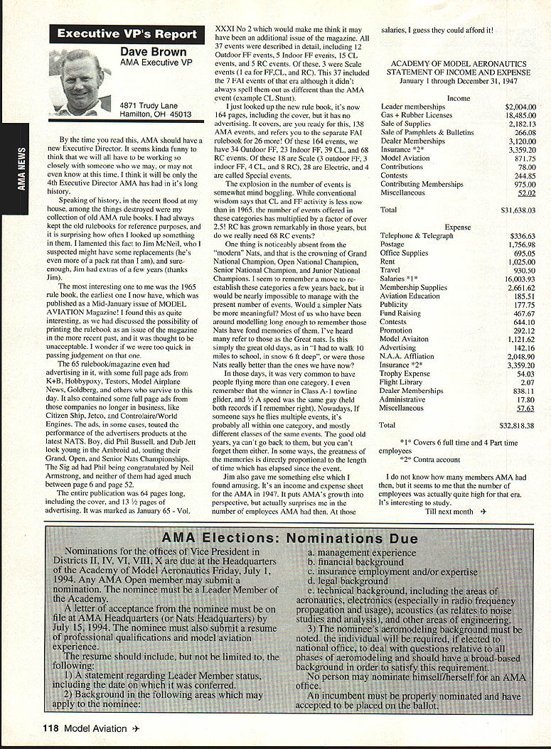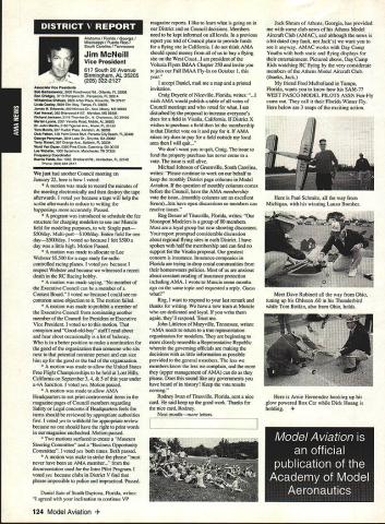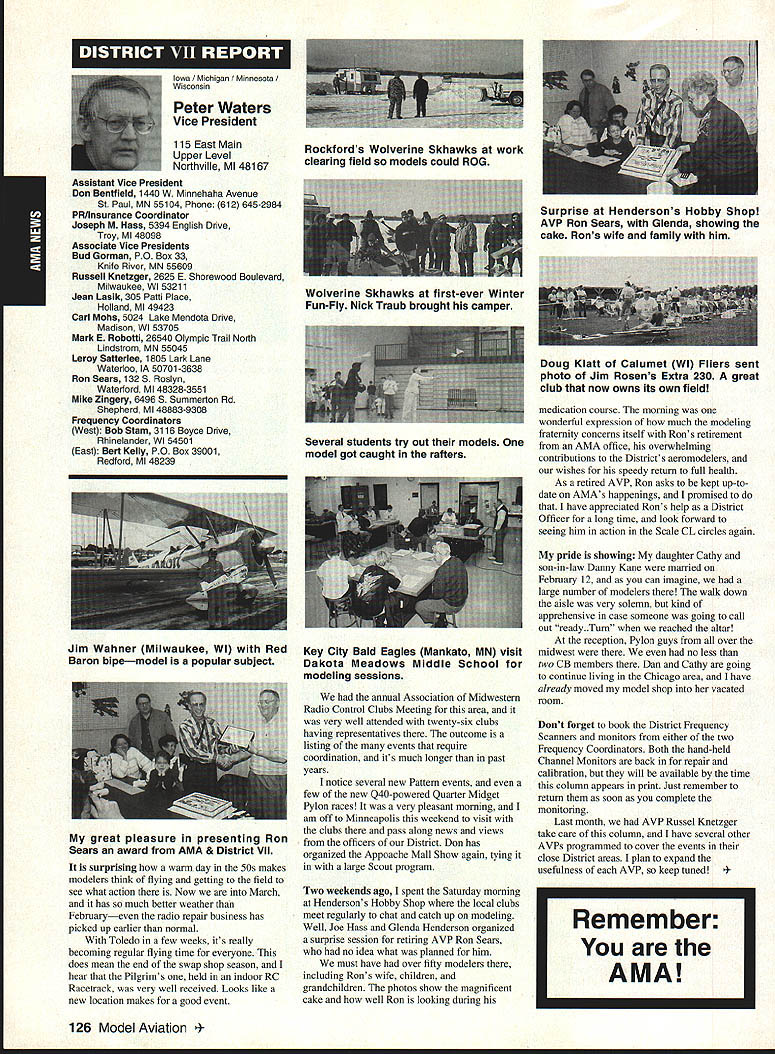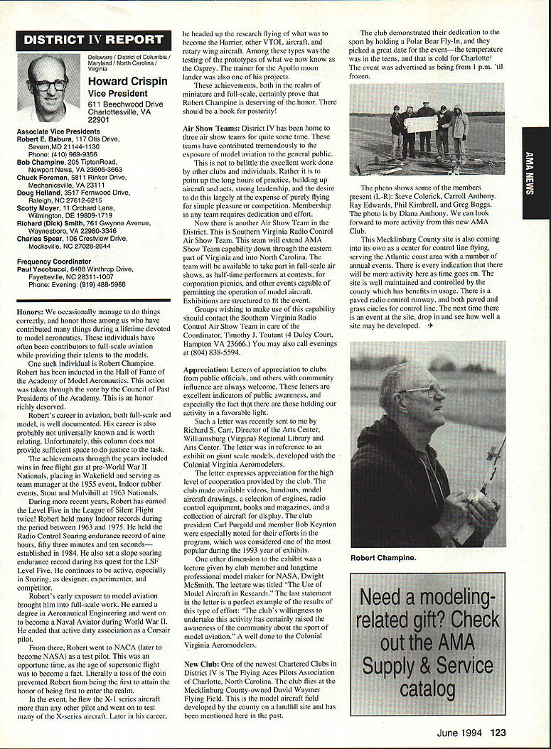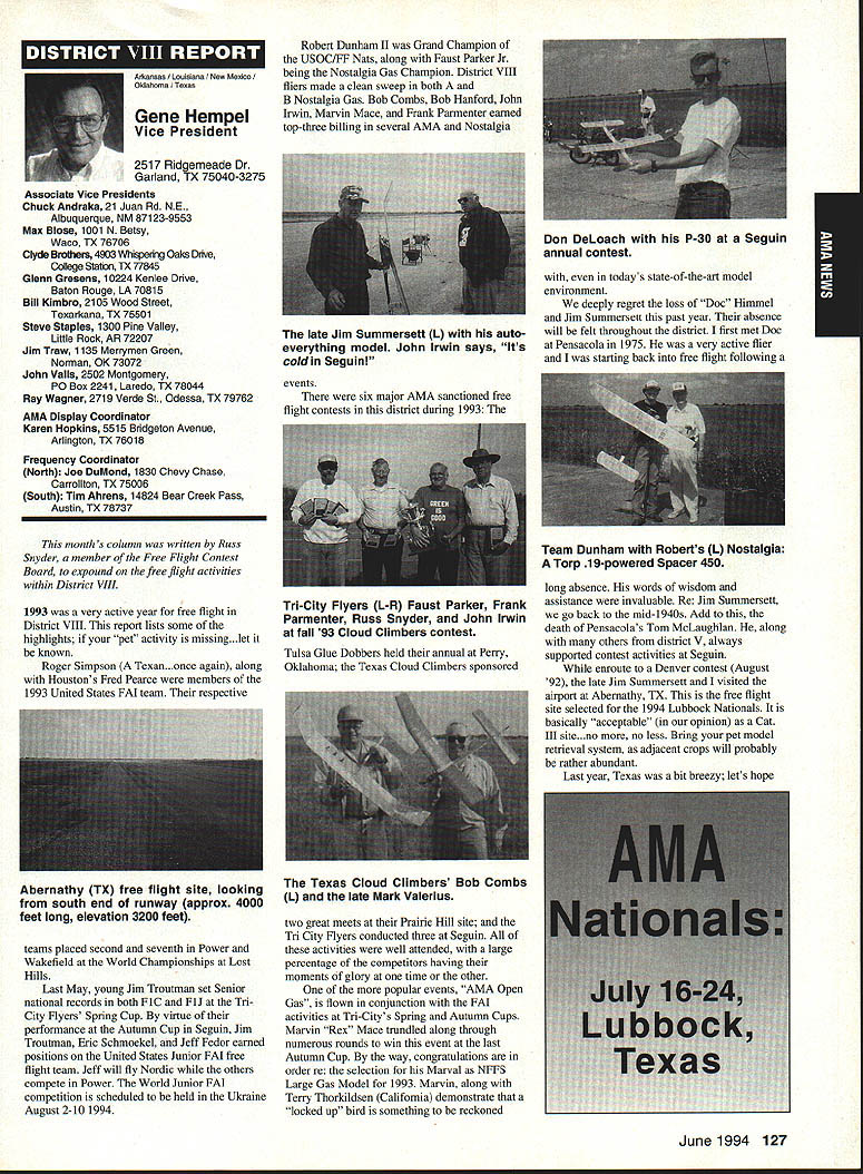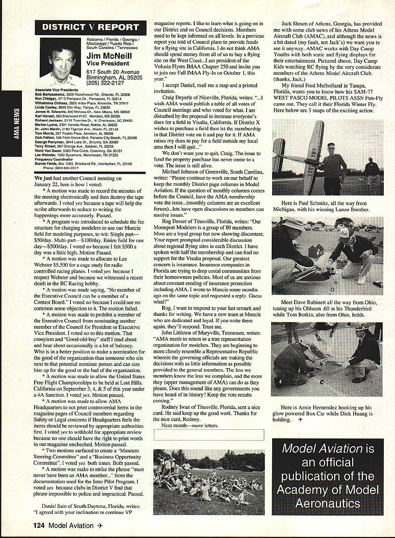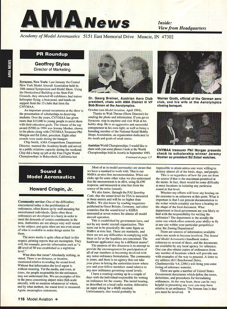 ANews Academy Model Aeronautics 5151 East Memorial Drive Muncie IN 47302 Syracuse New York Last January Central New York Model Aircraft Association held its 18th annual Symposium Model Show Using Horticultural Building State Fair Grounds attracted 40 exhibitors indoor helicopter flying boat pond hands-on support 15 clubs form CNYMAA An important annual occurrence show presentation scholarships deserving students Over years CNYMAA has given $15000 young people assist education goals winner top award $500 1994 Jeremy Mosher shown photo along CNYMAA Treasurer Phil Morgan Ed Zobel president Eight other awards made during banquet Chip Smith AMA Competitions Department Director manned Academy booth served public relations capacity during weekend Chip did bang-up job Free Flight World Championships Bakersfield California last Dr Georg Breiner Austrian Aero Club president chats AMA District III VP Bob Brown Aerolympics October see ModelAviation April 1994 Thanks Walt Throne Show Director sending photo information get Syracuse stop anytime visit Walt hobby shop aggressive successful entrepreneur own right well being founding member National Retail Hobby Shops Association organization dedicated needs goals retail stores Austrian World Championships would like share some photos took World Championships held Austria September 1993 Continued page 117 Community service difficulties encountered today proliferation ordinances often drawn up well-meaning misinformed individuals Quite often ordinances developed hurry order meet demands certain constituents area Authorities always very well versed subject quite often aware what available make things easier news media quite often fault respect printing reports incomplete will example provide information such dB level 50 established nighttime level What does mean Absolutely nothing stated no distance location mentioned relative reading sound level Without information level report meaning Yet media times people responsible ordinance may understand see examples press concerning airport rules full-scale aircraft no mention whatsoever what method sound level measured Again meaningless statements Most us model aeronautics aware have standard work 9OdBA-at-nine-feet recommendation clubs opt some other value also understand measurement dBA using SLOW response measured nine feet source noise sound also know through FAI Sporting code sound level F3A measured three meters will no higher 96dBA also know reading magazines published Great Britain Germany other countries sound level 82dBA measured seven meters almost model aircraft operation established government laws model aircraft organization turns out practically same figure 9OdBA nine feet standards difficulties complying far legalities concerned hardware application may different matter purpose discourse attempt provide encouragement participation of members becoming involved noise ordinance formulation community yours no agency can take place letting authorities know fellow members stand relative new ordinance governing sound levels have meeting coming up couple days individual responsible writing ordinance county initial hearing described local radio station teferred input asking 40dB standard Unfortunately would probably impossible attain unless willing destroy almost birds dogs people regardless far source maximum permitted meter fact would some difficulty locations isolating particular sound level Whether efforts will have bearing outcome unknown point What important can present documentation writer certainly can have bearing shape final document What department local government likely find responsibility writing ordinance department usually same often controls ability fly site within particular geopolitical area Zoning Department sources information available needs become involved Sound Model Aeronautics handbook makes reference several documents available local agency reference can also obtain copies ordinances number locations will provide examples way proceed letter address 611 Beechwood Drive Charlottesville VA 22901 will bring some listing reference material quite number United States Government documents define terms definitions procedures formulating ordinances very least can very helpful presenting case may have relative ordinance bottom line must involved 4116 Model Aviation de View Headquarters Geoffrey Styles Director Marketing Werner Groth official German aero club wife Aerolympics closing banquet Howard Crispin Jr CNVMAA treasurer Phil Morgan presents check scholarship winner Jeremy Mosher president Ed Zobel watches d - II U~UV1OJ ii ti President Academy Model Aeronautics Don Lowe 902 Little Bend Rd Altamonte Springs FL 32714 What AMA Academy Model Aeronautics foremost goal promotion model aviation its entirety United States promotion takes forms determined what needed hobby-sport needs range education competition flying site support yes insurance Model aviation extremely diverse encompassing imagined creation uses principles aerodynamics fly models range extremely fragile Indoor models outdoor free flight models controlled wires controlled radio craft may powered strong arm winch rubber bands electric motors piston engines turbojet engines solid propellent rockets Model aviations technical progress strongly influenced motivated competition communication Therefore Academy organizes supports competition Fly-Ins kind Making happen simple process requires dedicated support literally several thousand volunteer modelers AMA far fifty employees working Headquarters volunteer force includes Council Leader Members Contest Boards Contest Directors Team Selection special committees well Chartered Club officers Yes AMA lot insurance although important also AMA has very important ingredient growth health aeromodeling very long time takes long view considering various aspects modeling since modeling activities mutually supportive necessary promote aspects aeromodeling also realize strength unity dealing Feder