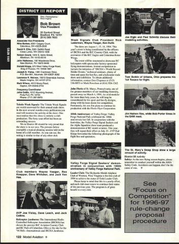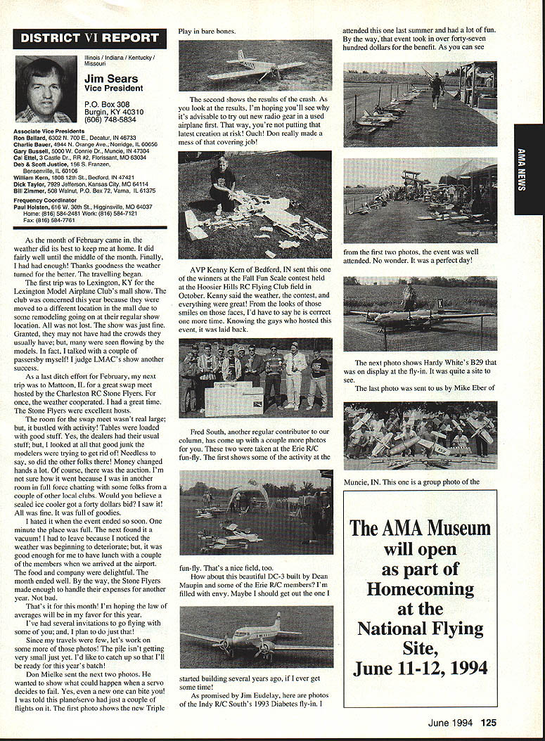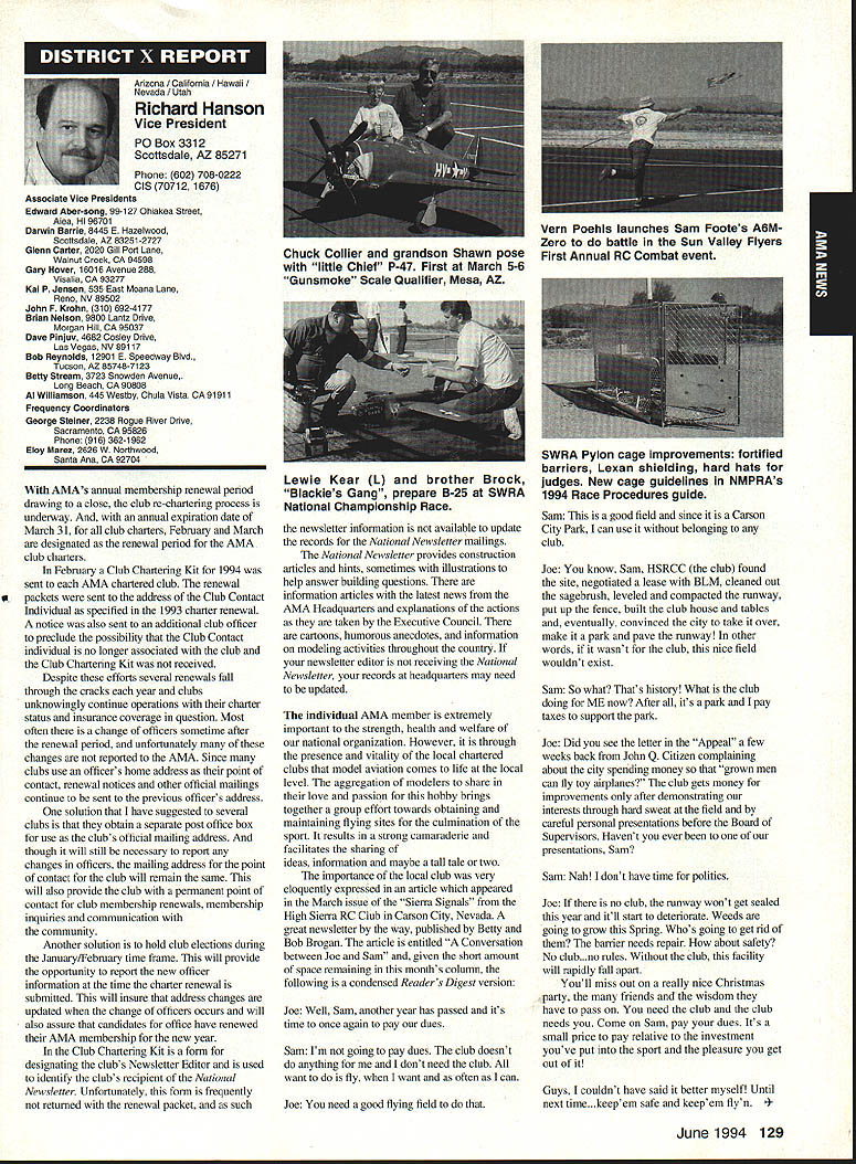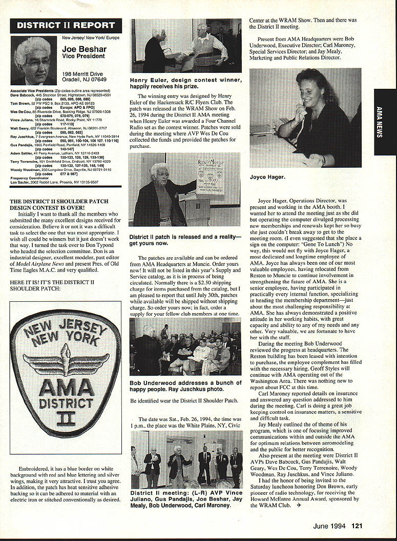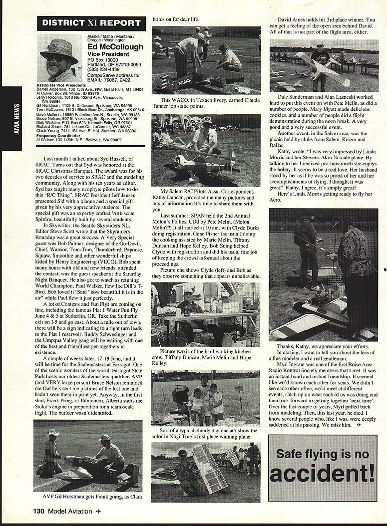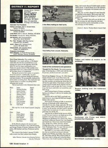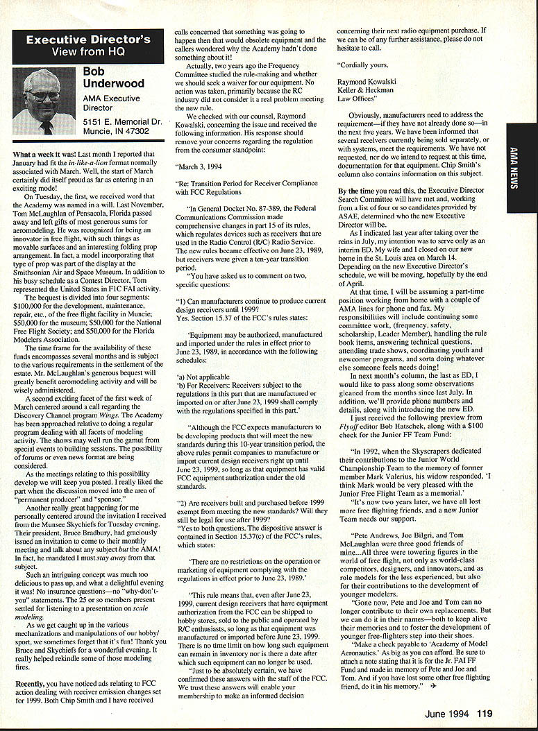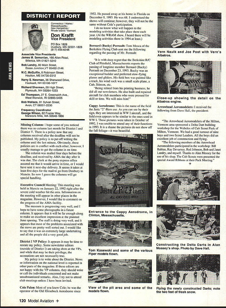 ANews Academy Model Aeronautics 5151 East Memorial Drive Muncie IN 47302 Syracuse New York Last January Central New York Model Aircraft Association held its 18th annual Symposium Model Show Using Horticultural Building State Fair Grounds attracted 40 exhibitors indoor helicopter flying boat pond hands-on support 15 clubs form CNYMAA An important annual occurrence show presentation scholarships deserving students Over years CNYMAA has given $15000 young people assist education goals winner top award $500 1994 Jeremy Mosher shown photo along CNYMAA Treasurer Phil Morgan Ed Zobel president Eight other awards made during banquet Chip Smith AMA Competitions Department Director manned Academy booth served public relations capacity during weekend Chip did bang-up job Free Flight World Championships Bakersfield California last Dr Georg Breiner Austrian Aero Club president chats AMA District III VP Bob Brown Aerolympics October see ModelAviation April 1994 Thanks Walt Throne Show Director sending photo information get Syracuse stop anytime visit Walt hobby shop aggressive successful entrepreneur own right well being founding member National Retail Hobby Shops Association organization dedicated needs goals retail stores Austrian World Championships would like share some photos took World Championships held Austria September 1993 Continued page 117 Community service difficulties encountered today proliferation ordinances often drawn up well-meaning misinformed individuals Quite often ordinances developed hurry order meet demands certain constituents area Authorities always very well versed subject quite often aware what available make things easier news media quite often fault respect printing reports incomplete will example provide information such dB level 50 established nighttime level What does mean Absolutely nothing stated no distance location mentioned relative reading sound level Without information level report meaning Yet media times people responsible ordinance may understand see examples press concerning airport rules full-scale aircraft no mention whatsoever what method sound level measured Again meaningless statements Most us model aeronautics aware have standard work 9OdBA-at-nine-feet recommendation clubs opt some other value also understand measurement dBA using SLOW response measured nine feet source noise sound also know through FAI Sporting code sound level F3A measured three meters will no higher 96dBA also know reading magazines published Great Britain Germany other countries sound level 82dBA measured seven meters almost model aircraft operation established government laws model aircraft organization turns out practically same figure 9OdBA nine feet standards difficulties complying far legalities concerned hardware application may different matter purpose discourse attempt provide encouragement participation of members becoming involved noise ordinance formulation community yours no agency can take place letting authorities know fellow members stand relative new ordinance governing sound levels have meeting coming up couple days individual responsible writing ordinance county initial hearing described local radio station teferred input asking 40dB standard Unfortunately would probably impossible attain unless willing destroy almost birds dogs people regardless far source maximum permitted meter fact would some difficulty locations isolating particular sound level Whether efforts will have bearing outcome unknown point What important can present documentation writer certainly can have bearing shape final document What department local government likely find responsibility writing ordinance department usually same often controls ability fly site within particular geopolitical area Zoning Department sources information available needs become involved Sound Model Aeronautics handbook makes reference several documents available local agency reference can also obtain copies ordinances number locations will provide examples way proceed letter address 611 Beechwood Drive Charlottesville VA 22901 will bring some listing reference material quite number United States Government documents define terms definitions procedures formulating ordinances very least can very helpful presenting case may have relative ordinance bottom line must involved 4116 Model Aviation de View Headquarters Geoffrey Styles Director Marketing Werner Groth official German aero club wife Aerolympics closing banquet Howard Crispin Jr CNVMAA treasurer Phil Morgan presents check scholarship winner Jeremy Mosher president Ed Zobel watches d - II U~UV1OJ ii ti President Academy Model Aeronautics Don Lowe 902 Little Bend Rd Altamonte Springs FL 32714 What AMA Academy Model Aeronautics foremost goal promotion model aviation its entirety United States promotion takes forms determined what needed hobby-sport needs range education competition flying site support yes insurance Model aviation extremely diverse encompassing imagined creation uses principles aerodynamics fly models range extremely fragile Indoor models outdoor free flight models controlled wires controlled radio craft may powered strong arm winch rubber bands electric motors piston engines turbojet engines solid propellent rockets Model aviations technical progress strongly influenced motivated competition communication Therefore Academy organizes supports competition Fly-Ins kind Making happen simple process requires dedicated support literally several thousand volunteer modelers AMA far fifty employees working Headquarters volunteer force includes Council Leader Members Contest Boards Contest Directors Team Selection special committees well Chartered Club officers Yes AMA lot insurance although important also AMA has very important ingredient growth health aeromodeling very long time takes long view considering various aspects modeling since modeling activities mutually supportive necessary promote aspects aeromodeling also realize strength unity dealing Feder