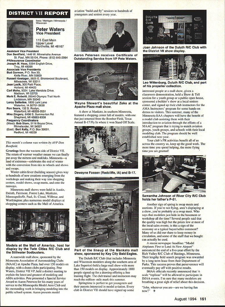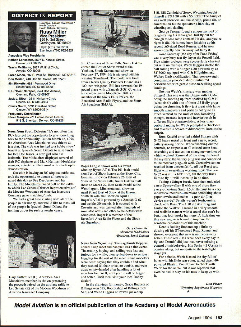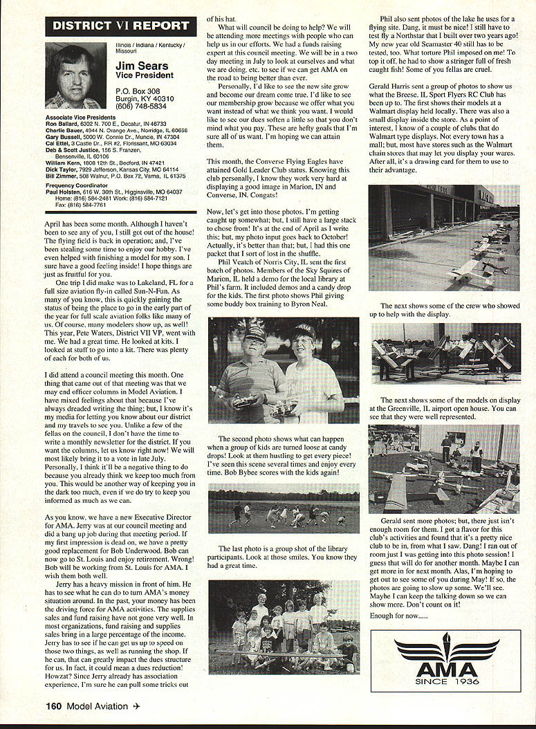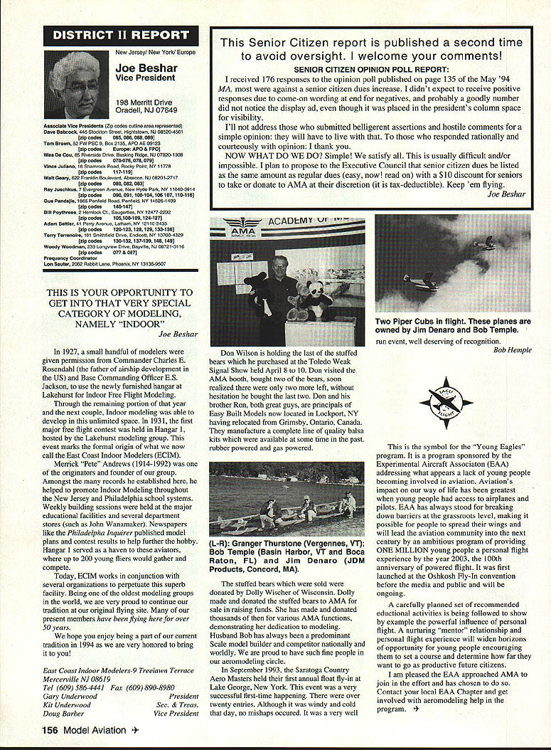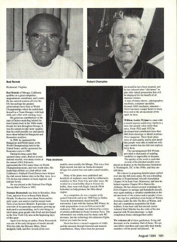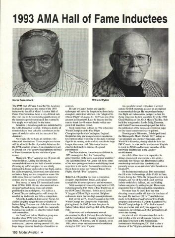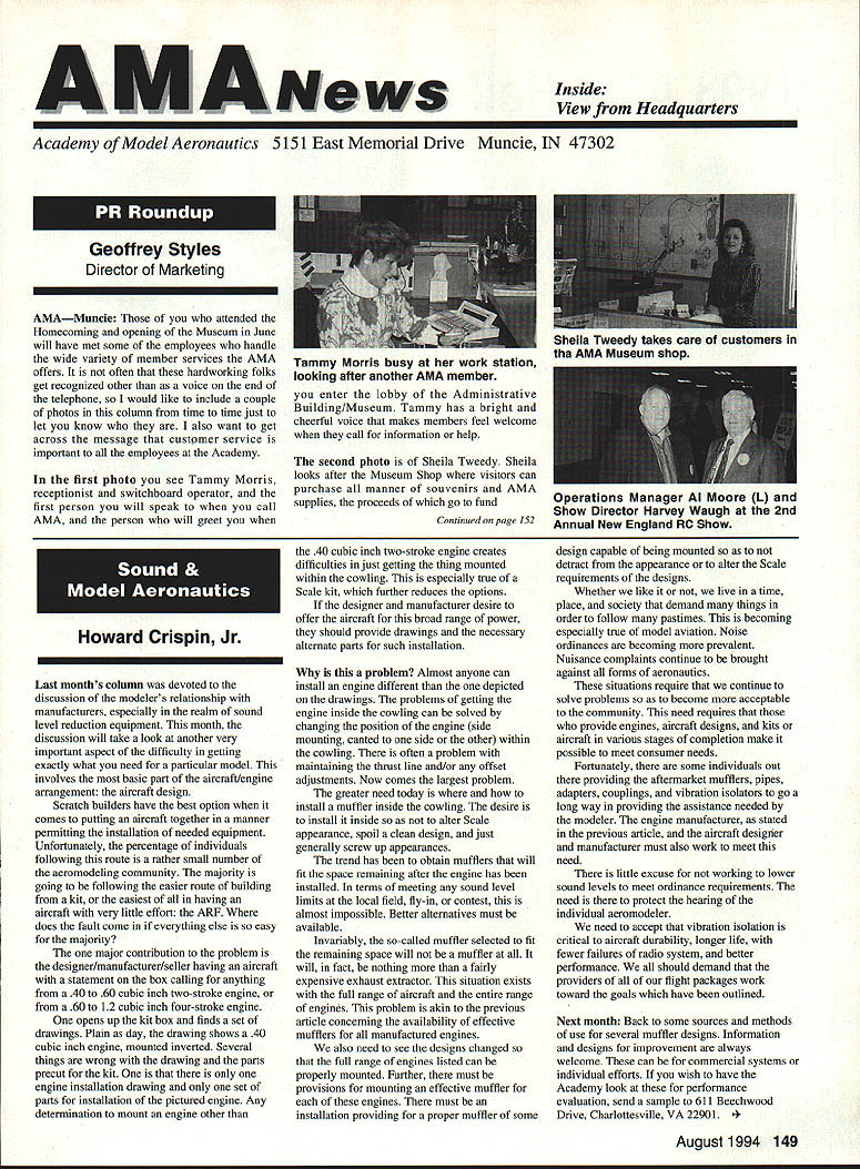 Inside View Headquarters Academy Model Aeronautics 5151 East Memorial Drive Muncie IN 47302 Geoffrey Styles Director Marketing AMAMuncie Those attended Homecoming opening Museum June will have met some employees handle wide variety member services AMA offers often hardworking folks get recognized other voice end telephone would like include couple photos column time time just let know also want get across message custpmer service important employees Academy first photo see Tammy Morris receptionist switchboard operator first person will speak call AMA person will greet Sheila Tweedy takes care ot customers tha AMA Museum shop Tammy Morris busy work station looking after another AMA member enter lobby Administrative Building/Museum Tammy has bright cheerful voice makes members feel welcome call information help second photo Sheila Tweedy Sheila looks after Museum Shop visitors can purchase manner souvenirs AMA supplies proceeds go fund Continued page 152 Last months column devoted discussion modelers relationship manufacturers especially realm sound level reduction equipment month discussion will take look another very important aspect difficulty getting exactly what need particular model involves basic part aircraft/engine arrangement aircraft design Scratch builders have best option comes putting aircraft together manner pernsitting installation needed equipment Unfortunately percentage individuals following route rather small number aeromodeling community majority going following easier route building kit easiest having aircraft very little effort ARF does fault come everything else easy majority major contribution problem designer/manufacturer/seller having aircraft statement box calling anything 40 60 cubic inch two-stoke engine 60 12 cubic inch four-stroke engine opens up kit box finds set drawings Plain day drawing shows 40 cubic inch engine mounted inverted Several things wrong drawing parts precut kit engine installation drawing set parts installation pictured engine Any determination mount engine other 40 cubic inch two-stoke engine creates difficulties just getting thing mounted within cowling especially true Scale kit further reduces options designer manufacturer desire offer aircraft broad range power should provide drawings necessary alternate parts such installation problem Almost anyone can install engine different depicted drawings problems getting engine inside cowling can solved changing position engine side mounting canted side other within cowling often problem maintaining thrust line and/or offset adjustments Now comes largest problem greater need today install muffler inside cowling desire install inside alter Scale appearance spoil clean design just generally screw up appearances trend has obtain mufflers will fit space remaining after engine has installed terms meeting sound level limits local field fly-in contest almost impossible Better alternatives must available Invariably so-called muffler selected fit remaining space will muffler will fact nothing fairly expensive exhaust extractor situation exists full range aircraft entire range engines problem akin previous article concerning availability effective mufflers manufactured engines also need see designs changed full range engines listed can properly mounted Further must provisions mounting effective muffler engines must installation providing proper muffler some design capable being mounted detract appearance alter Scale requirements designs Whether like live time place society demand things order follow pastimes becoming especially true model aviation Noise ordinances becoming prevalent Nuisance complaints continue brought against forms aeronautics situations require continue solve problems become acceptable community need requires provide engines aircraft designs kits aircraft various stages completion make possible meet consumer needs Fortunately some individuals out providing aftermarket mufflers pipes adapters couplings vibration isolators go long way providing assistance needed modeler engine manufacturer stated previous article aircraft desigiier manufacturer must also work meet need little excuse working lower sound levels meet ordinance requirements need protect hearing individual aeromodeler need accept vibration isolation critical aircraft durability longer life fewer failures radio system better performance should demand providers of flight packages work toward goals have outlined Next month Back some sources methods use several muffler designs Information designs improvement always welcome can commercial systems individual efforts wish have Academy look performance evaluation send sample 611 Beechwood Drive Charlottesville VA 22901 st1994 149 Howard Crispin Jr Operations Manager Al Moore L Show Director Harvey Waugh 2nd Annual New England RC Show 1993 AMA Hall Fame Inductees 1993 Hall Fame Awards Academy pleased announce names 1993 inductees AMA Model Aviation Hall Fame Committee faced very difficult task year due outstanding qualifications numerous people nominated eventually five people selected honor Selection based guidelines established AMA Executive Council Without doubt nominees have valuable contributors sport model aviation success Academy would like thank members submitted nominations people chosen will added list possible inductees 1994 selection process Congratulations well-deserved recognition Hall Fame enhanced addition names Merrick S Pete Andrews 78 years old left us During lifetime accomplished much field model aviation Growing up Philadelphia vitally interested Indoor outdoor free flight skills progressed focused more Indoor flying competition scene skills made him successful contests entered became serious record setter Pete served US international teams 1970 1980 also renowned designer plans articles published model press skills Contest Director organizer will always recalled friends fellow competitors Lakehurst New Jersey Naval Air Station dirigible hangar became available In