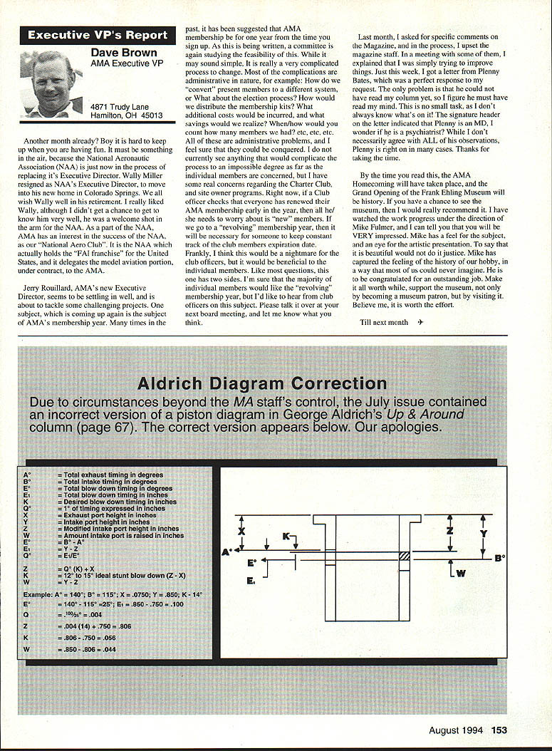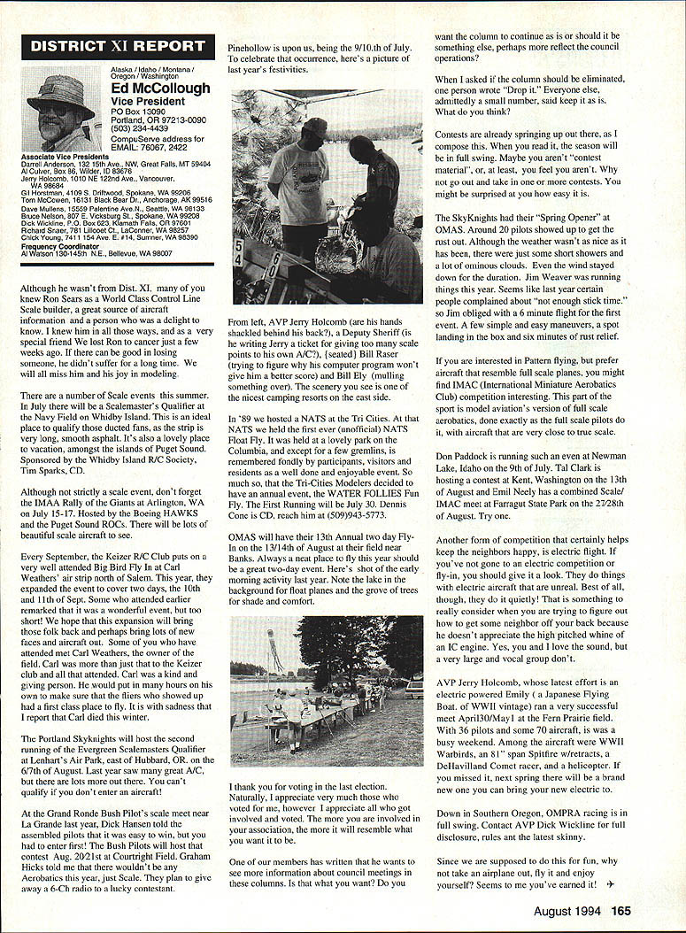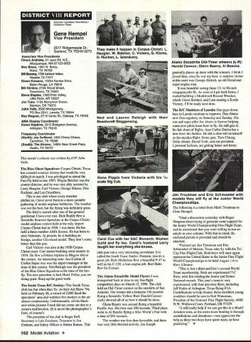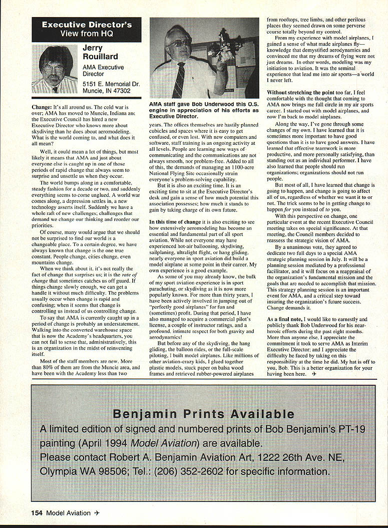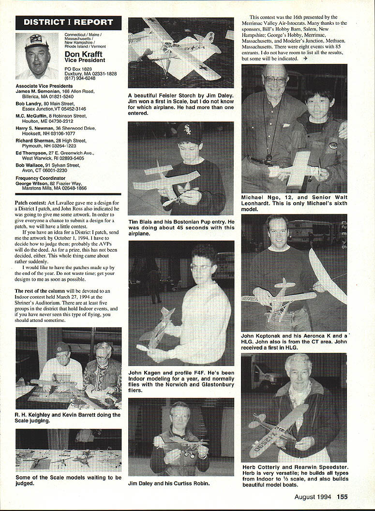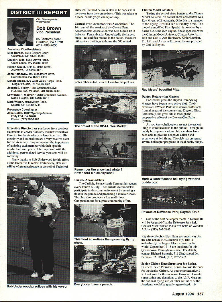 Inside View Headquarters Academy Model Aeronautics 5151 East Memorial Drive Muncie IN 47302 Geoffrey Styles Director Marketing AMAMuncie Those attended Homecoming opening Museum June will have met some employees handle wide variety member services AMA offers often hardworking folks get recognized other voice end telephone would like include couple photos column time time just let know also want get across message custpmer service important employees Academy first photo see Tammy Morris receptionist switchboard operator first person will speak call AMA person will greet Sheila Tweedy takes care ot customers tha AMA Museum shop Tammy Morris busy work station looking after another AMA member enter lobby Administrative Building/Museum Tammy has bright cheerful voice makes members feel welcome call information help second photo Sheila Tweedy Sheila looks after Museum Shop visitors can purchase manner souvenirs AMA supplies proceeds go fund Continued page 152 Last months column devoted discussion modelers relationship manufacturers especially realm sound level reduction equipment month discussion will take look another very important aspect difficulty getting exactly what need particular model involves basic part aircraft/engine arrangement aircraft design Scratch builders have best option comes putting aircraft together manner pernsitting installation needed equipment Unfortunately percentage individuals following route rather small number aeromodeling community majority going following easier route building kit easiest having aircraft very little effort ARF does fault come everything else easy majority major contribution problem designer/manufacturer/seller having aircraft statement box calling anything 40 60 cubic inch two-stoke engine 60 12 cubic inch four-stroke engine opens up kit box finds set drawings Plain day drawing shows 40 cubic inch engine mounted inverted Several things wrong drawing parts precut kit engine installation drawing set parts installation pictured engine Any determination mount engine other 40 cubic inch two-stoke engine creates difficulties just getting thing mounted within cowling especially true Scale kit further reduces options designer manufacturer desire offer aircraft broad range power should provide drawings necessary alternate parts such installation problem Almost anyone can install engine different depicted drawings problems getting engine inside cowling can solved changing position engine side mounting canted side other within cowling often problem maintaining thrust line and/or offset adjustments Now comes largest problem greater need today install muffler inside cowling desire install inside alter Scale appearance spoil clean design just generally screw up appearances trend has obtain mufflers will fit space remaining after engine has installed terms meeting sound level limits local field fly-in contest almost impossible Better alternatives must available Invariably so-called muffler selected fit remaining space will muffler will fact nothing fairly expensive exhaust extractor situation exists full range aircraft entire range engines problem akin previous article concerning availability effective mufflers manufactured engines also need see designs changed full range engines listed can properly mounted Further must provisions mounting effective muffler engines must installation providing proper muffler some design capable being mounted detract appearance alter Scale requirements designs Whether like live time place society demand things order follow pastimes becoming especially true model aviation Noise ordinances becoming prevalent Nuisance complaints continue brought against forms aeronautics situations require continue solve problems become acceptable community need requires provide engines aircraft designs kits aircraft various stages completion make possible meet consumer needs Fortunately some individuals out providing aftermarket mufflers pipes adapters couplings vibration isolators go long way providing assistance needed modeler engine manufacturer stated previous article aircraft desigiier manufacturer must also work meet need little excuse working lower sound levels meet ordinance requirements need protect hearing individual aeromodeler need accept vibration isolation critical aircraft durability longer life fewer failures radio system better performance should demand providers of flight packages work toward goals have outlined Next month Back some sources methods use several muffler designs Information designs improvement always welcome can commercial systems individual efforts wish have Academy look performance evaluation send sample 611 Beechwood Drive Charlottesville VA 22901 st1994 149 Howard Crispin Jr Operations Manager Al Moore L Show Director Harvey Waugh 2nd Annual New England RC Show 1993 AMA Hall Fame Inductees 1993 Hall Fame Awards Academy pleased announce names 1993 inductees AMA Model Aviation Hall Fame Committee faced very difficult task year due outstanding qualifications numerous people nominated eventually five people selected honor Selection based guidelines established AMA Executive Council Without doubt nominees have valuable contributors sport model aviation success Academy would like thank members submitted nominations people chosen will added list possible inductees 1994 selection process Congratulations well-deserved recognition Hall Fame enhanced addition names Merrick S Pete Andrews 78 years old left us During lifetime accomplished much field model aviation Growing up Philadelphia vitally interested Indoor outdoor free flight skills progressed focused more Indoor flying competition scene skills made him successful contests entered became serious record setter Pete served US international teams 1970 1980 also renowned designer plans articles published model press skills Contest Director organizer will always recalled friends fellow competitors Lakehurst New Jersey Naval Air Station dirigible hangar became available In