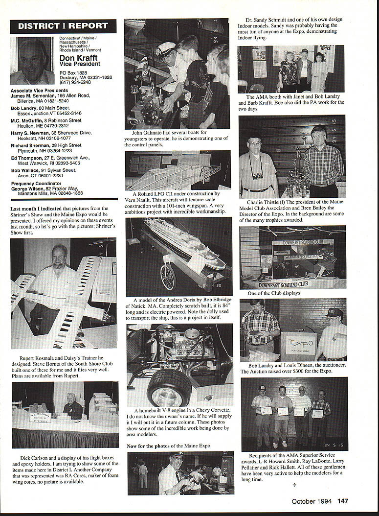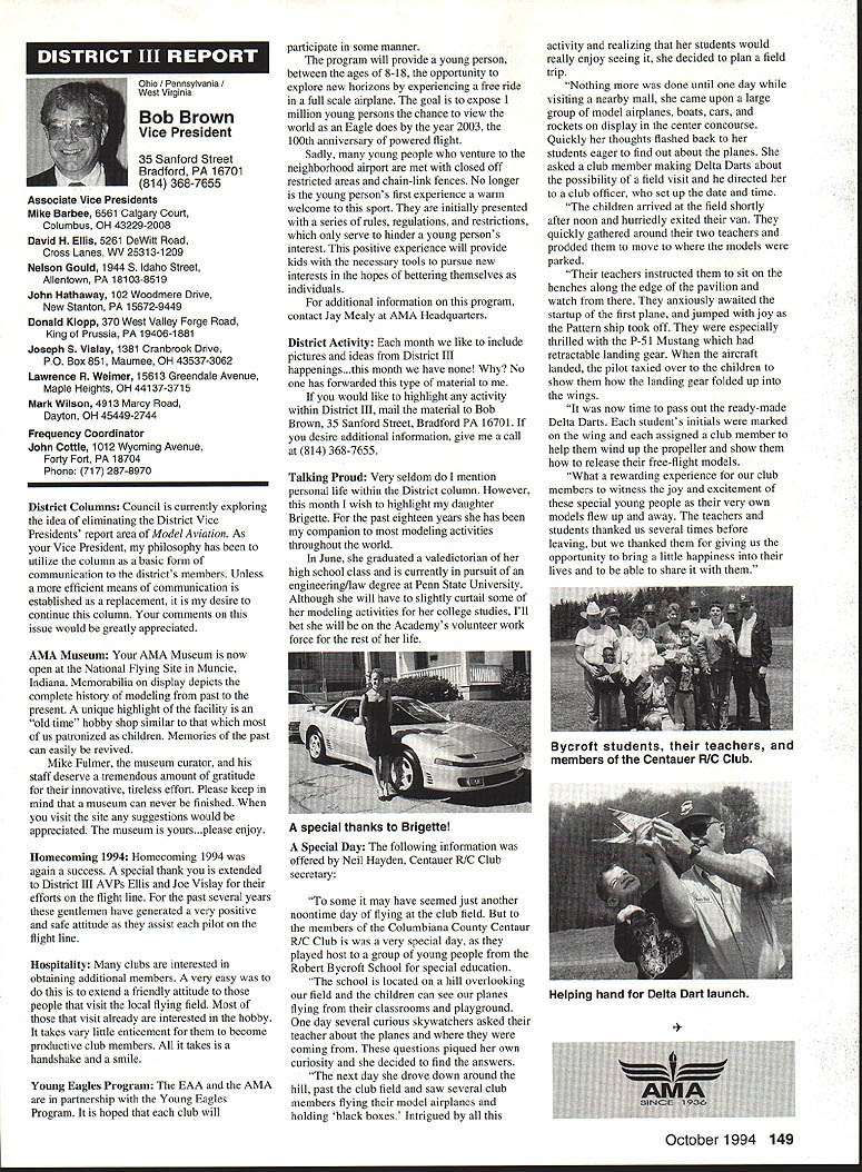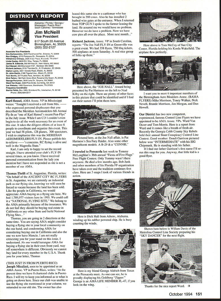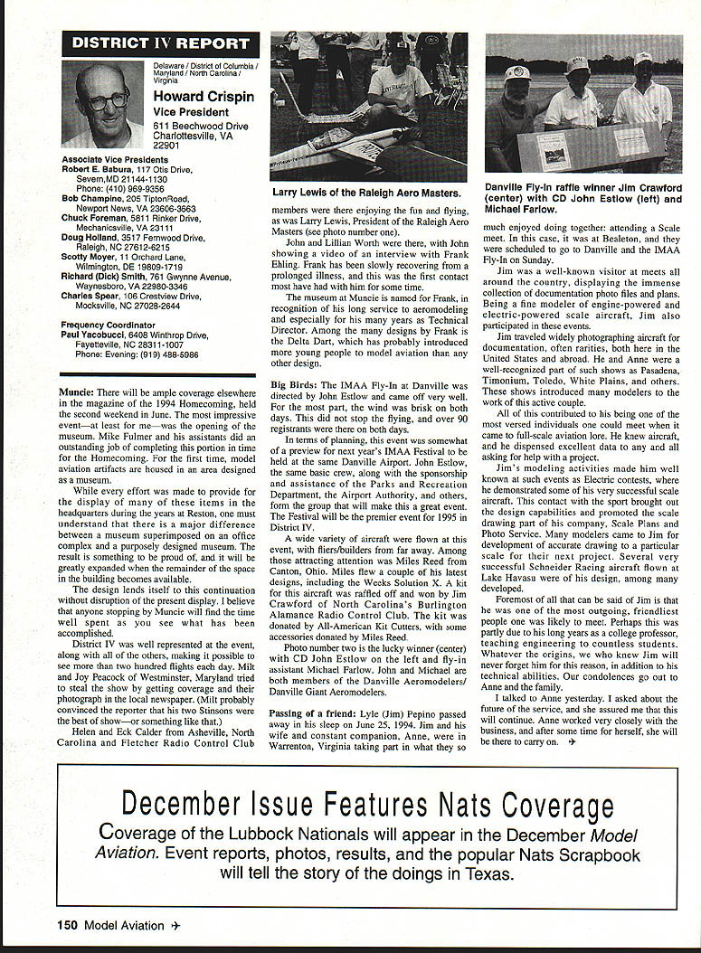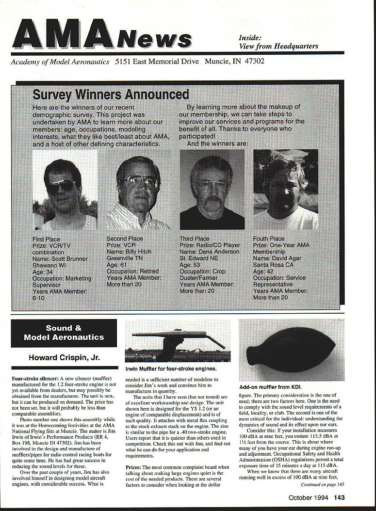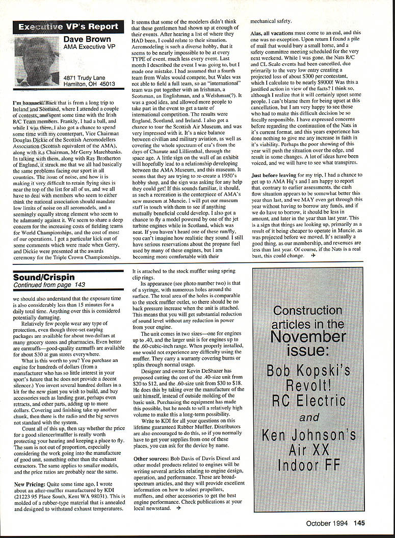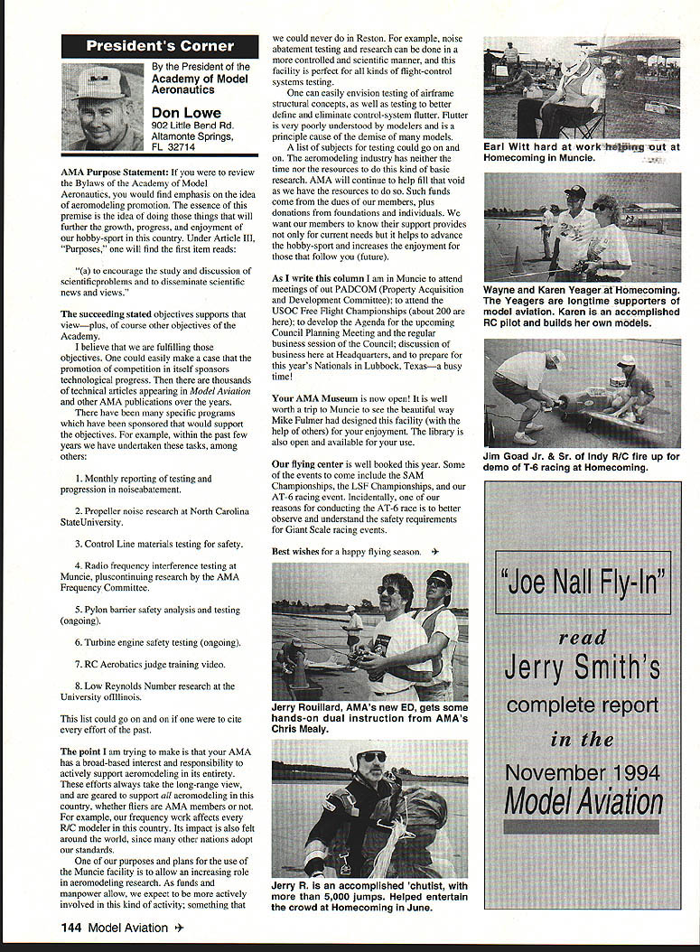 Anws Inside View Headquarters Academy Model Aeronautics 5151 East Memorial Drive Muncie IN 47302 Four-stroke silencer new silencer muffler manufactured 12 four-stroke engine yet available dealers may possibly obtained manufacturer unit new can produced demand price has set will probably less tan comparable assemblies Photo number shows assembly Homecoming festivities AMA National flying Site Muncie maker Jim Irwin Irwins Performance Products RR 4 Box 198 Muncie IN 47302 Jim has involved design manufacture mufflers/pipes radio control racing boats quite some time has great success reducing sound levels Over past couple years Jim has also involved himself designing model aircraft engines considerable success What needed sufficient number modelers consider Jims work convince him manufacture quantity units tat have seen tested excellent workmanship design unit shown designed YS 12 engine comparable displacement such quality attaches wit metal flex coupling stock exhaust stack engine size similar te pipe 40 two-stroke engine Users report quieter tan others used competition Check out wit Jim find out what can application requirements Prices common complaint heard taiking about making large engines quiet cost te needed products several factors consider looking dollar figure primary consideration te need two factors need comply sound level requirements field locaiity club second critical individual understanding dynamics sound its effect upon ears Consider installation measures 100 dBA nine feet endure 1155 dBA 11/2 feet source about have ear during engine mn-up adjustment Occupational Safety Health Administration OSHA regulations permit total exposure time 15 minutes day 115 dRA know aircraft running well excess 100 dBA nine feet Continued page 145 October 1994 143 Howard Crispin Jr Irwin Muffler four-stroke engines Add-on muffler KDI Don Lowe 902 Little Bend Rd Altamonte Springs FL 32714 AMA Purpose Statement review Bylaws Academy Model Aeronautics would find emphasis idea aeromodeling promotion essence premise idea doing things will further growth progress enjoyment hobby-sport counny Under Article III Purposes will find first item reads encourage study discussion scientifieproblems disseminate scientific news views succeeding stated objectives supports viewplus course other objectives Academy believe fulfilling objectives could easily make case promotion competition itself sponsors technological progress thousands technical articles appearing Model Aviarion other AMA publications over years have specific programs have sponsored would support objectives example within past few years have undertaken tasks among others 1 Monthly reporting testing progression noiseabatement 2 Propeller noise research North Carolina StateUniversity 3 Control Line materials testing safety 4 Radio frequency interference testing Muncie pluscontinuing research AMA Frequency Committee 5 Pylon barrier safety analysis testing ongoing 6 Turbine engine safety testing ongoing 7 RC Aerobatics judge training video 8 Low Reynolds Number research University ofillinois list could go on cite effort past point am trying make AMA has broad-based interest responsibility actively support aeromodeling its entirety efforts always take long-range view geared support aeromodeling country whether fliers AMA members example frequency work affects RIC modeler country Its impact also felt around world since other nations adopt standards purposes plans use Muncie facility allow increasing role aeromodeling research As funds manpower allow expect actively involved kind activity something could never Reston example noise abatement testing research can done controlled scientific manner facility perfect kinds flight-control systems testing can easily envision testing airframe structural concepts well testing better define eliminate control-system flutter Flutter very poorly understood modelers principle cause demise models list subjects testing could go on aeromodeling industry has neither time nor resources kind basic research AMA will continue help fill void have resources Such funds come dues members plus donations foundations individuals want members know support provides current needs helps advance hobby-sport increases enjoyment follow future As write column am Muncie attend meetings out PADCOM Property Acquisition Development Committee attend USOC Free Flight Championships about 200 develop Agenda upcoming Council Planning Meeting regular business session Council discussion business Headquarters prepare years Nationals Lubbock Texasa busy time AMA Museum now open well worth trip Muncie see beautiful way Mike Fulmer designed facility help others enjoyment library also open available use flying center well booked year Some events come include SAM Championships LSF Championships AT-6 racing event Incidentally reasons conducting AT-6 race better observe understand safety requirements Giant Scale racing events Best wishes happy flying season Model Aviation 4By President Academy Model Aeronautics Earl Witt hard workI# out Homecoming Muncie Wayne Karen Veager Homecoming Yeagers longtime supporters model aviation Karen accomplished RC pilot builds own models im uoaa Jr & r OT may HII Tire up tor demo T-6 racing Homecoming hands-on dual instruction AMAs Chris Mealy Jerry H accomplished chulist 5000 jumps Helped entertain crowd Homecoming June Im baaaeiIiBack long trip Ireland Sbotland attended couple contests aspent some time Irish RJC Team memiers Frankly ball also got chance spend some time counterpart Vice Chairman Douglas Dickie Scottish Aeromodellers Association Scottish equivalent AMA along its Chairman Mr Gerry Marchbanks talking along Ray Brotherton England struck basically same problems facing sport countries issue noise making very difficult retain flying sites near top list us have deal members seem either think national association should mandate low limits noise aeromodels seemingly equally strong element seem adamantly against seem s
