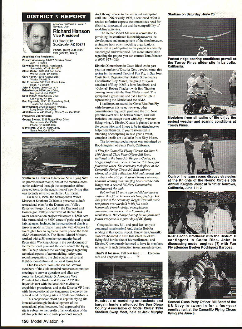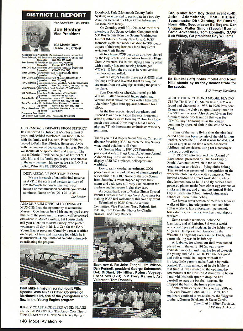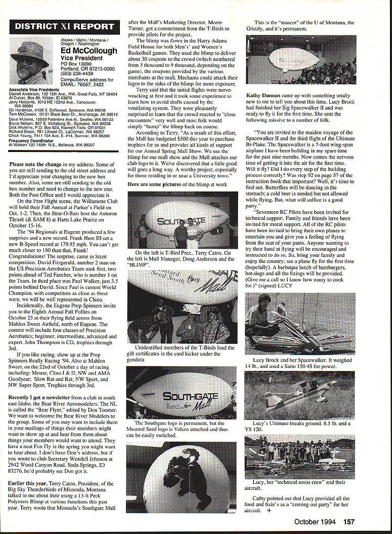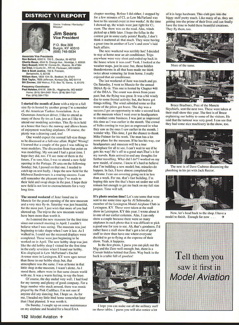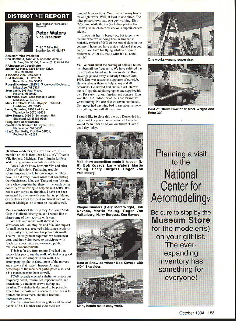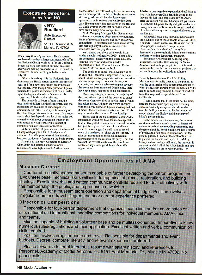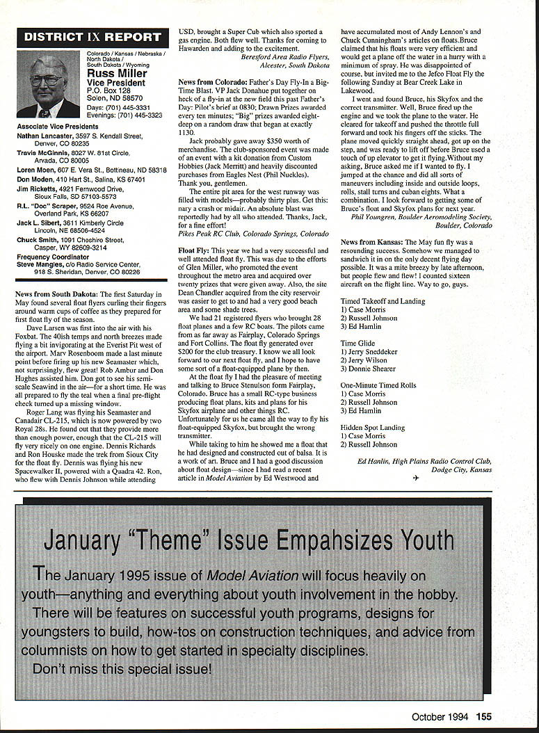 Anws Inside View Headquarters Academy Model Aeronautics 5151 East Memorial Drive Muncie IN 47302 Four-stroke silencer new silencer muffler manufactured 12 four-stroke engine yet available dealers may possibly obtained manufacturer unit new can produced demand price has set will probably less tan comparable assemblies Photo number shows assembly Homecoming festivities AMA National flying Site Muncie maker Jim Irwin Irwins Performance Products RR 4 Box 198 Muncie IN 47302 Jim has involved design manufacture mufflers/pipes radio control racing boats quite some time has great success reducing sound levels Over past couple years Jim has also involved himself designing model aircraft engines considerable success What needed sufficient number modelers consider Jims work convince him manufacture quantity units tat have seen tested excellent workmanship design unit shown designed YS 12 engine comparable displacement such quality attaches wit metal flex coupling stock exhaust stack engine size similar te pipe 40 two-stroke engine Users report quieter tan others used competition Check out wit Jim find out what can application requirements Prices common complaint heard taiking about making large engines quiet cost te needed products several factors consider looking dollar figure primary consideration te need two factors need comply sound level requirements field locaiity club second critical individual understanding dynamics sound its effect upon ears Consider installation measures 100 dBA nine feet endure 1155 dBA 11/2 feet source about have ear during engine mn-up adjustment Occupational Safety Health Administration OSHA regulations permit total exposure time 15 minutes day 115 dRA know aircraft running well excess 100 dBA nine feet Continued page 145 October 1994 143 Howard Crispin Jr Irwin Muffler four-stroke engines Add-on muffler KDI Don Lowe 902 Little Bend Rd Altamonte Springs FL 32714 AMA Purpose Statement review Bylaws Academy Model Aeronautics would find emphasis idea aeromodeling promotion essence premise idea doing things will further growth progress enjoyment hobby-sport counny Under Article III Purposes will find first item reads encourage study discussion scientifieproblems disseminate scientific news views succeeding stated objectives supports viewplus course other objectives Academy believe fulfilling objectives could easily make case promotion competition itself sponsors technological progress thousands technical articles appearing Model Aviarion other AMA publications over years have specific programs have sponsored would support objectives example within past few years have undertaken tasks among others 1 Monthly reporting testing progression noiseabatement 2 Propeller noise research North Carolina StateUniversity 3 Control Line materials testing safety 4 Radio frequency interference testing Muncie pluscontinuing research AMA Frequency Committee 5 Pylon barrier safety analysis testing ongoing 6 Turbine engine safety testing ongoing 7 RC Aerobatics judge training video 8 Low Reynolds Number research University ofillinois list could go on cite effort past point am trying make AMA has broad-based interest responsibility actively support aeromodeling its entirety efforts always take long-range view geared support aeromodeling country whether fliers AMA members example frequency work affects RIC modeler country Its impact also felt around world since other nations adopt standards purposes plans use Muncie facility allow increasing role aeromodeling research As funds manpower allow expect actively involved kind activity something could never Reston example noise abatement testing research can done controlled scientific manner facility perfect kinds flight-control systems testing can easily envision testing airframe structural concepts well testing better define eliminate control-system flutter Flutter very poorly understood modelers principle cause demise models list subjects testing could go on aeromodeling industry has neither time nor resources kind basic research AMA will continue help fill void have resources Such funds come dues members plus donations foundations individuals want members know support provides current needs helps advance hobby-sport increases enjoyment follow future As write column am Muncie attend meetings out PADCOM Property Acquisition Development Committee attend USOC Free Flight Championships about 200 develop Agenda upcoming Council Planning Meeting regular business session Council discussion business Headquarters prepare years Nationals Lubbock Texasa busy time AMA Museum now open well worth trip Muncie see beautiful way Mike Fulmer designed facility help others enjoyment library also open available use flying center well booked year Some events come include SAM Championships LSF Championships AT-6 racing event Incidentally reasons conducting AT-6 race better observe understand safety requirements Giant Scale racing events Best wishes happy flying season Model Aviation 4By President Academy Model Aeronautics Earl Witt hard workI# out Homecoming Muncie Wayne Karen Veager Homecoming Yeagers longtime supporters model aviation Karen accomplished RC pilot builds own models im uoaa Jr & r OT may HII Tire up tor demo T-6 racing Homecoming hands-on dual instruction AMAs Chris Mealy Jerry H accomplished chulist 5000 jumps Helped entertain crowd Homecoming June Im baaaeiIiBack long trip Ireland Sbotland attended couple contests aspent some time Irish RJC Team memiers Frankly ball also got chance spend some time counterpart Vice Chairman Douglas Dickie Scottish Aeromodellers Association Scottish equivalent AMA along its Chairman Mr Gerry Marchbanks talking along Ray Brotherton England struck basically same problems facing sport countries issue noise making very difficult retain flying sites near top list us have deal members seem either think national association should mandate low limits noise aeromodels seemingly equally strong element seem adamantly against seem s