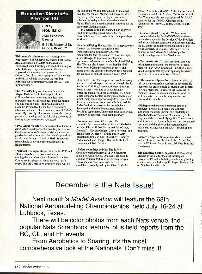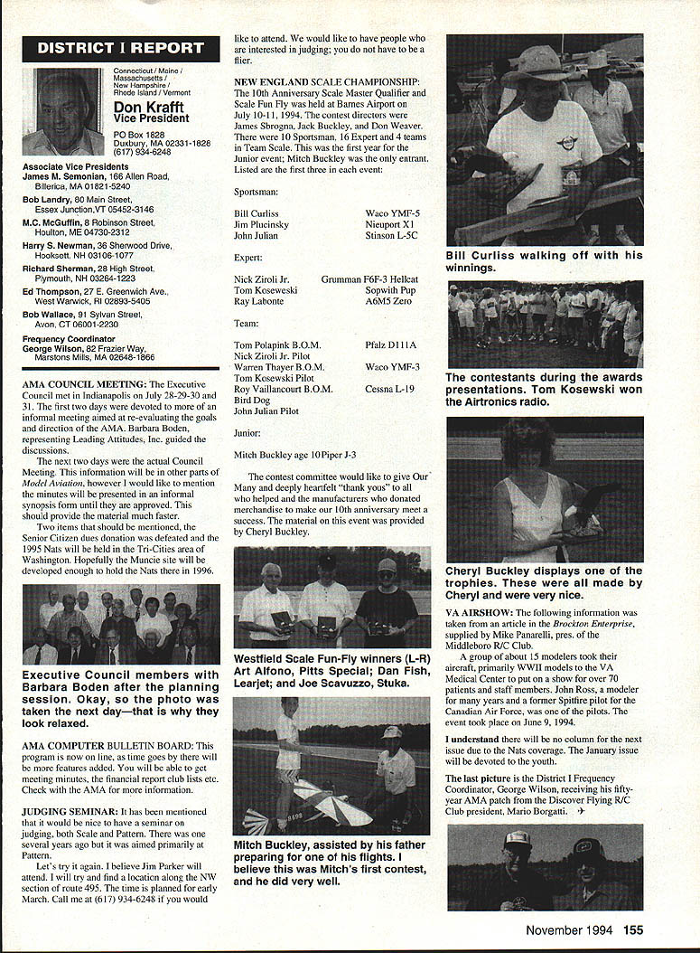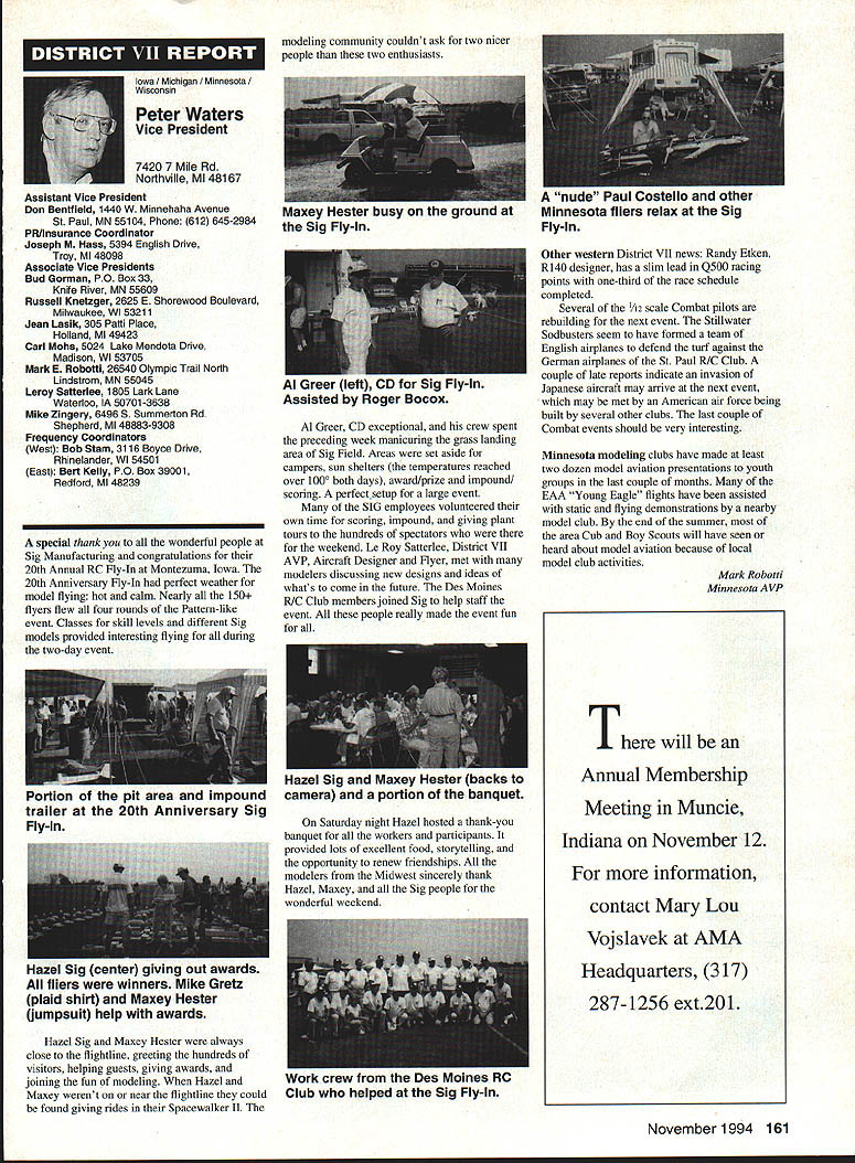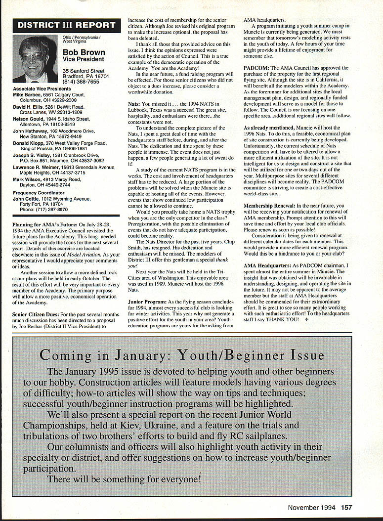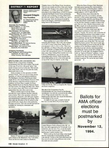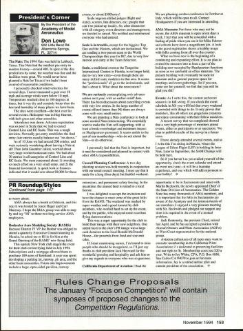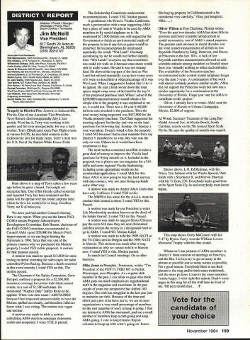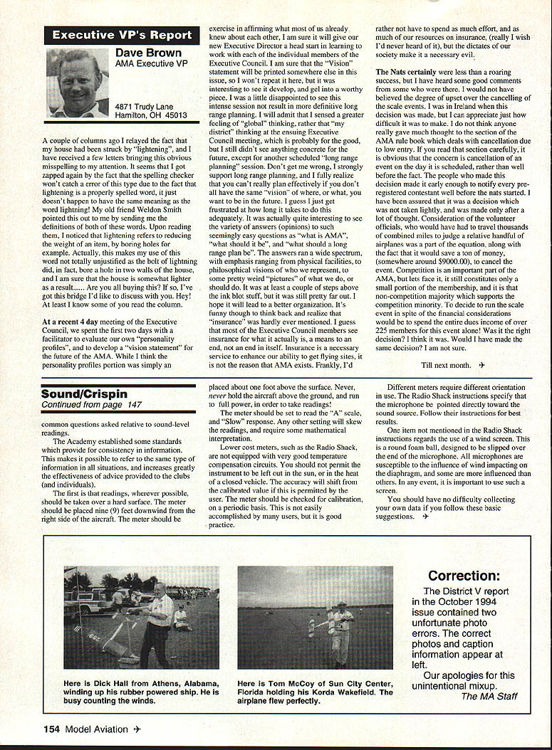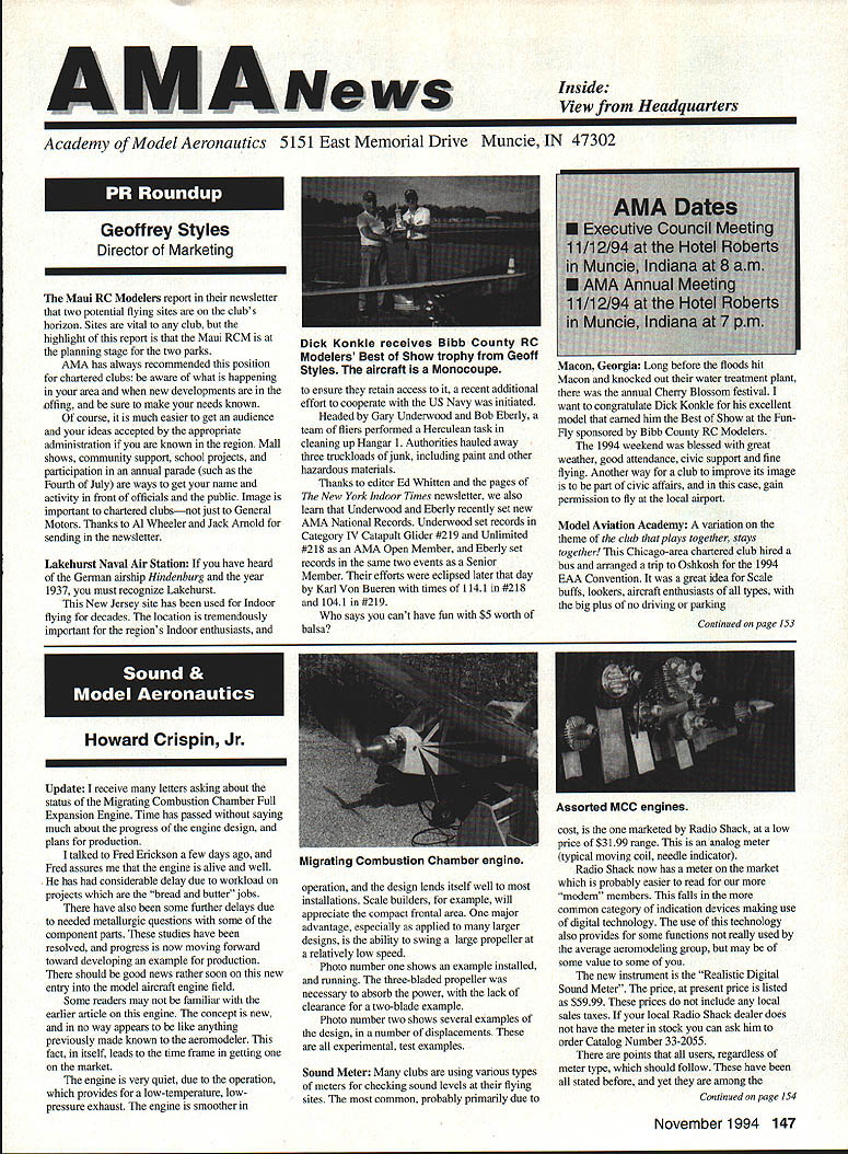 Inside View Headquarters Academy Model Aeronautics 5151 East Memorial Drive Muncie IN 47302 Director Marketing Maui RC Modelers report newsletter two potential flying sites clubs horizon Sites vital club highlight report Maui RCM planning stage two parks AMA has always recommended position chartered clubs aware what happening area new developments rffing sure make needs known course much easier get audience ideas accepted appropriate administration known region Mall shows community support school projects participation annual parade such Fourth July ways get name activity front officials public Image important chartered clubsnot just General Motors Thanks Al Wheeler Jack Arnold sending newsletter Lakehurst Naval Air Station have heard German airship Hindenburg year 1937 must recognize Lakehurst New Jersey site has used Indoor flying decades location tremendously important regions Indoor enthusiasts ensure retain access recent additional effort cooperate US Navy initiated Headed Gary Underwood Bob Eberly team fliers performed Herculean task cleaning up Hangar 1 Authorities hauled away three truckloads junk including paint other hazardous materials Thanks editor Ed Whitten pages New York Indoor Times newsletter also leam Underwood Eberly recently set new AMA National Records Underwood set records Category IV Catapult Glider #219 Unlimited #218 AMA Open Member Eberly set records same two events Senior Member efforts eclipsed later day Karl Von Bueren times 1141 #218 1041 #219 says cant have fun $5 worth balsa Macon Georgia Long before floods hit Macon knocked Out water treatment plant annual Cheny Blossom festival want congratulate Dick Konide excellent model eamed him Best Show FunFly sponsored Bibb County RC Modelers 1994 weekend blessed great weather good attendance civic support fine flying Another way club improve its image part civic affairs case gain permission fly local airport Model Aviation Academy variation theme club plays together stays together Chicago-area chartered club hired bus arranged trip Oshkosh 1994 EAA Convention great idea Scale buffs lookers aircraft enthusiasts types big plus no driving parking Continued page JSS Update receive letters asking about status Migrating Combustion Chamber Full Expansion Engine Time has passed saying much about progress engine design plans production talked Fred Erickson few days ago Fred assures engine alive well has considerable delay due workload projects bread butter jobs have also some further delays due needed metallurgic questions some component parts studies have resolved progress now moving forward toward developing example production should good news rather soon new entry model aircraft engine field Some readers may familiar earlier article engine concept new no way appears like anything previously made known aeromodeler fact itself leads time frame getting market engine very quiet due operation provides low-temperature lowpressure exhaust engine smoother operation design lends itself well installations Scale builders example will appreciate compact frontal area major advantage especially applied larger designs ability swing large propeller relatively low speed Photo number shows example installed running three-bladed propeller necessary absorb power lack clearance two-blade example Photo number two shows several examples design number displacements experimental test examples Sound Meter clubs using various types meters checking sound levels flying sites common probably primarily due cost marketed Radio Shack low price $3199 range analog meter typical moving coil needle indicator Radio Shack now has meter market probably easier read modem members falls common category indication devices making use digital technology use technology also provides some functions really used average aeromodeling group may some value some new instrument Realistic Digital Sound Meter price present price listed $5999 prices include local sales taxes local Radio Shack dealer does have meter stock can ask him order Catalog Number 33-2055 points users regardless meter type should follow have stated before yet among Continued page 154 November1994 147 Geoffrey Styles Dick Konkle receives Bibb County RC Modelers Best Show trophy Geoff Styles aircraft Monocoupe Howard Crispin Jr Assorted MCC engines Migrating Combustion Chamber engine Joe Beshar incumbent Having served first term am first time incumbent AMA Vice President Council Member past three years have experience supplementing aeromodeling interests AMA legislation involvement proved vehicle meeting new modeling friends learn about desires membership entry first term legislative body AMA during very critical period move Reston Muncie addition facing FCC dilemma SFA litigation course put great burden AMAs revenues challenge During tenure Assoc Vice President responsibilities addressed assigning specific areas represent areas boundaried Postal ZIP Code define District Members line communication has proved efficient effective Obtaining flying fields remain greatest problem allocating areas better able service coordinate professional help AMA headquarters whenever possible much printed material available purpose AVP can help since familiar local area have come recognize terms served District Vice Presidents Executive Council should limited am encouraging such policy now have District II shoulder patch result contest held District attractive design has proved well accepted judged great number patches obtained members Now can identified District II AMA Member Senior Citizen opinion poll resulted proposal Executive Council increase dues simply leave discount option Senior Citizen either take donate AMA development his/her option would suggest modeling business experience qualifies District II Vice President will vote will best service AMA its membership John C Grigg candidacy VP based immediate need improve communications AMA matters membership Things happen Executive Council meetings knowledge things will 