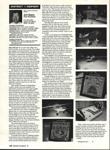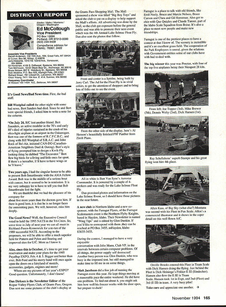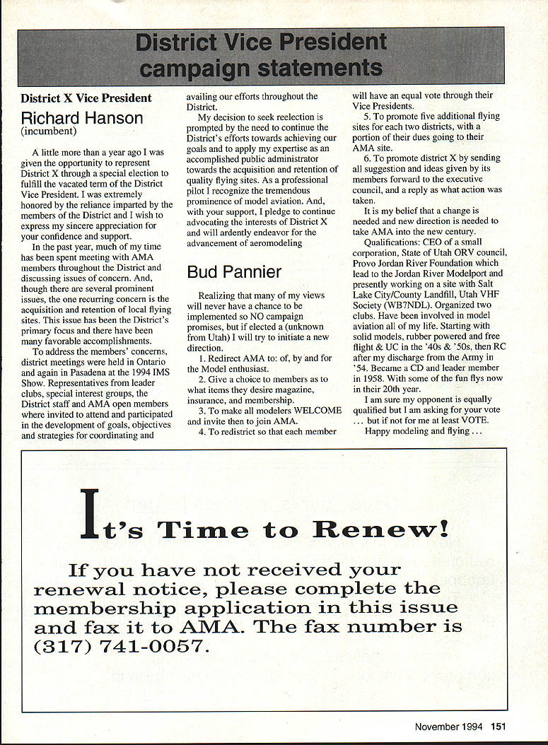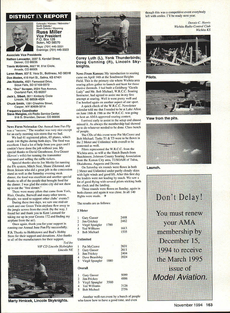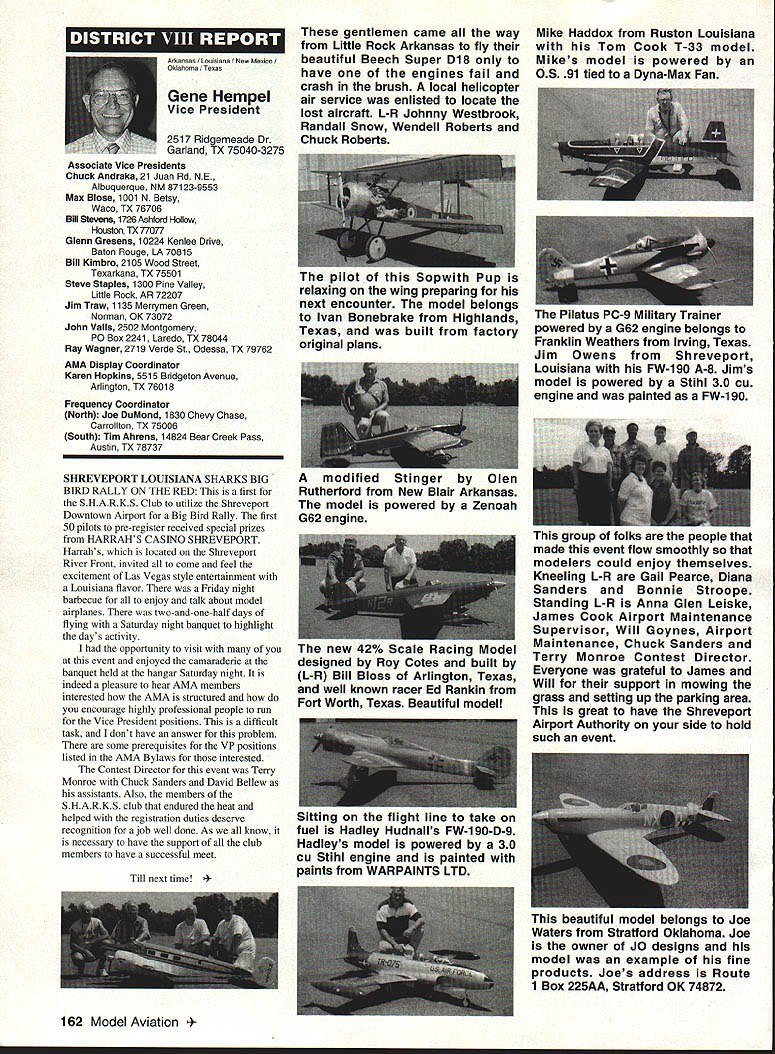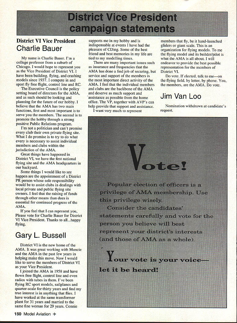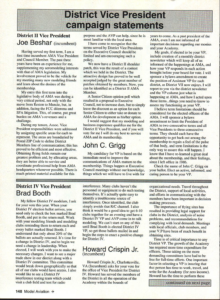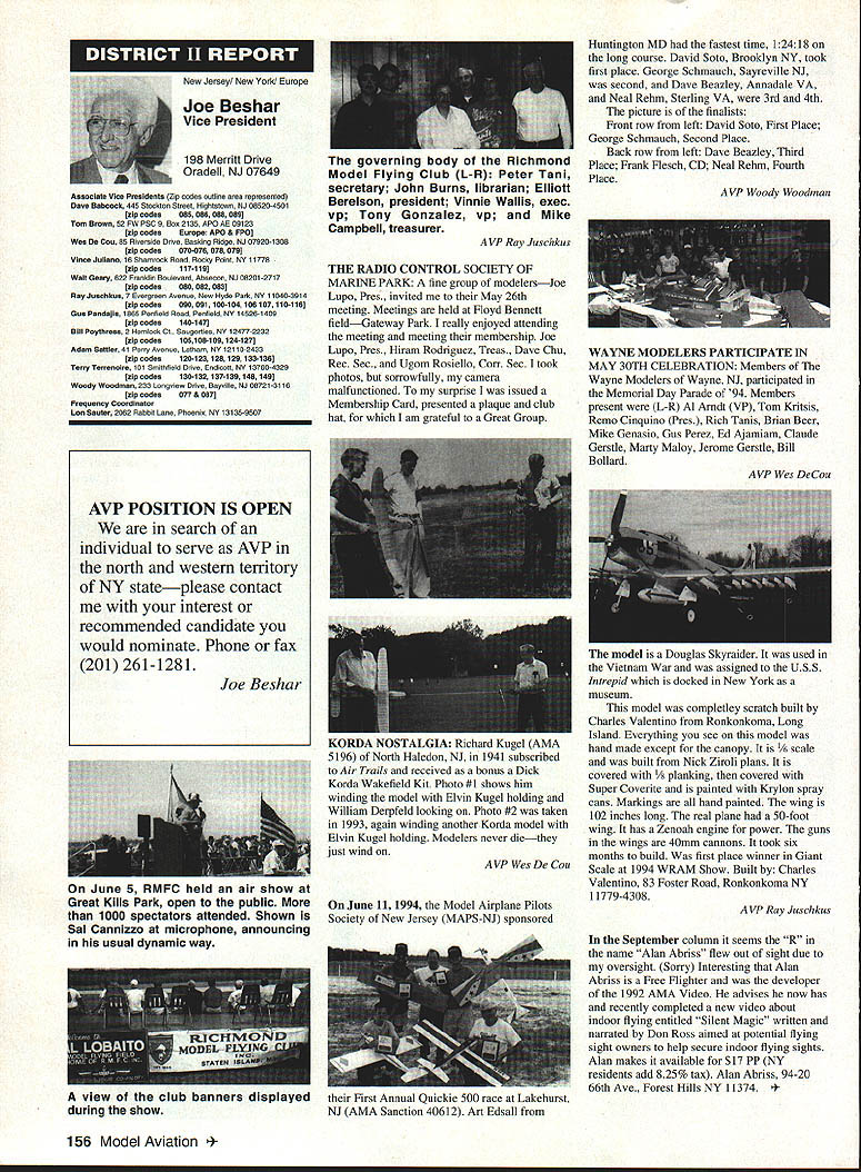 Inside View Headquarters Academy Model Aeronautics 5151 East Memorial Drive Muncie IN 47302 Director Marketing Maui RC Modelers report newsletter two potential flying sites clubs horizon Sites vital club highlight report Maui RCM planning stage two parks AMA has always recommended position chartered clubs aware what happening area new developments rffing sure make needs known course much easier get audience ideas accepted appropriate administration known region Mall shows community support school projects participation annual parade such Fourth July ways get name activity front officials public Image important chartered clubsnot just General Motors Thanks Al Wheeler Jack Arnold sending newsletter Lakehurst Naval Air Station have heard German airship Hindenburg year 1937 must recognize Lakehurst New Jersey site has used Indoor flying decades location tremendously important regions Indoor enthusiasts ensure retain access recent additional effort cooperate US Navy initiated Headed Gary Underwood Bob Eberly team fliers performed Herculean task cleaning up Hangar 1 Authorities hauled away three truckloads junk including paint other hazardous materials Thanks editor Ed Whitten pages New York Indoor Times newsletter also leam Underwood Eberly recently set new AMA National Records Underwood set records Category IV Catapult Glider #219 Unlimited #218 AMA Open Member Eberly set records same two events Senior Member efforts eclipsed later day Karl Von Bueren times 1141 #218 1041 #219 says cant have fun $5 worth balsa Macon Georgia Long before floods hit Macon knocked Out water treatment plant annual Cheny Blossom festival want congratulate Dick Konide excellent model eamed him Best Show FunFly sponsored Bibb County RC Modelers 1994 weekend blessed great weather good attendance civic support fine flying Another way club improve its image part civic affairs case gain permission fly local airport Model Aviation Academy variation theme club plays together stays together Chicago-area chartered club hired bus arranged trip Oshkosh 1994 EAA Convention great idea Scale buffs lookers aircraft enthusiasts types big plus no driving parking Continued page JSS Update receive letters asking about status Migrating Combustion Chamber Full Expansion Engine Time has passed saying much about progress engine design plans production talked Fred Erickson few days ago Fred assures engine alive well has considerable delay due workload projects bread butter jobs have also some further delays due needed metallurgic questions some component parts studies have resolved progress now moving forward toward developing example production should good news rather soon new entry model aircraft engine field Some readers may familiar earlier article engine concept new no way appears like anything previously made known aeromodeler fact itself leads time frame getting market engine very quiet due operation provides low-temperature lowpressure exhaust engine smoother operation design lends itself well installations Scale builders example will appreciate compact frontal area major advantage especially applied larger designs ability swing large propeller relatively low speed Photo number shows example installed running three-bladed propeller necessary absorb power lack clearance two-blade example Photo number two shows several examples design number displacements experimental test examples Sound Meter clubs using various types meters checking sound levels flying sites common probably primarily due cost marketed Radio Shack low price $3199 range analog meter typical moving coil needle indicator Radio Shack now has meter market probably easier read modem members falls common category indication devices making use digital technology use technology also provides some functions really used average aeromodeling group may some value some new instrument Realistic Digital Sound Meter price present price listed $5999 prices include local sales taxes local Radio Shack dealer does have meter stock can ask him order Catalog Number 33-2055 points users regardless meter type should follow have stated before yet among Continued page 154 November1994 147 Geoffrey Styles Dick Konkle receives Bibb County RC Modelers Best Show trophy Geoff Styles aircraft Monocoupe Howard Crispin Jr Assorted MCC engines Migrating Combustion Chamber engine Joe Beshar incumbent Having served first term am first time incumbent AMA Vice President Council Member past three years have experience supplementing aeromodeling interests AMA legislation involvement proved vehicle meeting new modeling friends learn about desires membership entry first term legislative body AMA during very critical period move Reston Muncie addition facing FCC dilemma SFA litigation course put great burden AMAs revenues challenge During tenure Assoc Vice President responsibilities addressed assigning specific areas represent areas boundaried Postal ZIP Code define District Members line communication has proved efficient effective Obtaining flying fields remain greatest problem allocating areas better able service coordinate professional help AMA headquarters whenever possible much printed material available purpose AVP can help since familiar local area have come recognize terms served District Vice Presidents Executive Council should limited am encouraging such policy now have District II shoulder patch result contest held District attractive design has proved well accepted judged great number patches obtained members Now can identified District II AMA Member Senior Citizen opinion poll resulted proposal Executive Council increase dues simply leave discount option Senior Citizen either take donate AMA development his/her option would suggest modeling business experience qualifies District II Vice President will vote will best service AMA its membership John C Grigg candidacy VP based immediate need improve communications AMA matters membership Things happen Executive Council meetings knowledge things will 