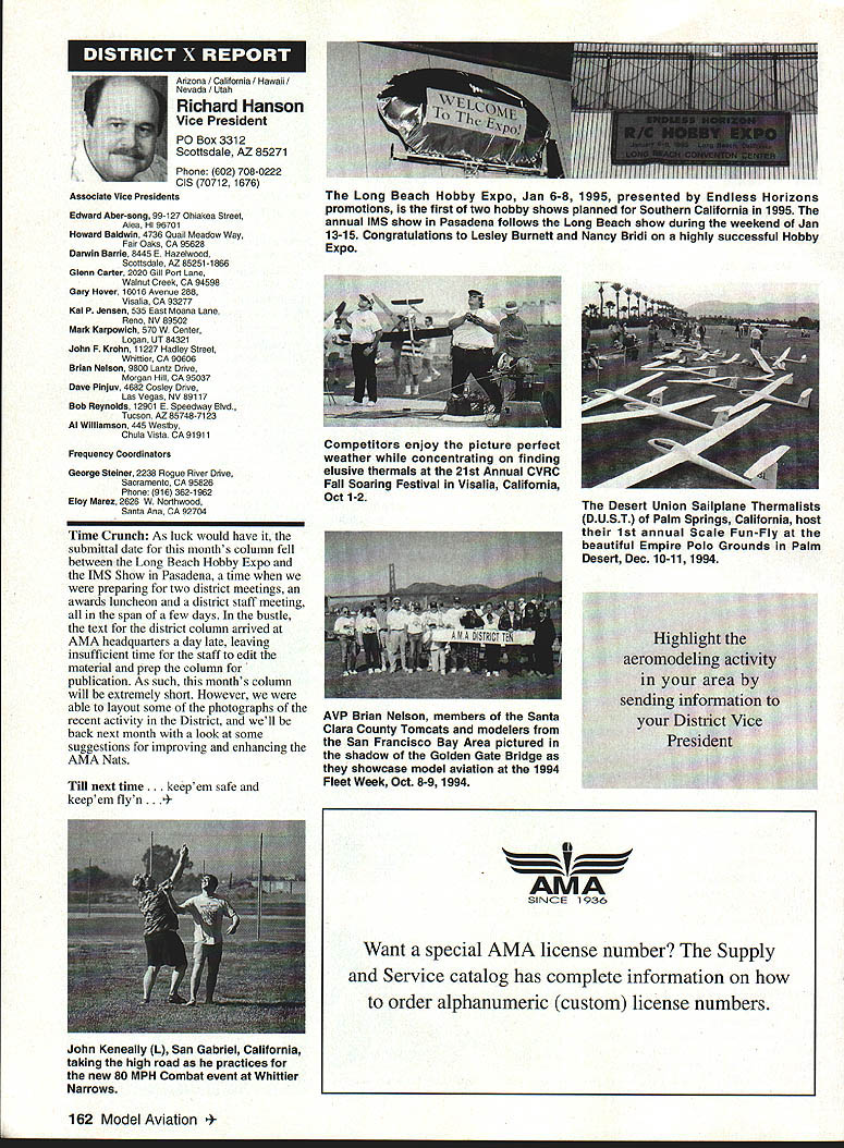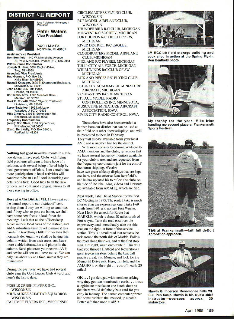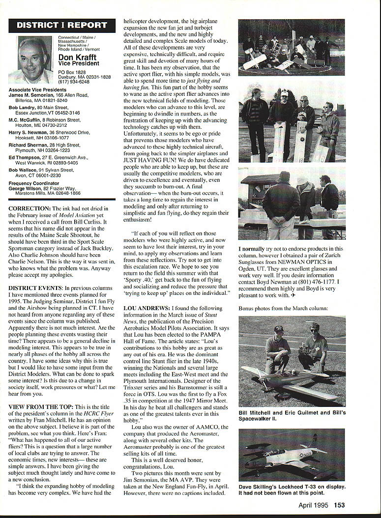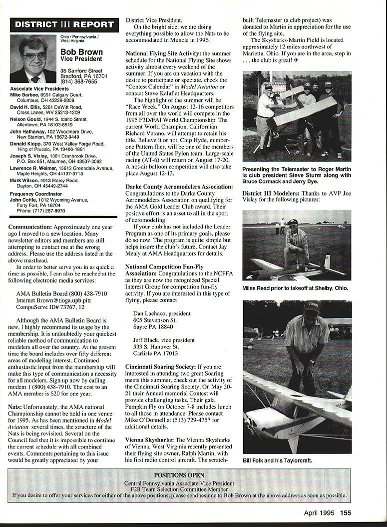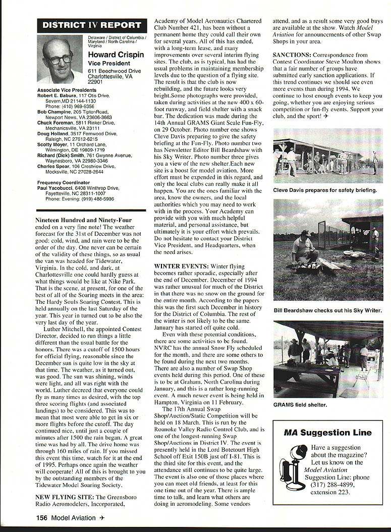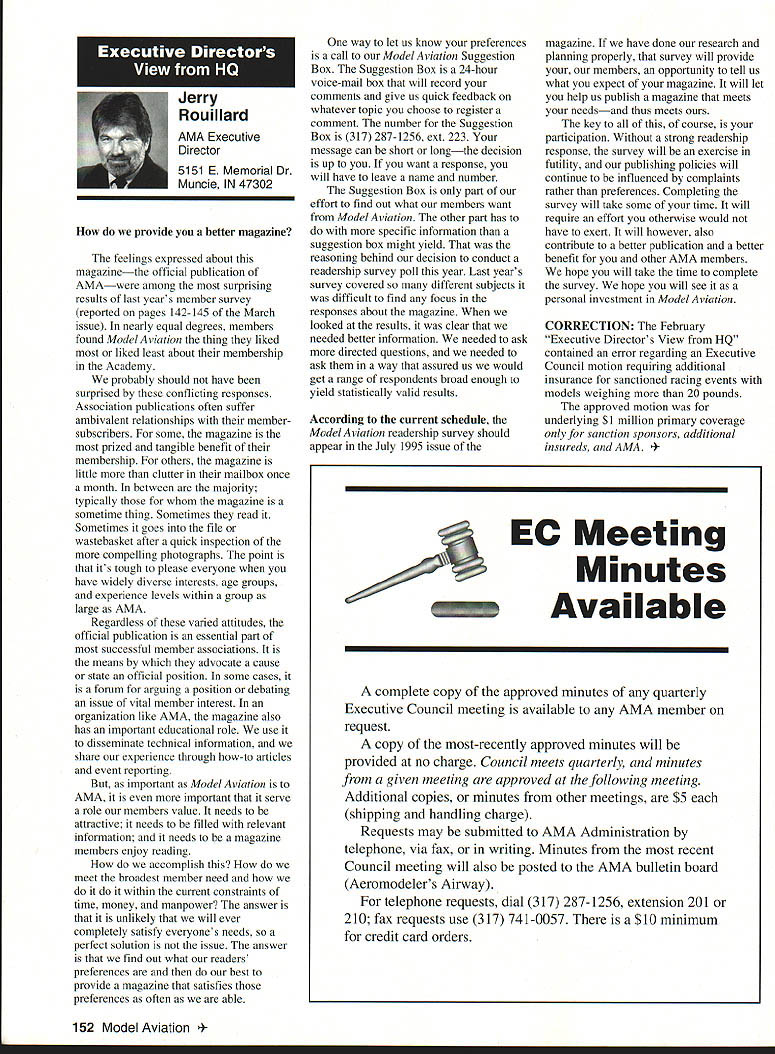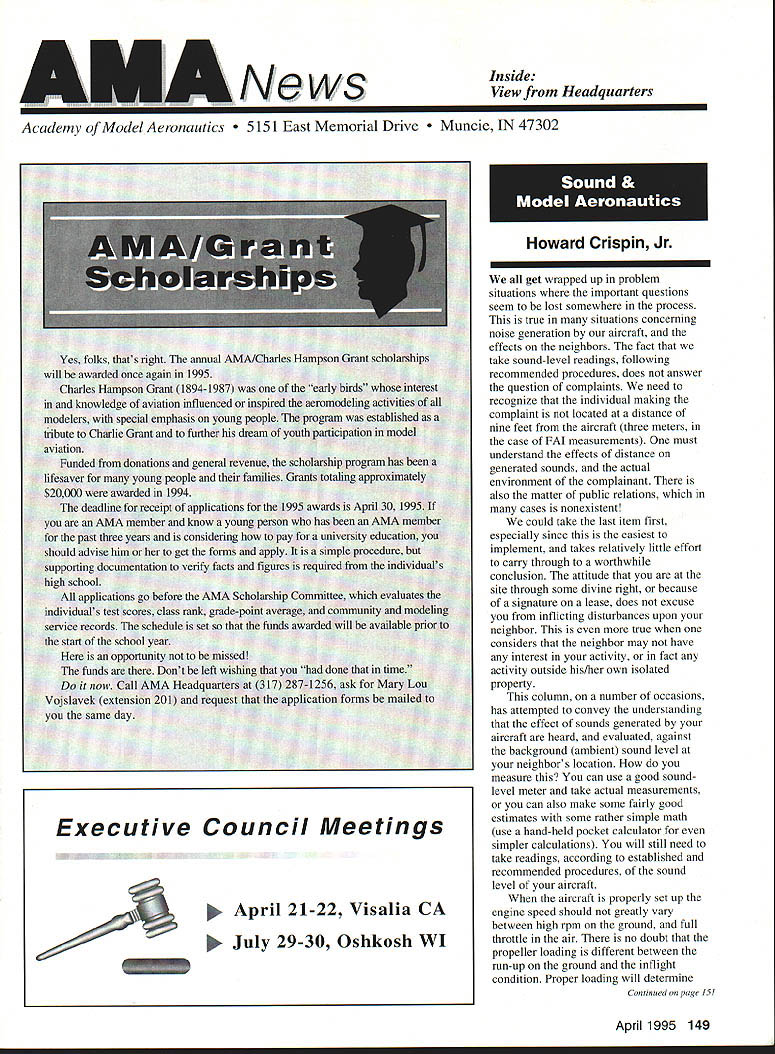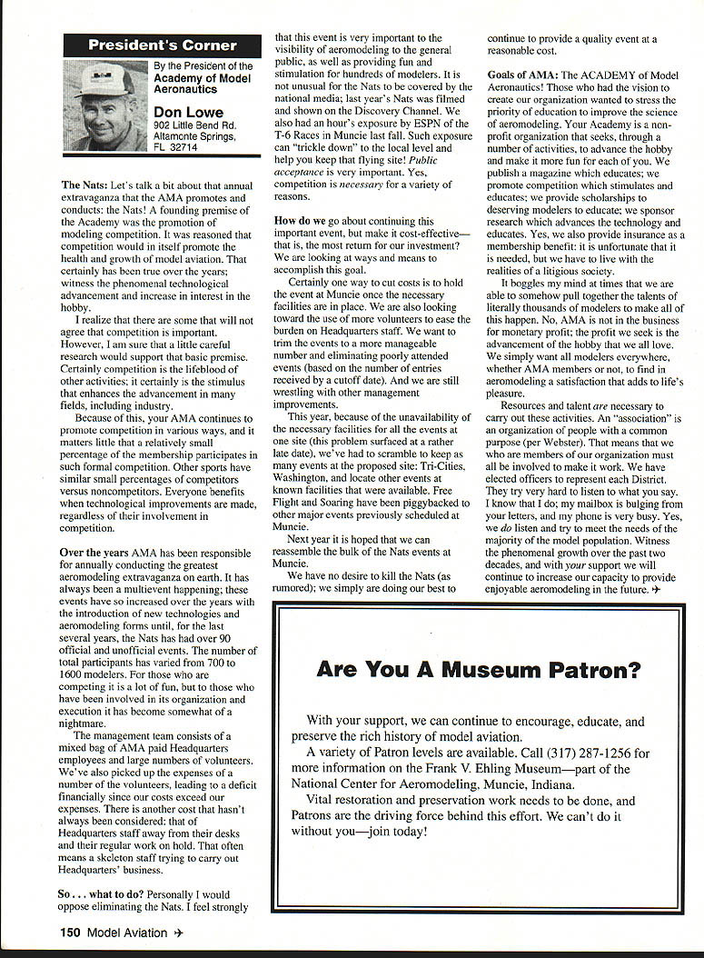 Inside View Headquarters get wrapped up problem situations important questions seem lost somewhere process true situations concerning noise generation aircraft effects neighbors fact take sound-level readings following recommended procedures does answer question complaints need recognize individual making complaint located distance nine feet aircraft three meters case FAI measurements must understand effects distance generated sounds actual environment complainant also matter puhlic relations cases nonexistent could take last item first especially since easiest implement takes relatively little effort carry through worthwhile conclusion attitude site through some divine right because signature lease does excuse inflicting disturbances upon neighbor true considers neighbor may have interest activity fact activity outside his/her own isolated property column number occasions has attempted convey understanding effect sounds generated aircraft heard evaluated against background ambient sound level neighbors location measure can use good soundlevel meter take actual measurements can also make some fairly good estimates some rather simple math use hand-held pocket calculator simpler calculations will still need take readings according established recommended procedures sound level aircraft aircraft properly set up engine speed should greatly vary between high rpm ground full throttle air no doubt propeller loading different between run-up ground inflight condition Proper loading will determine Continued poge 151 April 1995 149 Academy Model Aeronautics East Memorial Drive ie IN 47302 Howard Crispin Jr Executive Council Meetings April 21-22 Visalia CA July 29-30 Oshkosh WI Nats Lets talk bit about annual extravaganza AMA promotes conducts Nats founding premise Academy promotion modeling competition reasoned competition would itself promote health growth model aviation certainly has true over years witness phenomenal technological advancement increase interest hobby realize some will agree competition important However am sure little careful research would support basic premise Certainly competition lifeblood other activities certainly stimulus enhances advancement fields including industry Because AMA continues promote competition various ways matters little relatively small percentage membership participates such formal competition Other sports have similar small percentages competitors versus noncompetitors Everyone benefits technological improvements made regardless involvement competition Over years AMA has responsible annually conducting greatest aeromodeling extravaganza earth has always multievent happening events have increased over years introduction new technologies aeromodeling forms until last several years Nats has over 90 official unofficial events number total participants has varied 700 1600 modelers competing lot fun have involved its organization execution has become somewhat nightmare management team consists mixed bag AMA paid Headquarters employees large numbers volunteers Weve also picked up expenses number volunteers leading deficit financially since costs exceed expenses another cost hasnt always considered Headquarters staff away desks regular work hold often means skeleton staff trying carry out Headquarters business So. what Personally would oppose eliminating Nats feel strongly event very important visibility aeromodeling general public well providing fun stimulation hundreds modelers unusual Nats covered national media last years Nats filmed shown Discovery Channel also hours exposure ESPN T-6 Races Muncie last fall Such exposure can trickle down local level help keep flying site Public acceptance very important Yes competition necessary variety reasons go about continuing important event make cost-effectivethat return investment looking ways means accomplish goal Certainly way cut costs hold event Muncie once necessary facilities place also looking toward use volunteers ease burden Headquarters staff want trim events manageable number eliminating poorly attended events based number entries received cutoff date still wrestling other management improvements year because unavailability necessary facilities events site problem surfaced rather late date weve scramble keep events proposed site Tn-Cities Washington locate other events known facilities available Free Flight Soaring have piggybacked other major events previously scheduled Muncie Next year hoped can reassemble bulk Nats events Muncie have no desire kill Nats rumored simply doing best continue provide quality event reasonable cost Goals AMA ACADEMY Model Aeronautics vision create organization wanted stress priority education improve science aeromodeling Academy non profit organization seeks through number activities advance hobby make fun publish magazine educates promote competition stimulates educates provide scholarships deserving modelers educate sponsor research advances technology educates Yes also provide insurance membership benefit unfortunate needed have live realities litigious society boggles mind times able somehow pull together talents literally thousands modelers make happen No AMA business monetary profit profit seek advancement hobby love simply want modelers everywhere whether AMA members find aeromodeling satisfaction adds lifes pleasure Resources talent necessary carry out activities An association organization people common purpose per Webster means members organization must involved make work have elected officers represent District try very hard listen what say know mailbox bulging letters phone very busy Yes listen try meet needs majority model population Witness phenomenal growth over past two decades support will continue increase capacity provide enjoyable aeromodeling future Model Aviation Museum Patron support can continue encourage educate preserve rich history model aviation variety Patron levels available Call 317 287-1256 information Frank V Ehling Museumpart National Center A