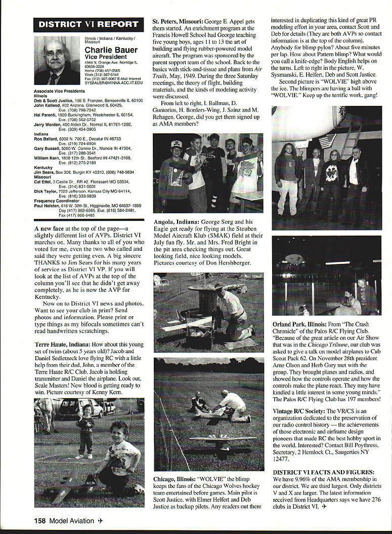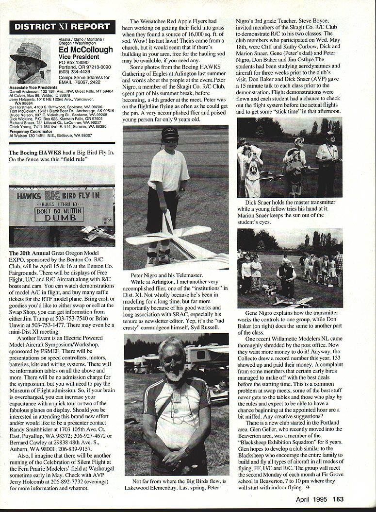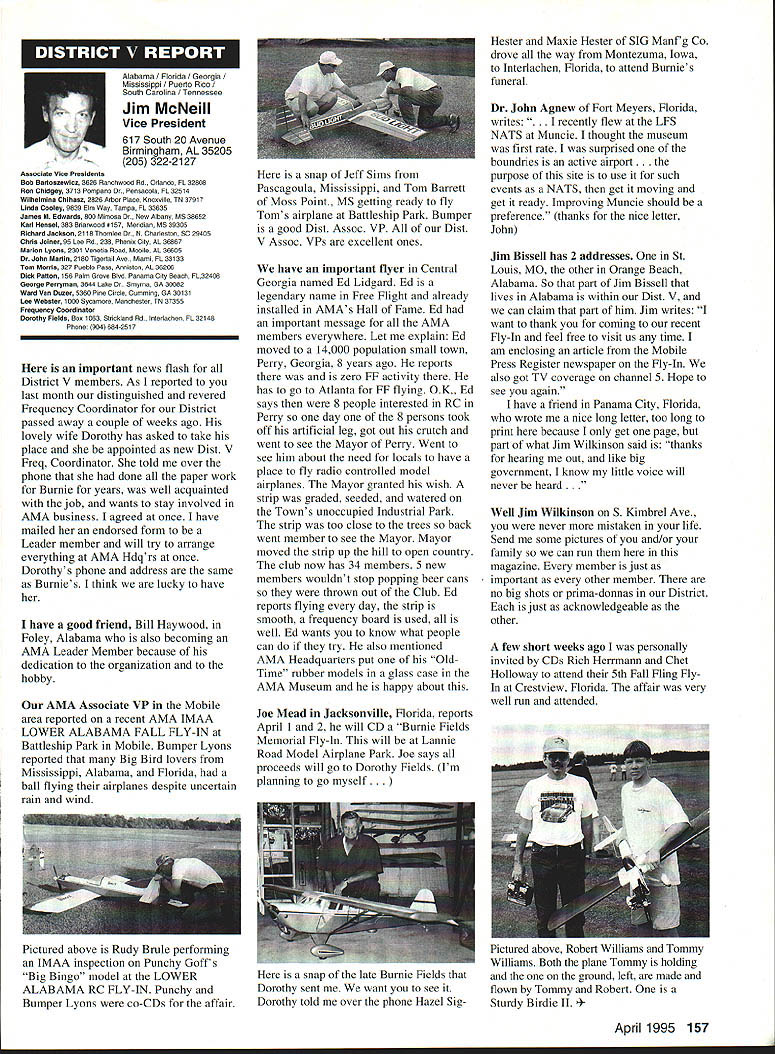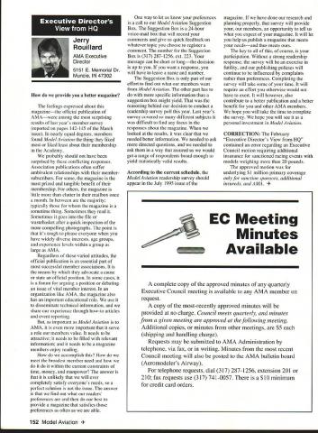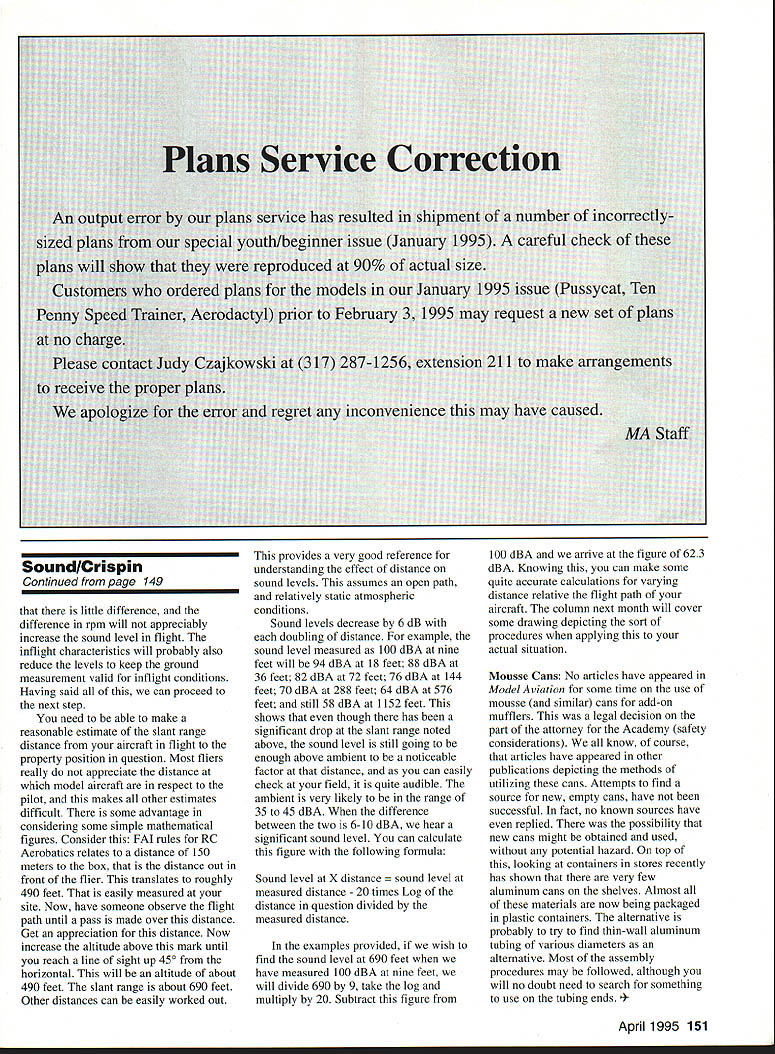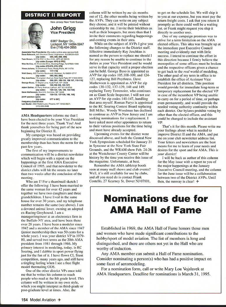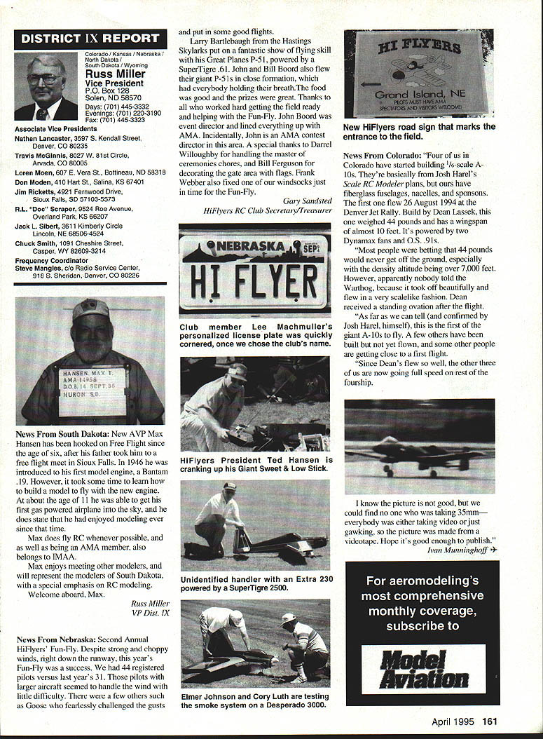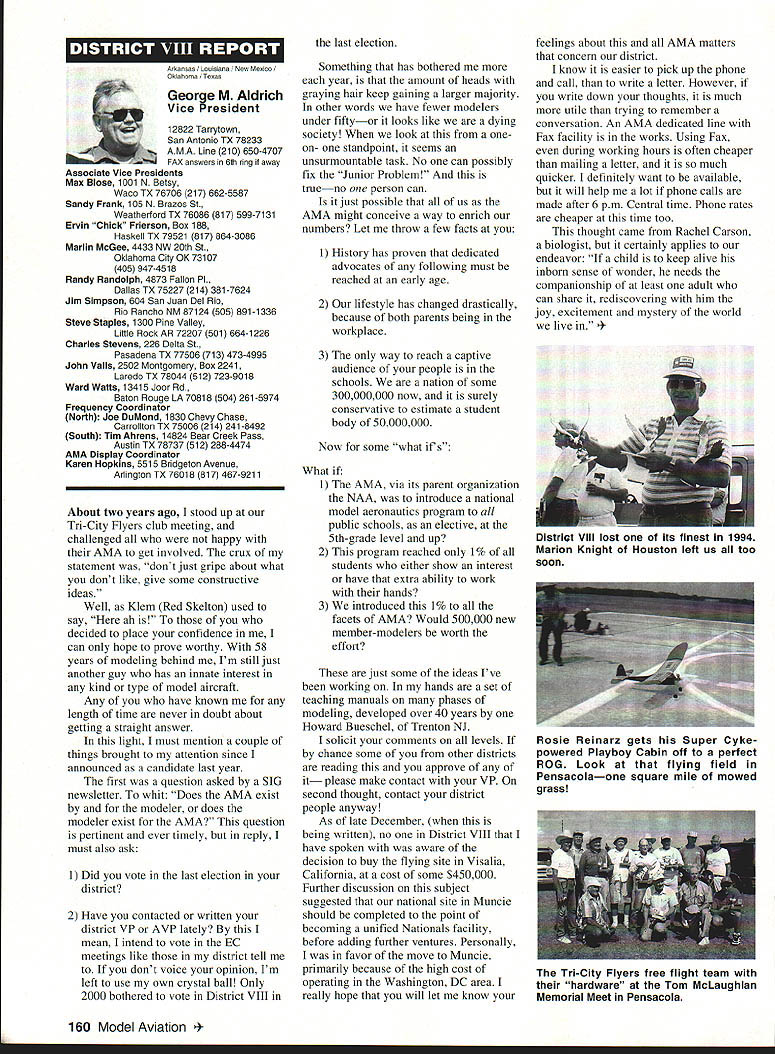 Inside View Headquarters get wrapped up problem situations important questions seem lost somewhere process true situations concerning noise generation aircraft effects neighbors fact take sound-level readings following recommended procedures does answer question complaints need recognize individual making complaint located distance nine feet aircraft three meters case FAI measurements must understand effects distance generated sounds actual environment complainant also matter puhlic relations cases nonexistent could take last item first especially since easiest implement takes relatively little effort carry through worthwhile conclusion attitude site through some divine right because signature lease does excuse inflicting disturbances upon neighbor true considers neighbor may have interest activity fact activity outside his/her own isolated property column number occasions has attempted convey understanding effect sounds generated aircraft heard evaluated against background ambient sound level neighbors location measure can use good soundlevel meter take actual measurements can also make some fairly good estimates some rather simple math use hand-held pocket calculator simpler calculations will still need take readings according established recommended procedures sound level aircraft aircraft properly set up engine speed should greatly vary between high rpm ground full throttle air no doubt propeller loading different between run-up ground inflight condition Proper loading will determine Continued poge 151 April 1995 149 Academy Model Aeronautics East Memorial Drive ie IN 47302 Howard Crispin Jr Executive Council Meetings April 21-22 Visalia CA July 29-30 Oshkosh WI Nats Lets talk bit about annual extravaganza AMA promotes conducts Nats founding premise Academy promotion modeling competition reasoned competition would itself promote health growth model aviation certainly has true over years witness phenomenal technological advancement increase interest hobby realize some will agree competition important However am sure little careful research would support basic premise Certainly competition lifeblood other activities certainly stimulus enhances advancement fields including industry Because AMA continues promote competition various ways matters little relatively small percentage membership participates such formal competition Other sports have similar small percentages competitors versus noncompetitors Everyone benefits technological improvements made regardless involvement competition Over years AMA has responsible annually conducting greatest aeromodeling extravaganza earth has always multievent happening events have increased over years introduction new technologies aeromodeling forms until last several years Nats has over 90 official unofficial events number total participants has varied 700 1600 modelers competing lot fun have involved its organization execution has become somewhat nightmare management team consists mixed bag AMA paid Headquarters employees large numbers volunteers Weve also picked up expenses number volunteers leading deficit financially since costs exceed expenses another cost hasnt always considered Headquarters staff away desks regular work hold often means skeleton staff trying carry out Headquarters business So. what Personally would oppose eliminating Nats feel strongly event very important visibility aeromodeling general public well providing fun stimulation hundreds modelers unusual Nats covered national media last years Nats filmed shown Discovery Channel also hours exposure ESPN T-6 Races Muncie last fall Such exposure can trickle down local level help keep flying site Public acceptance very important Yes competition necessary variety reasons go about continuing important event make cost-effectivethat return investment looking ways means accomplish goal Certainly way cut costs hold event Muncie once necessary facilities place also looking toward use volunteers ease burden Headquarters staff want trim events manageable number eliminating poorly attended events based number entries received cutoff date still wrestling other management improvements year because unavailability necessary facilities events site problem surfaced rather late date weve scramble keep events proposed site Tn-Cities Washington locate other events known facilities available Free Flight Soaring have piggybacked other major events previously scheduled Muncie Next year hoped can reassemble bulk Nats events Muncie have no desire kill Nats rumored simply doing best continue provide quality event reasonable cost Goals AMA ACADEMY Model Aeronautics vision create organization wanted stress priority education improve science aeromodeling Academy non profit organization seeks through number activities advance hobby make fun publish magazine educates promote competition stimulates educates provide scholarships deserving modelers educate sponsor research advances technology educates Yes also provide insurance membership benefit unfortunate needed have live realities litigious society boggles mind times able somehow pull together talents literally thousands modelers make happen No AMA business monetary profit profit seek advancement hobby love simply want modelers everywhere whether AMA members find aeromodeling satisfaction adds lifes pleasure Resources talent necessary carry out activities An association organization people common purpose per Webster means members organization must involved make work have elected officers represent District try very hard listen what say know mailbox bulging letters phone very busy Yes listen try meet needs majority model population Witness phenomenal growth over past two decades support will continue increase capacity provide enjoyable aeromodeling future Model Aviation Museum Patron support can continue encourage educate preserve rich history model aviation variety Patron levels available Call 317 287-1256 information Frank V Ehling Museumpart National Center A