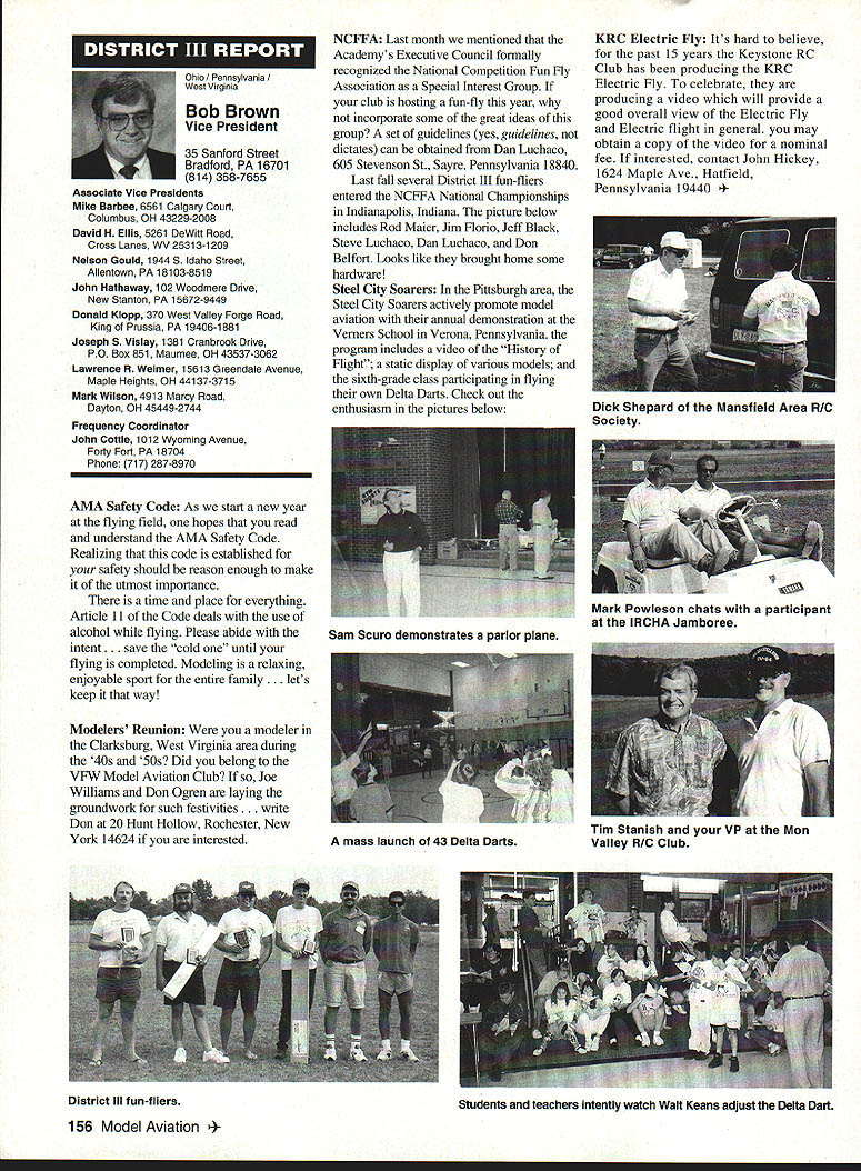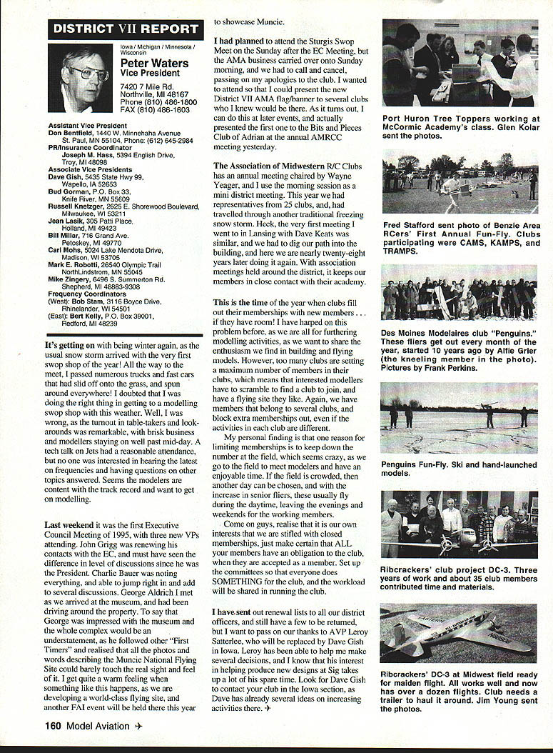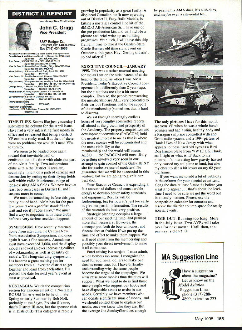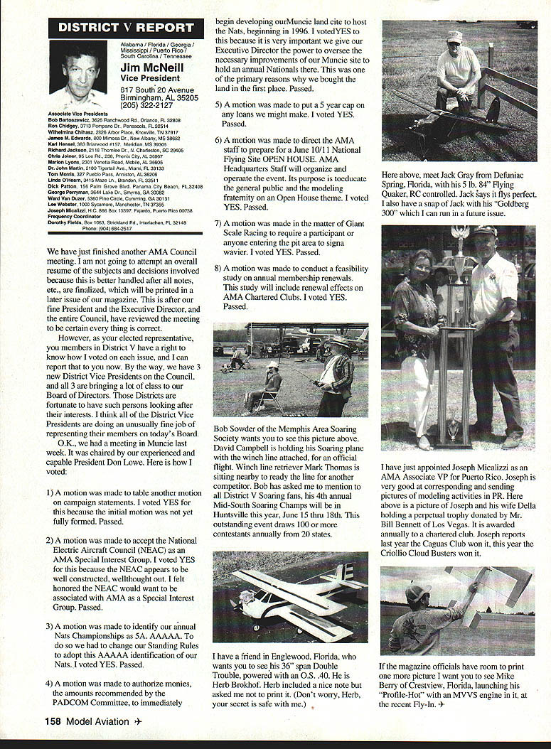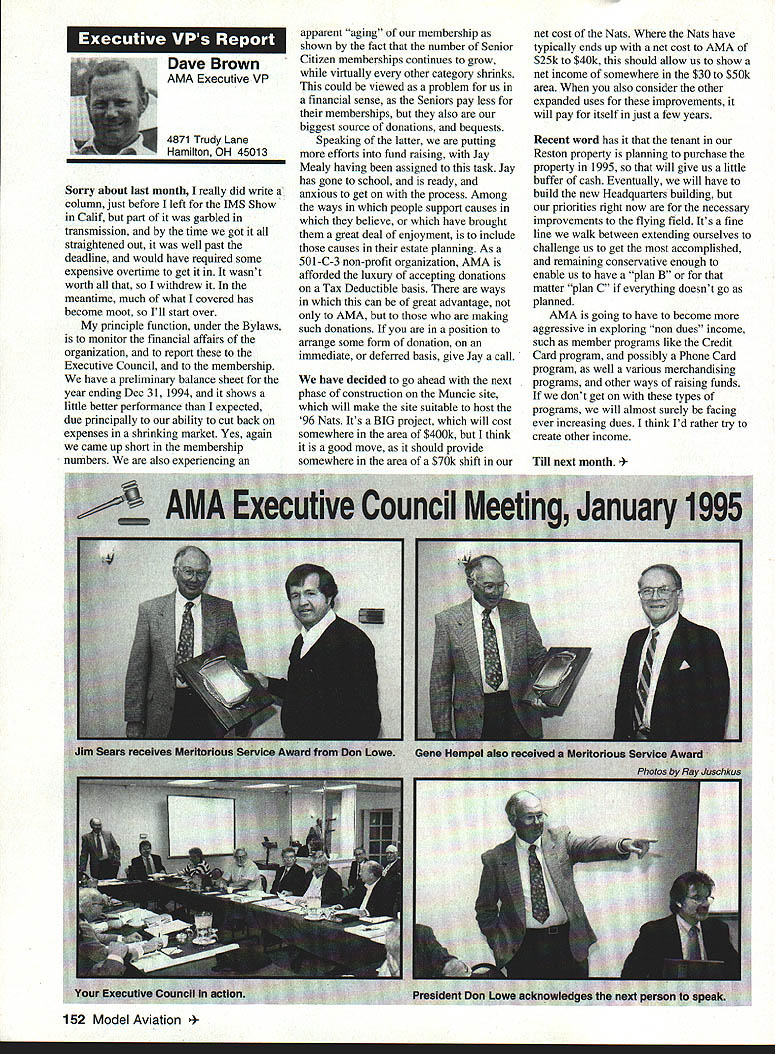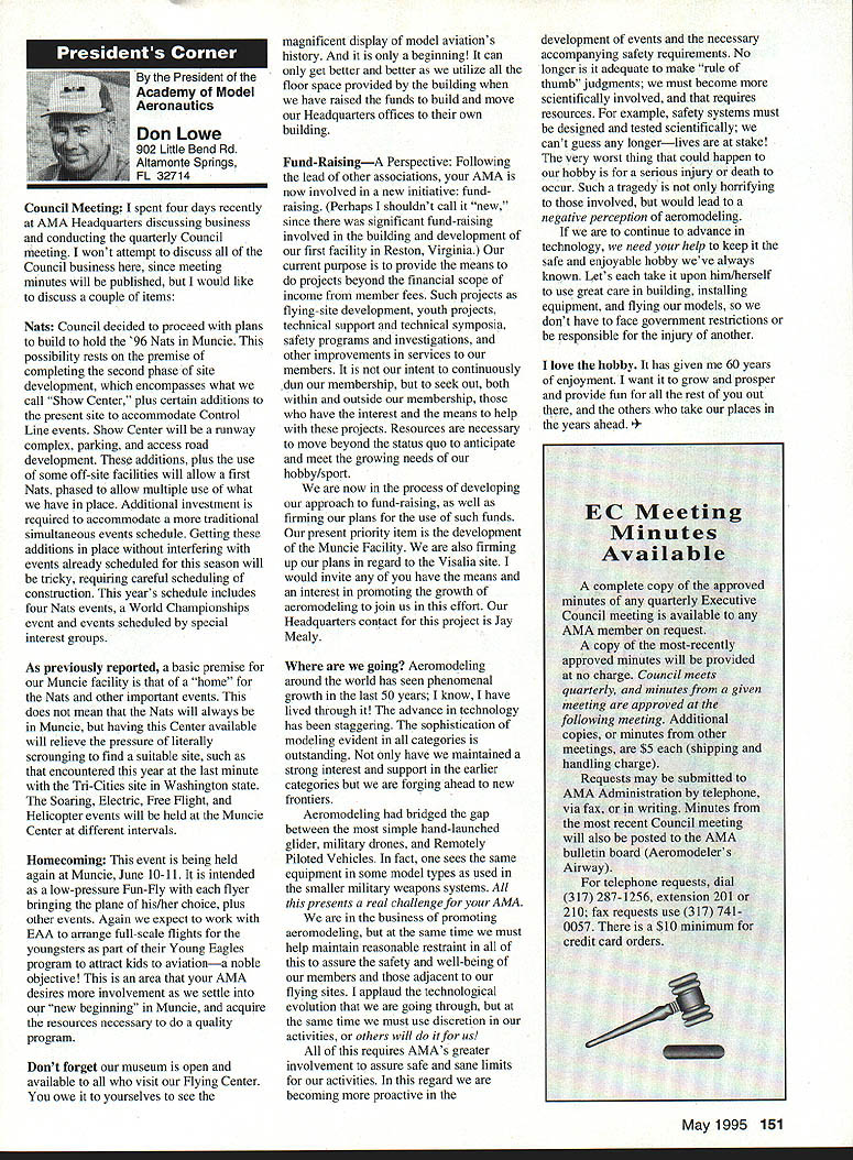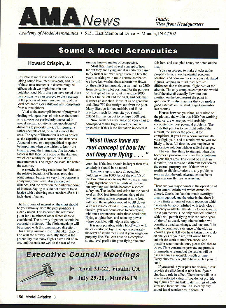Inside View Headquarters Last month discussed methods taking sound level measurements use measurements determining effects might incur neighborhood Now have saved instructions can proceed next step process complying local ordinances satisfying complaints neighbors Vital accomplishment progress dealing questions noise sound anyone particularly interested model aircraft activity knowledge distances property lines requires rather accurate chart aerial view area type illustration critical capability measuring distances An aerial view topographical map can important wishes know terrain around flying site important factor scale drawing can readily applied making measurements larger scale better accuracy sketch showing roads field relative locations houses provides some insight serves very little purpose analyzing sound-level dissipation over distance effect particular point interest Saying attempt justice drawing standard 812 x 11inch sheet paper first point interest chart should runway pilot positions clearly noted becomes reference point number other dimensions considered runway alignment should accurately indicated flight envelope will aligned mapped direction always assumes flight takes place line runway Actually probability flights have bit arc ends well rear runway linea matter perspective Most fliers have no real concept far out flying certainly easier fly farther out large aircraft Over years working radio control aerobatics have known aircraft flown split-S turnaround out much 2500 center pilot position purpose type analysis let us assume 2000 feet out left right note distance chart Now let us generous allow 750 feet straight out pilot fliers go far beyond practice such site should extend line out perhaps 1000 feet Now mark out rectangle chart correspond flight envelope will proceed limitation imposed Most fliers have no real concept far out flying. site box should larger certainly should noted next step note occupied buildings within 1000 feet outside box say always flying anywhere near limits box anything well inside becomes sort safety net decibel reduction sound level 1000 feet boundary box assuming measurement nine feet will neighborhood 40dB down reasonable effort sound reduction site will come close complying ordinances under conditions flying tighter box reducing power possible will help regard now possible bit work calculator figure out quite accurately level sound measured neighbors property line can now complete sound-level profile flying site once box occupied areas noted map can proceed make checks property lines potential problem location compare calculated figures keeping mind difference due actual flight path aircraft complete comparison would aircraft actually flew position box nearest point question also assumes made good estimate slant range remember last month Houses between box marked plot within 1000 foot working distance will probably encounter potential problems closer point flight path aircraft greater potential complaints have house underneath flight path point likely full throttle may have impossible solution radical changes very first thing attempt becomes problem alter orientation flight area could shift direction move different location overall property area no readily available solutions problems such alternative may begin serious flying-site searches two major points operation radio controlled aircraft cannot altered fact much overflight area required other finite amount sound reduction can easily accomplished technology presently available ability work within parameters practical solution will pennit flying same types aircraft usual Any other solution will constitute radical change may fit continued existence club known presentIf have taken time analysis site would like submit work check possible recommendations please feel free Time constraints prevent promise immediate return results will back within reasonable length time club really ought have such plan hand send plan review please provide dBA level nine feet club has rule effect checks will several selected values provide figures task Later listings club sites locations should also carry sound-level restrictions force Model Aviation ademy Model Aeronautics East Memorial Drive ie IN 47302 Howard Crispin Jr Council Meeting spent four days recently AMA Headquarters discussing business conducting quarterly Council meeting wont attempt discuss Council business since meeting minutes will published would like discuss couple items Nats Council decided proceed plans build hold 96 Nats Muncie possibility rests premise completing second phase site development encompasses what call Show Center plus certain additions present site accommodate Control Line events Show Center will runway complex parking access road development additions plus use some off-site facilities will allow first Nats phased allow multiple use what have place Additional investment required accommodate traditional simultaneous events schedule Getting additions place interfering events already scheduled season will tricky requiring careful scheduling construction years schedule includes four Nats events World Championships event events scheduled special interest groups As previously reported basic premise Muncie facility home Nats other important events does mean Nats will always Muncie having Center available will relieve pressure literally scrounging find suitable site such encountered year last minute Tn-Cities site Washington state Soaring Electric Free Flight Helicopter events will held Muncie Center different intervals Homecoming event being held again Muncie June 10-11 intended low-pressure Fun-Fly flyer bringing plane his/her choice plus other events Again expect work EAA arrange full-scale flights youngsters part Young Eagles program attract kids aviationa noble objective area AMA desires involvement settle new beginning Muncie acquire resources necessary quality program Dont forget museum open available visit Flying Center owe your