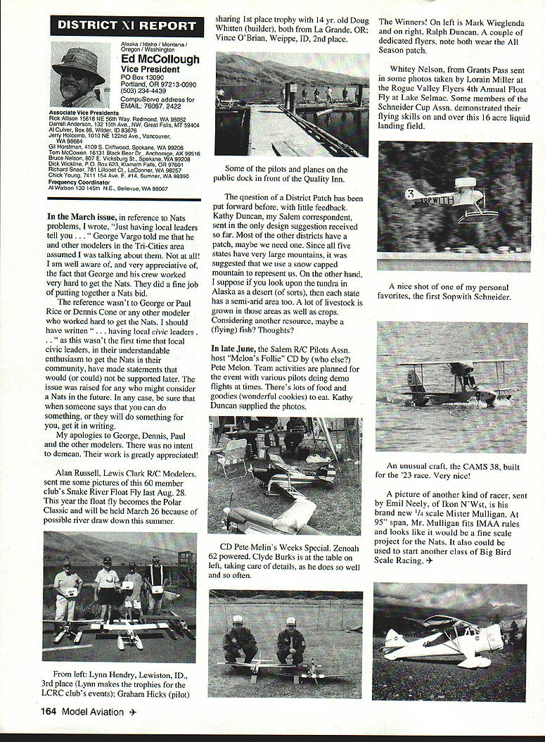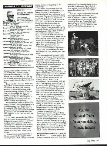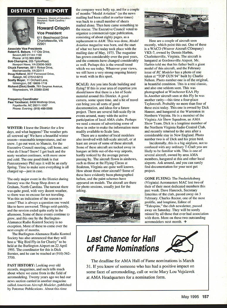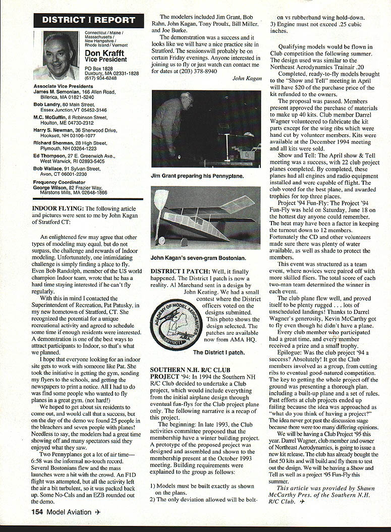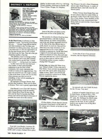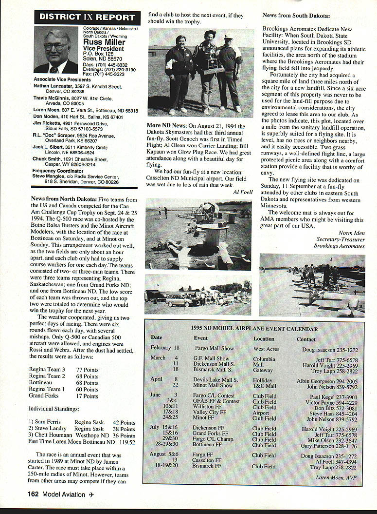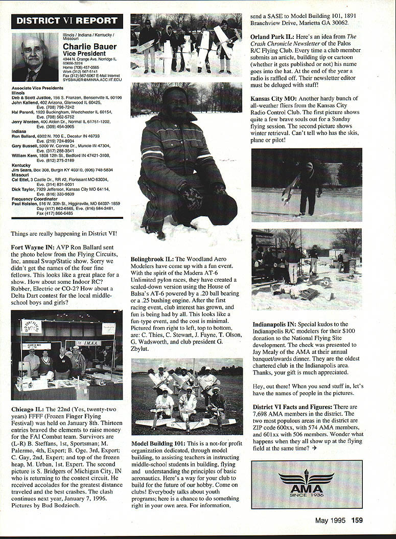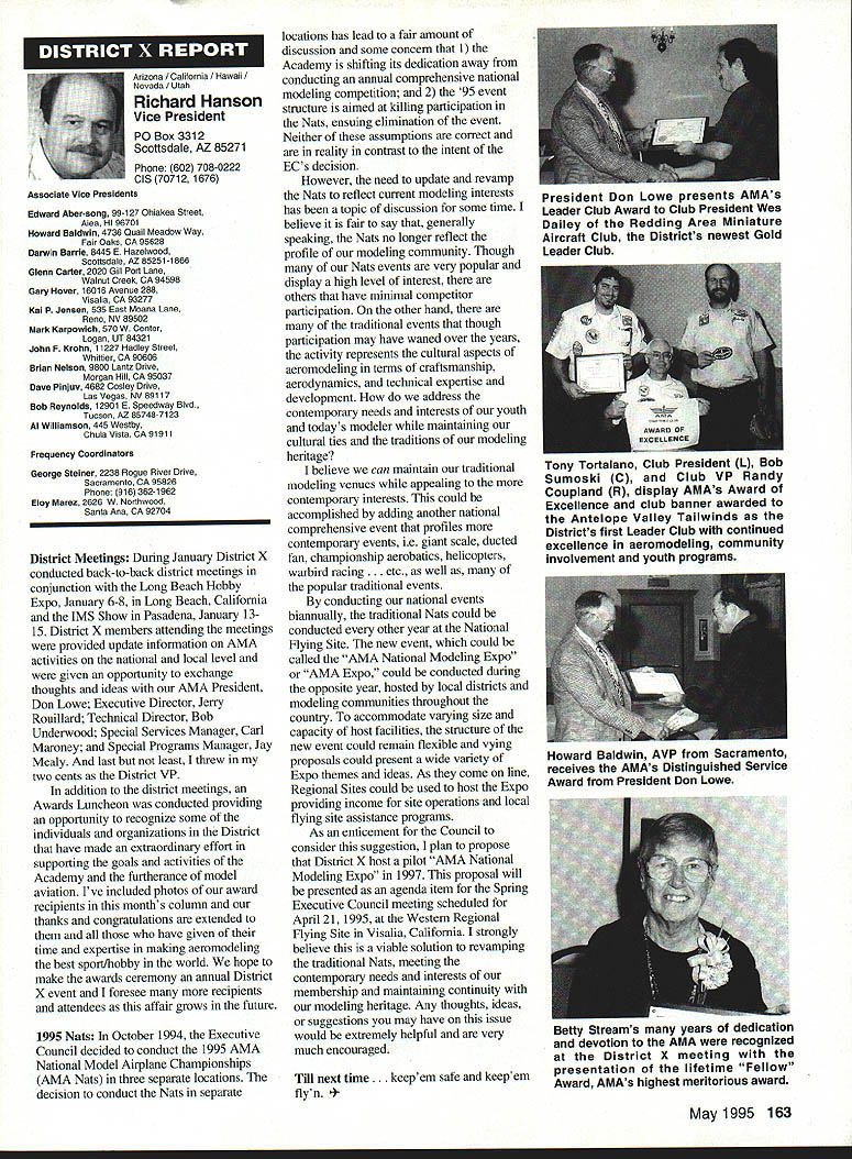 Inside View Headquarters Last month discussed methods taking sound level measurements use measurements determining effects might incur neighborhood Now have saved instructions can proceed next step process complying local ordinances satisfying complaints neighbors Vital accomplishment progress dealing questions noise sound anyone particularly interested model aircraft activity knowledge distances property lines requires rather accurate chart aerial view area type illustration critical capability measuring distances An aerial view topographical map can important wishes know terrain around flying site important factor scale drawing can readily applied making measurements larger scale better accuracy sketch showing roads field relative locations houses provides some insight serves very little purpose analyzing sound-level dissipation over distance effect particular point interest Saying attempt justice drawing standard 812 x 11inch sheet paper first point interest chart should runway pilot positions clearly noted becomes reference point number other dimensions considered runway alignment should accurately indicated flight envelope will aligned mapped direction always assumes flight takes place line runway Actually probability flights have bit arc ends well rear runway linea matter perspective Most fliers have no real concept far out flying certainly easier fly farther out large aircraft Over years working radio control aerobatics have known aircraft flown split-S turnaround out much 2500 center pilot position purpose type analysis let us assume 2000 feet out left right note distance chart Now let us generous allow 750 feet straight out pilot fliers go far beyond practice such site should extend line out perhaps 1000 feet Now mark out rectangle chart correspond flight envelope will proceed limitation imposed Most fliers have no real concept far out flying. site box should larger certainly should noted next step note occupied buildings within 1000 feet outside box say always flying anywhere near limits box anything well inside becomes sort safety net decibel reduction sound level 1000 feet boundary box assuming measurement nine feet will neighborhood 40dB down reasonable effort sound reduction site will come close complying ordinances under conditions flying tighter box reducing power possible will help regard now possible bit work calculator figure out quite accurately level sound measured neighbors property line can now complete sound-level profile flying site once box occupied areas noted map can proceed make checks property lines potential problem location compare calculated figures keeping mind difference due actual flight path aircraft complete comparison would aircraft actually flew position box nearest point question also assumes made good estimate slant range remember last month Houses between box marked plot within 1000 foot working distance will probably encounter potential problems closer point flight path aircraft greater potential complaints have house underneath flight path point likely full throttle may have impossible solution radical changes very first thing attempt becomes problem alter orientation flight area could shift direction move different location overall property area no readily available solutions problems such alternative may begin serious flying-site searches two major points operation radio controlled aircraft cannot altered fact much overflight area required other finite amount sound reduction can easily accomplished technology presently available ability work within parameters practical solution will pennit flying same types aircraft usual Any other solution will constitute radical change may fit continued existence club known presentIf have taken time analysis site would like submit work check possible recommendations please feel free Time constraints prevent promise immediate return results will back within reasonable length time club really ought have such plan hand send plan review please provide dBA level nine feet club has rule effect checks will several selected values provide figures task Later listings club sites locations should also carry sound-level restrictions force Model Aviation ademy Model Aeronautics East Memorial Drive ie IN 47302 Howard Crispin Jr Council Meeting spent four days recently AMA Headquarters discussing business conducting quarterly Council meeting wont attempt discuss Council business since meeting minutes will published would like discuss couple items Nats Council decided proceed plans build hold 96 Nats Muncie possibility rests premise completing second phase site development encompasses what call Show Center plus certain additions present site accommodate Control Line events Show Center will runway complex parking access road development additions plus use some off-site facilities will allow first Nats phased allow multiple use what have place Additional investment required accommodate traditional simultaneous events schedule Getting additions place interfering events already scheduled season will tricky requiring careful scheduling construction years schedule includes four Nats events World Championships event events scheduled special interest groups As previously reported basic premise Muncie facility home Nats other important events does mean Nats will always Muncie having Center available will relieve pressure literally scrounging find suitable site such encountered year last minute Tn-Cities site Washington state Soaring Electric Free Flight Helicopter events will held Muncie Center different intervals Homecoming event being held again Muncie June 10-11 intended low-pressure Fun-Fly flyer bringing plane his/her choice plus other events Again expect work EAA arrange full-scale flights youngsters part Young Eagles program attract kids aviationa noble objective area AMA desires involvement settle new beginning Muncie acquire resources necessary quality program Dont forget museum open available visit Flying Center owe your