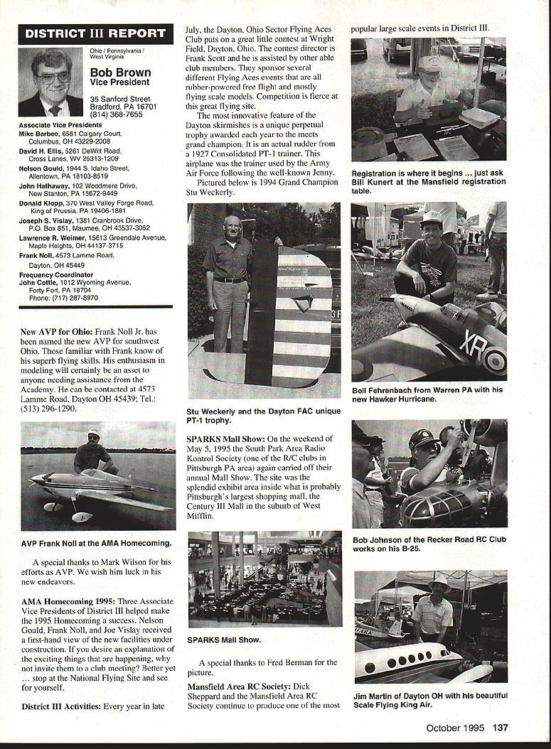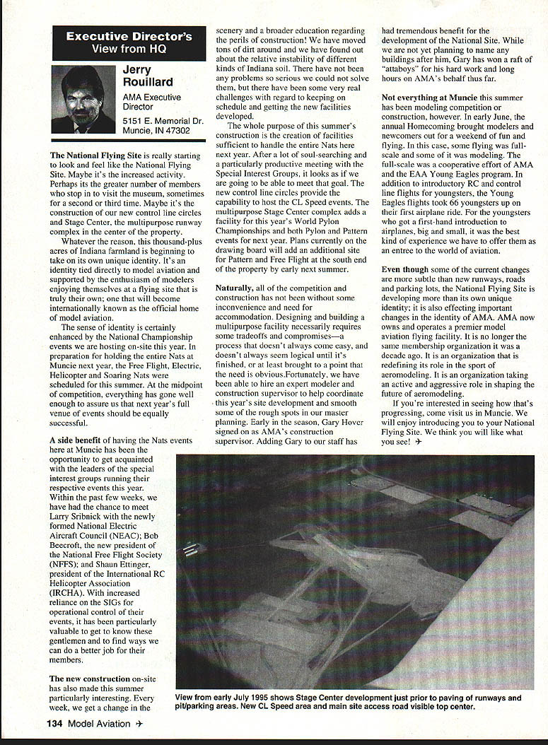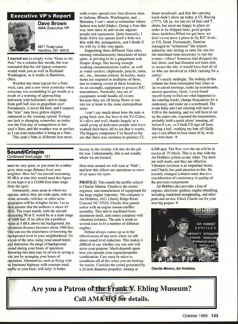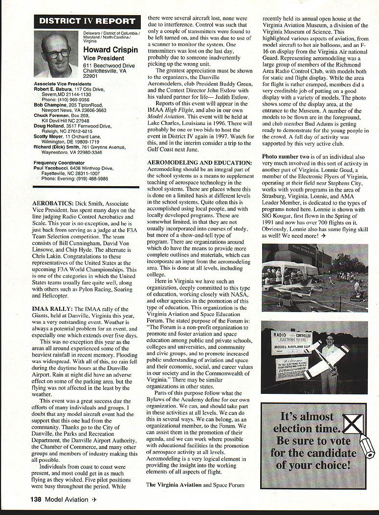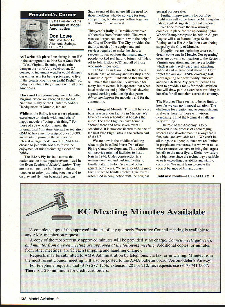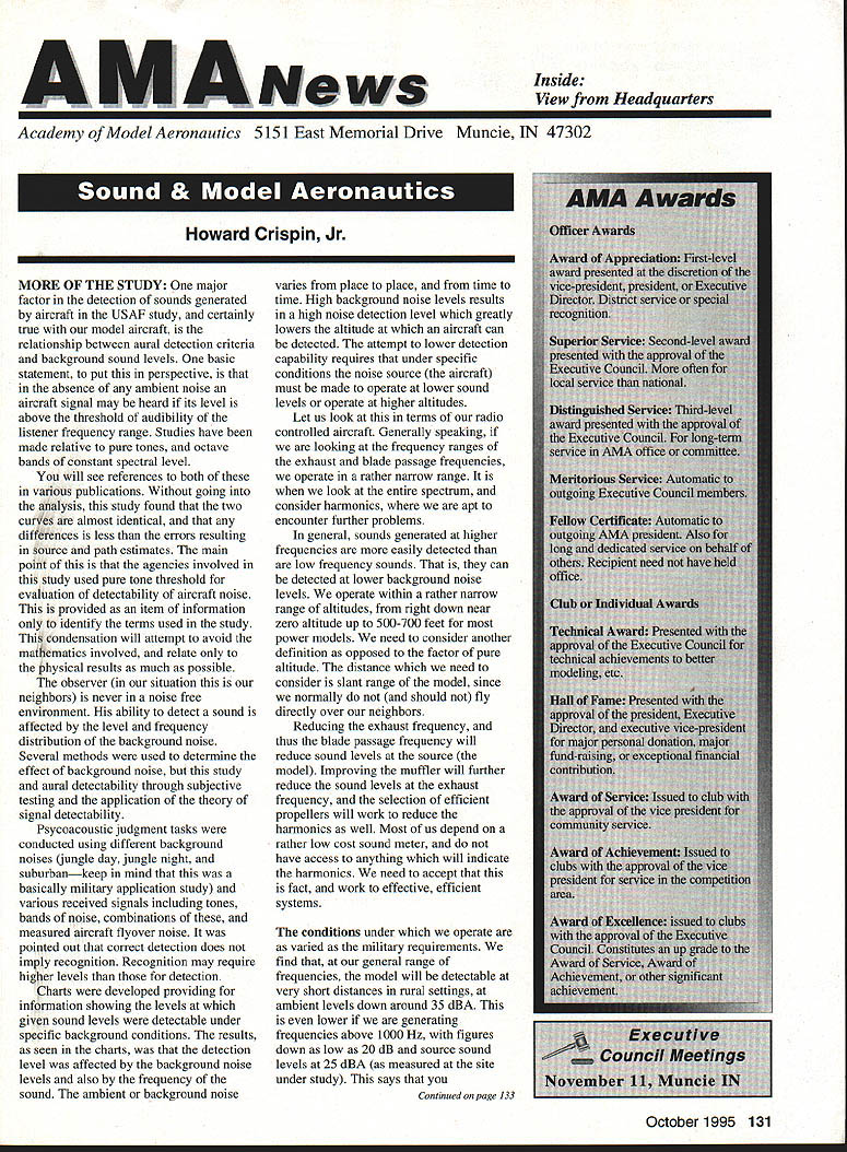 Inside View Headquarters MORE OF THE STUDY major factor detection sounds generated aircraft USAF study certainly true model aircraft relationship between aural detection criteria background sound levels basic statement put perspective absence ambient noise aircraft signal may heard its level above threshold audibility listener frequency range Studies have made relative pure tones octave bands constant spectral level will see references both various publications Without going analysis study found two curVes almost identical diffrrences less errors resulting source path estimates main point agencies involved study used pure tone threshold evaluation detectability aircraft noise provided item information identify terms used study condensation will attempt avoid mathematics involved relate physical results much possible observer situation neighbors never noise free environment ability detect sound affected level frequency distribution background noise Several methods used determine effect background noise study aural detectability through subjective testing application theory signal detectability Psycoacoustic judgment tasks conducted using different background noises jungle day jungle night suburbankeep mind basically military application study various received signals including tones bands noise combinations measured aircraft flyover noise pointed out correct detection does imply recognition Recognition may require higher levels detection Charts developed providing information showing levels given sound levels detectable under specific background conditions results seen charts detection level affected background noise levels also frequency sound ambient background noise varies place place time time High background noise levels results high noise detection level greatly lowers altitude aircraft can detected attempt lower detection capability requires under specific conditions noise source aircraft must made operate lower sound levels operate higher altitudes Let us look terms radio controlled aircraft Generally speaking looking frequency ranges exhaust blade passage frequencies operate rather narrow range look entire spectrum consider harmonics apt encounter further problems general sounds generated higher frequencies easily detected low frequency sounds can detected lower background noise levels operate within rather narrow range altitudes right down near zero altitude up 500-700 feet power models need consider another definition opposed factor pure altitude distance need consider slant range model since normally should fly directly over neighbors Reducing exhaust frequency thus blade passage frequency will reduce sound levels source model Improving muffler will further reduce sound levels exhaust frequency selection efficient propellers will work reduce harmonics well Most us depend rather low cost sound meter have access anything will indicate harmonics need accept fact work effective efficient systems conditions under operate varied military requirements find general range frequencies model will detectable very short distances rural settings ambient levels down around 35 dBA lower generating frequencies above 1000 Hz figures down low 20 dB source sound levels 25 dBA measured site under study says Continued page 133 October 1995 131 Academy Model Aeronautics 5151 East Memorial Drive Muncie IN 47302 Howard Crispin Jr As write piece am sitting RV campground Pipe Stem State Park West Virginia listening rain dampen 4th July celebration course no inclement weather could dampen enthusiasm being privileged live greatest country earth Right So today celebrate privilege other Americans Clara journeying Danville Virginia attended IMAA National Rally Giants AMAs Headquarters Muncie Indiana Rally very pleasant experience mingle hundreds happy modelers doing thing dont know International Miniature Aircraft Association IMAA has membership over 10000 exists promote nationwide interest large model aircraft IMAA has chosen join AMA foster enjoyment fascinating aspect hobby IMAA Fly-Ins held across nation popular events listed Event Section Model Aviation competitive bring modelers together enjoy just being together display fly beautiful creations Such events nature fill need modelers care tough competition enjoy getting together like interest years Rally Danville drew over 400 entries far wide event well organized run help City Danville City provided facility much equipment services required make show success obvious many people worked real hard bring off Hats off John Estlow CD made possible facility Danville Fly-In inactive runway taxi strip Danville Airport understand city will make same facility available future events apparent local modelers public officials develop good working relationship great things can happen modelers community Happenings Muncie will very busy season facility Muncie have 22 events scheduled boggles mind Free Flighters have found home have seven events scheduled now considered best Free Flight sites eastern part US now middle adding what might called Phase Two Flying Center development addition will provide minimal facilities host Nats 1996 Under construction runway complex parking facility handle Pattern Pylon Scale other general RC events also adding hard surface handle Control Line events used conjunction original general purpose site Further improvements Free Flight area will come McLaughlan Estate gift designated purpose hope have new runway complex place up-coming Pylon World Championships held August August will also feature Large-Scale Racing Hot Air Balloon event being staged City Muncie Happily beginning see dream come true Muncie operating costs down comparison Reston Virginia operation have facility intensively used attracting national international attention Dont forget hour ESPN coverage last year targeting new facility museum T-6 Race greatest desire has provide focus model aviation will draw public awareness resulting benefits modelers across country Future seem