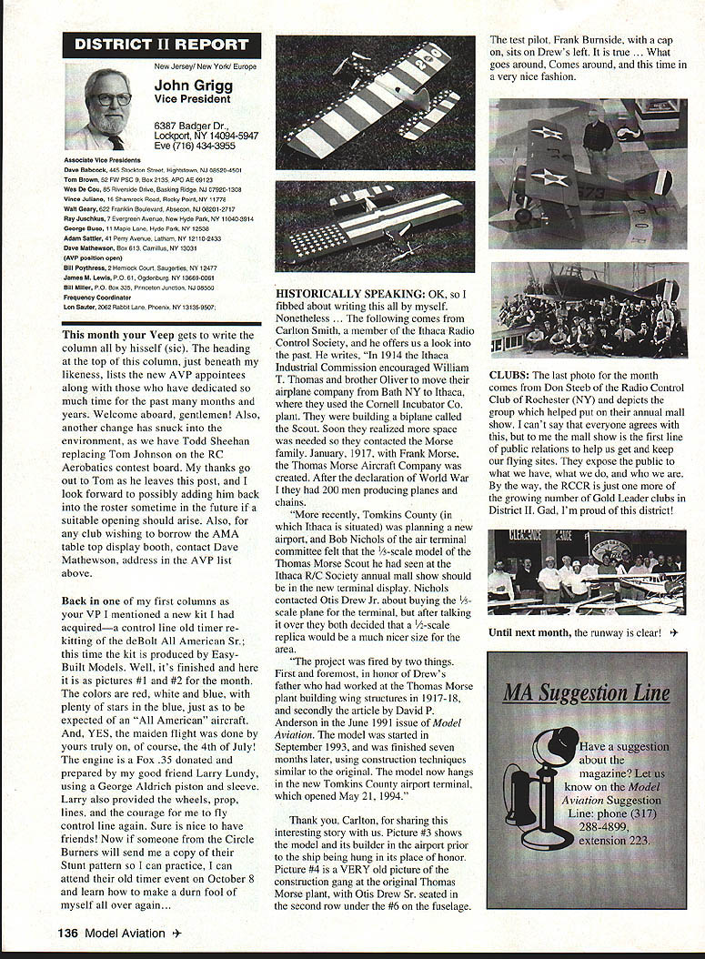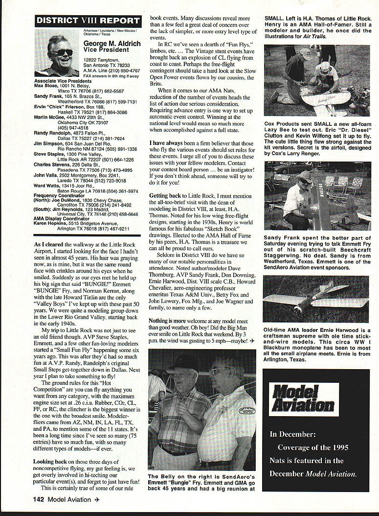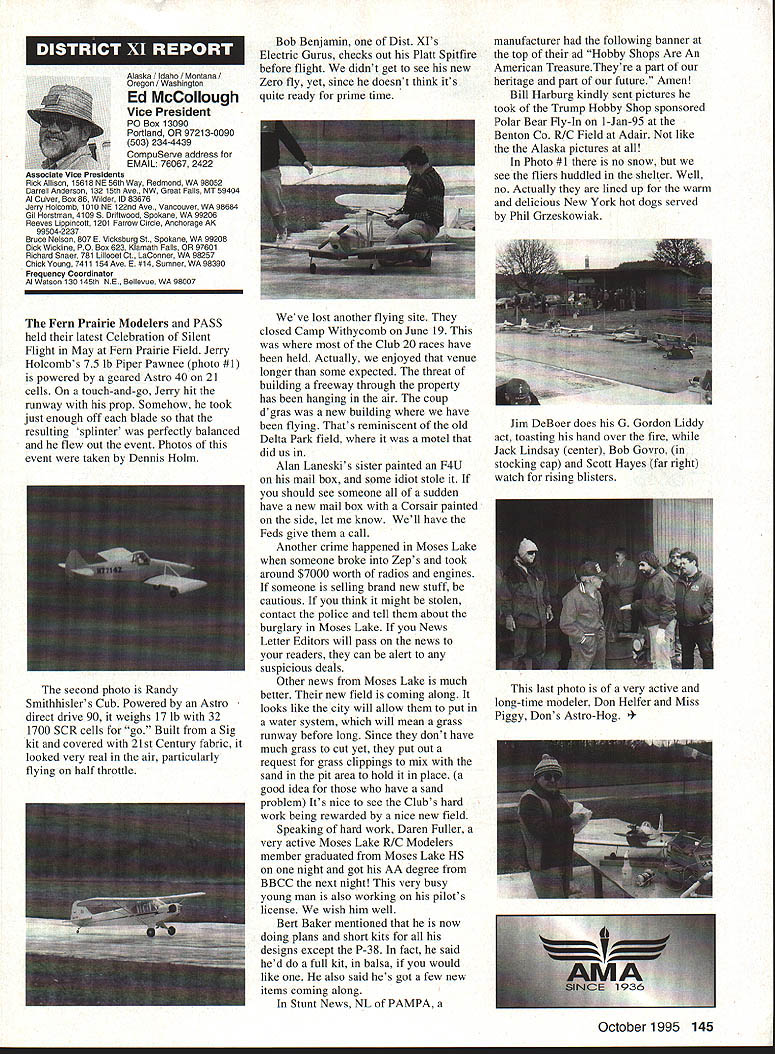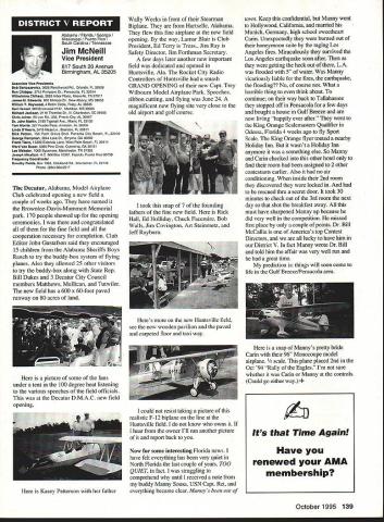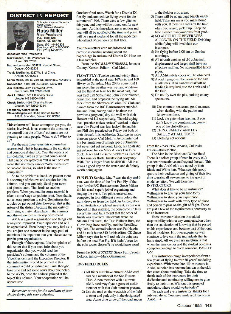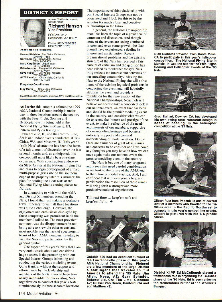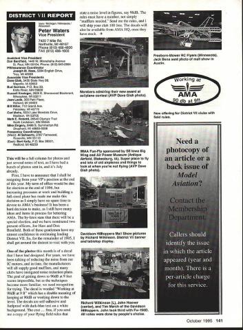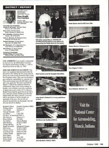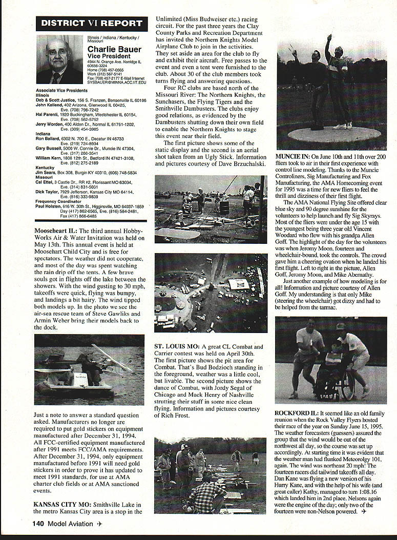 Inside View Headquarters MORE OF THE STUDY major factor detection sounds generated aircraft USAF study certainly true model aircraft relationship between aural detection criteria background sound levels basic statement put perspective absence ambient noise aircraft signal may heard its level above threshold audibility listener frequency range Studies have made relative pure tones octave bands constant spectral level will see references both various publications Without going analysis study found two curVes almost identical diffrrences less errors resulting source path estimates main point agencies involved study used pure tone threshold evaluation detectability aircraft noise provided item information identify terms used study condensation will attempt avoid mathematics involved relate physical results much possible observer situation neighbors never noise free environment ability detect sound affected level frequency distribution background noise Several methods used determine effect background noise study aural detectability through subjective testing application theory signal detectability Psycoacoustic judgment tasks conducted using different background noises jungle day jungle night suburbankeep mind basically military application study various received signals including tones bands noise combinations measured aircraft flyover noise pointed out correct detection does imply recognition Recognition may require higher levels detection Charts developed providing information showing levels given sound levels detectable under specific background conditions results seen charts detection level affected background noise levels also frequency sound ambient background noise varies place place time time High background noise levels results high noise detection level greatly lowers altitude aircraft can detected attempt lower detection capability requires under specific conditions noise source aircraft must made operate lower sound levels operate higher altitudes Let us look terms radio controlled aircraft Generally speaking looking frequency ranges exhaust blade passage frequencies operate rather narrow range look entire spectrum consider harmonics apt encounter further problems general sounds generated higher frequencies easily detected low frequency sounds can detected lower background noise levels operate within rather narrow range altitudes right down near zero altitude up 500-700 feet power models need consider another definition opposed factor pure altitude distance need consider slant range model since normally should fly directly over neighbors Reducing exhaust frequency thus blade passage frequency will reduce sound levels source model Improving muffler will further reduce sound levels exhaust frequency selection efficient propellers will work reduce harmonics well Most us depend rather low cost sound meter have access anything will indicate harmonics need accept fact work effective efficient systems conditions under operate varied military requirements find general range frequencies model will detectable very short distances rural settings ambient levels down around 35 dBA lower generating frequencies above 1000 Hz figures down low 20 dB source sound levels 25 dBA measured site under study says Continued page 133 October 1995 131 Academy Model Aeronautics 5151 East Memorial Drive Muncie IN 47302 Howard Crispin Jr As write piece am sitting RV campground Pipe Stem State Park West Virginia listening rain dampen 4th July celebration course no inclement weather could dampen enthusiasm being privileged live greatest country earth Right So today celebrate privilege other Americans Clara journeying Danville Virginia attended IMAA National Rally Giants AMAs Headquarters Muncie Indiana Rally very pleasant experience mingle hundreds happy modelers doing thing dont know International Miniature Aircraft Association IMAA has membership over 10000 exists promote nationwide interest large model aircraft IMAA has chosen join AMA foster enjoyment fascinating aspect hobby IMAA Fly-Ins held across nation popular events listed Event Section Model Aviation competitive bring modelers together enjoy just being together display fly beautiful creations Such events nature fill need modelers care tough competition enjoy getting together like interest years Rally Danville drew over 400 entries far wide event well organized run help City Danville City provided facility much equipment services required make show success obvious many people worked real hard bring off Hats off John Estlow CD made possible facility Danville Fly-In inactive runway taxi strip Danville Airport understand city will make same facility available future events apparent local modelers public officials develop good working relationship great things can happen modelers community Happenings Muncie will very busy season facility Muncie have 22 events scheduled boggles mind Free Flighters have found home have seven events scheduled now considered best Free Flight sites eastern part US now middle adding what might called Phase Two Flying Center development addition will provide minimal facilities host Nats 1996 Under construction runway complex parking facility handle Pattern Pylon Scale other general RC events also adding hard surface handle Control Line events used conjunction original general purpose site Further improvements Free Flight area will come McLaughlan Estate gift designated purpose hope have new runway complex place up-coming Pylon World Championships held August August will also feature Large-Scale Racing Hot Air Balloon event being staged City Muncie Happily beginning see dream come true Muncie operating costs down comparison Reston Virginia operation have facility intensively used attracting national international attention Dont forget hour ESPN coverage last year targeting new facility museum T-6 Race greatest desire has provide focus model aviation will draw public awareness resulting benefits modelers across country Future seem